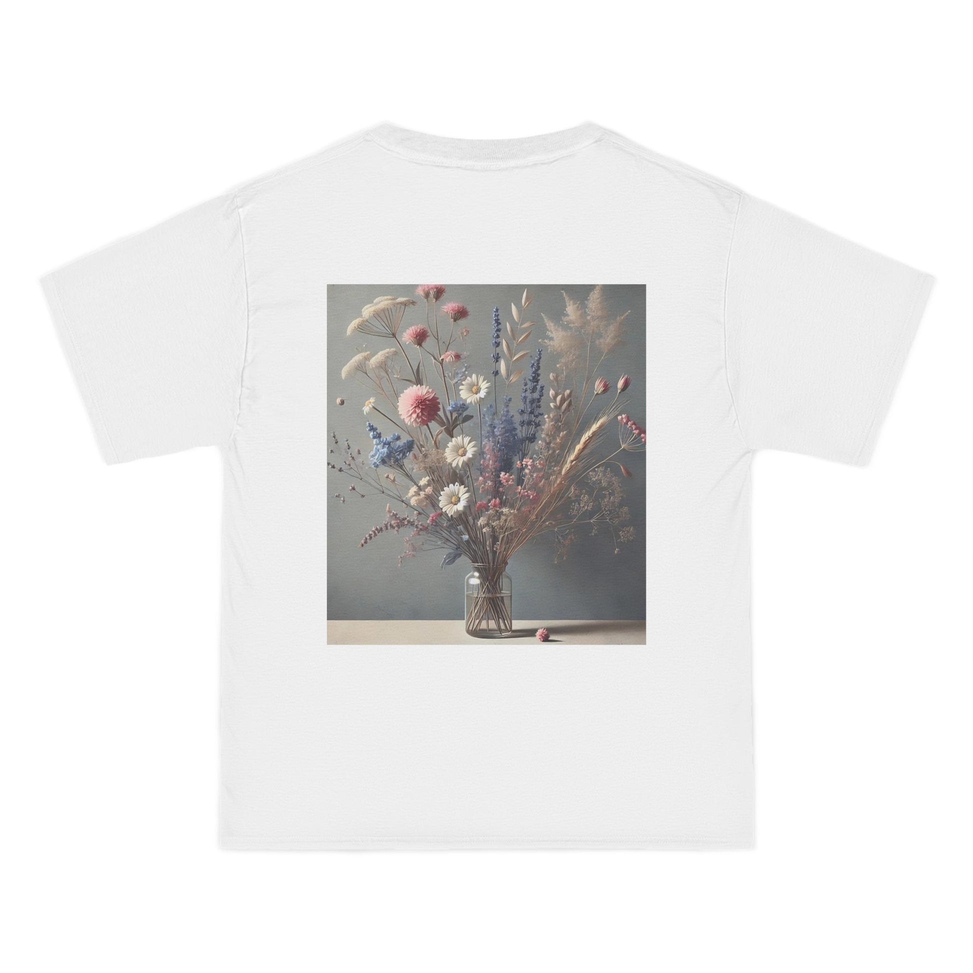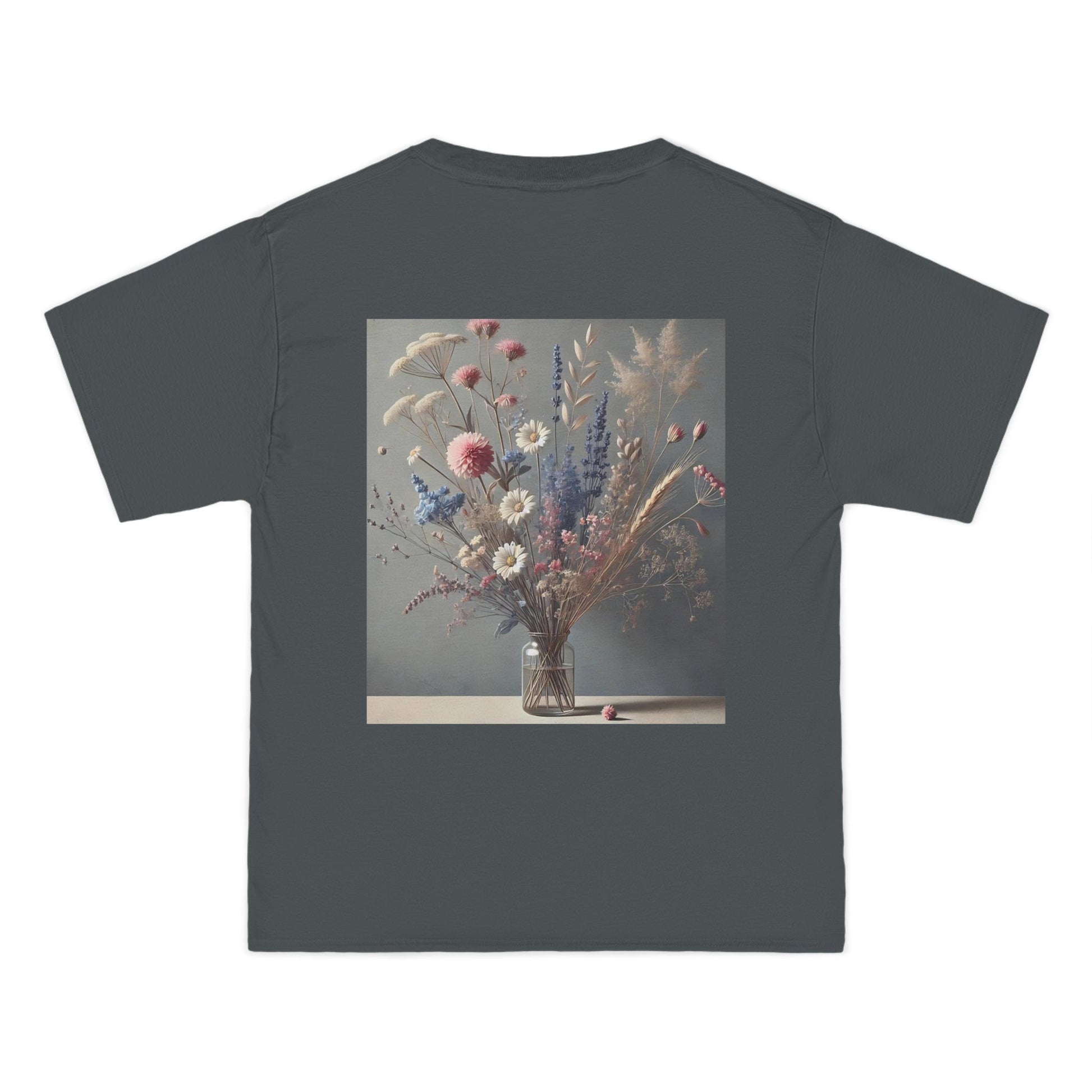 Welcome to your own personal canvas with our Delicate Floral Arrangement: Minimalist Nature tee. This serene and soft-spoken design, featuring a gentle bouquet of pastel flowers cradled in a glass vase, invites you to wear your world with pride and joy. Set against a soothing gray background, this wearable art piece is a testament to the power of simplicity and the beauty of nature.