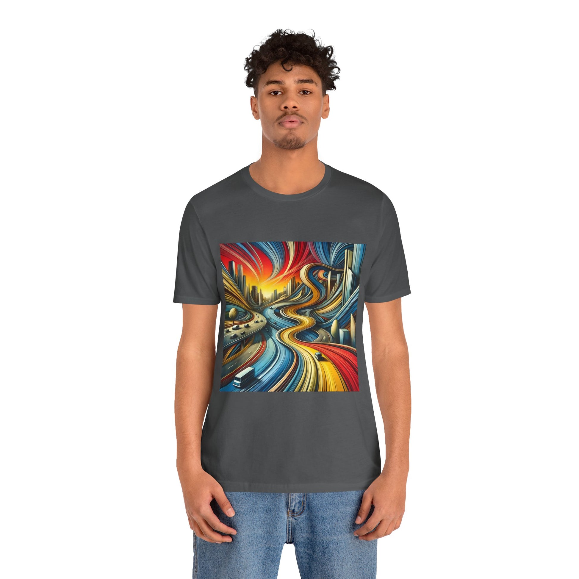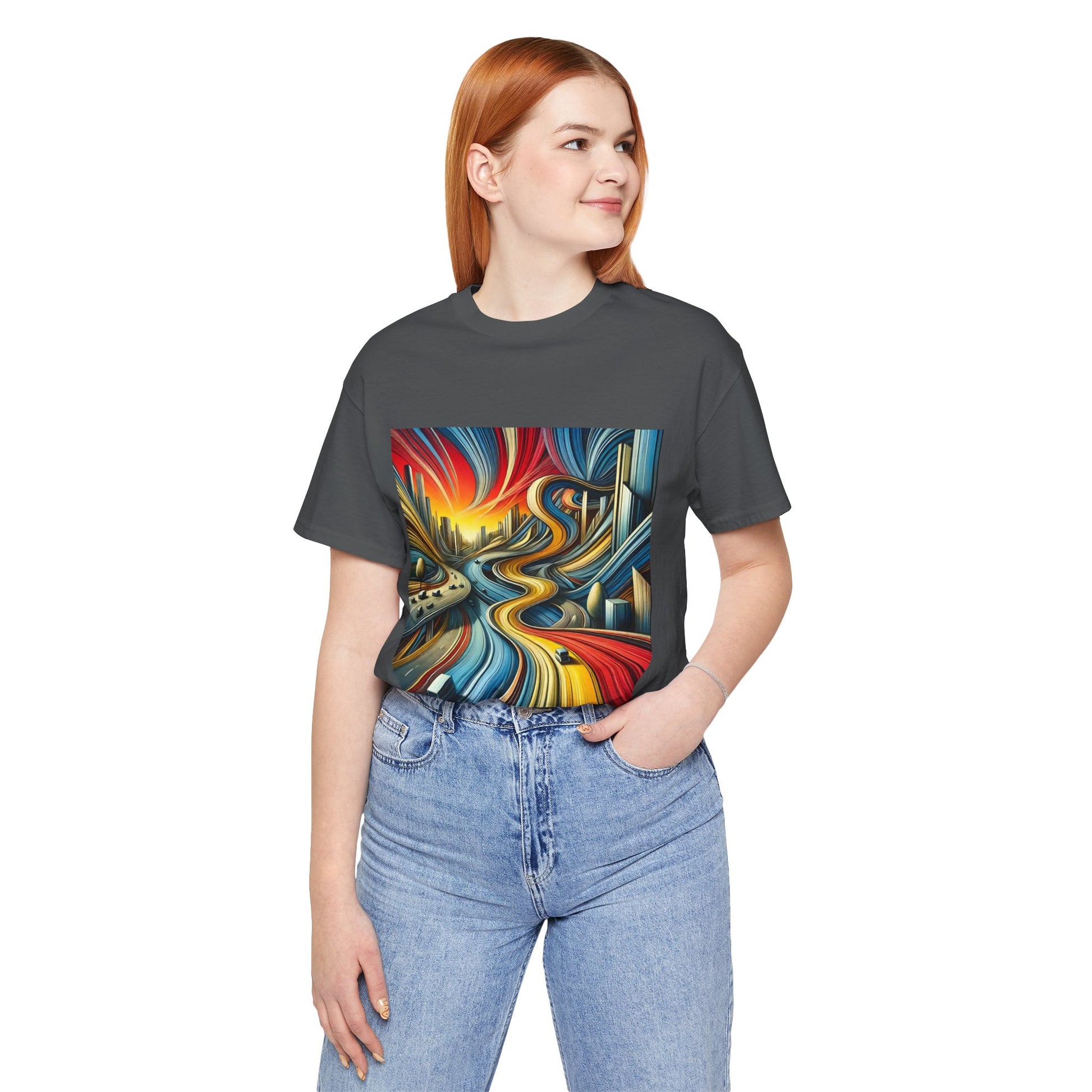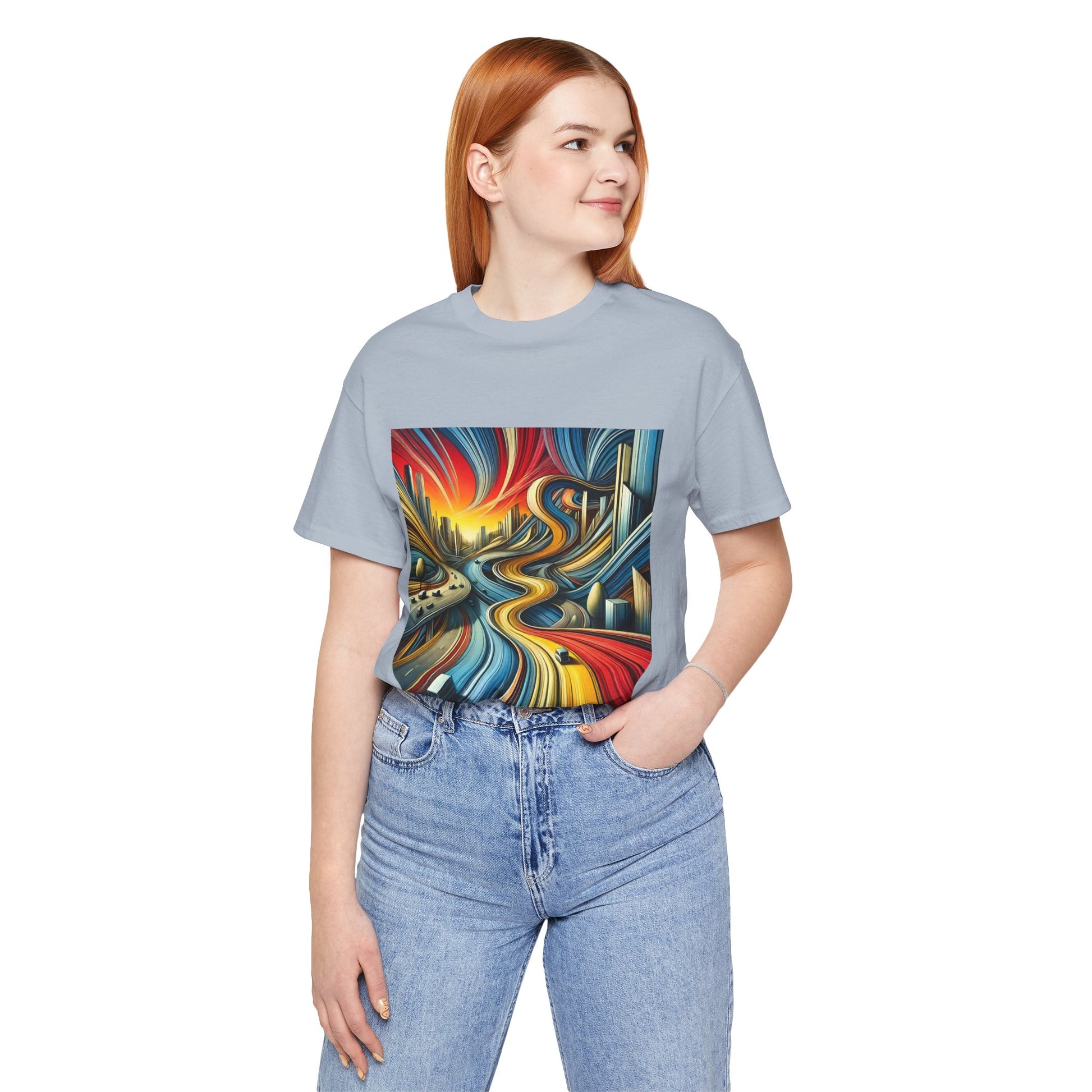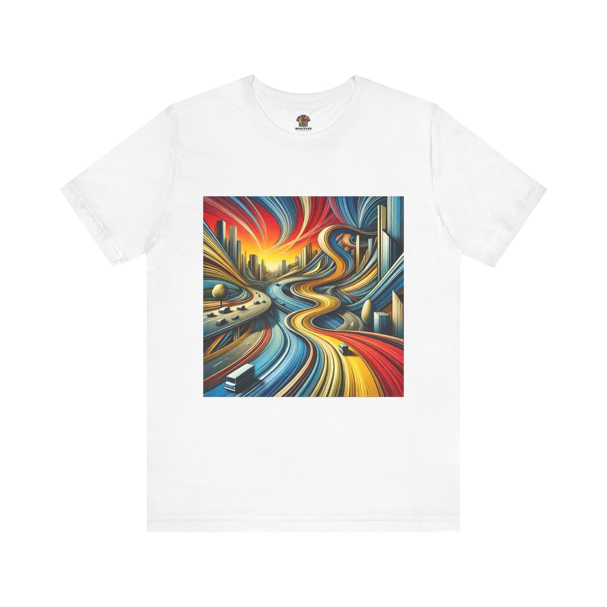 Rolling, distorted roads and warped horizons within a chaotic urban environment, creating a surreal, abstract landscape.