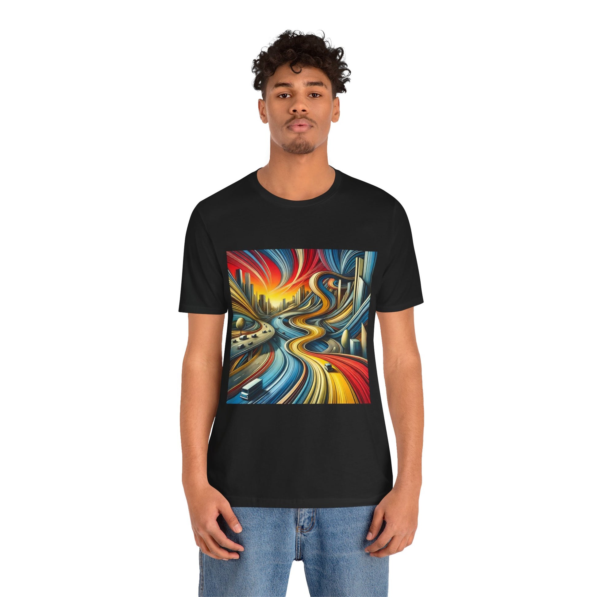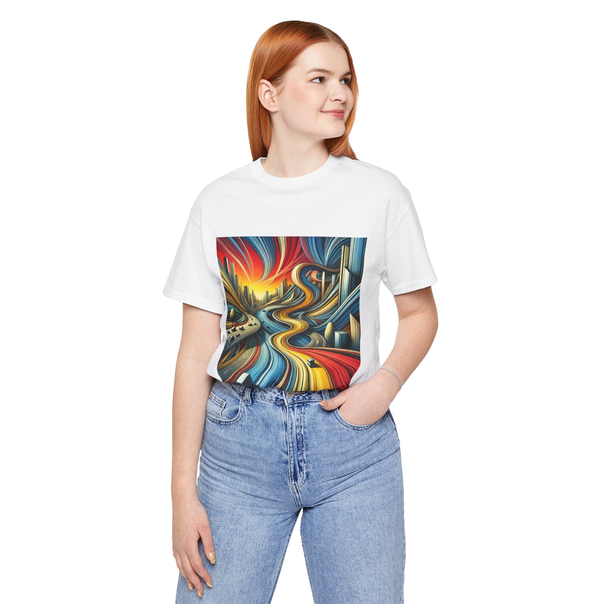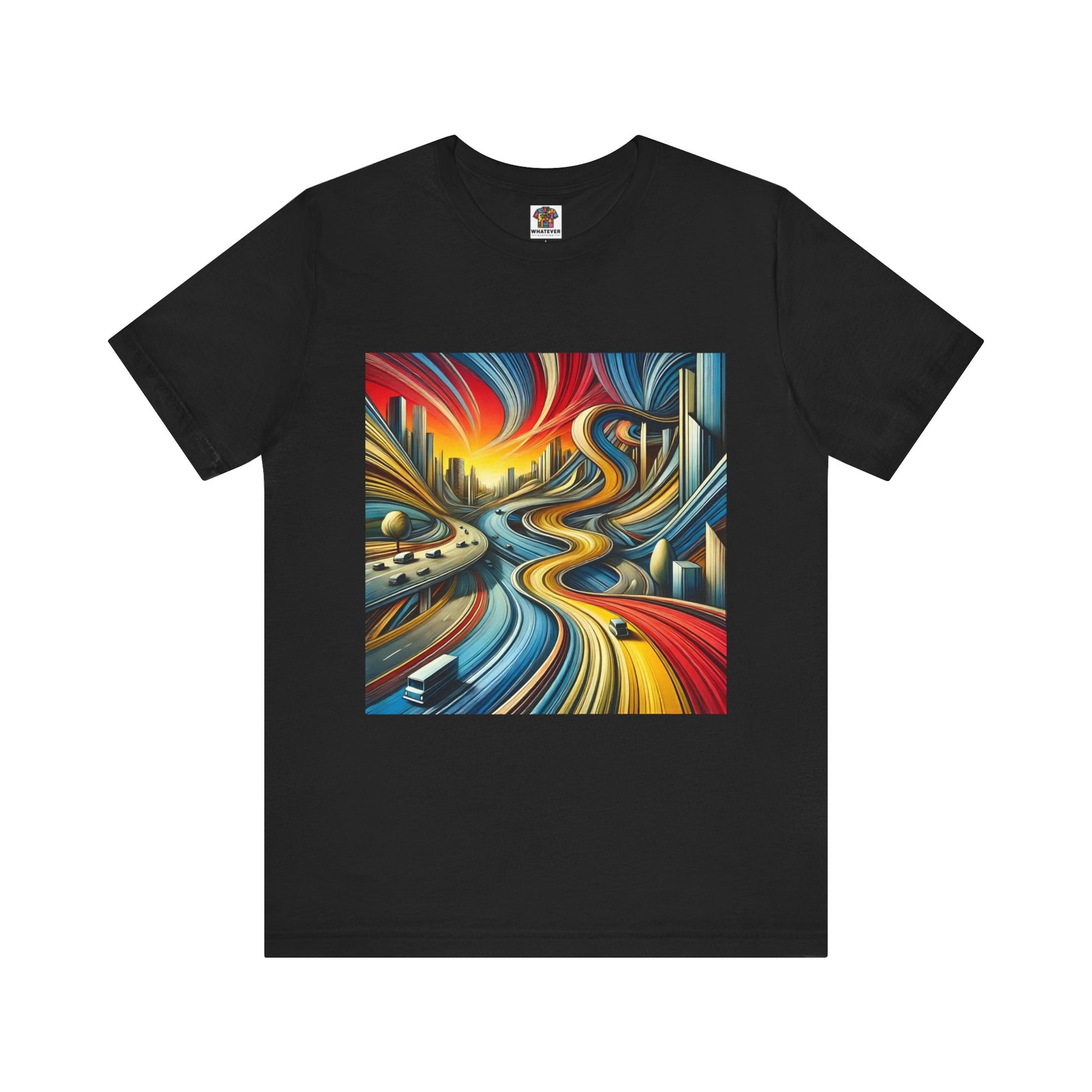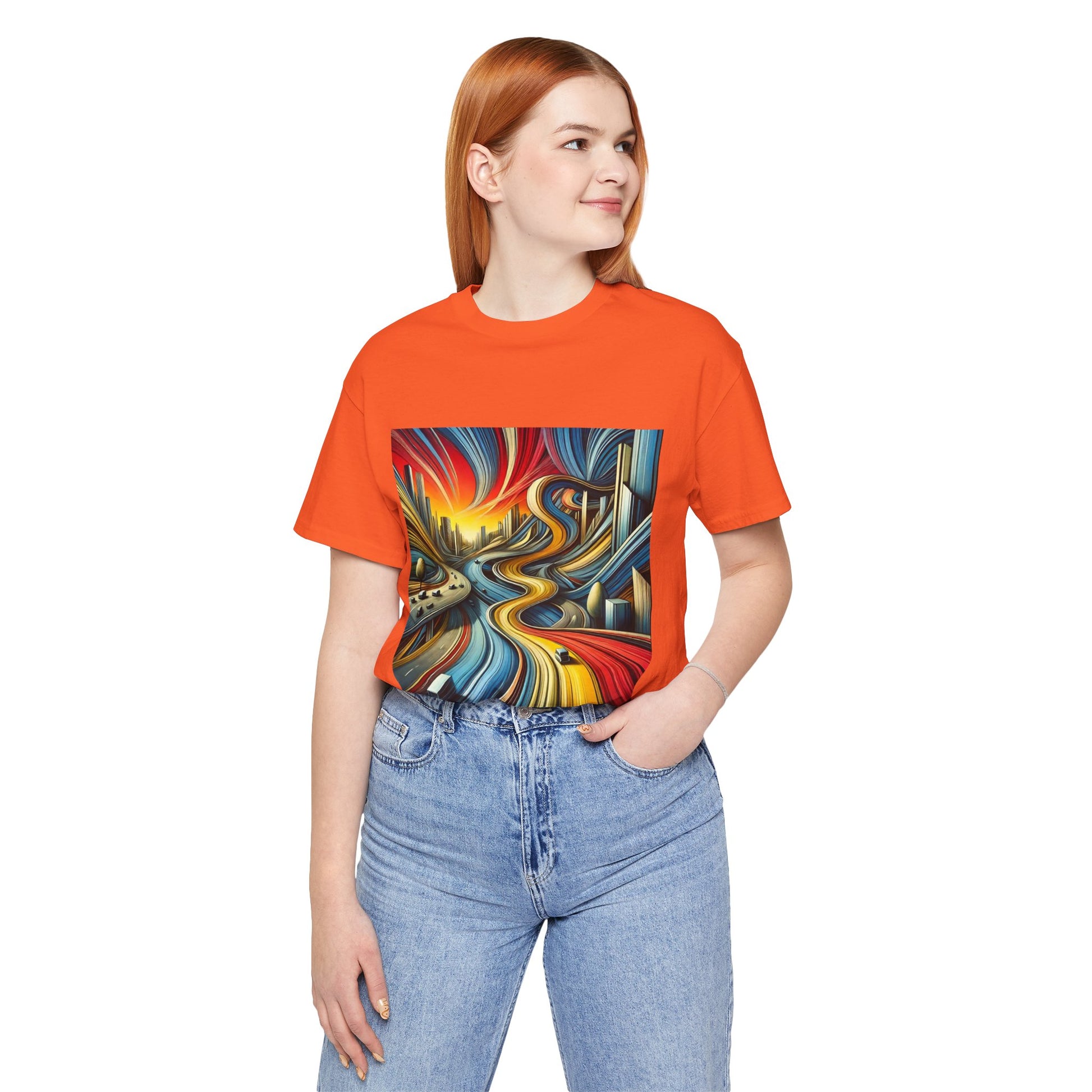 Rolling, distorted roads and warped horizons within a chaotic urban environment, creating a surreal, abstract landscape.