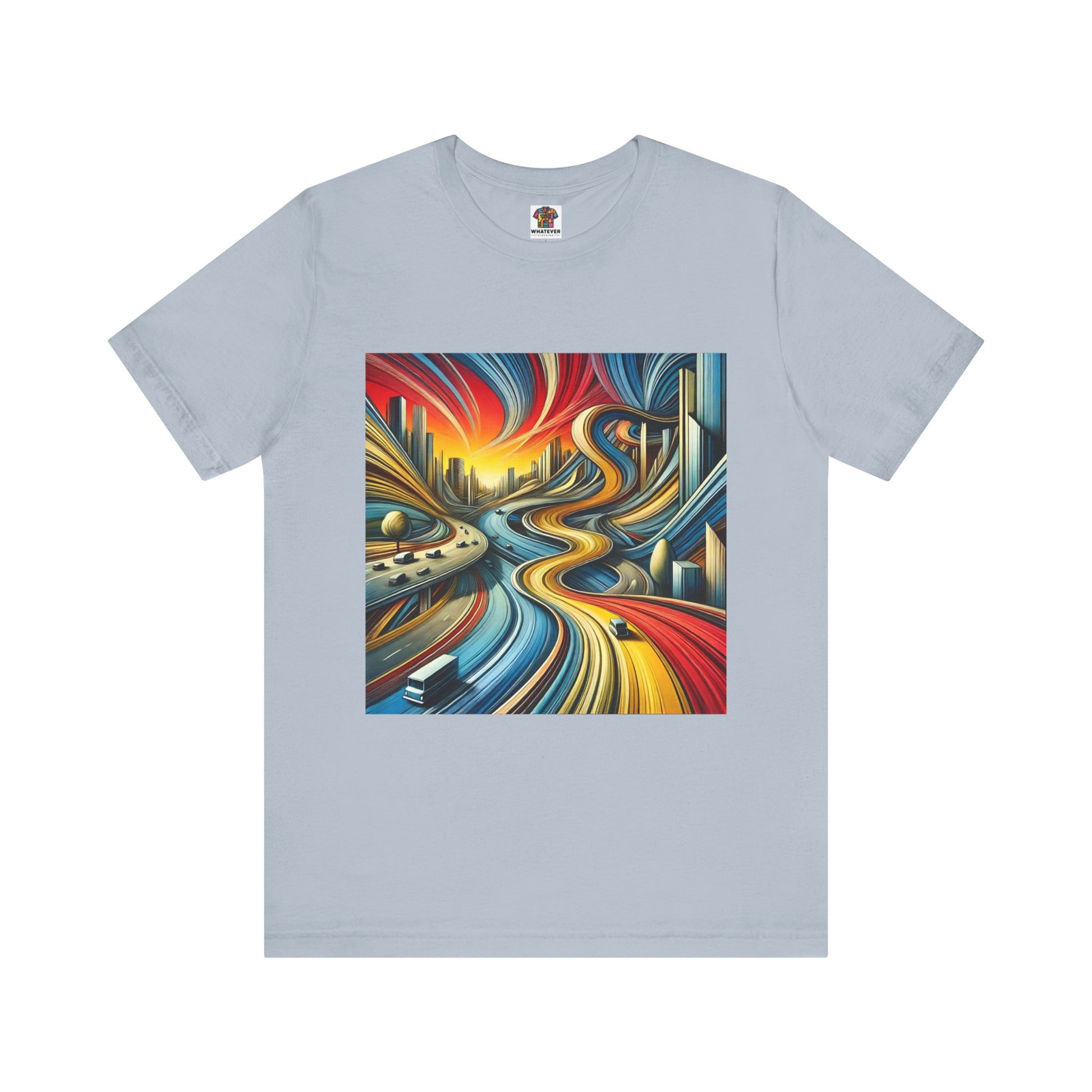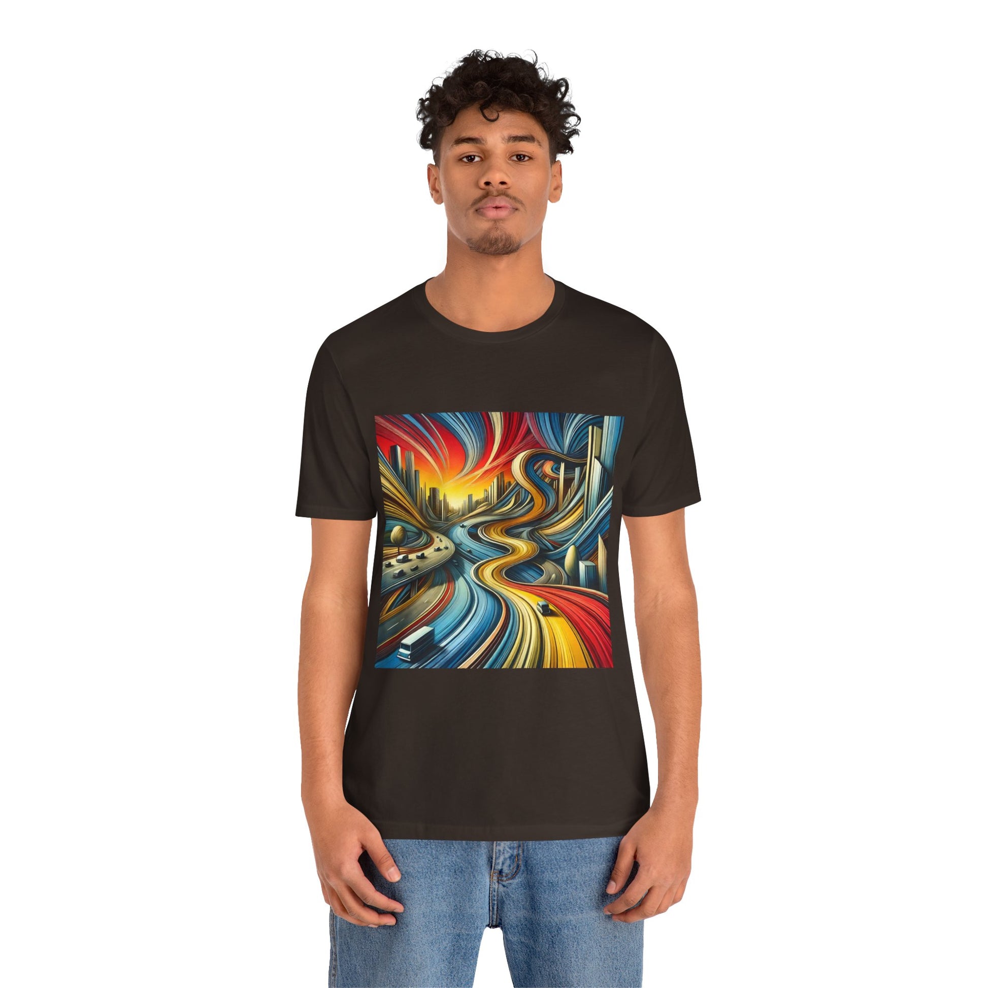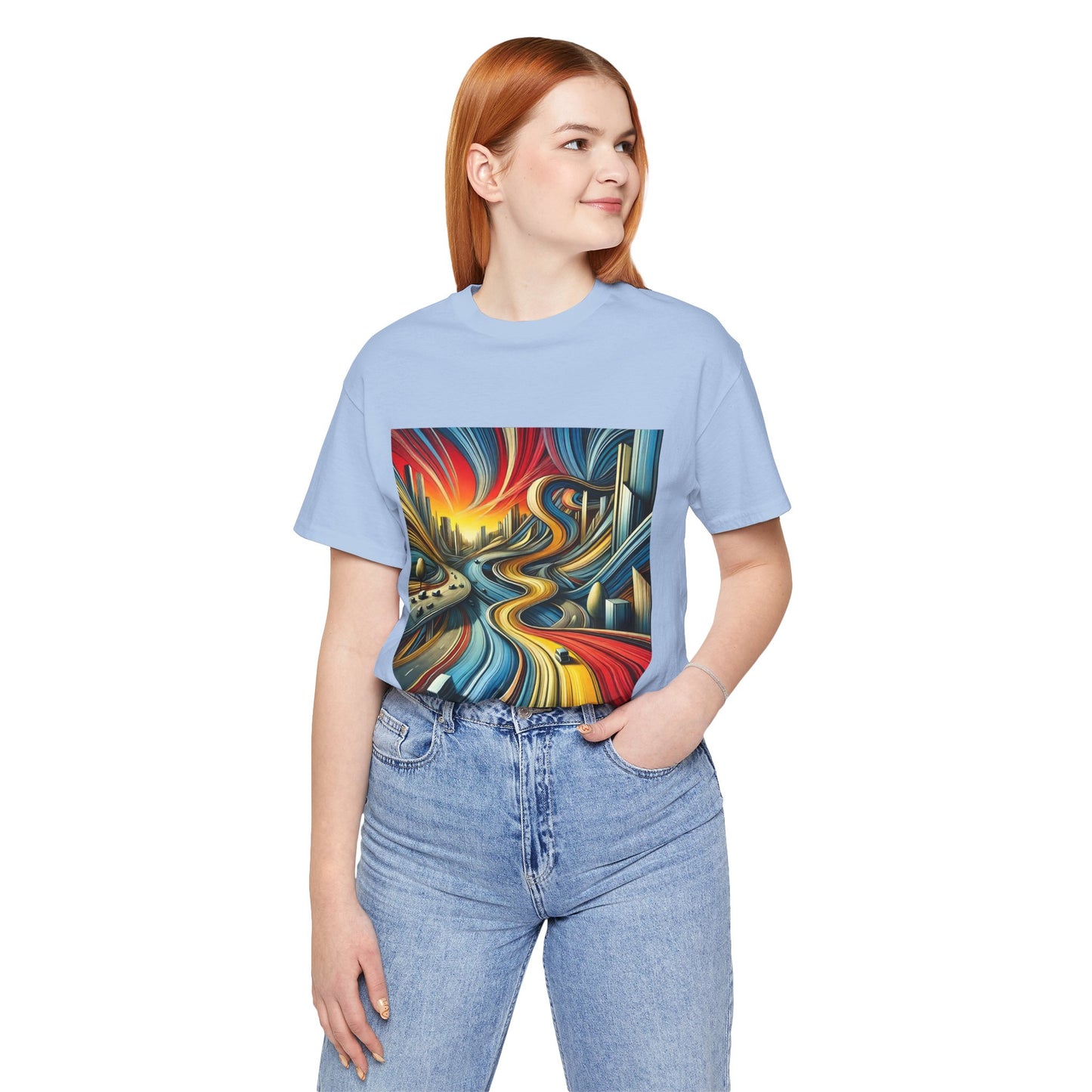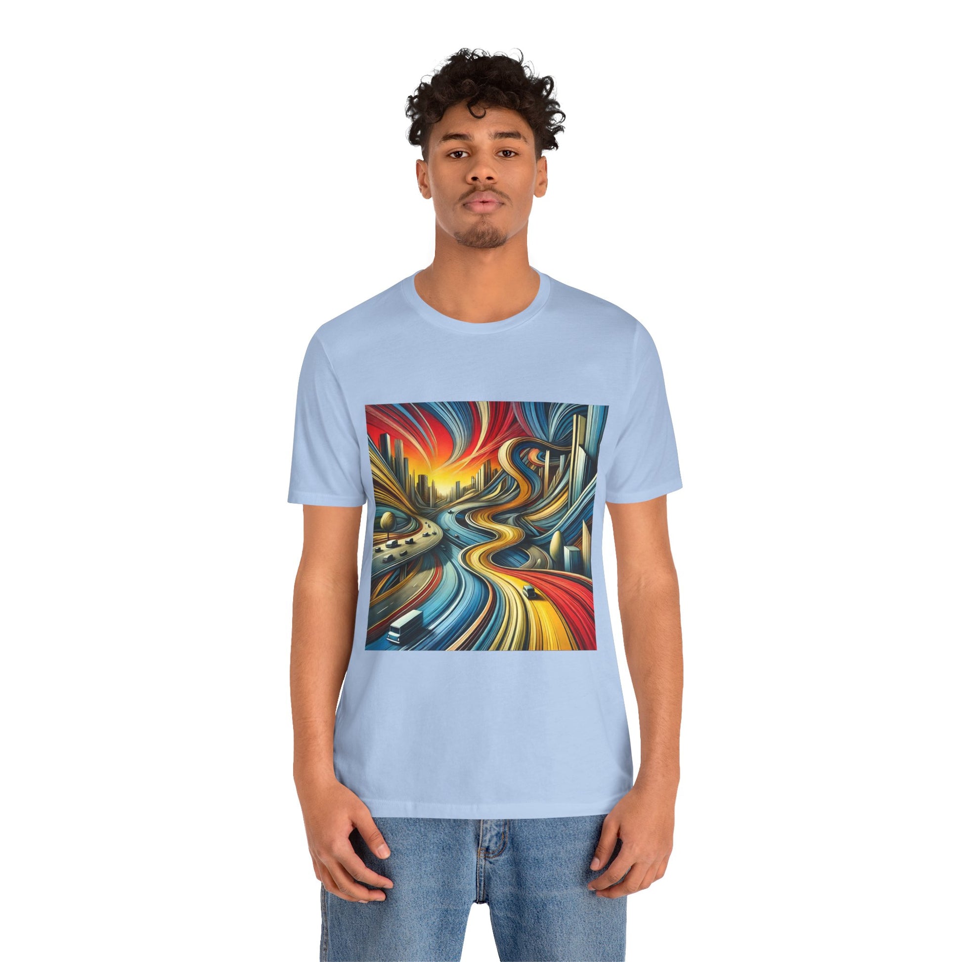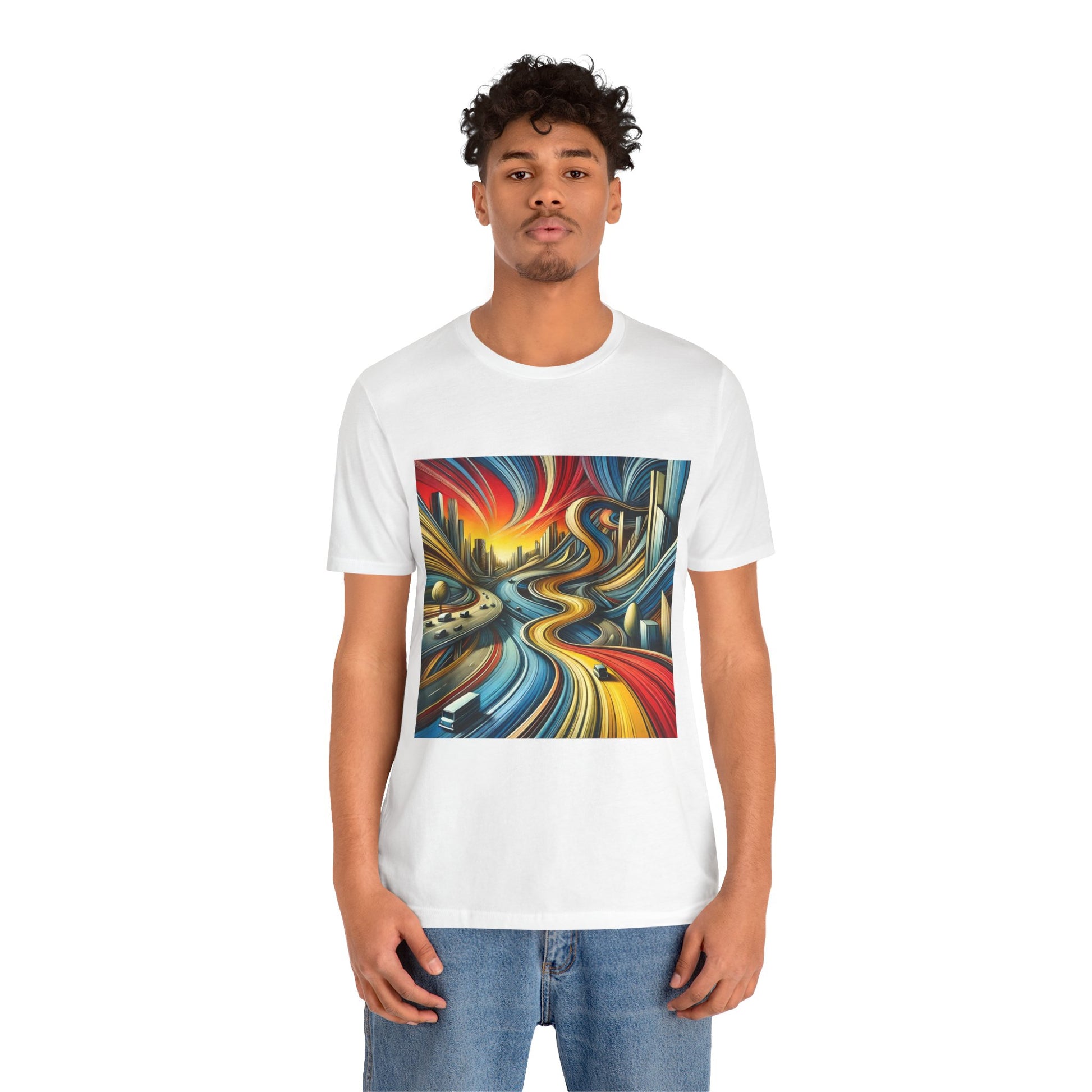 Rolling, distorted roads and warped horizons within a chaotic urban environment, creating a surreal, abstract landscape.