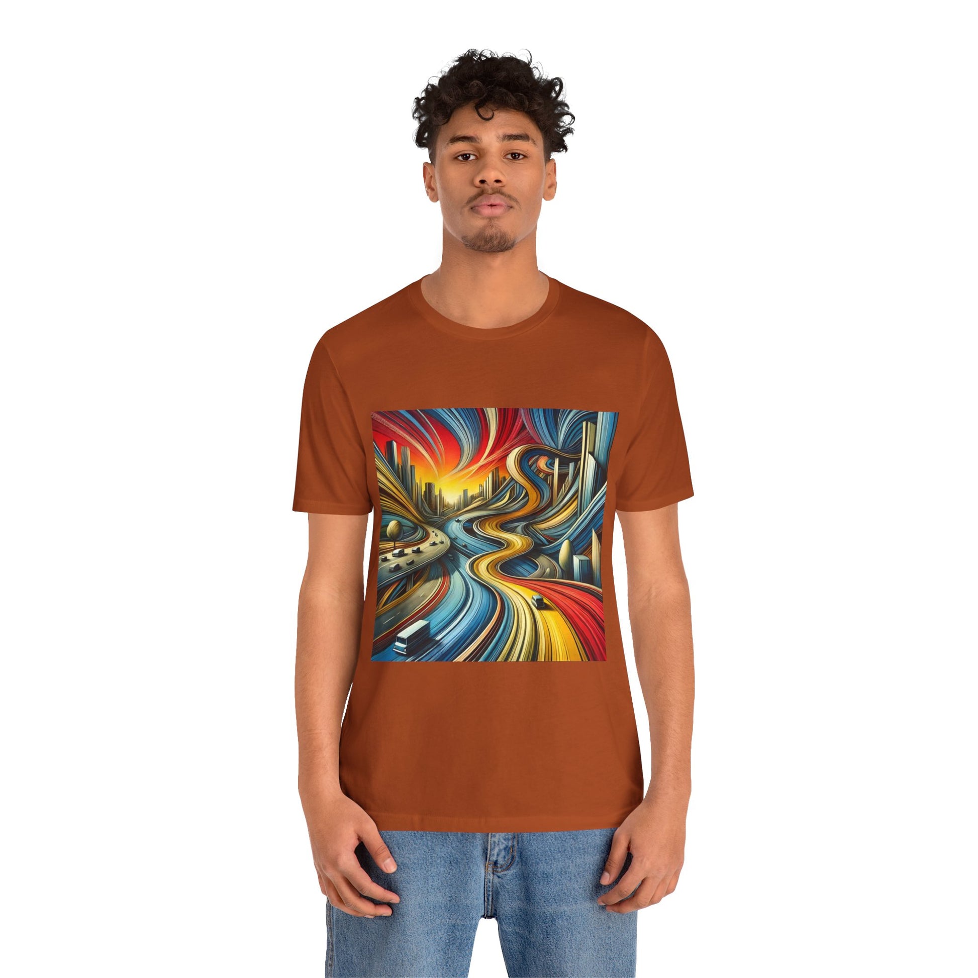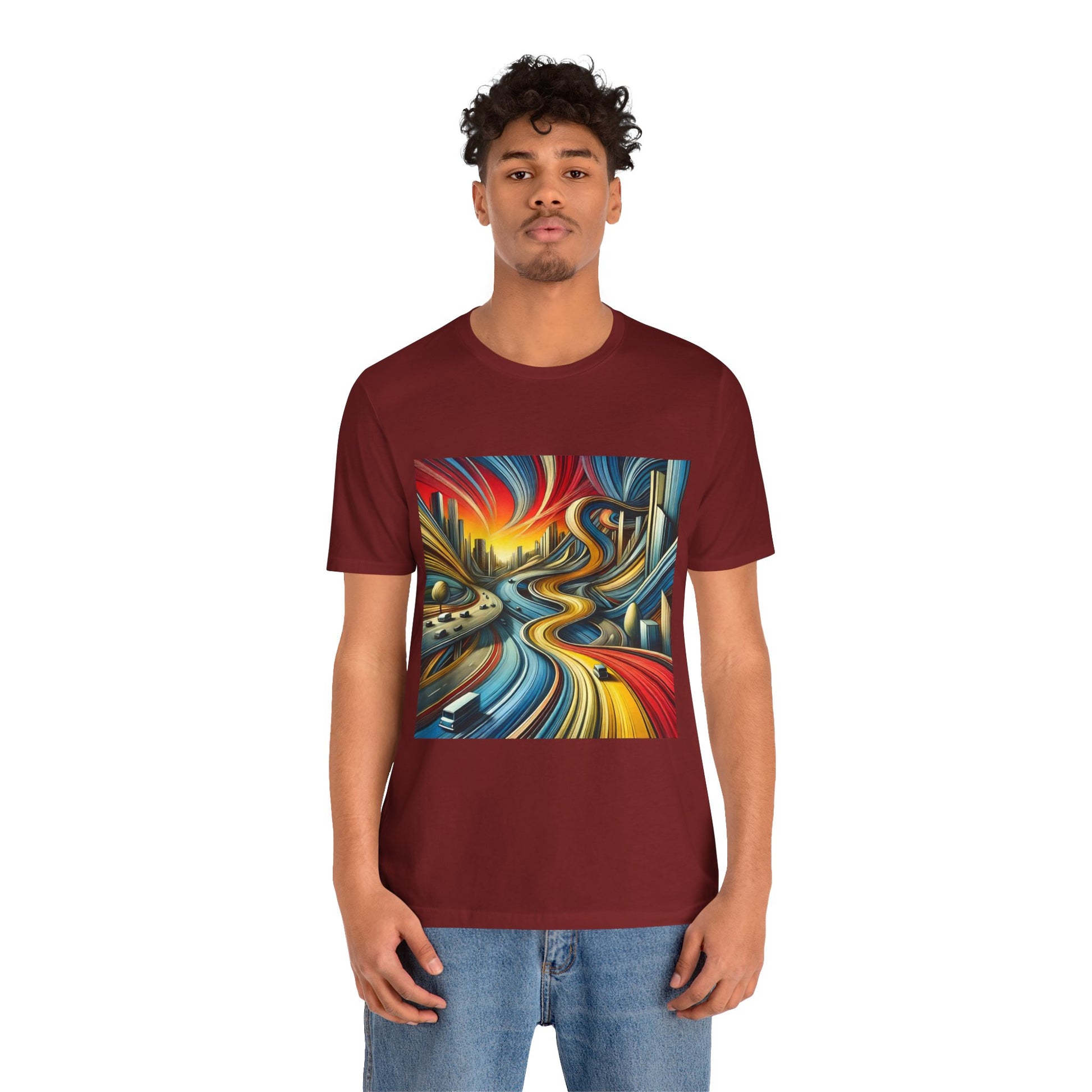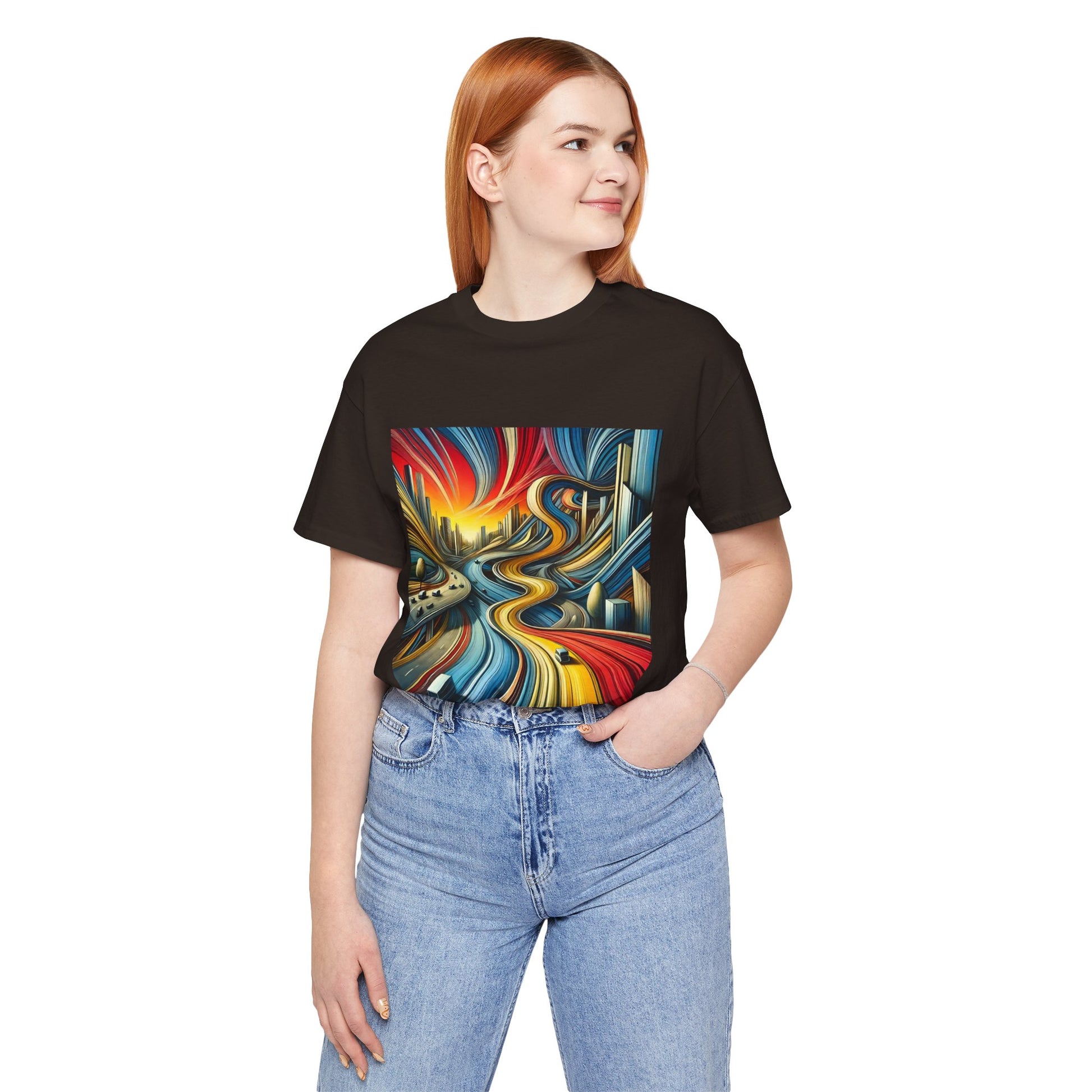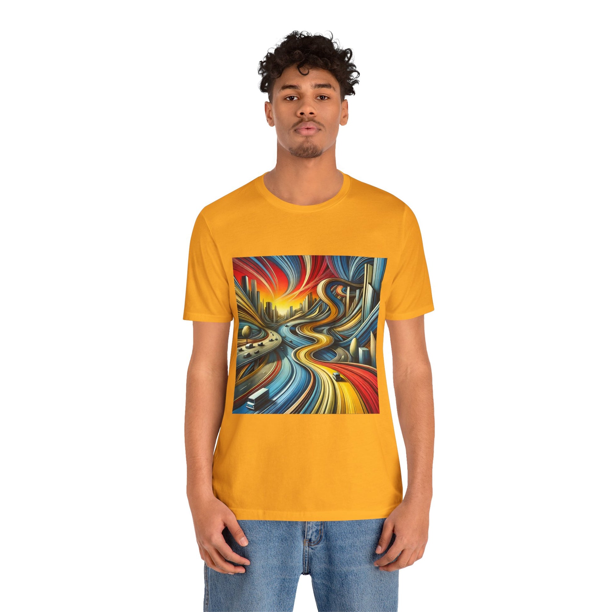 Rolling, distorted roads and warped horizons within a chaotic urban environment, creating a surreal, abstract landscape.