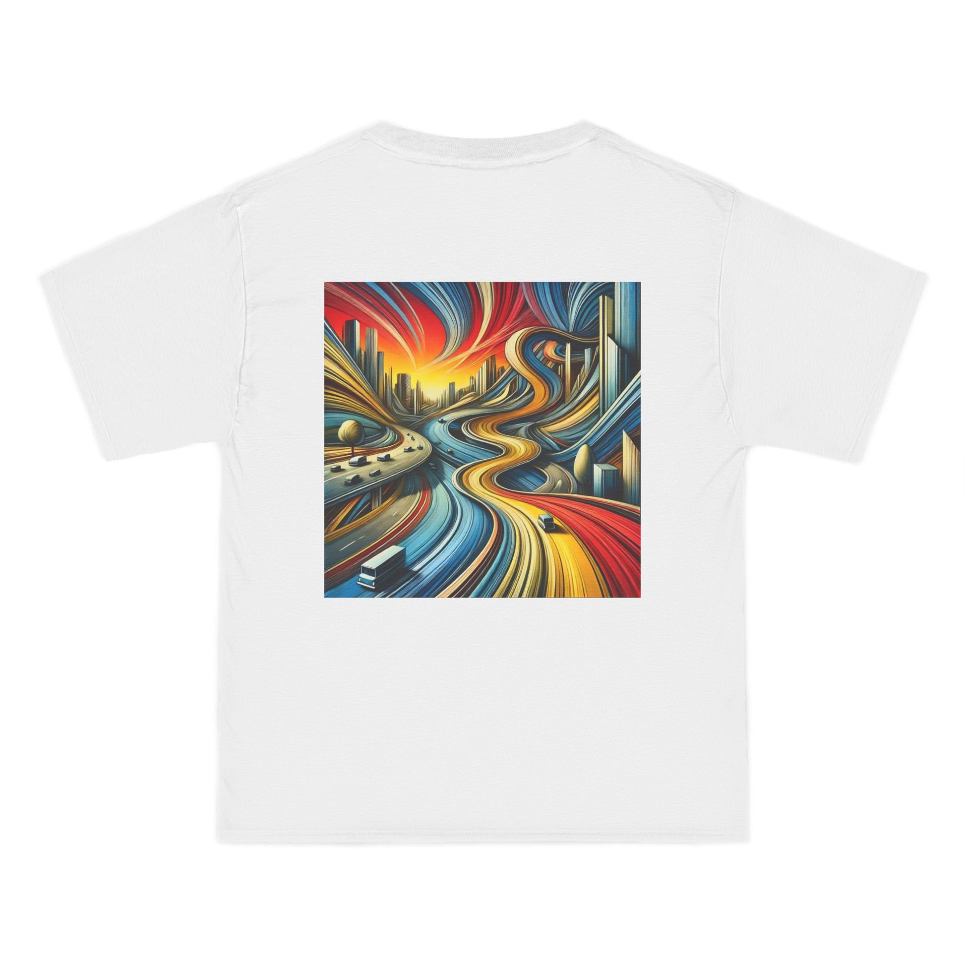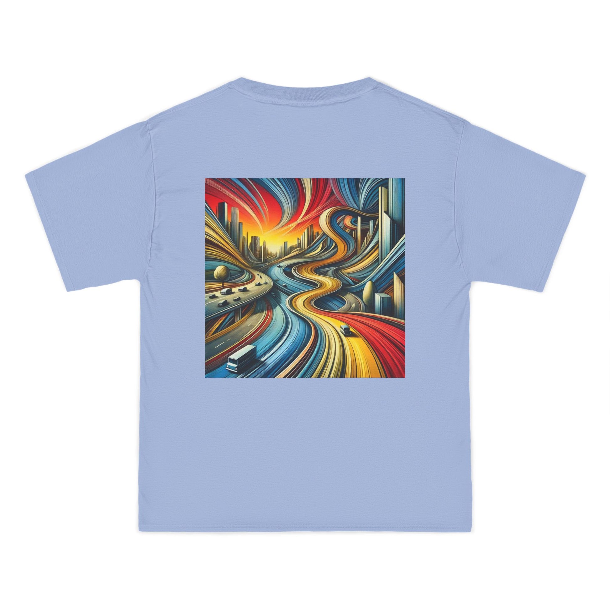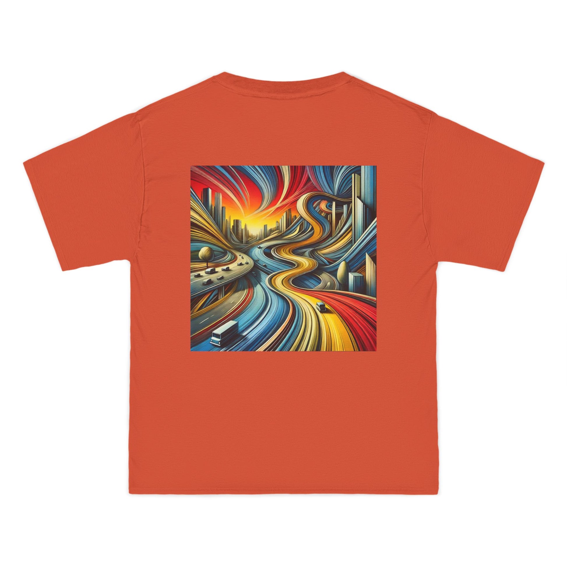Step into a world where imagination meets reality with our 'Distorted Landscape: Futurist Expressionism' tee. The design, featuring rolling, distorted roads and warped horizons against a chaotic urban backdrop, offers a surreal, abstract landscape that beckons your inner artist.