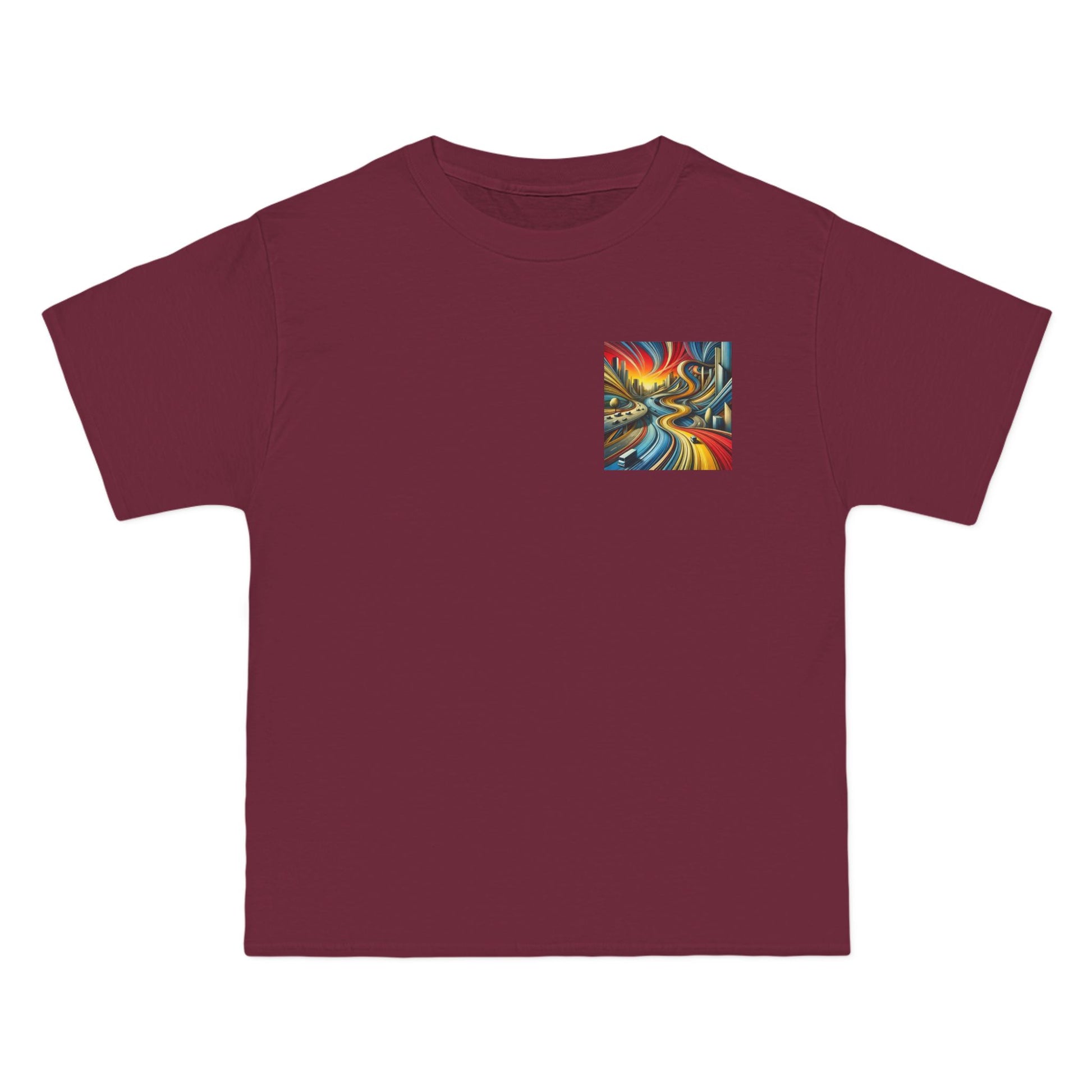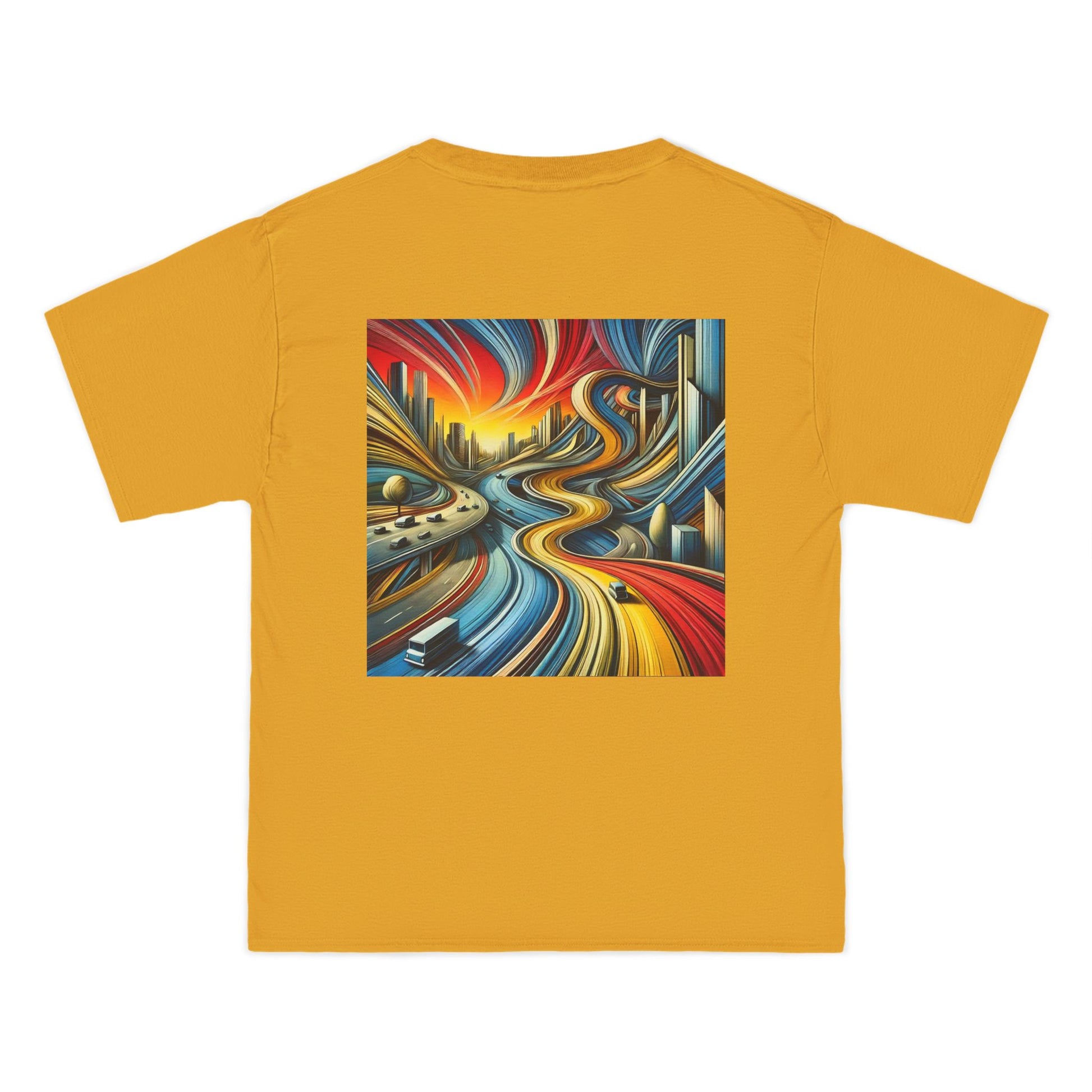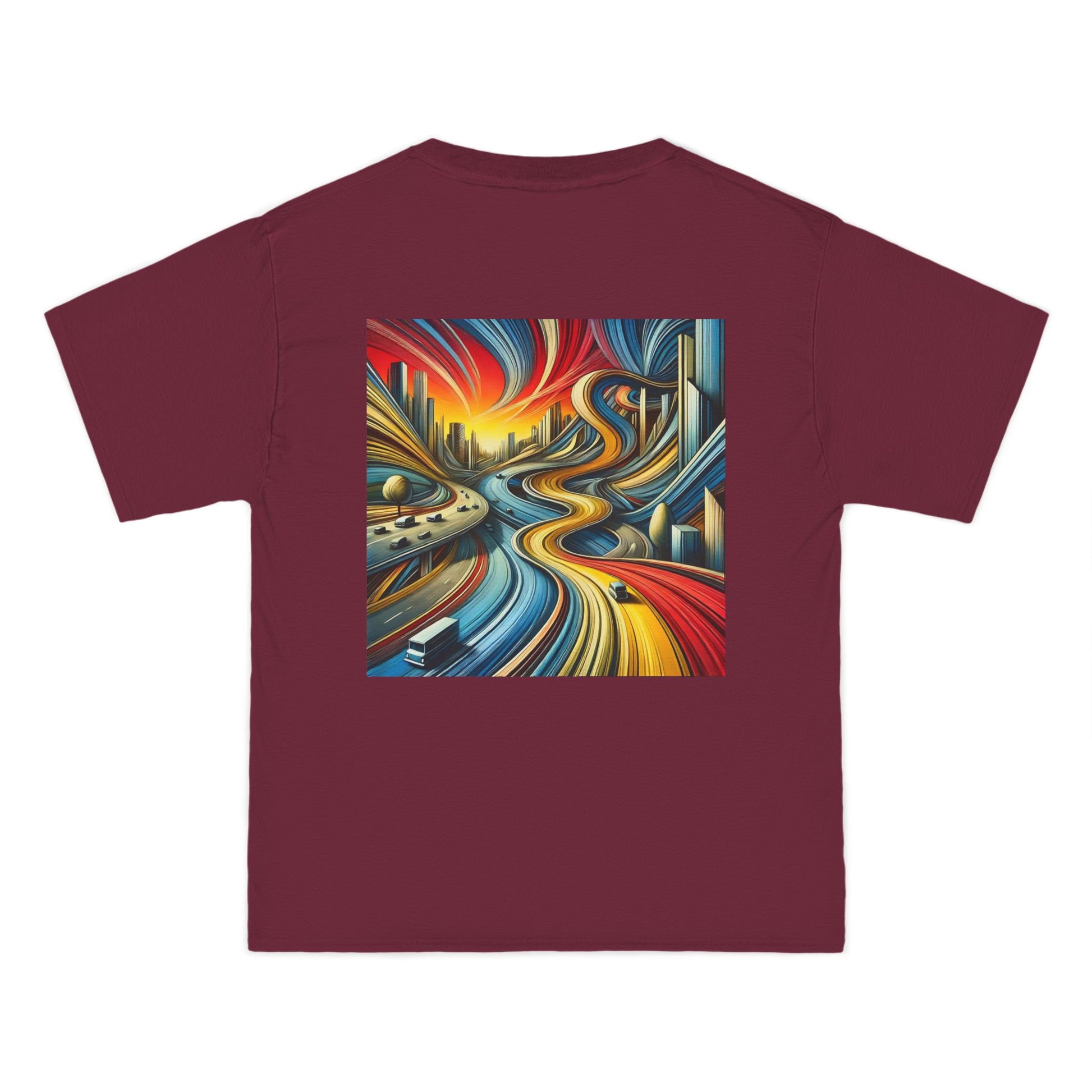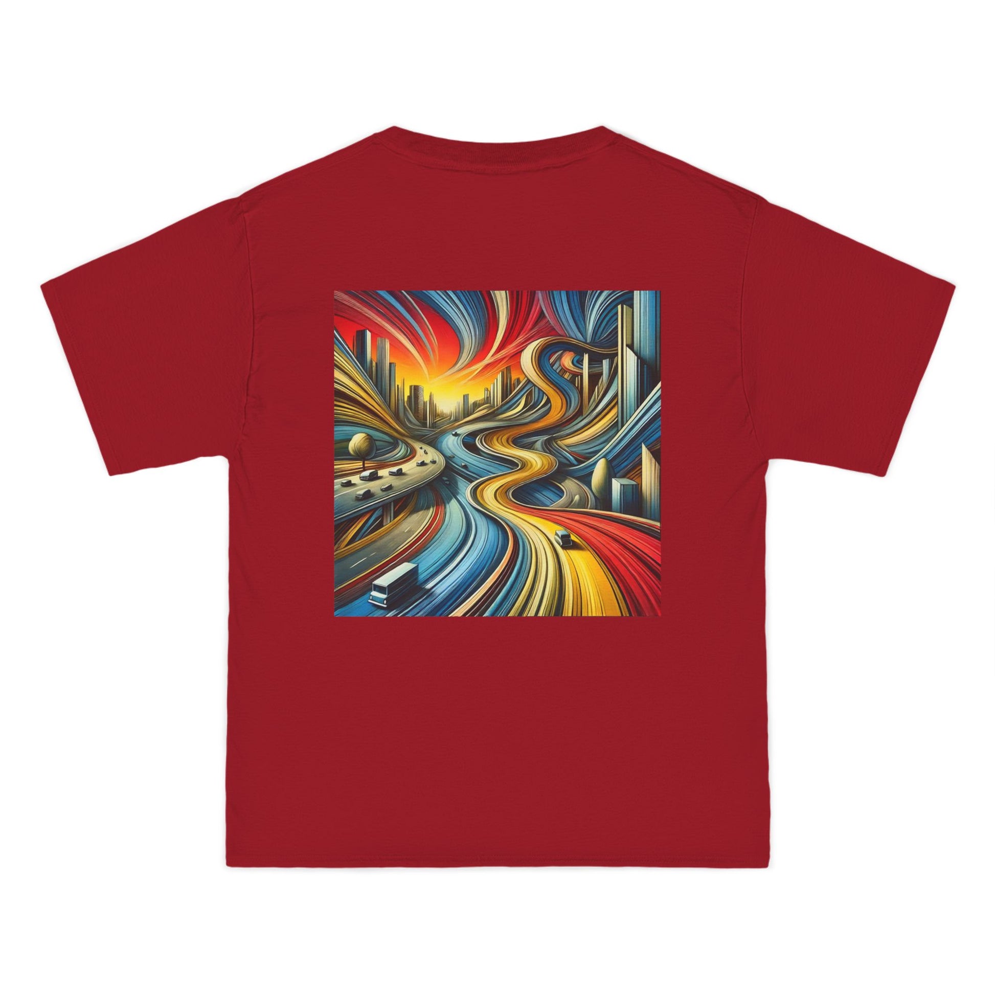 Step into a world where imagination meets reality with our 'Distorted Landscape: Futurist Expressionism' tee. The design, featuring rolling, distorted roads and warped horizons against a chaotic urban backdrop, offers a surreal, abstract landscape that beckons your inner artist.