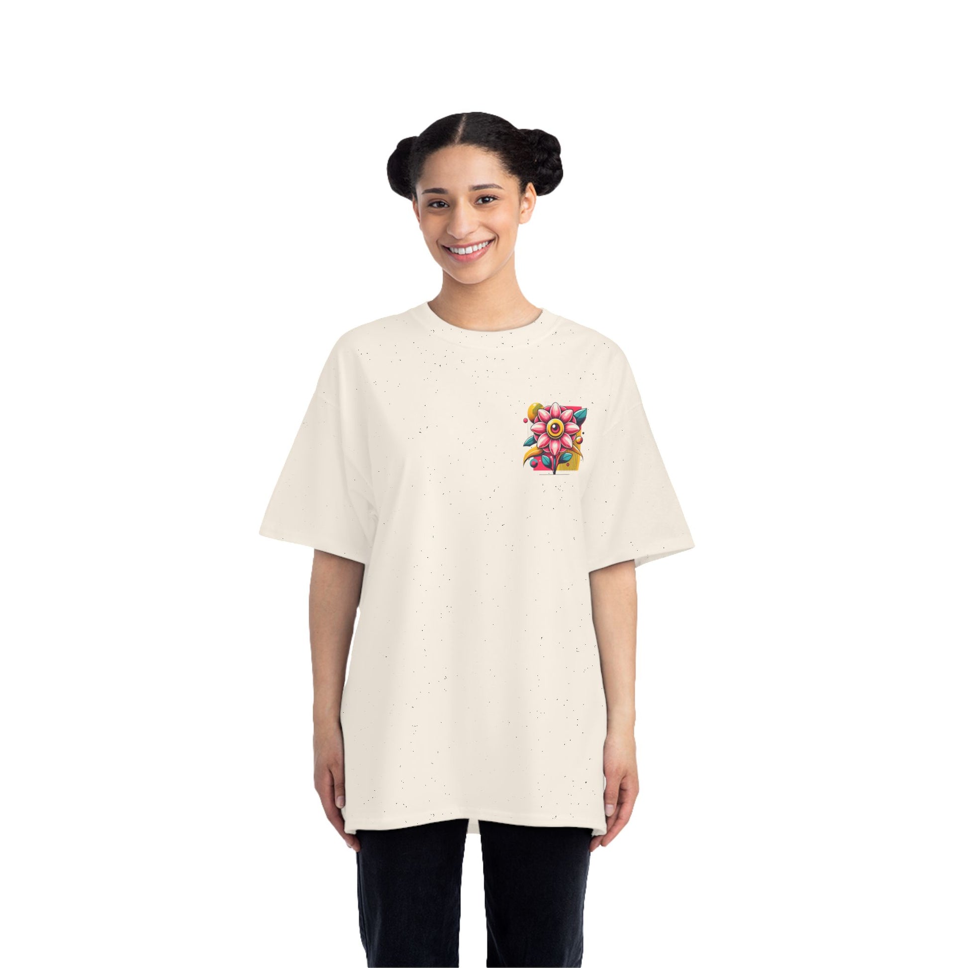 Introducing the Eye Flower: Surreal Minimalism, a wearable masterpiece crafted to inspire. This unique design, featuring an enchanting flower with oversized petals and a mesmerizing central eye, blooming amidst a sea of abstract shapes, is a bold celebration of individuality. Painted in a captivating palette of soft pink and vibrant yellow, it's more than just a garment - it's wearable art.