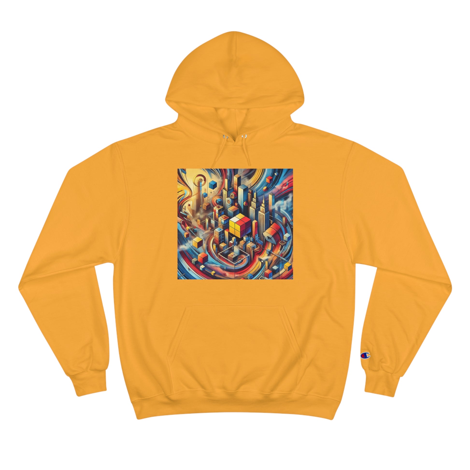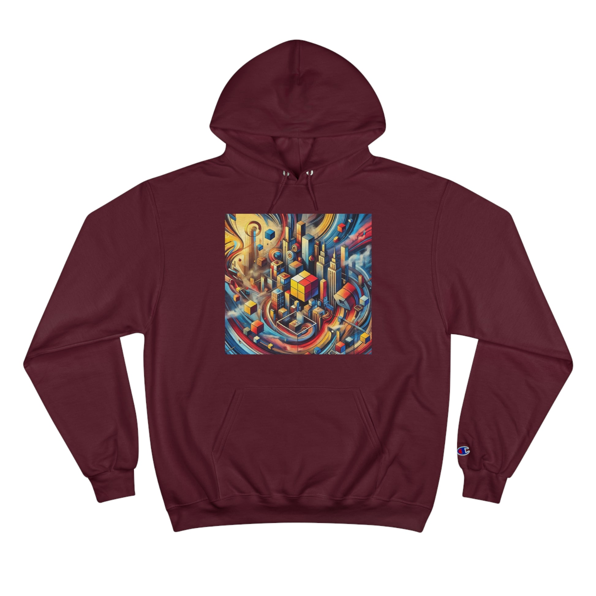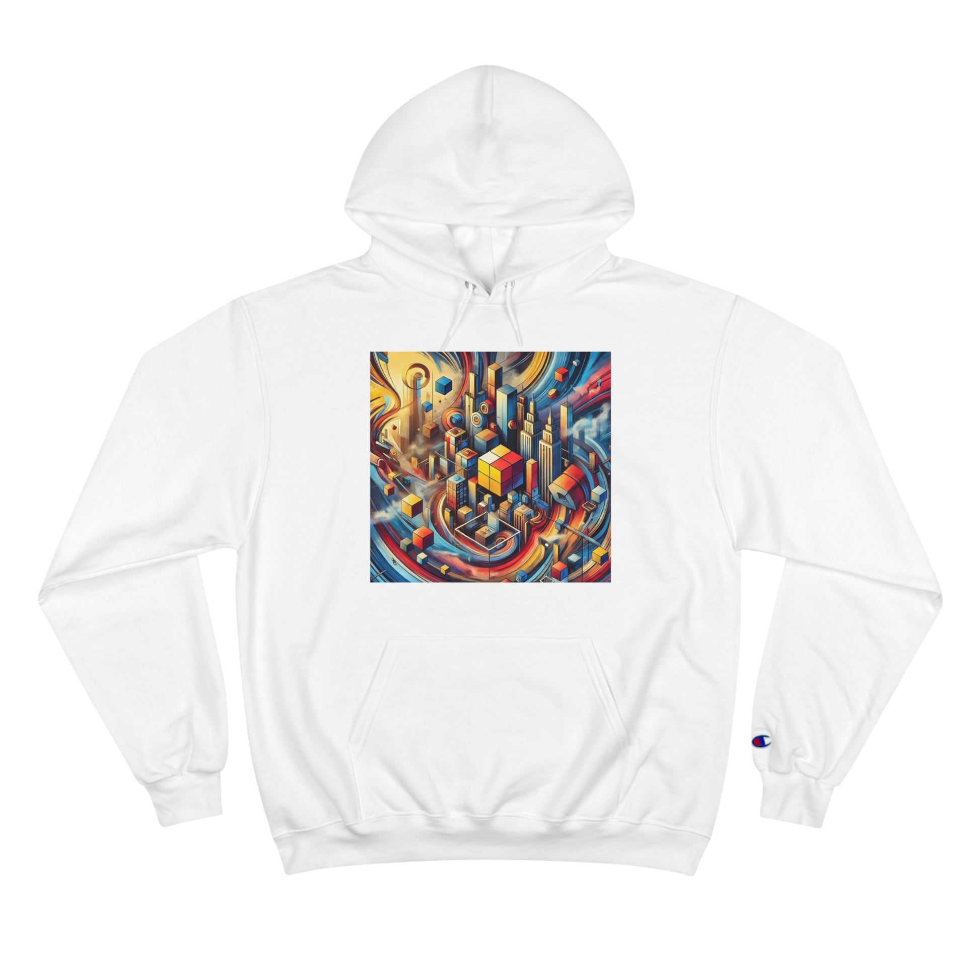 Slide your hands into the convenient kangaroo pockets, adjust the two-ply hood to your liking, and immerse yourself in the vibrant cityscape of abstract cubes and pyramids floating around. The seamless design not only minimizes fabric waste but also enhances the artwork's fluidity.