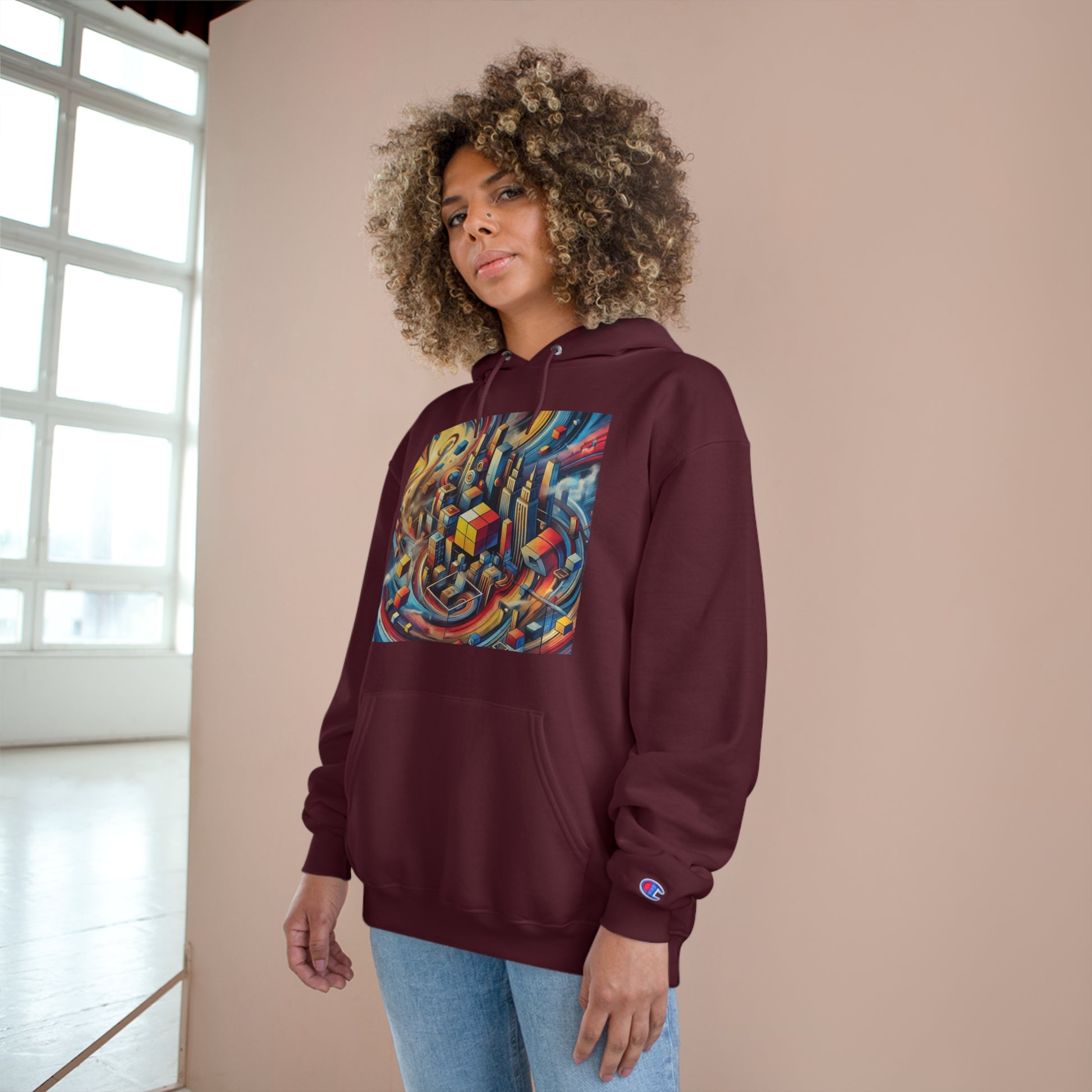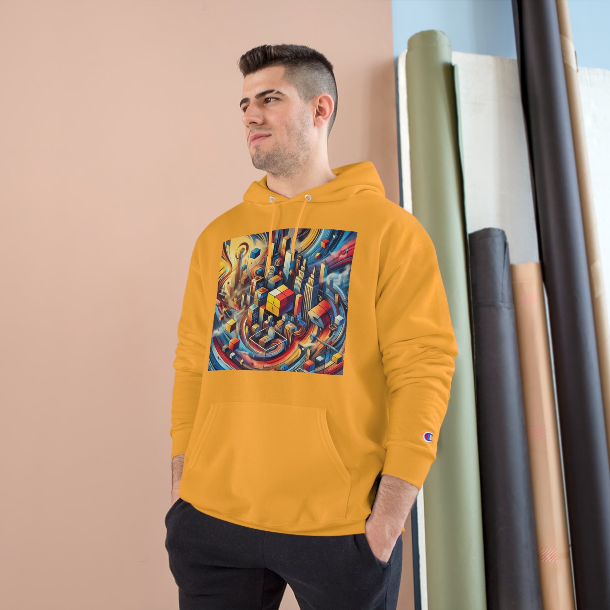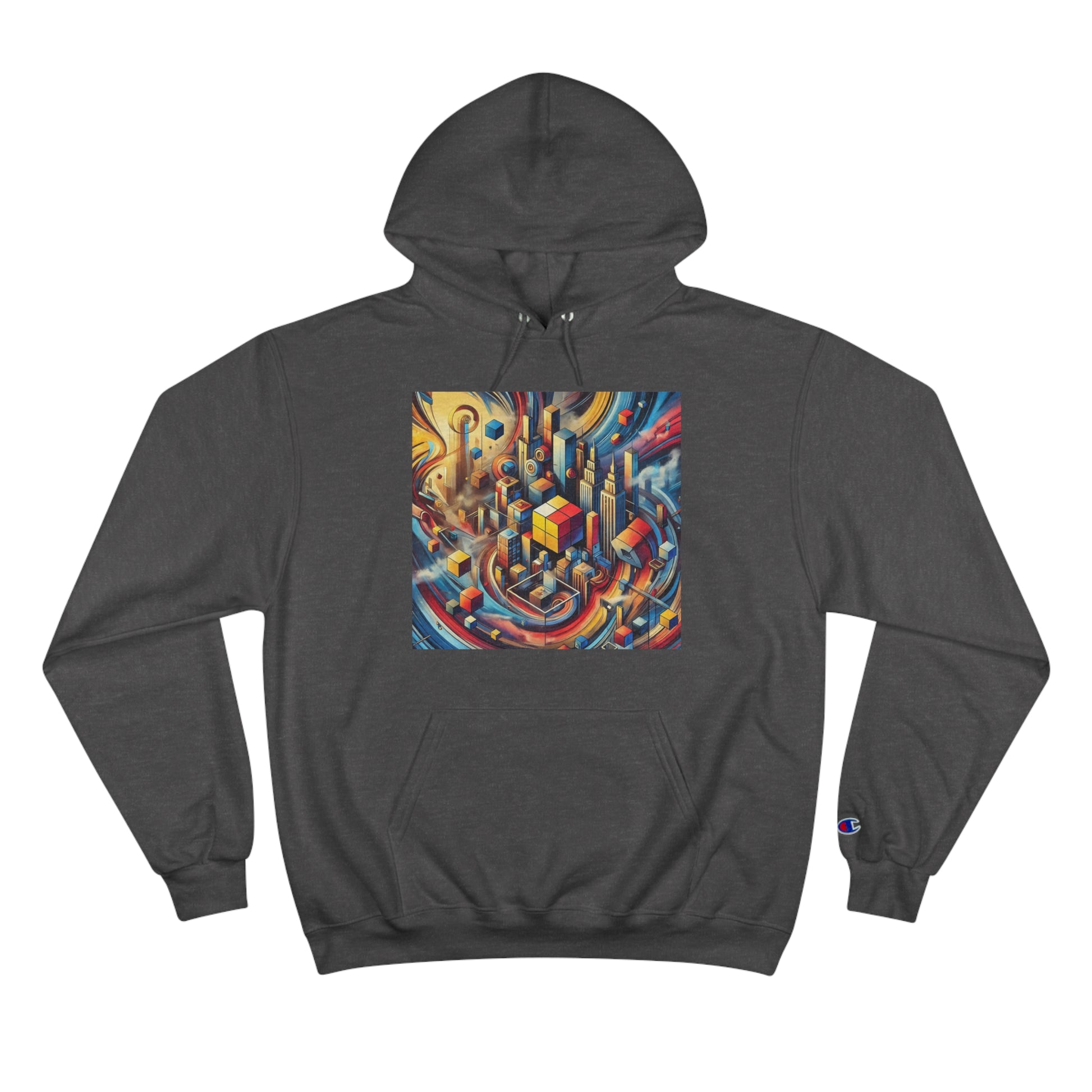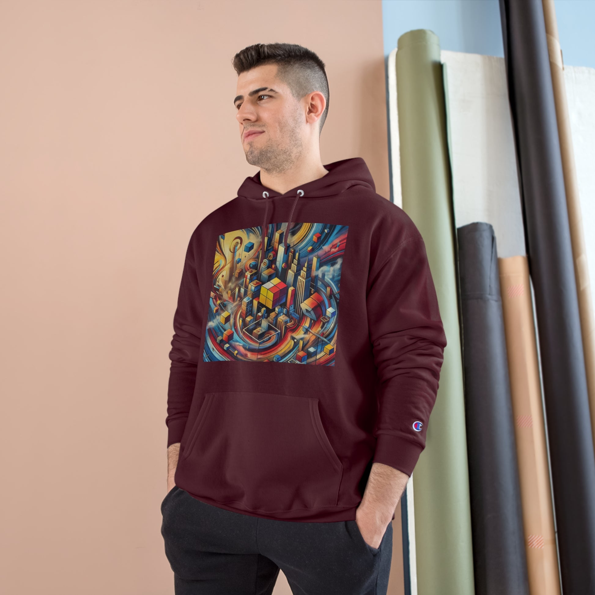 Slide your hands into the convenient kangaroo pockets, adjust the two-ply hood to your liking, and immerse yourself in the vibrant cityscape of abstract cubes and pyramids floating around. The seamless design not only minimizes fabric waste but also enhances the artwork's fluidity.