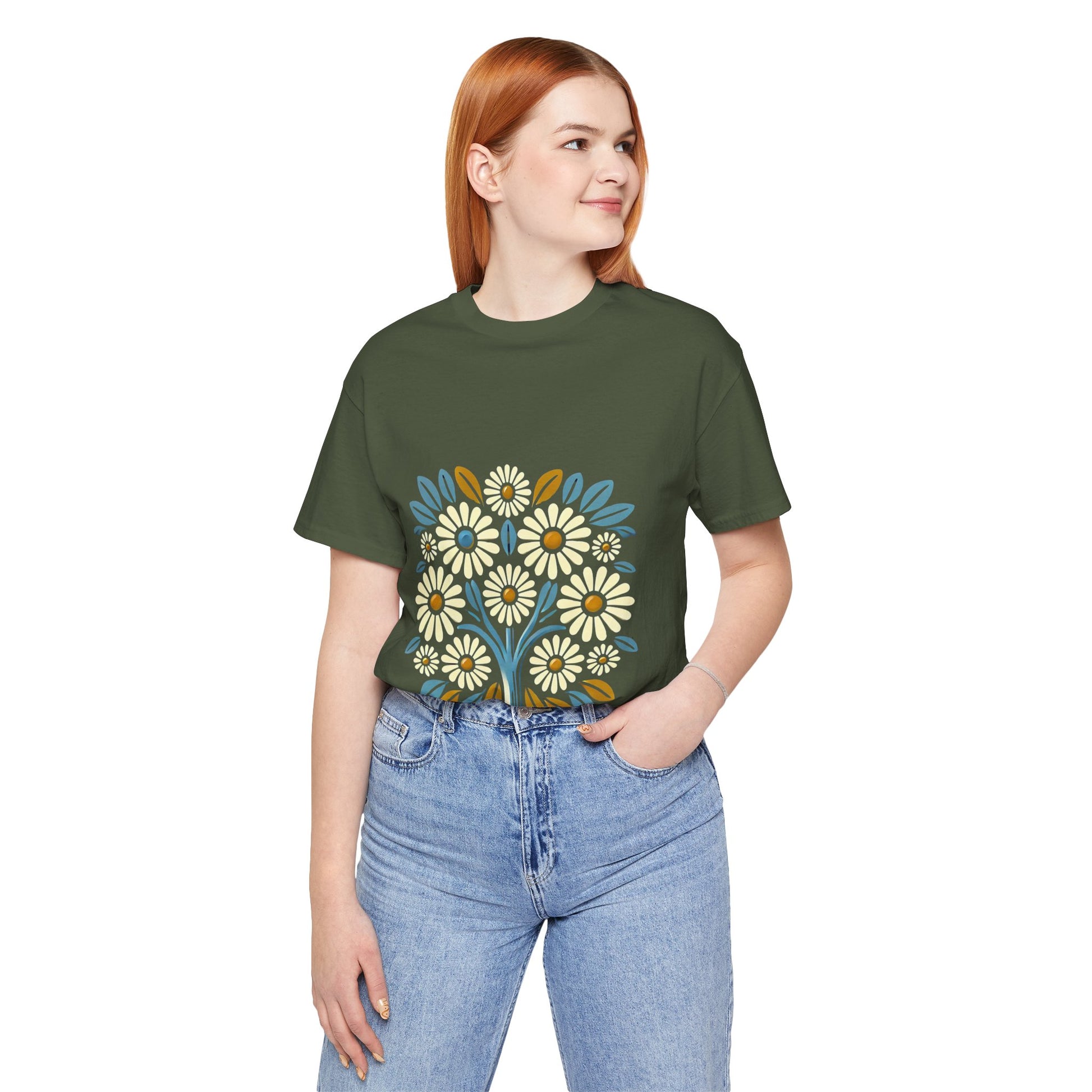 A bouquet of stylized flowers with large daisies, featuring bold white petals and mustard-yellow centers, in a graphic, retro design.