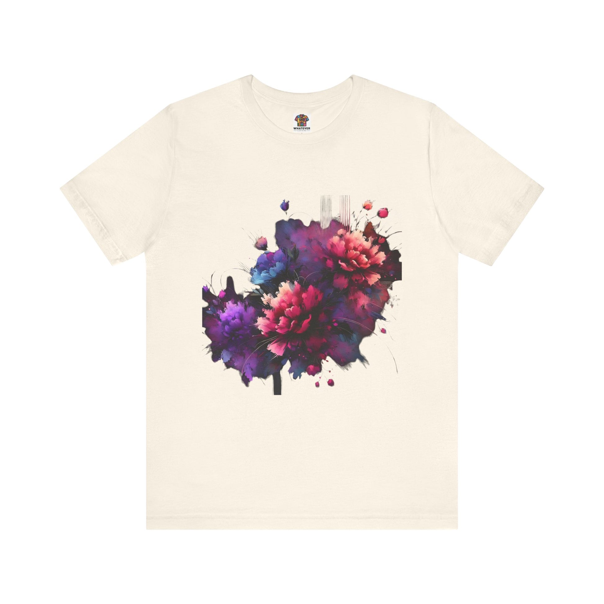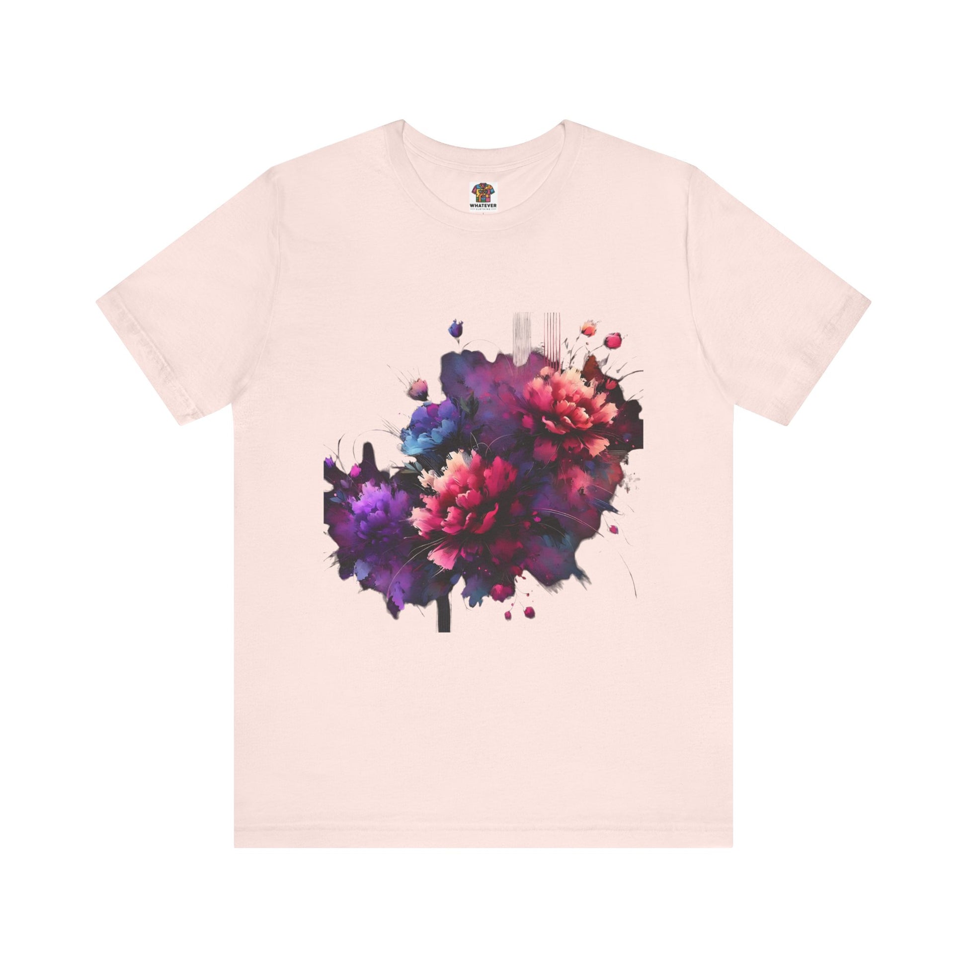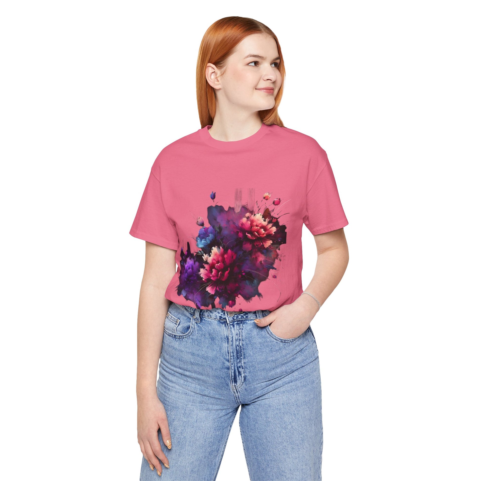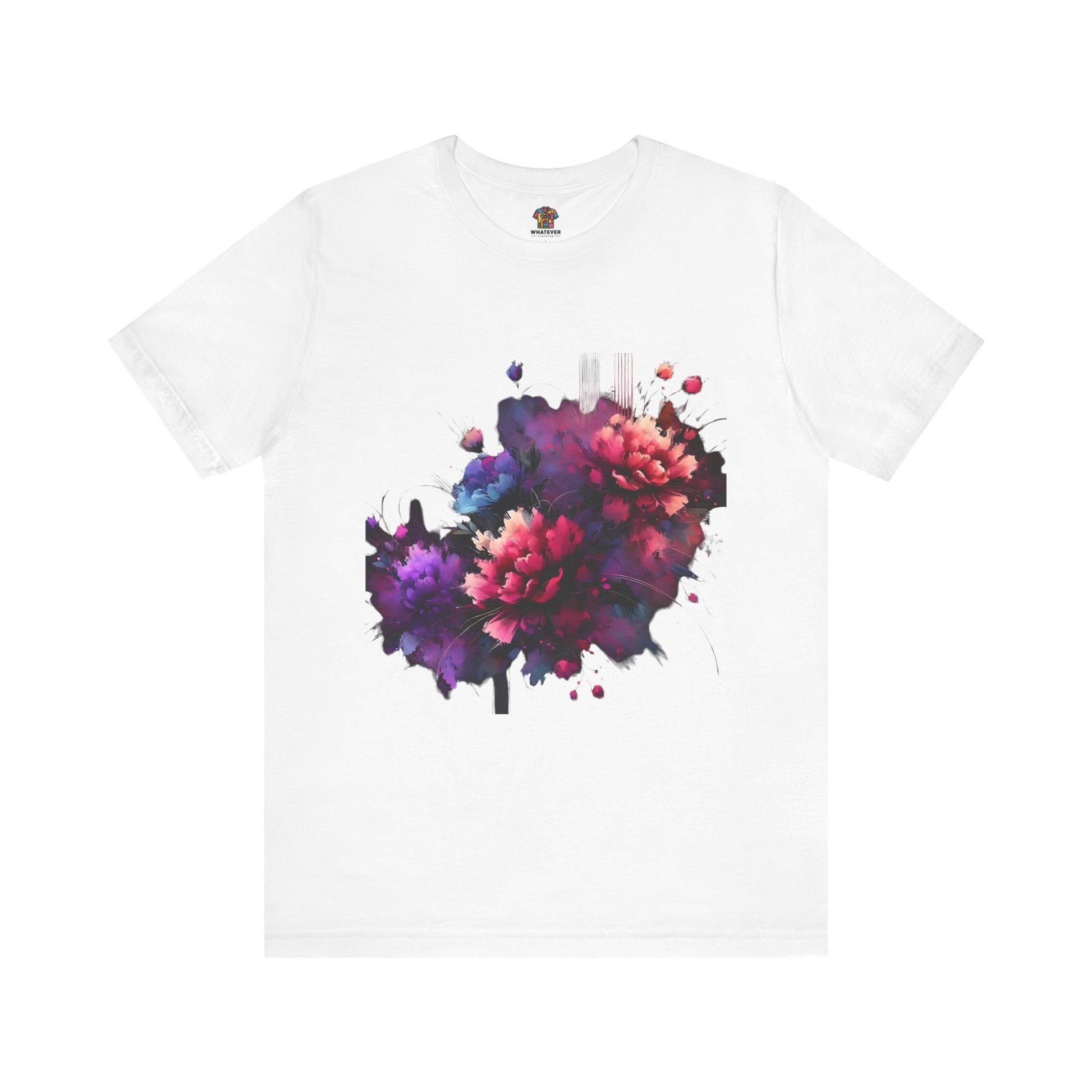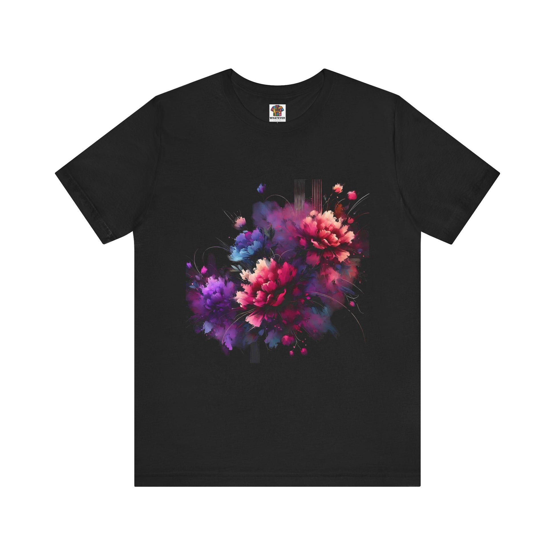 A floral design on a dark background with vibrant color splashes in bright pinks and deep purples. The abstract flowers have a gradient effect, creating a sense of movement.
