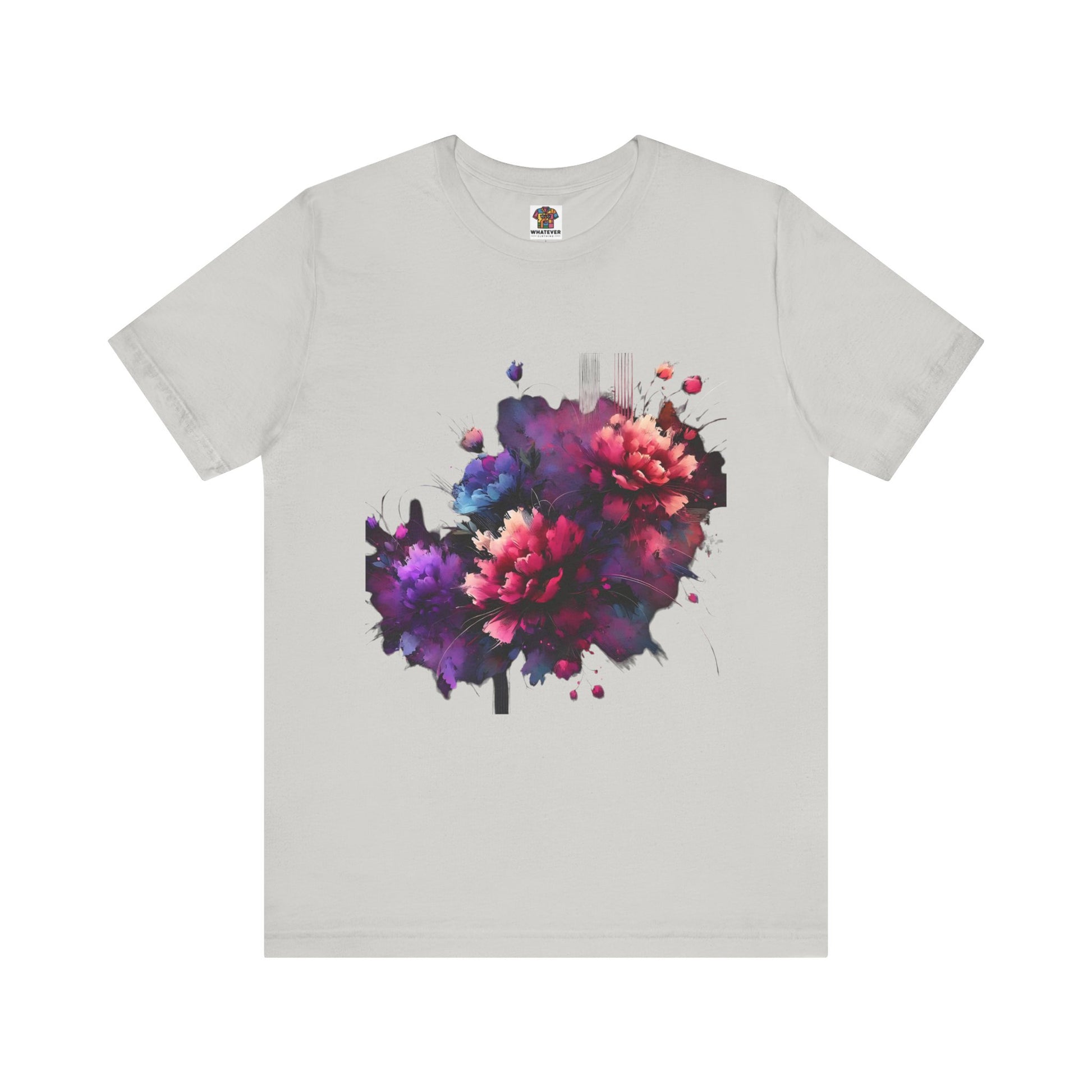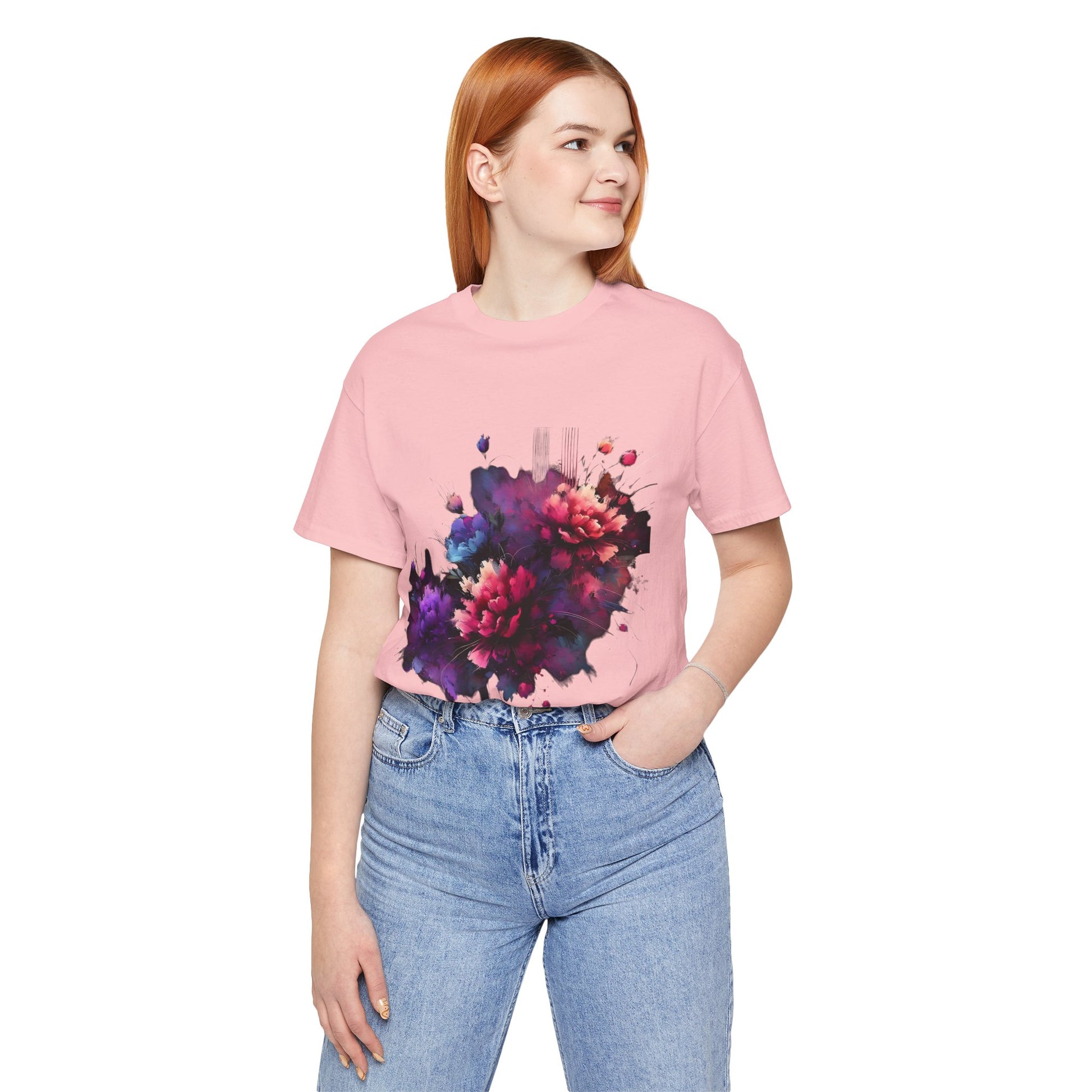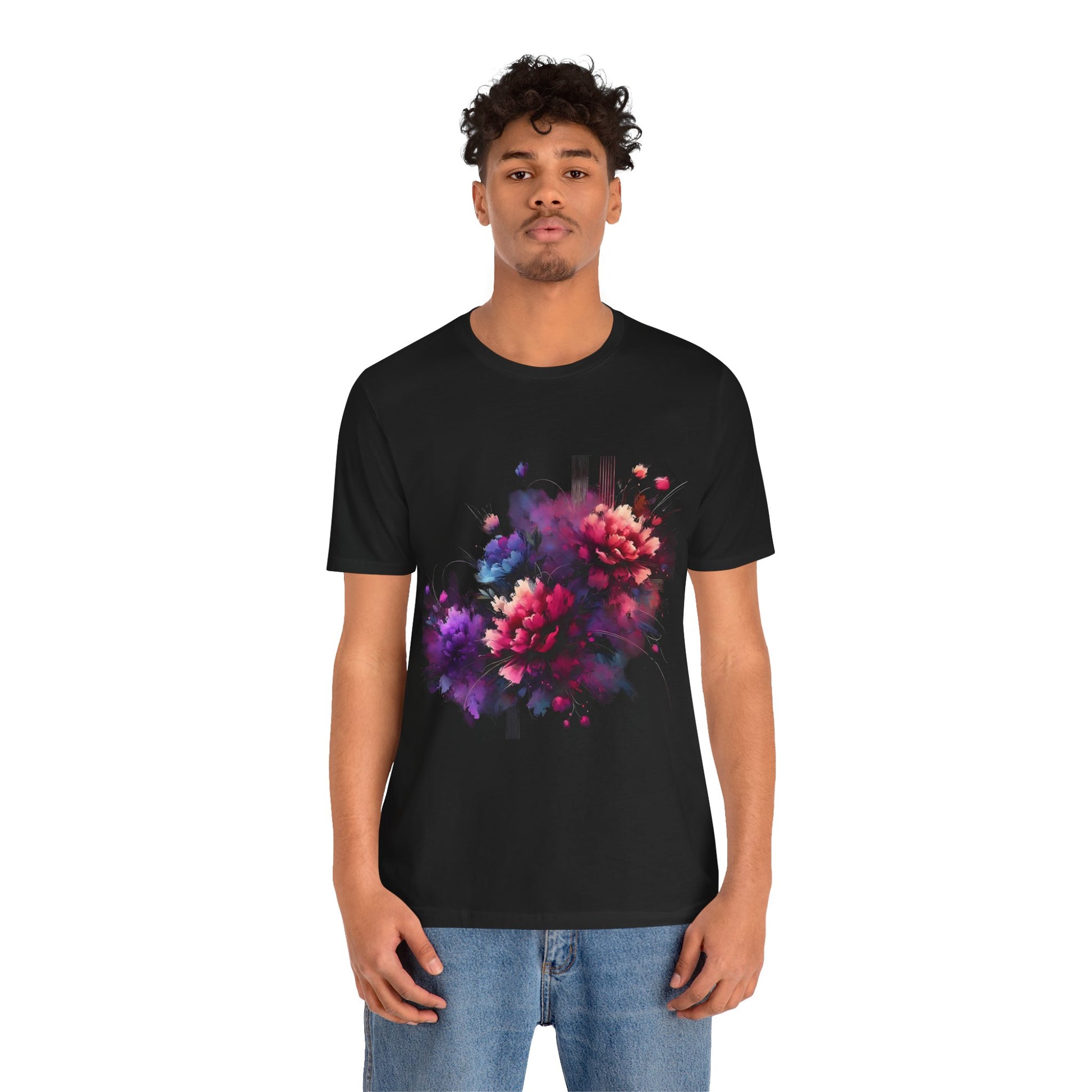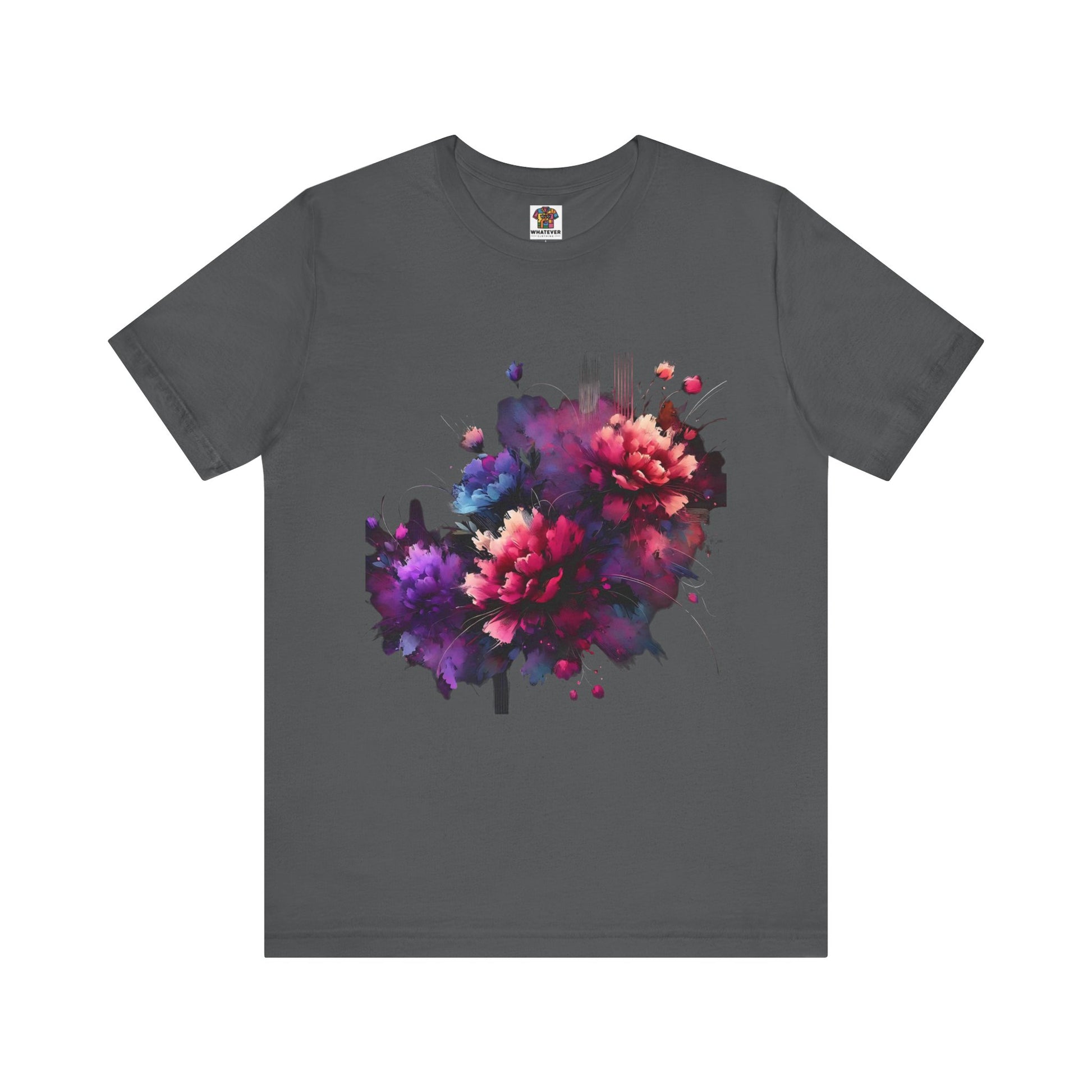 A floral design on a dark background with vibrant color splashes in bright pinks and deep purples. The abstract flowers have a gradient effect, creating a sense of movement.