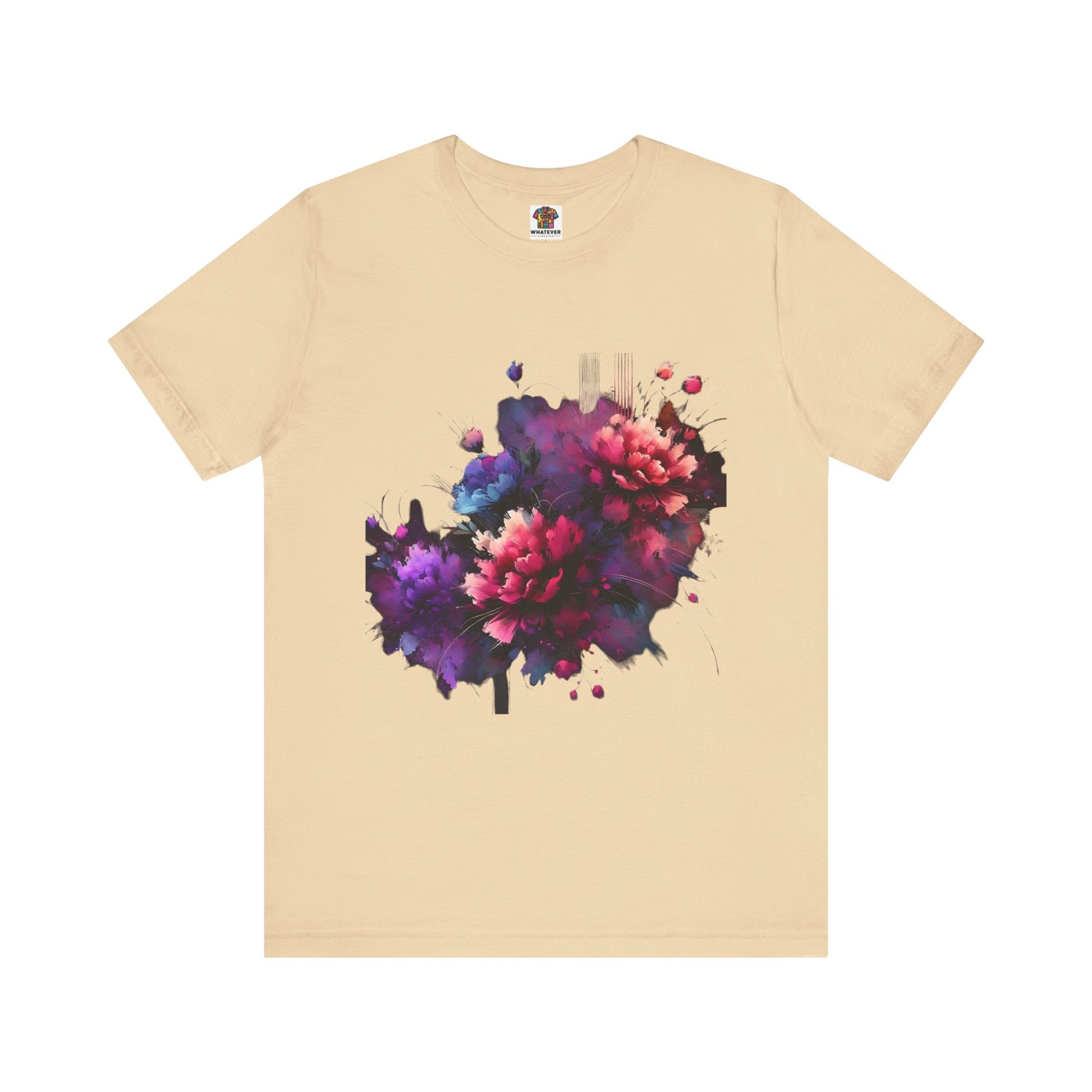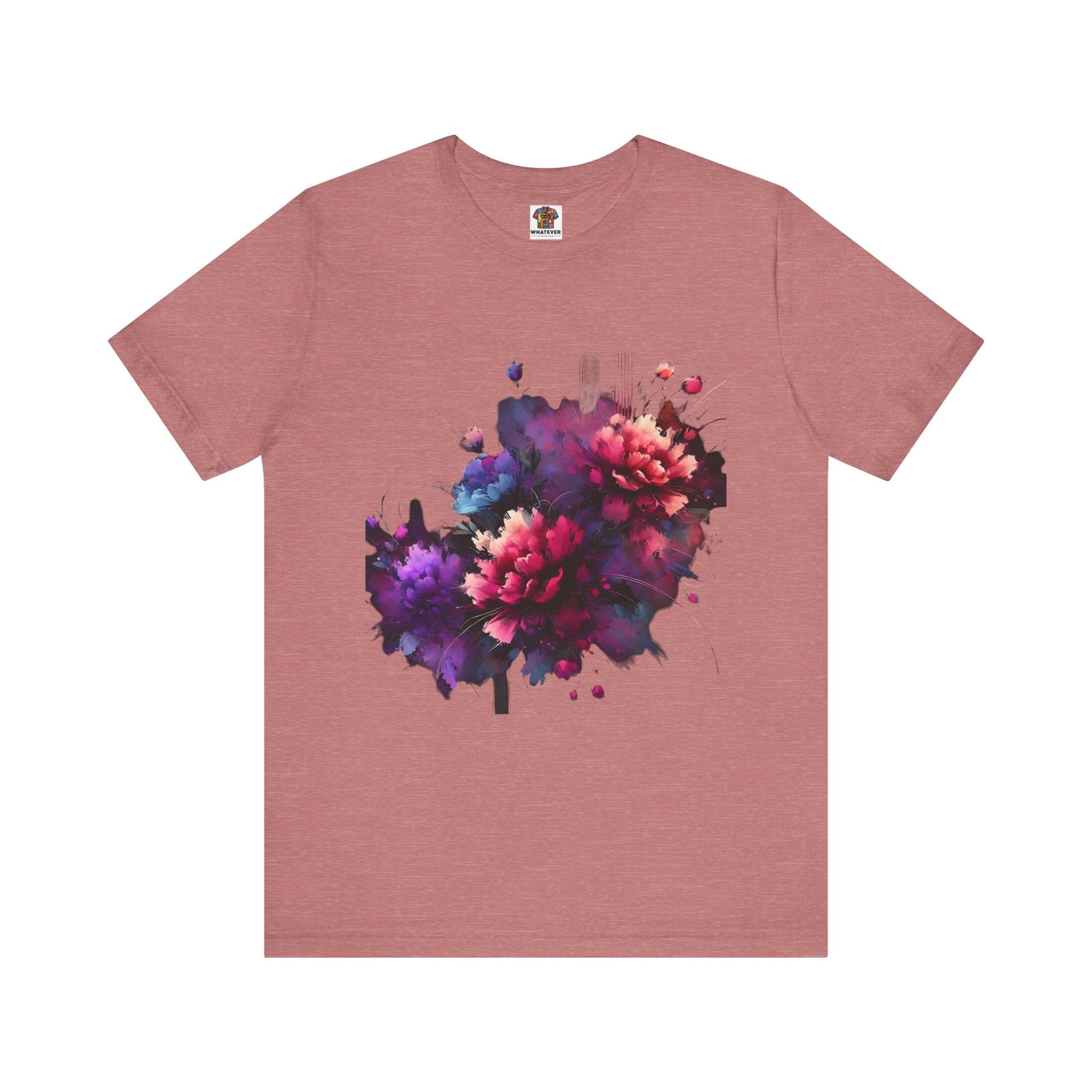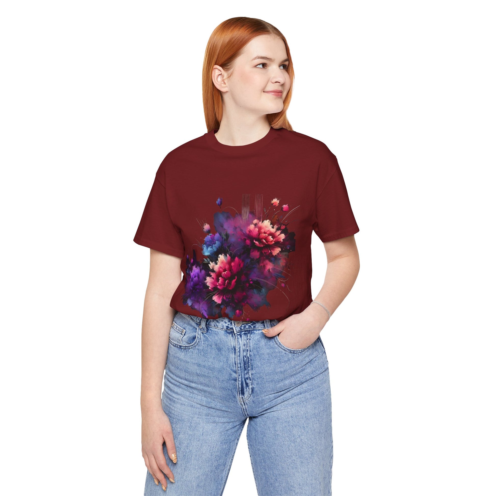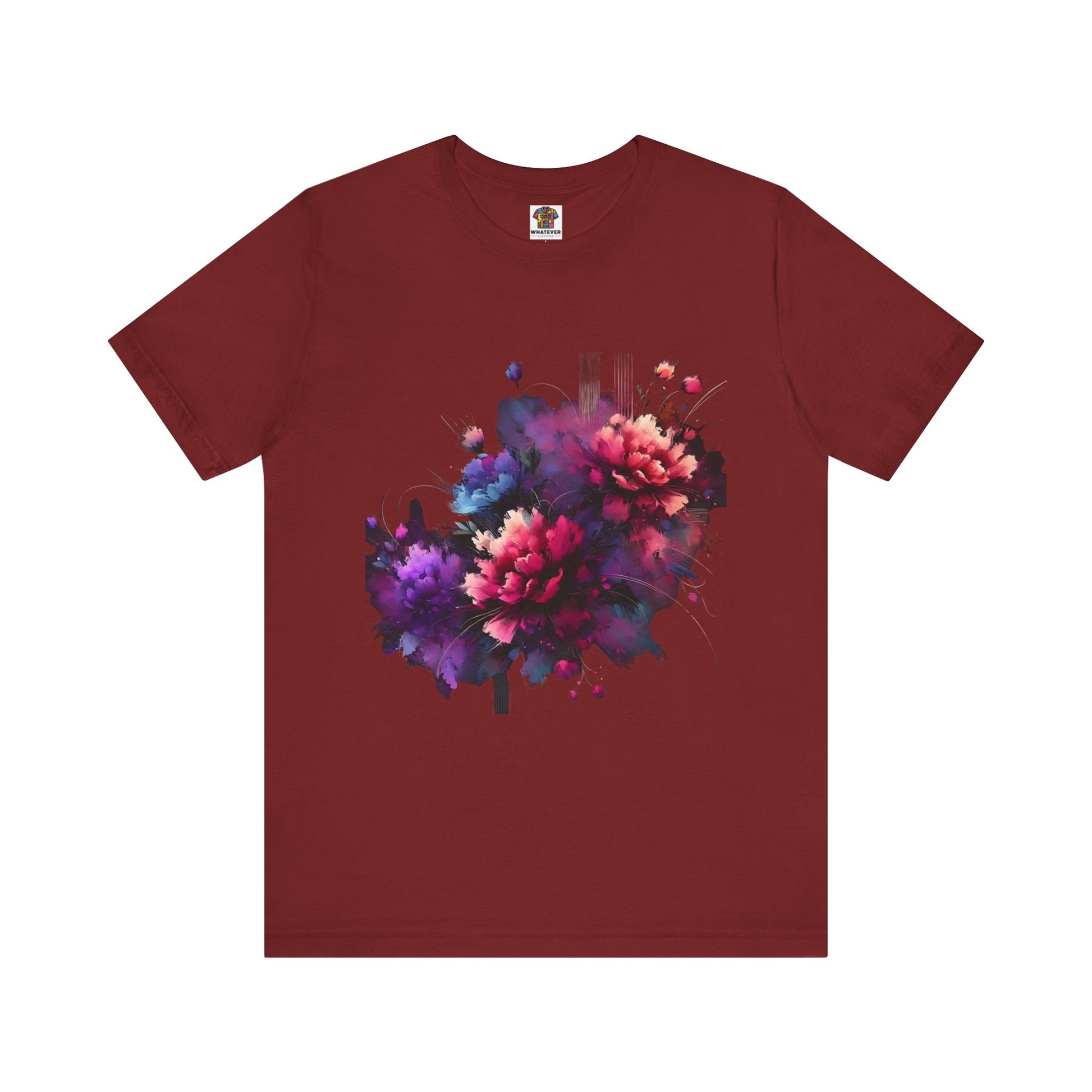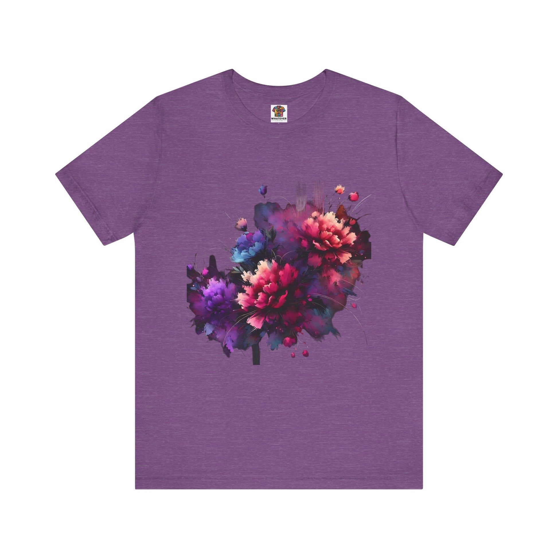 A floral design on a dark background with vibrant color splashes in bright pinks and deep purples. The abstract flowers have a gradient effect, creating a sense of movement.