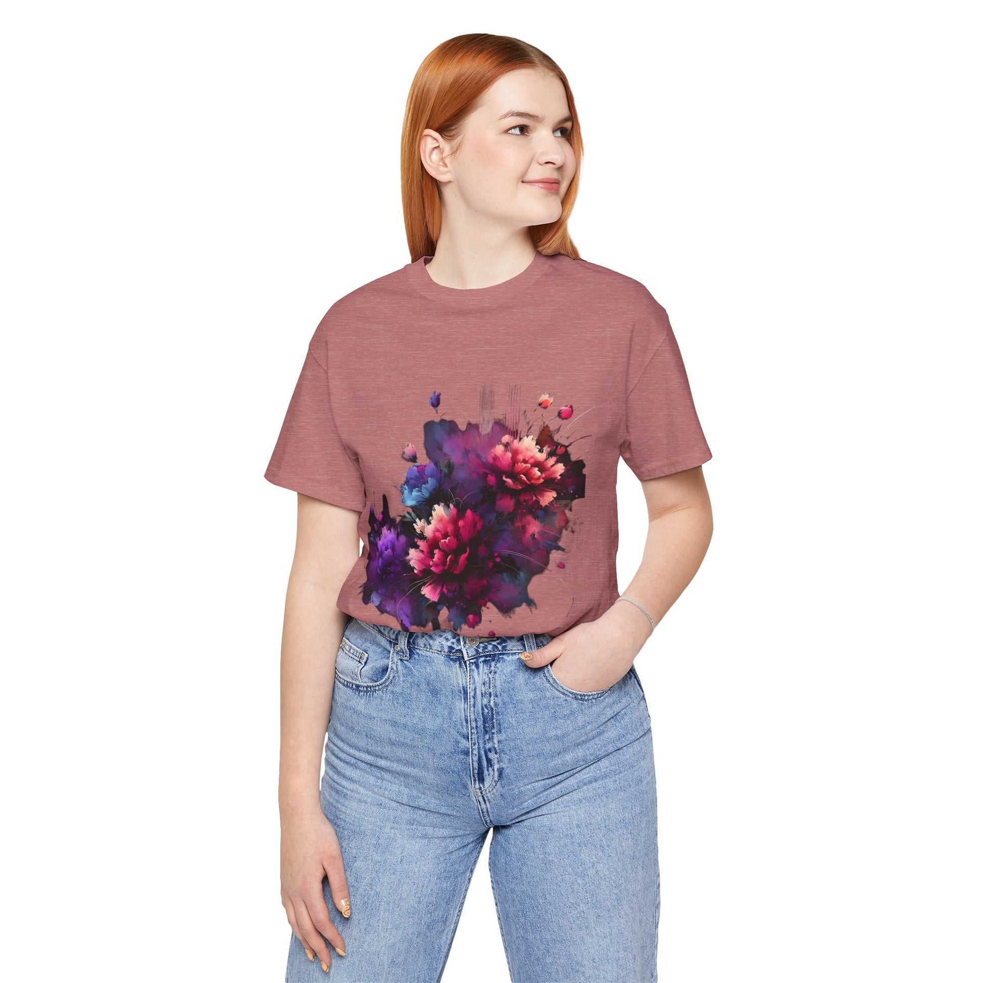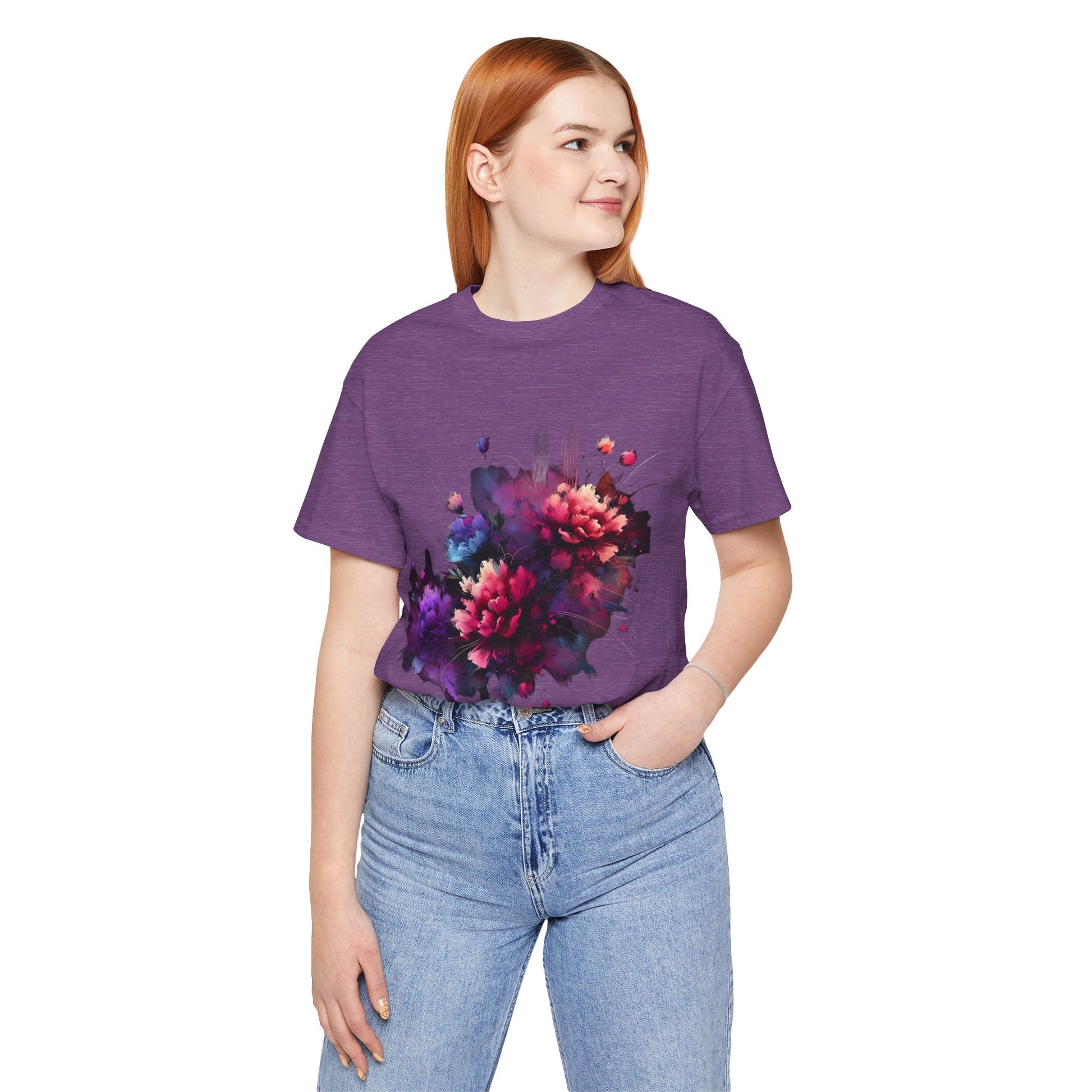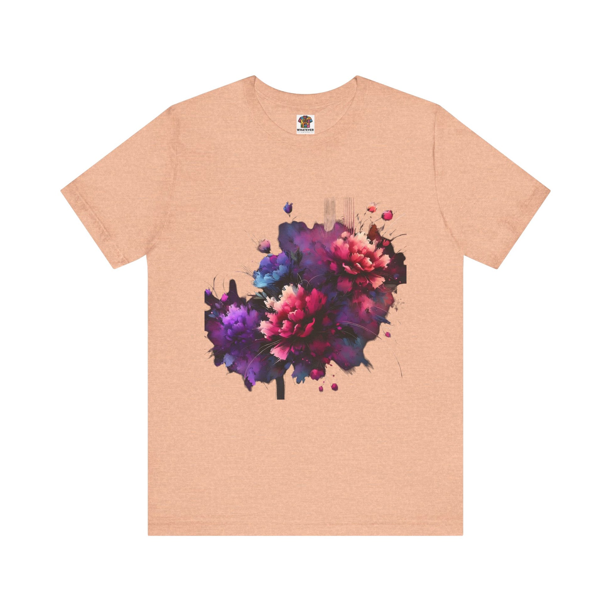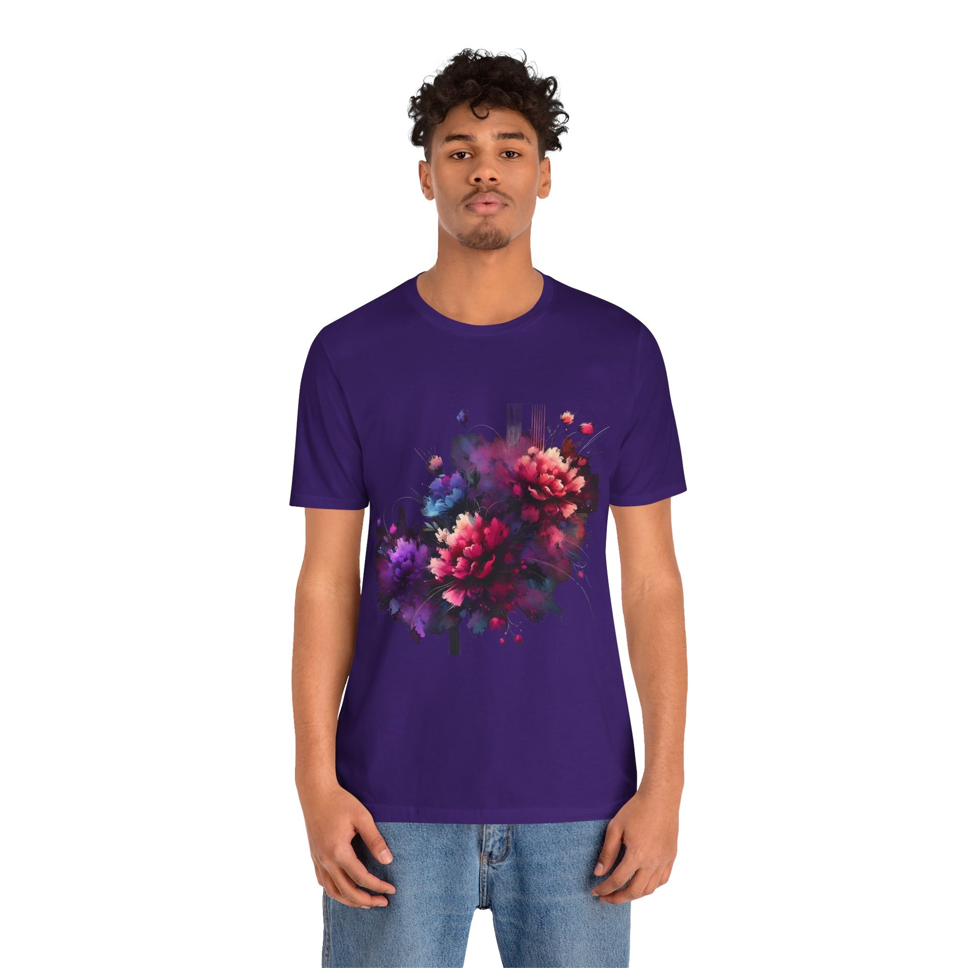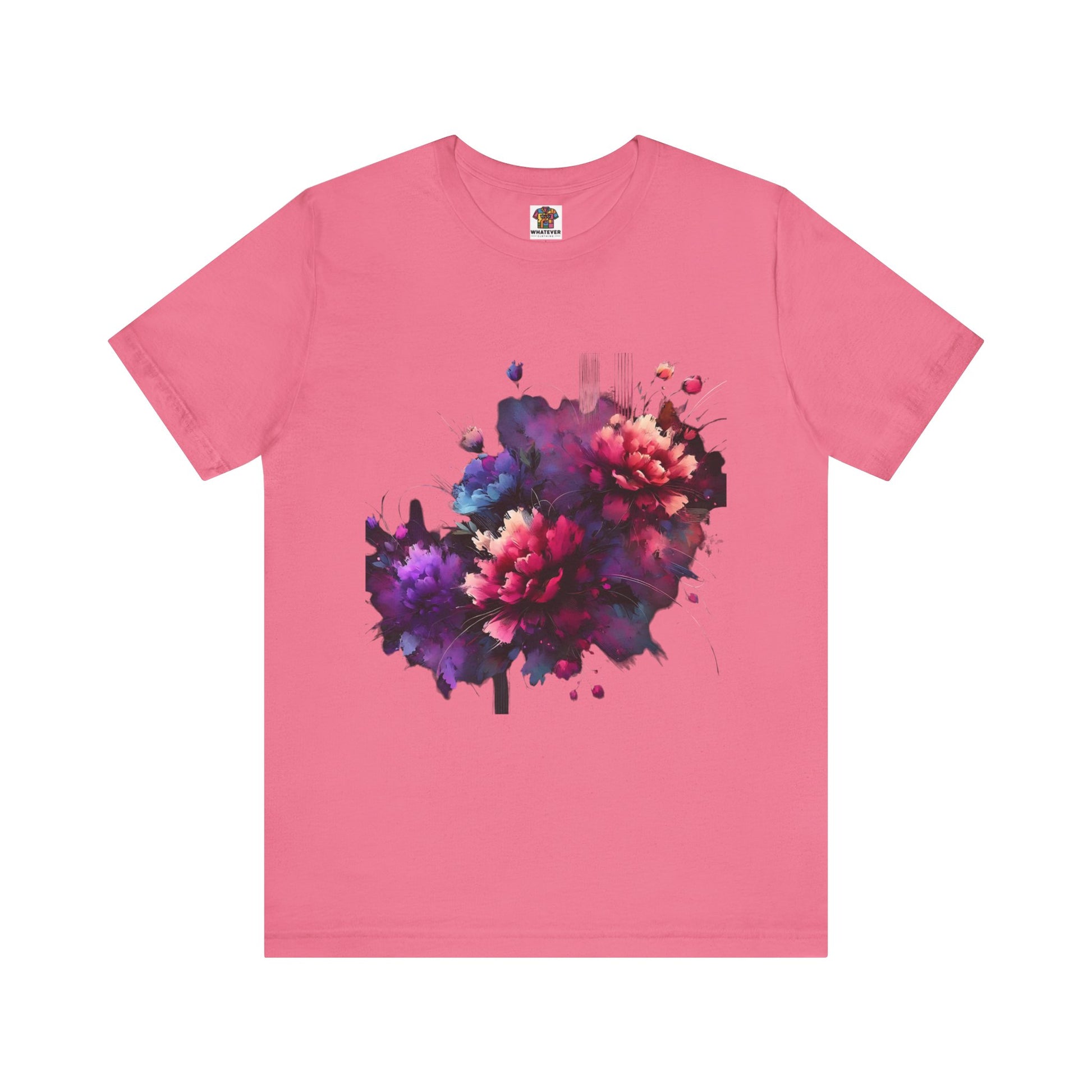 A floral design on a dark background with vibrant color splashes in bright pinks and deep purples. The abstract flowers have a gradient effect, creating a sense of movement.