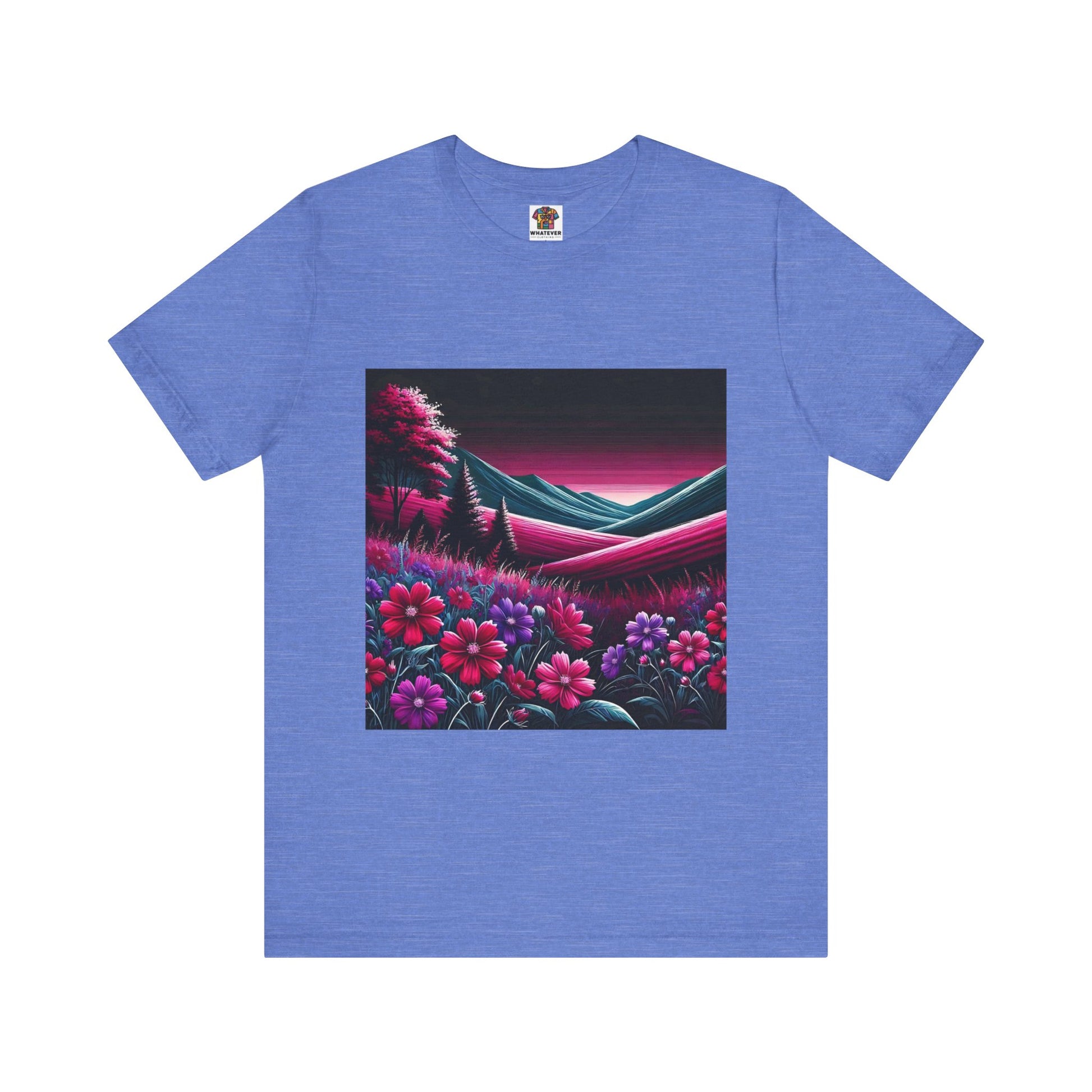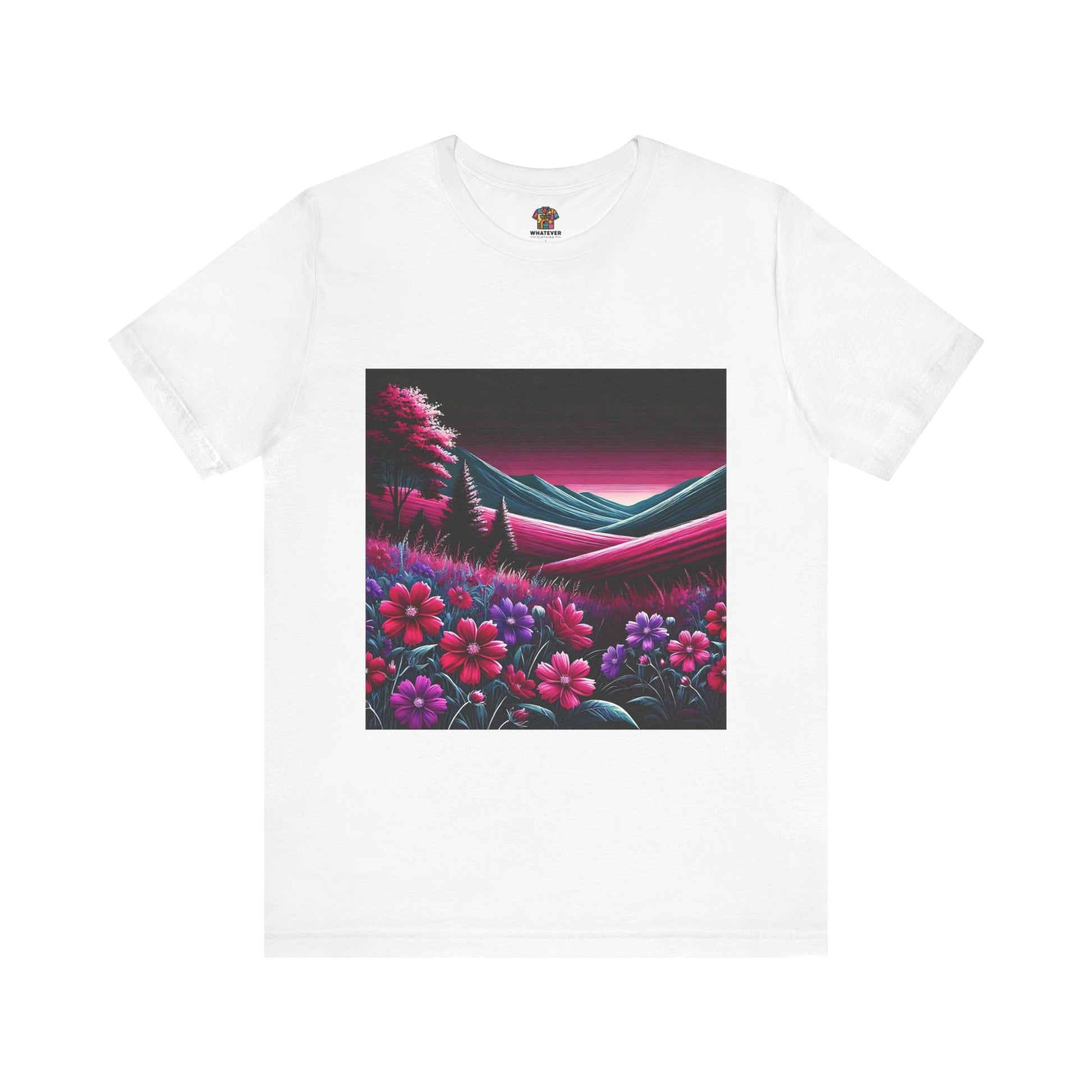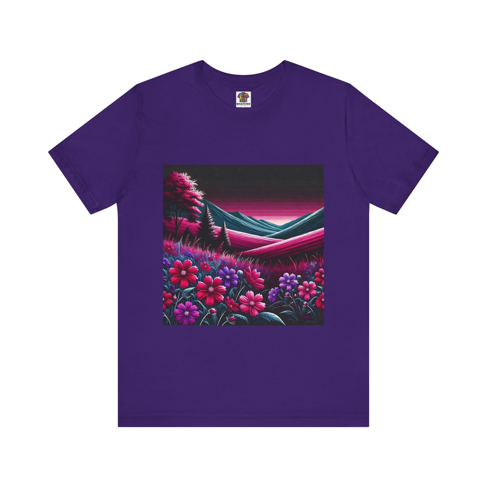Rolling hills covered in magenta flowers with a black sky overhead.