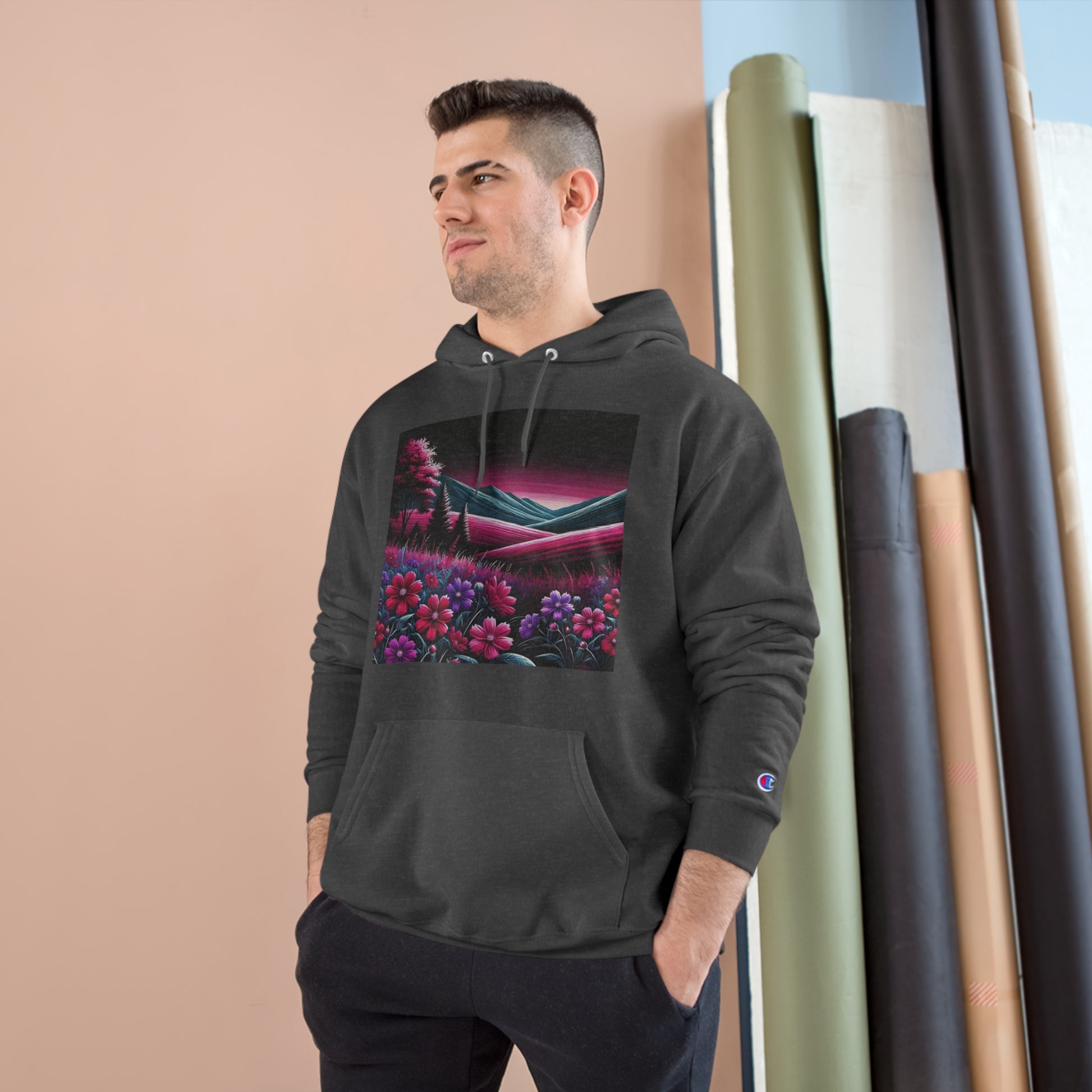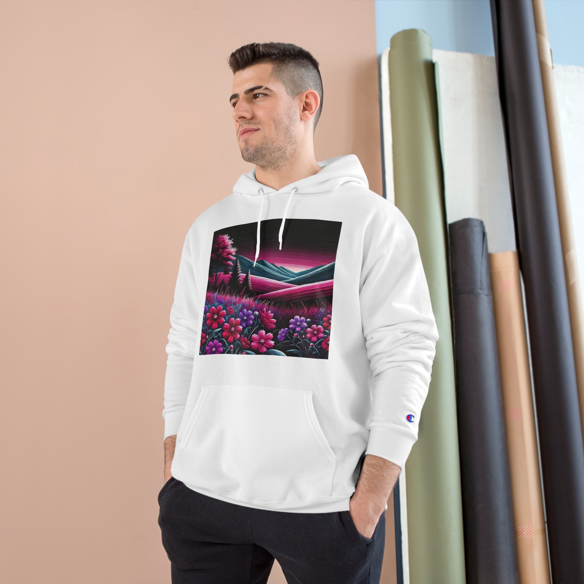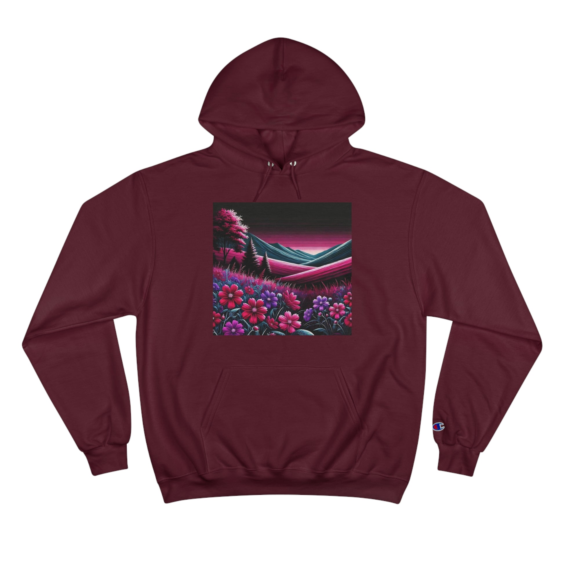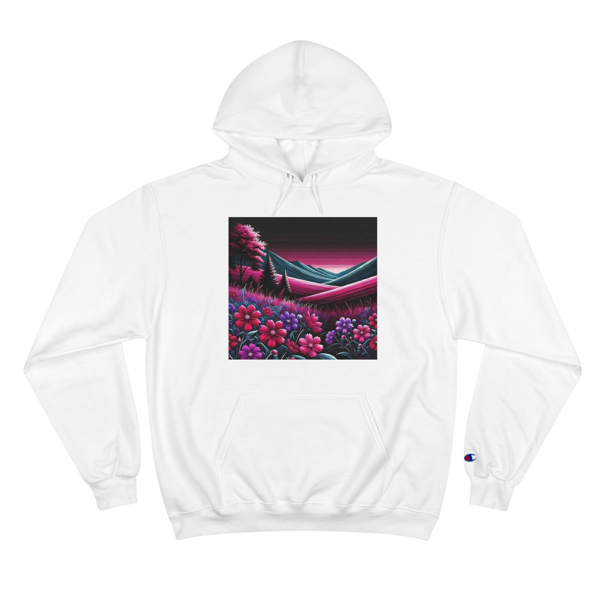 Bring a burst of color to your wardrobe with the Floral Landscape: Floral Noir hoodie from Whatever Clothing. Picture rolling hills blanketed in a sea of stunning magenta flowers, all under the dramatic contrast of a black sky overhead. It's an infusion of artistry and nature, an inspiring scene spun into a wearable masterpiece.