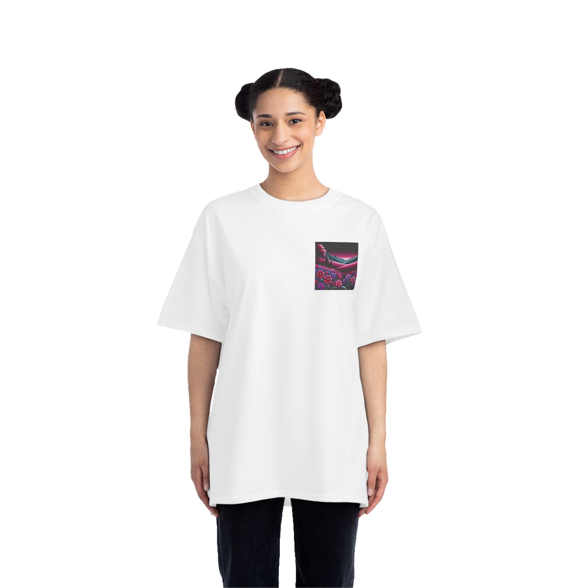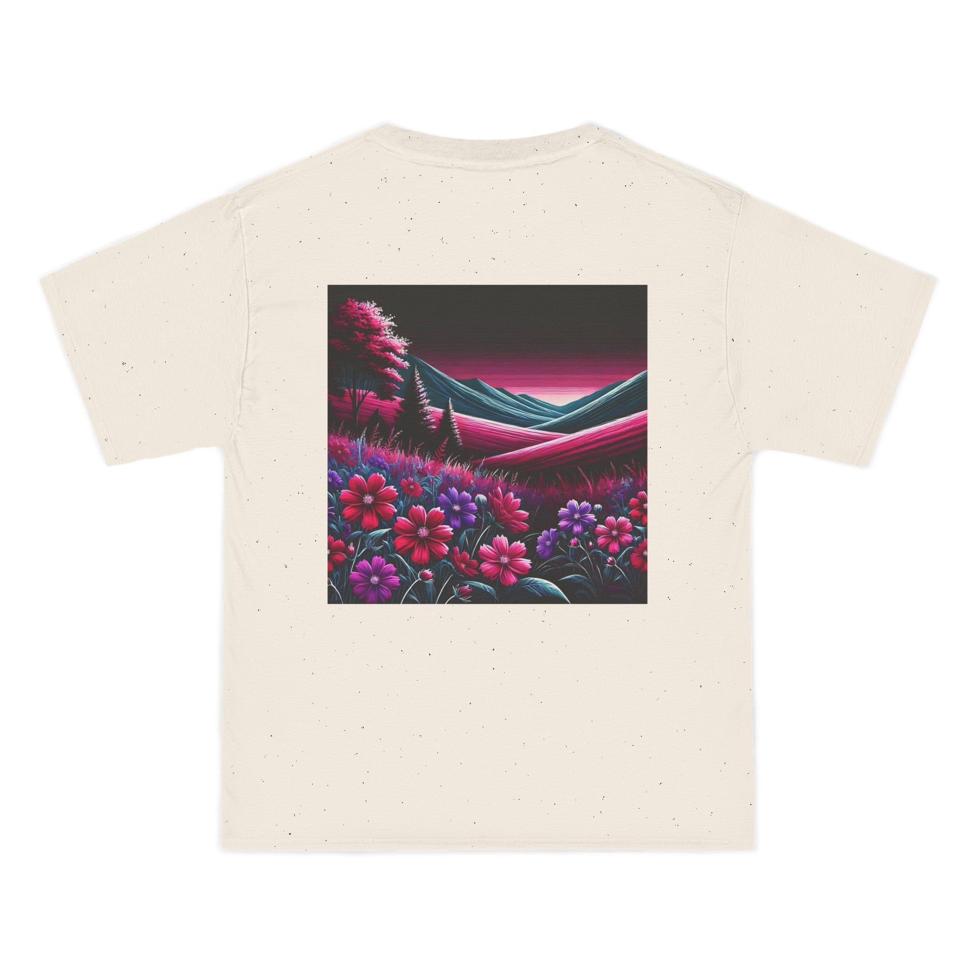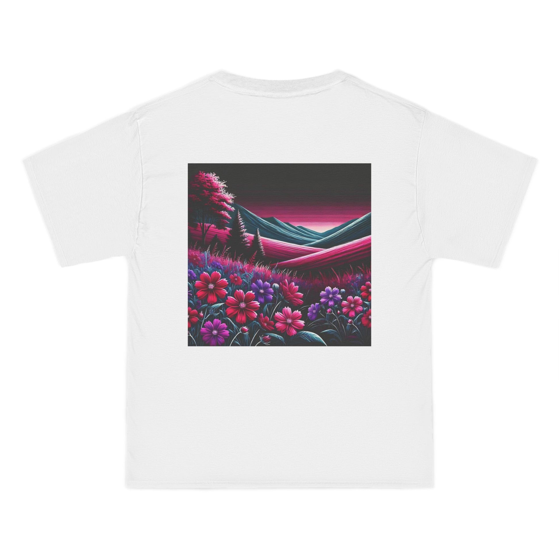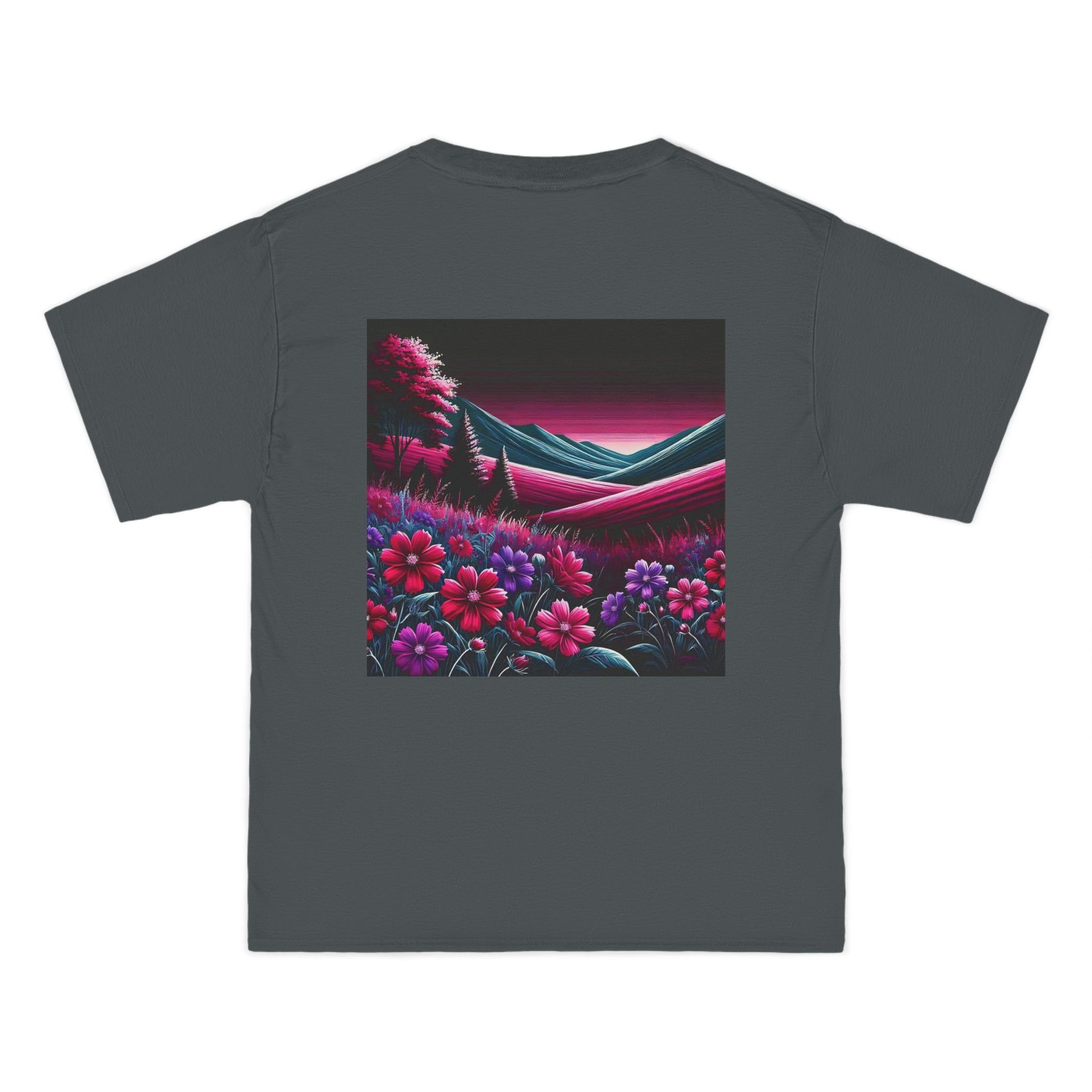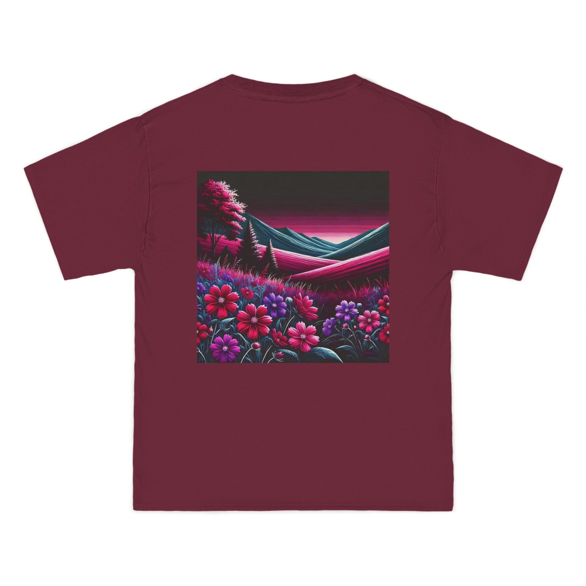 Introducing Floral Landscape: Floral Noir, a wearable art piece that unleashes your creativity and lets you wear your world. This unique, AI-generated design captures the enchanting beauty of rolling hills blanketed in radiant magenta flowers under an inky black sky. It's a surreal and captivating landscape, meticulously crafted to inspire and empower you.