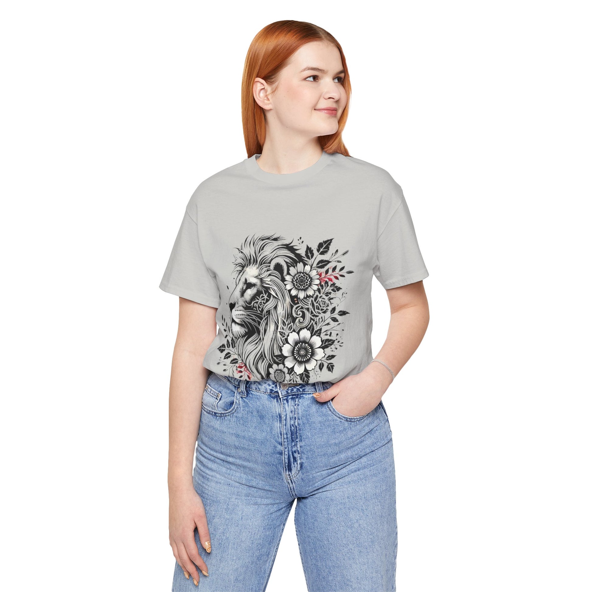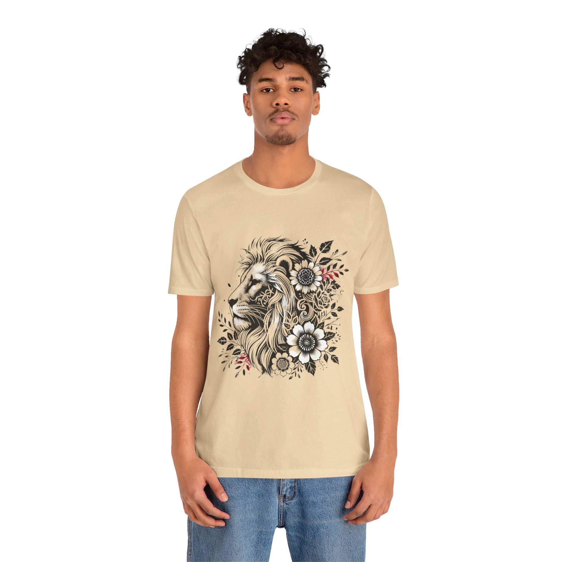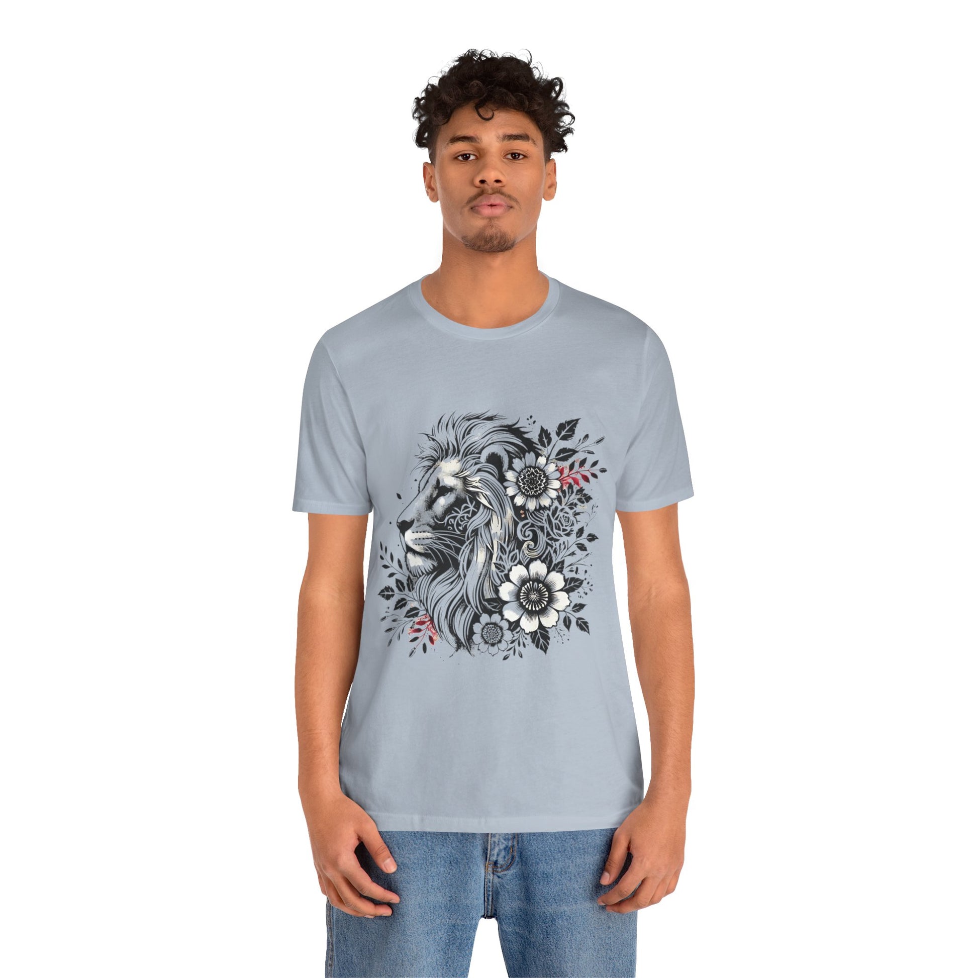 Introducing our Unisex Jersey Short Sleeve Tee, designed to elevate your casual wardrobe with a blend of comfort and style. This t-shirt captures a relaxed yet chic vibe, making it ideal for everyday wear or special occasions. Its unique graphic design featuring a majestic lion surrounded by floral elements adds a touch of artistry and makes it a perfect statement piece. It's great for both leisurely outings and social gatherings, fitting seamlessly into the lives of nature lovers and animal enthusiasts. Perfect as a gift for birthdays, holidays, or just to celebrate the beauty of nature any day of the year.