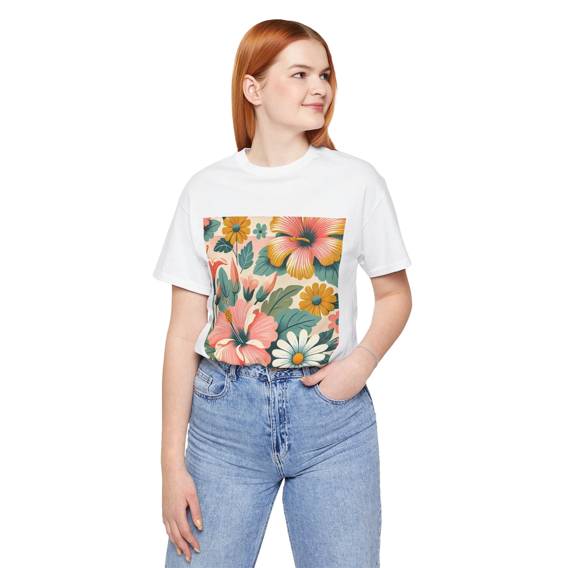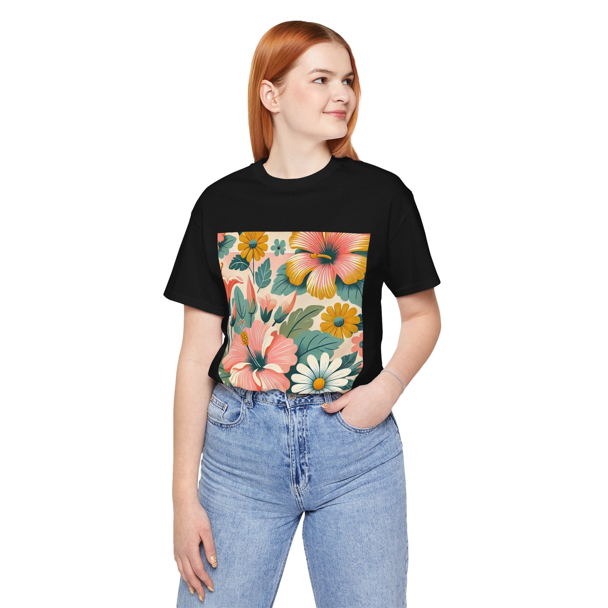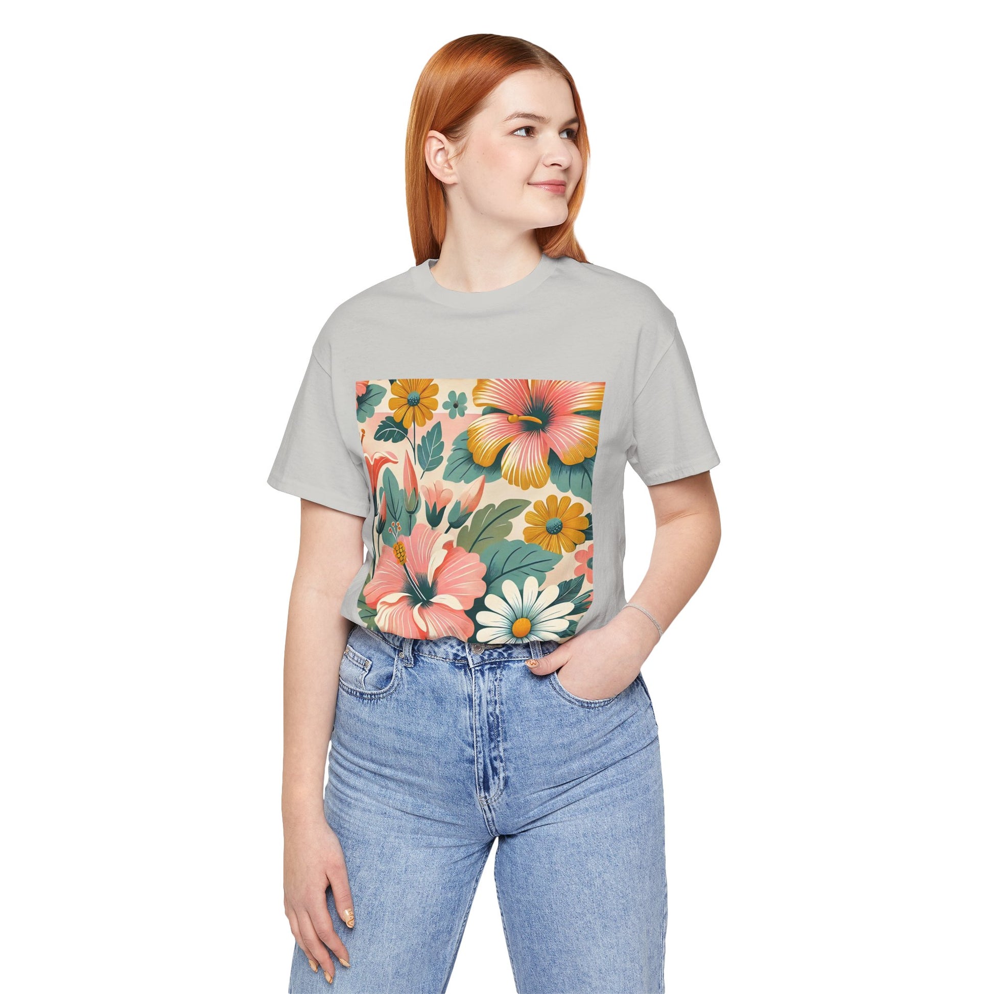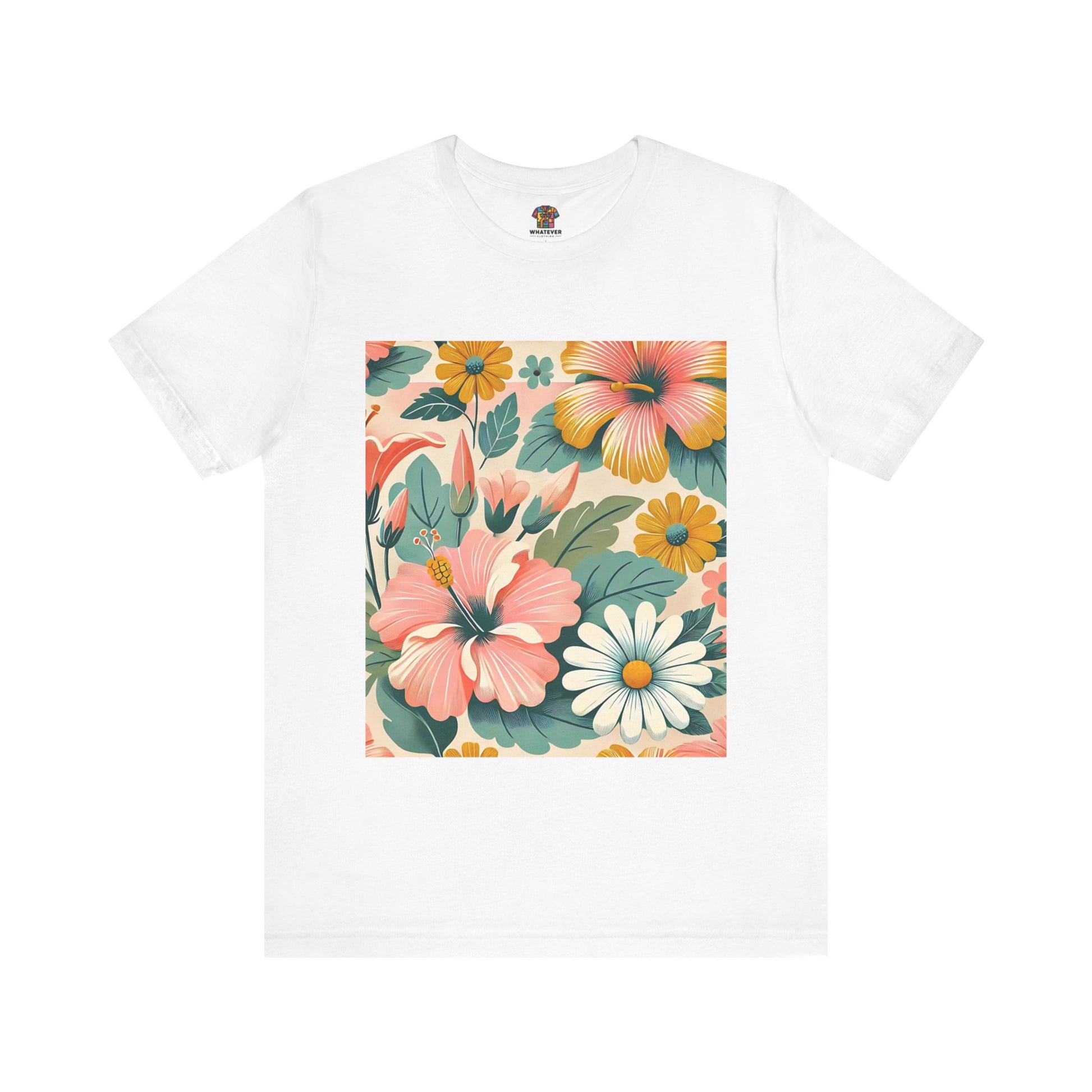 A whimsical pattern featuring large hibiscus and daisy flowers in soft pinks, yellows, and greens on a pastel background, ideal for summer wear.