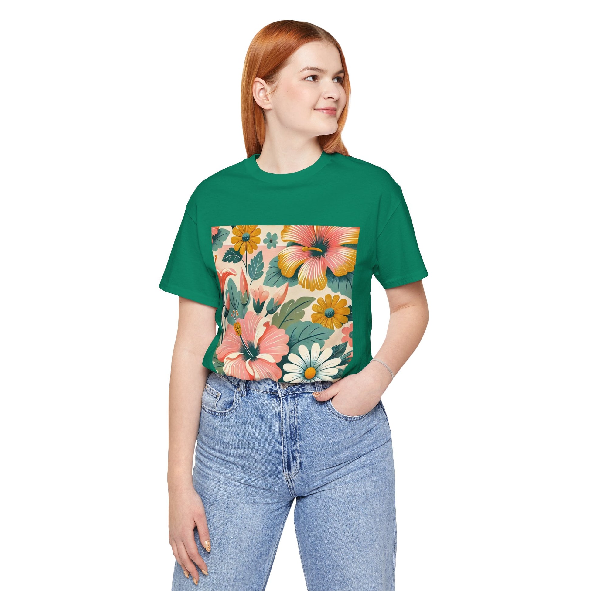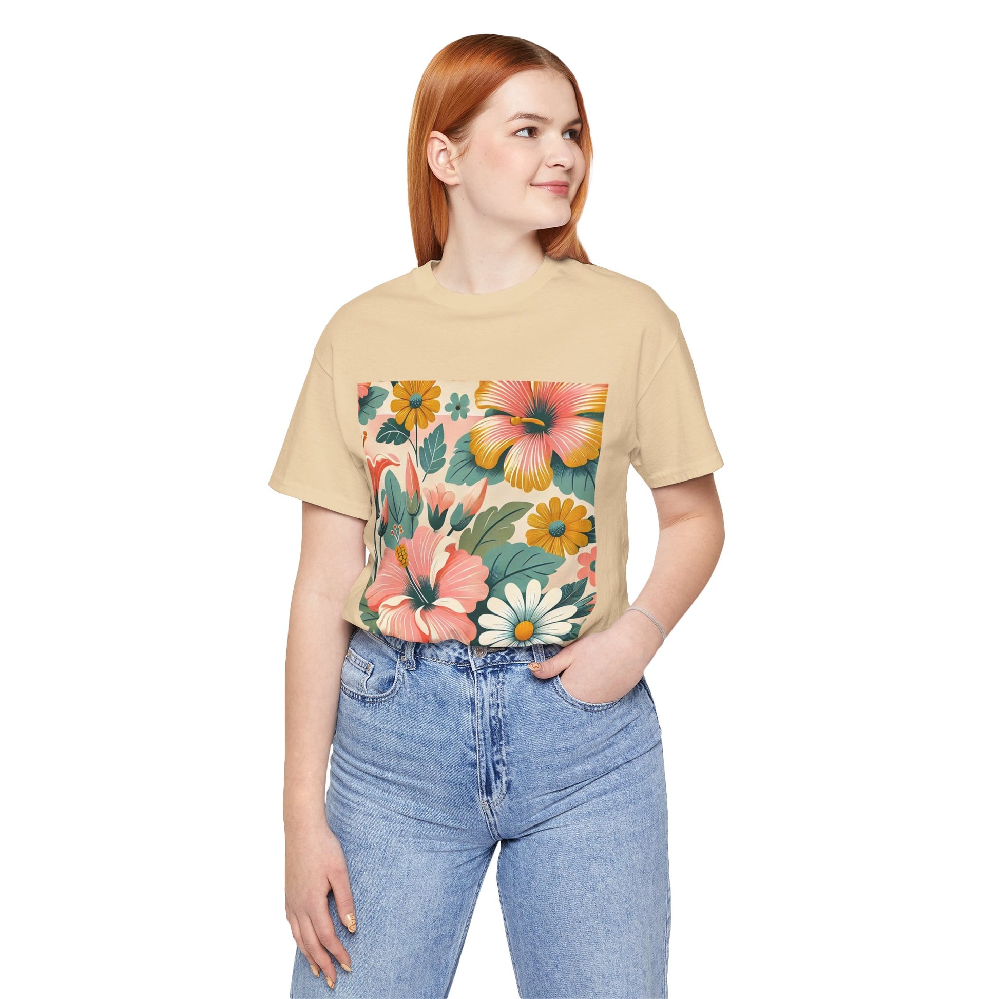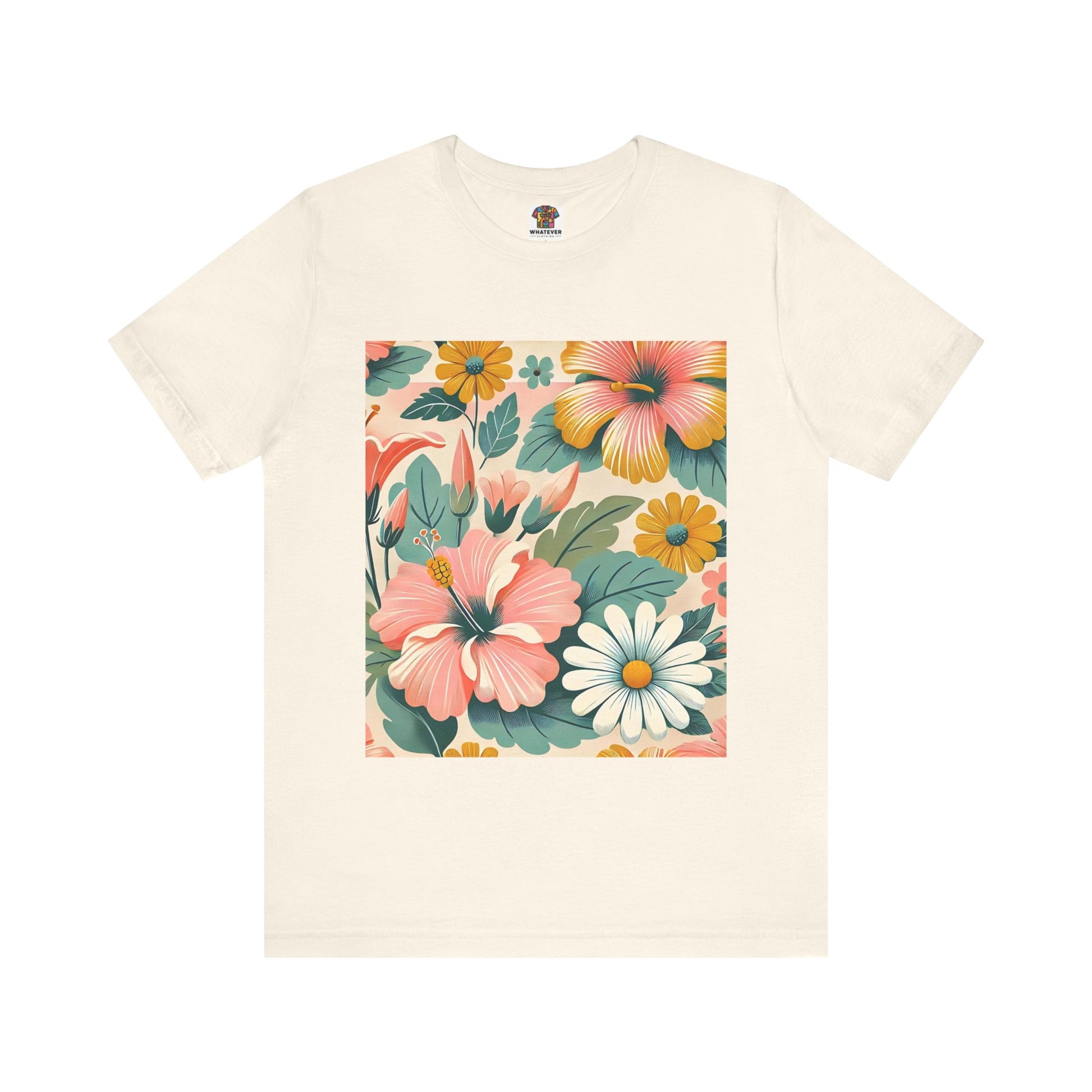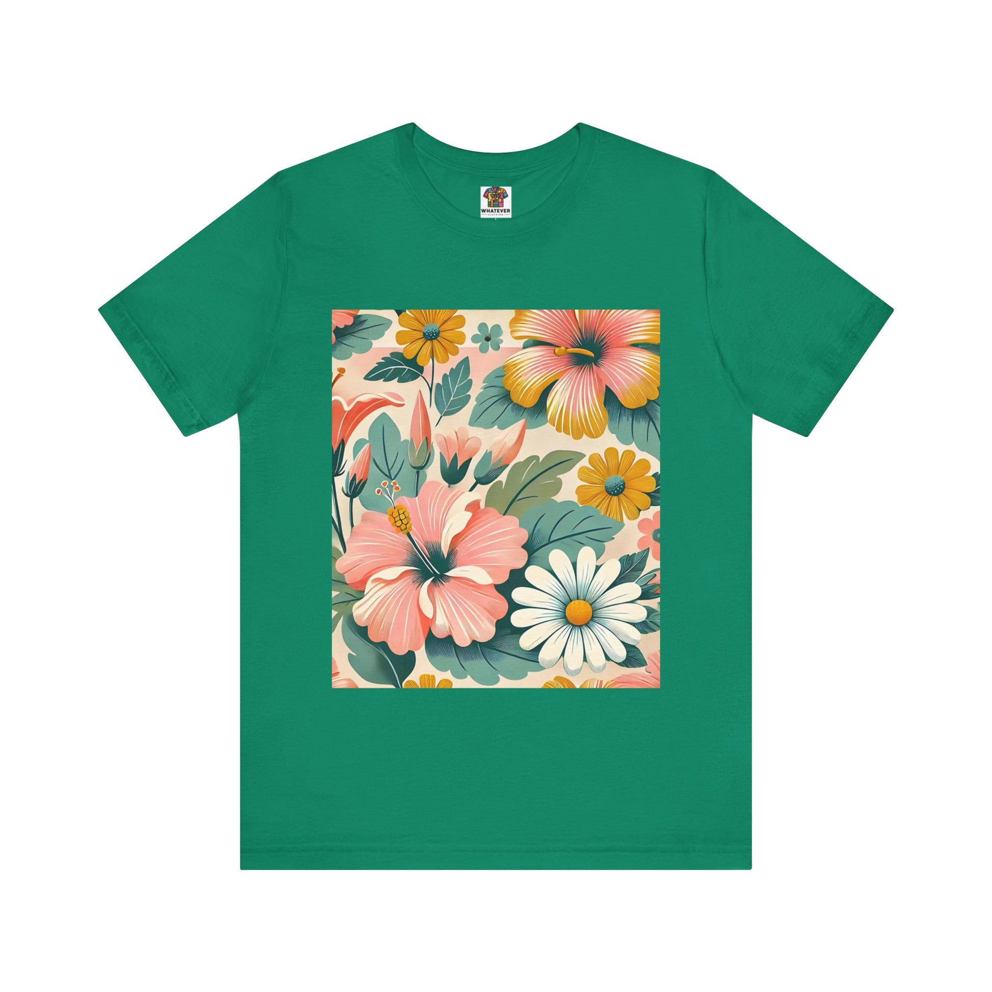 A whimsical pattern featuring large hibiscus and daisy flowers in soft pinks, yellows, and greens on a pastel background, ideal for summer wear.