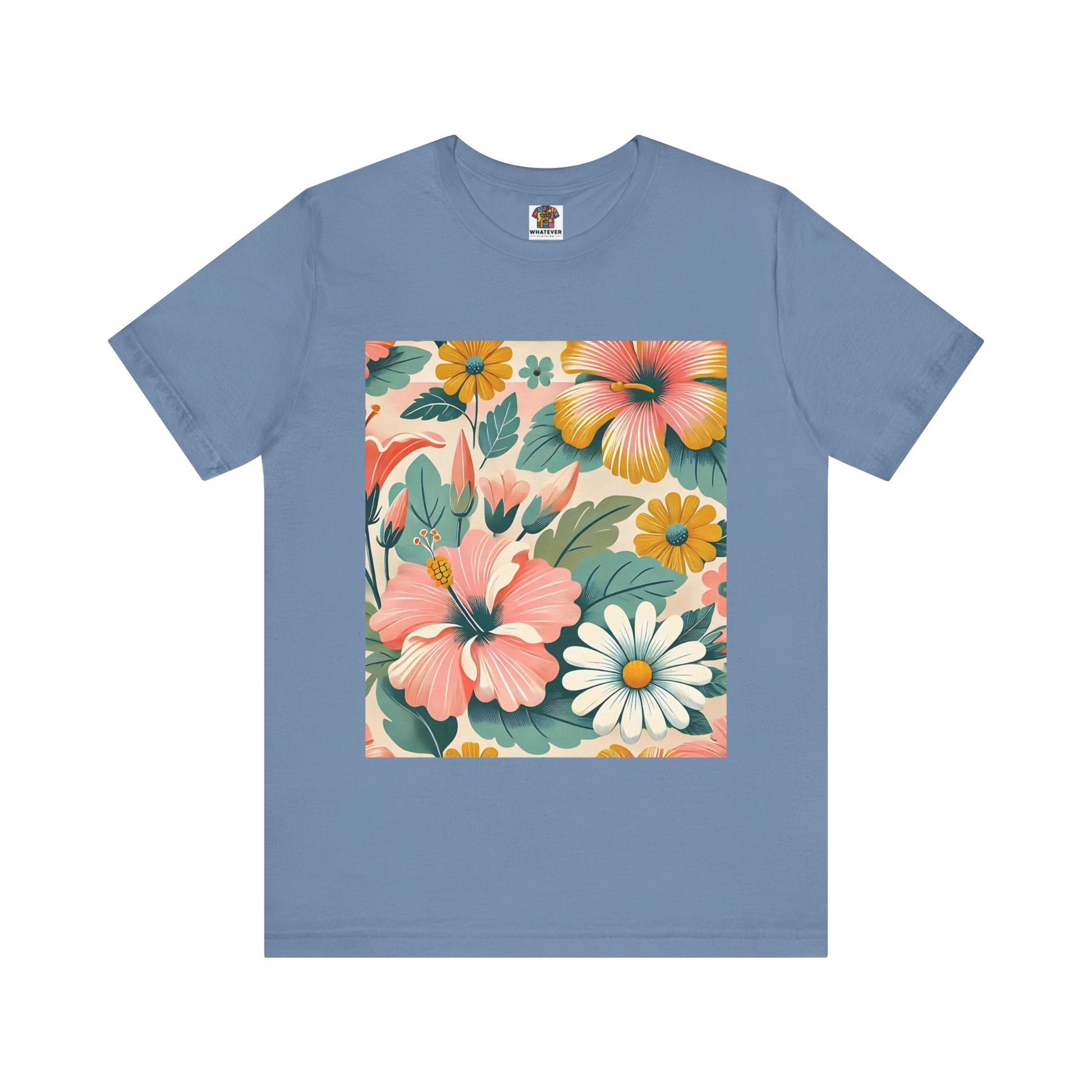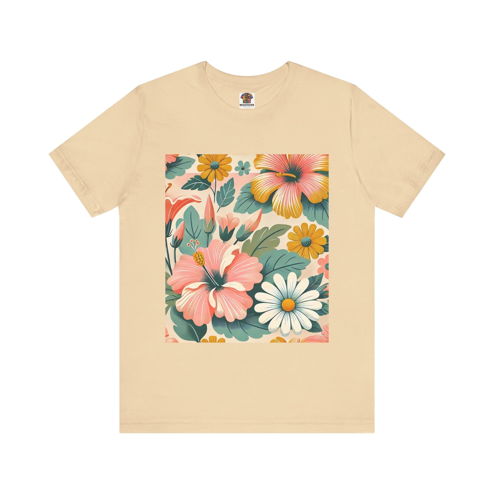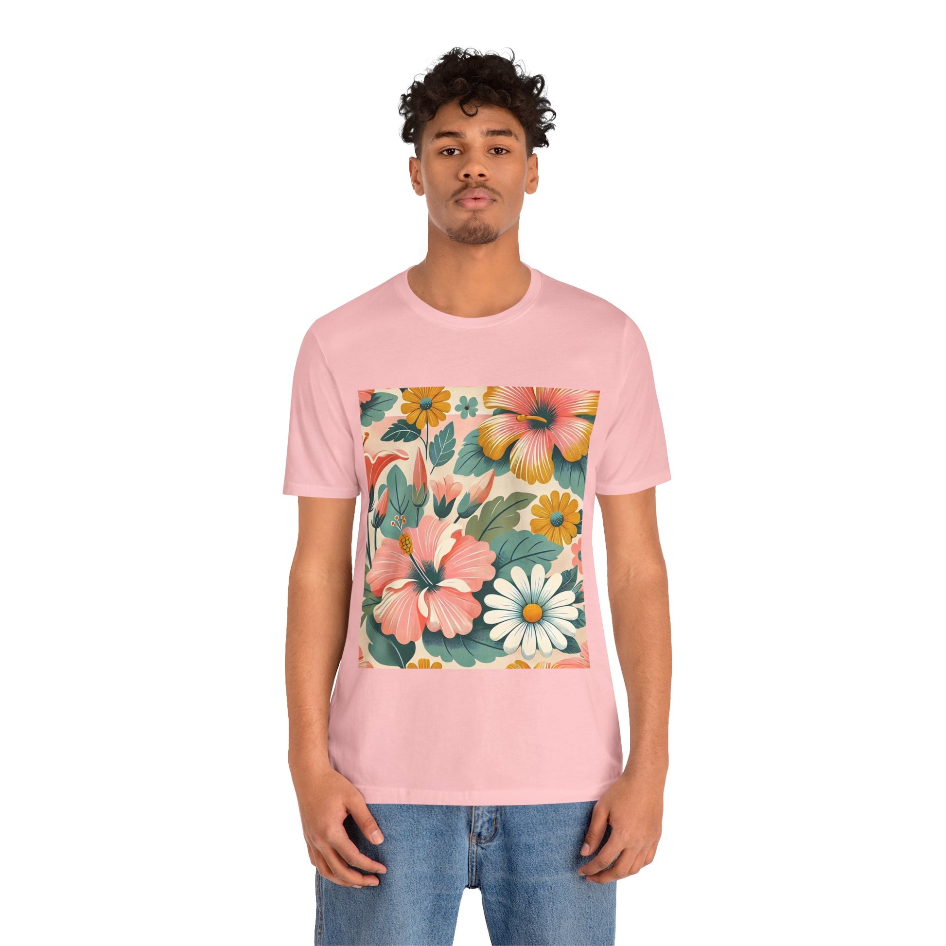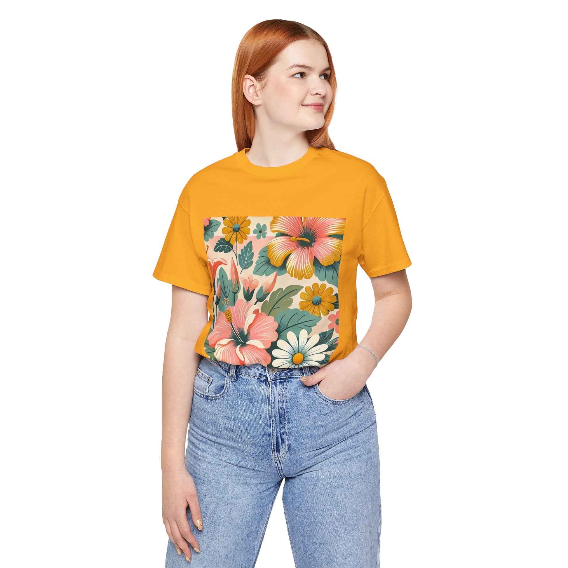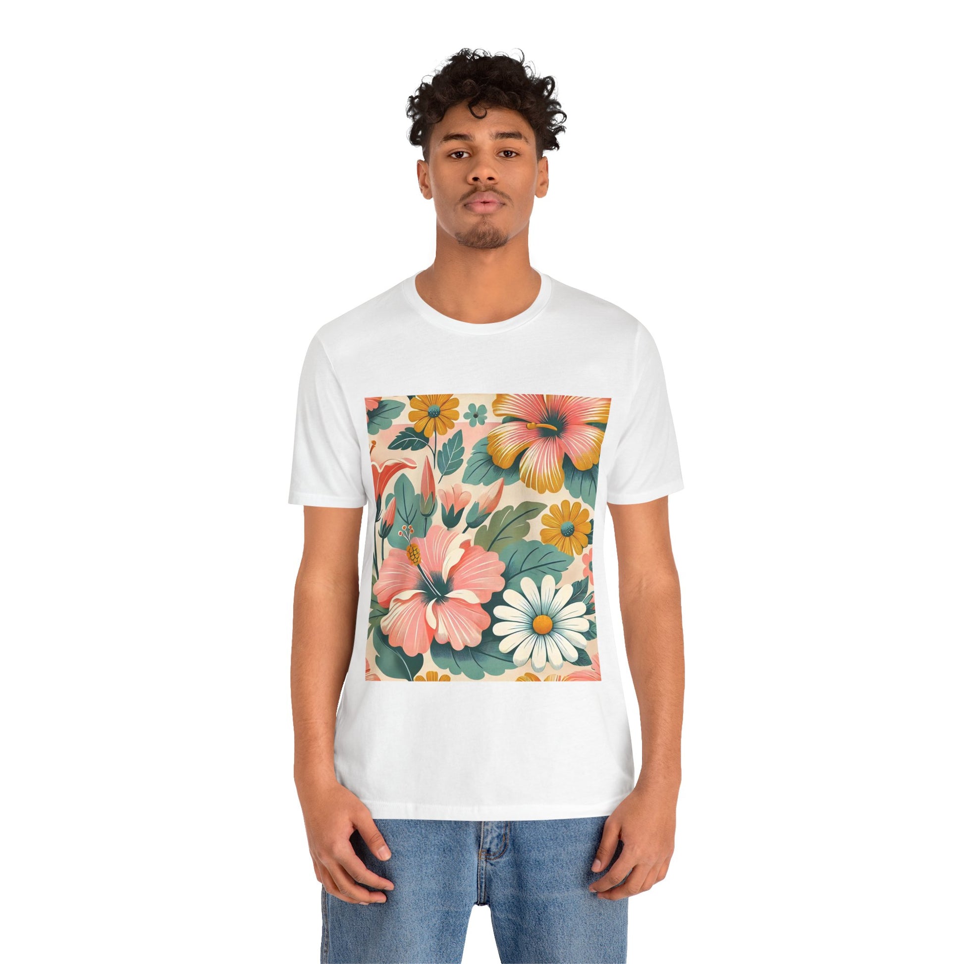 A whimsical pattern featuring large hibiscus and daisy flowers in soft pinks, yellows, and greens on a pastel background, ideal for summer wear.