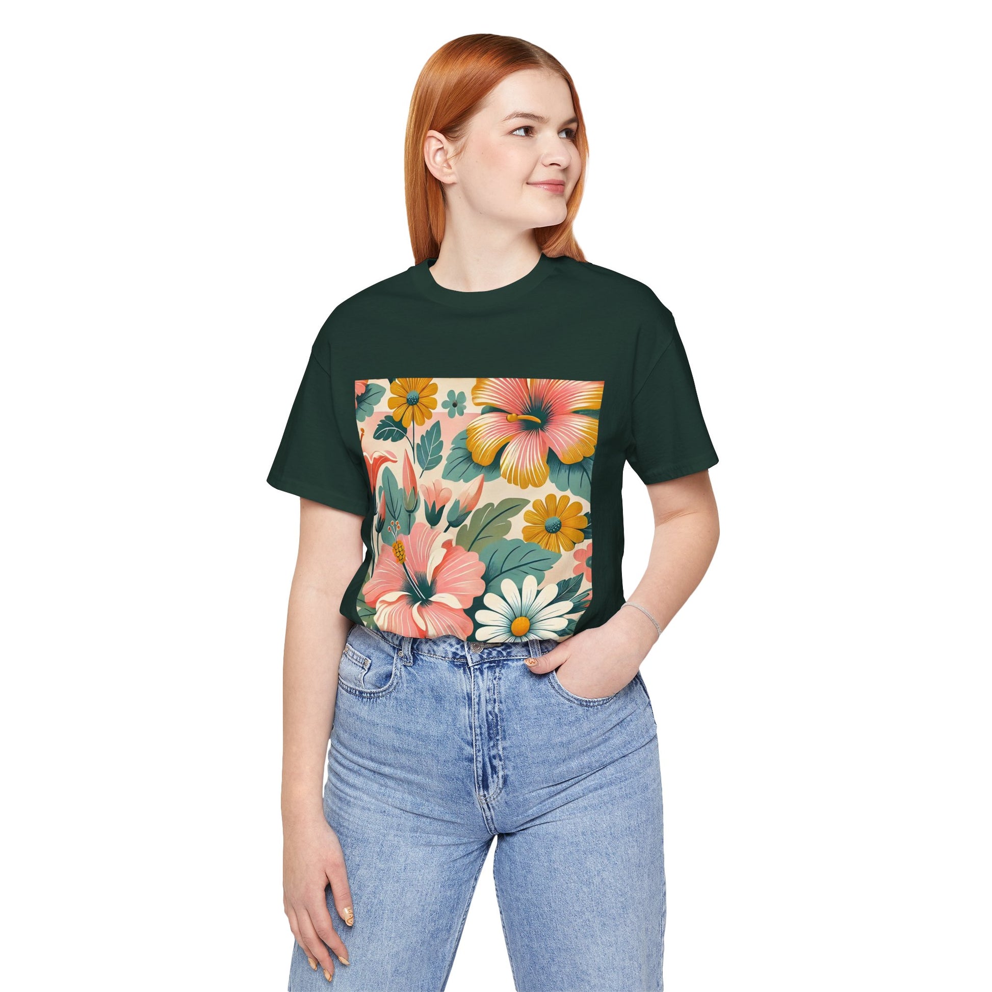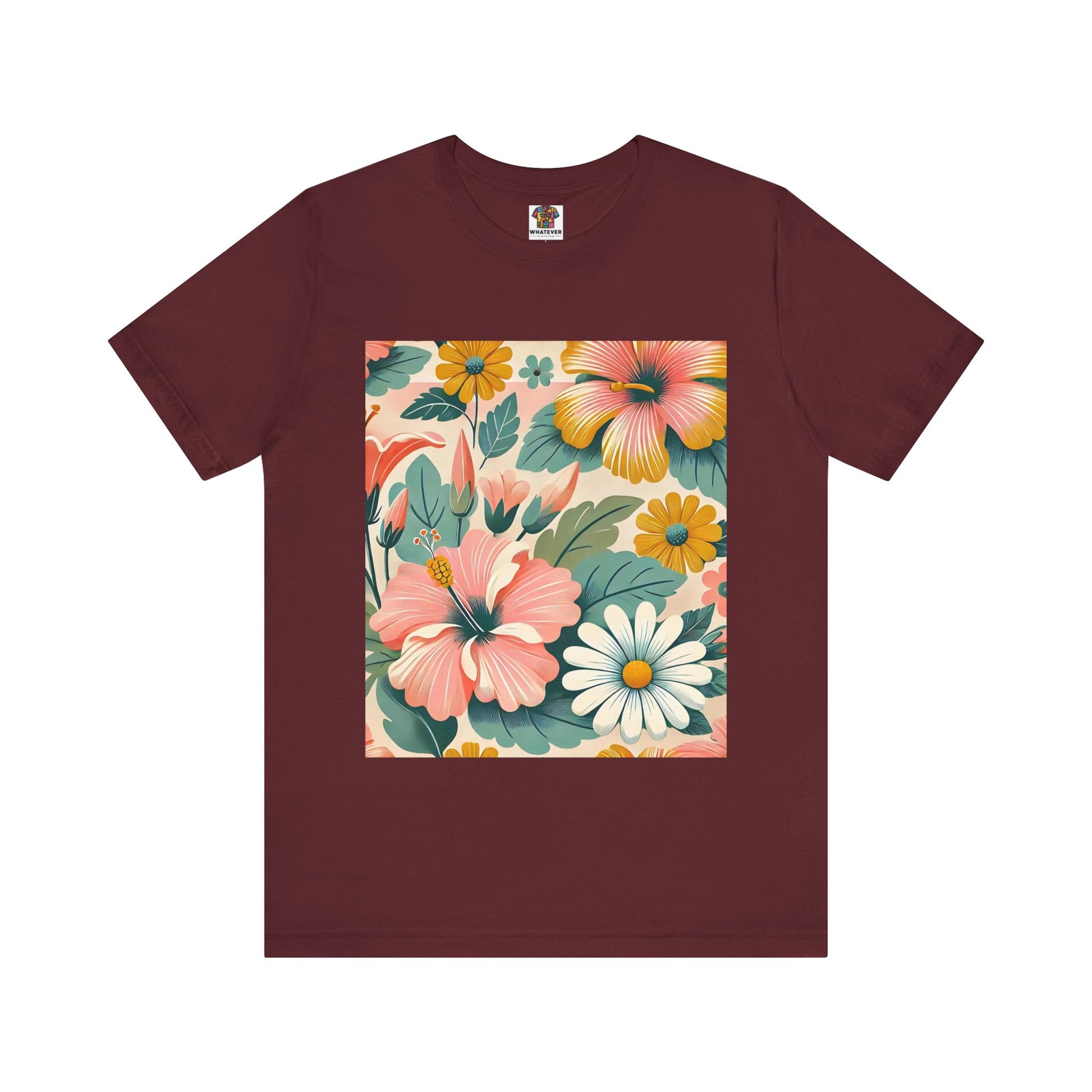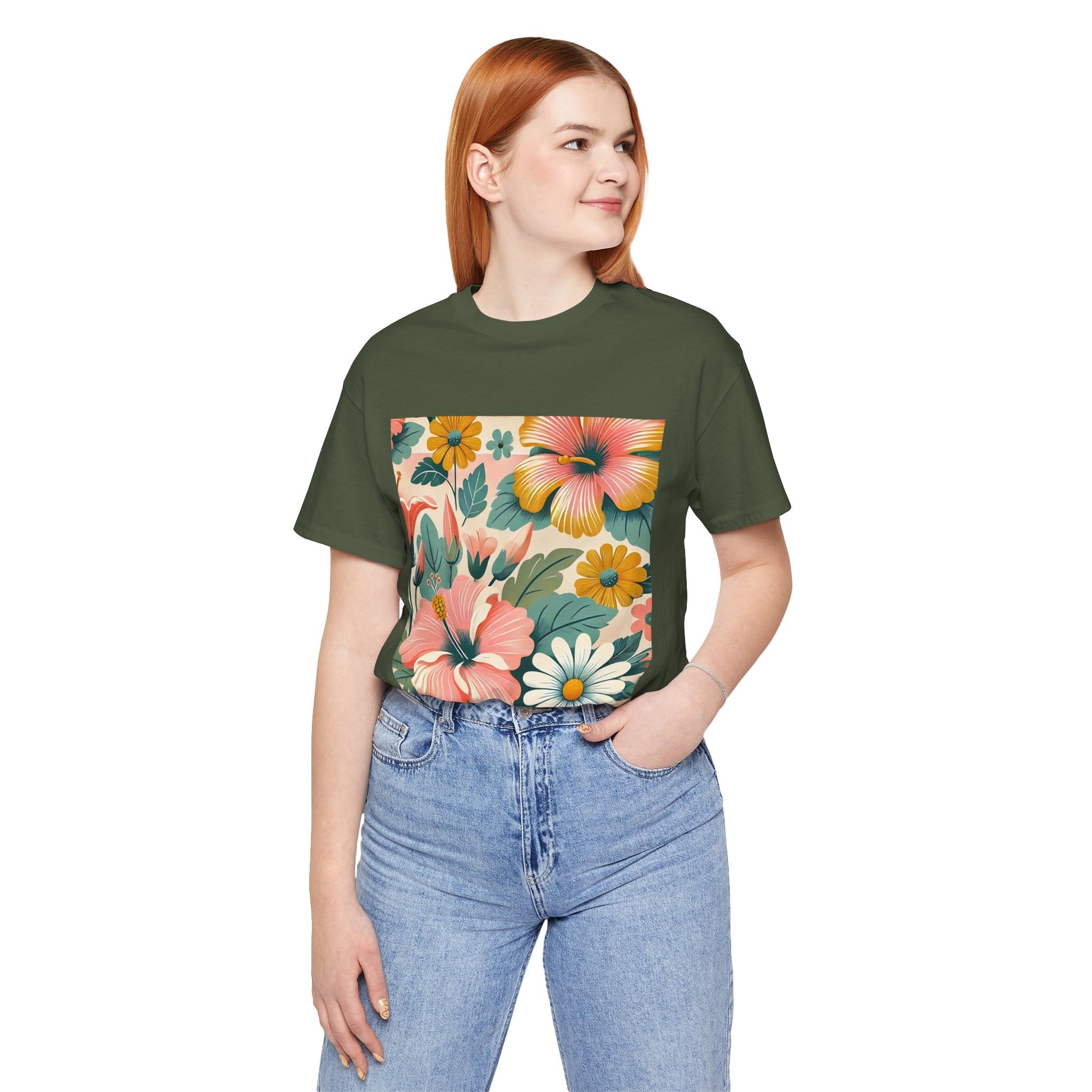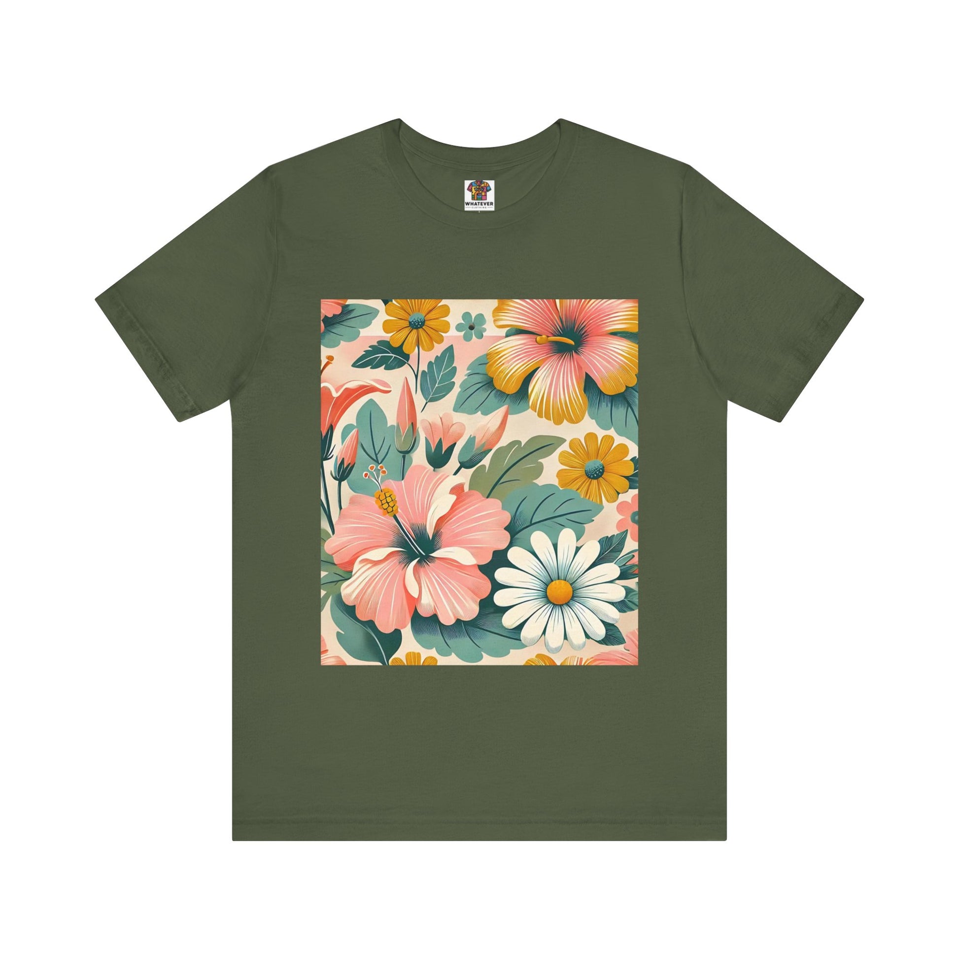 A whimsical pattern featuring large hibiscus and daisy flowers in soft pinks, yellows, and greens on a pastel background, ideal for summer wear.