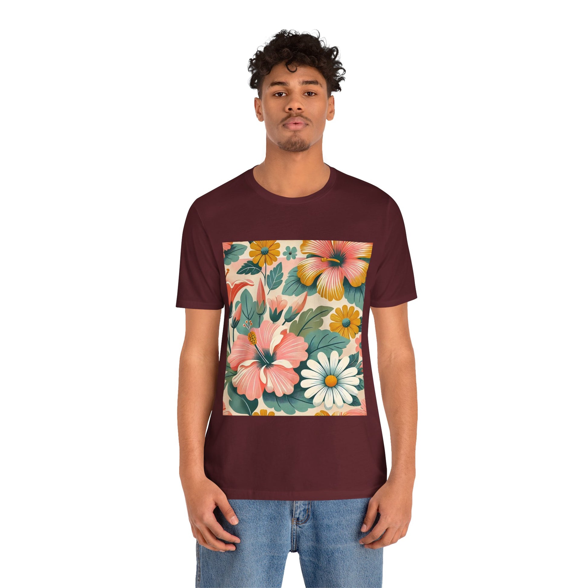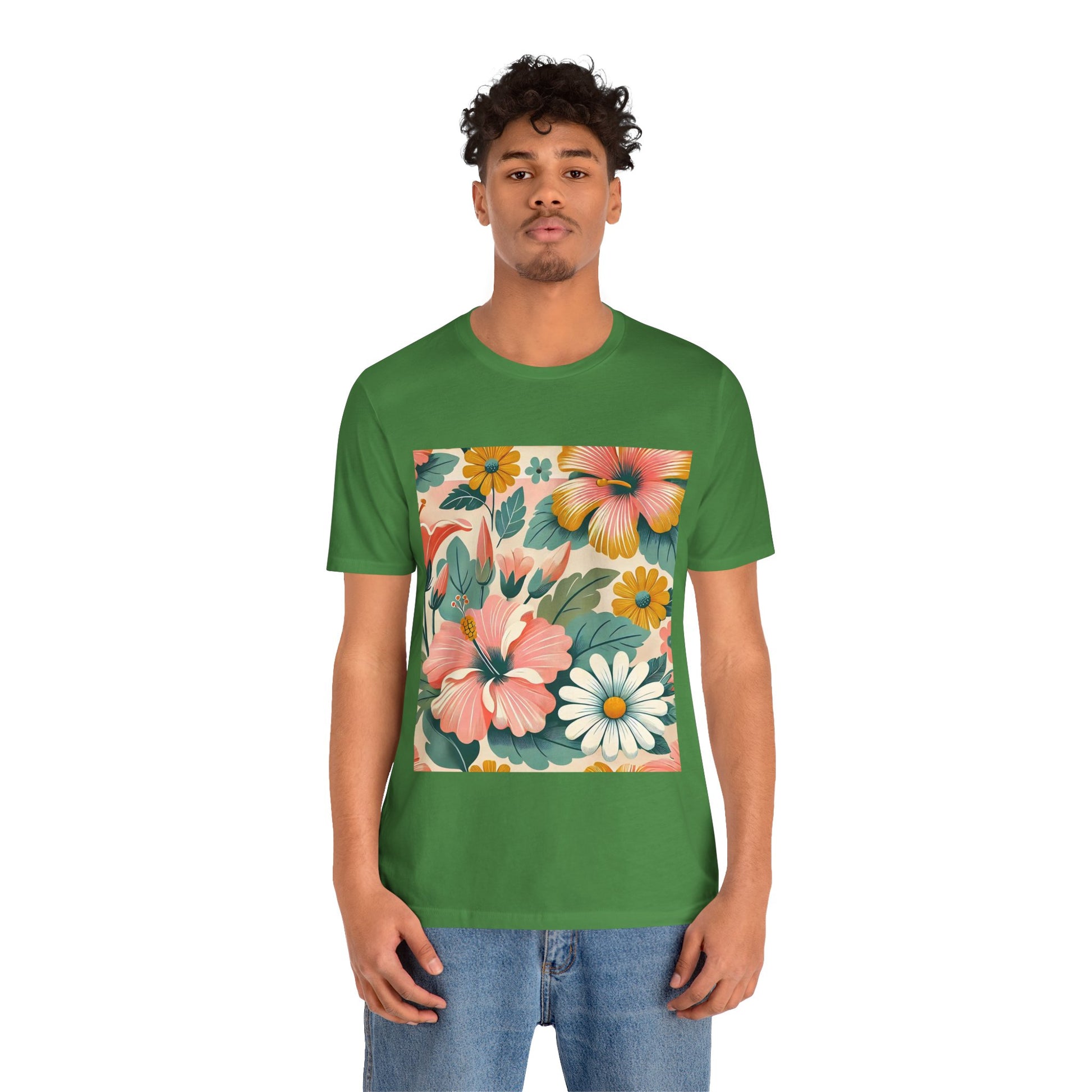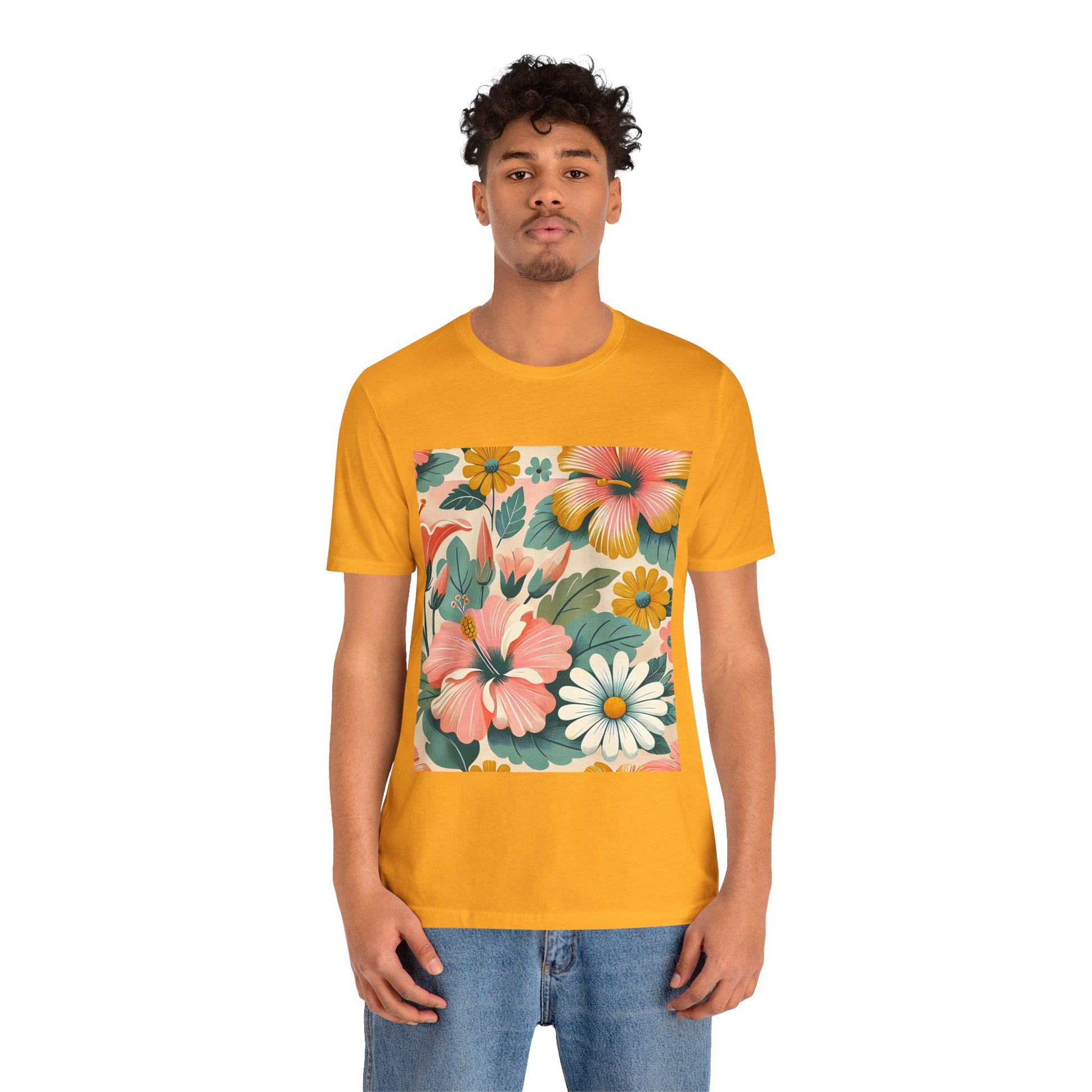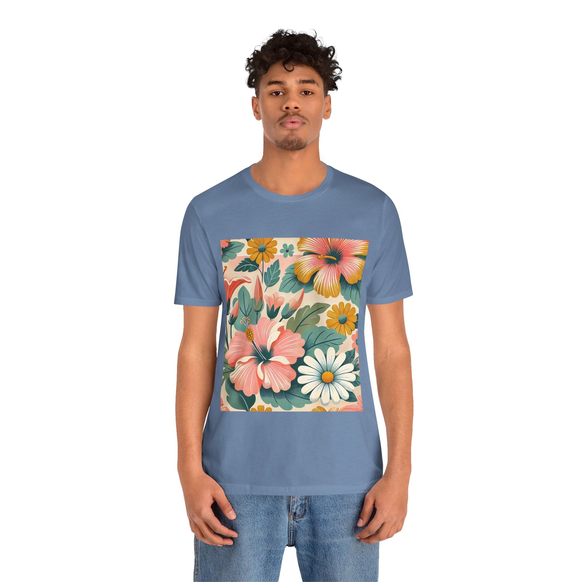 A whimsical pattern featuring large hibiscus and daisy flowers in soft pinks, yellows, and greens on a pastel background, ideal for summer wear.