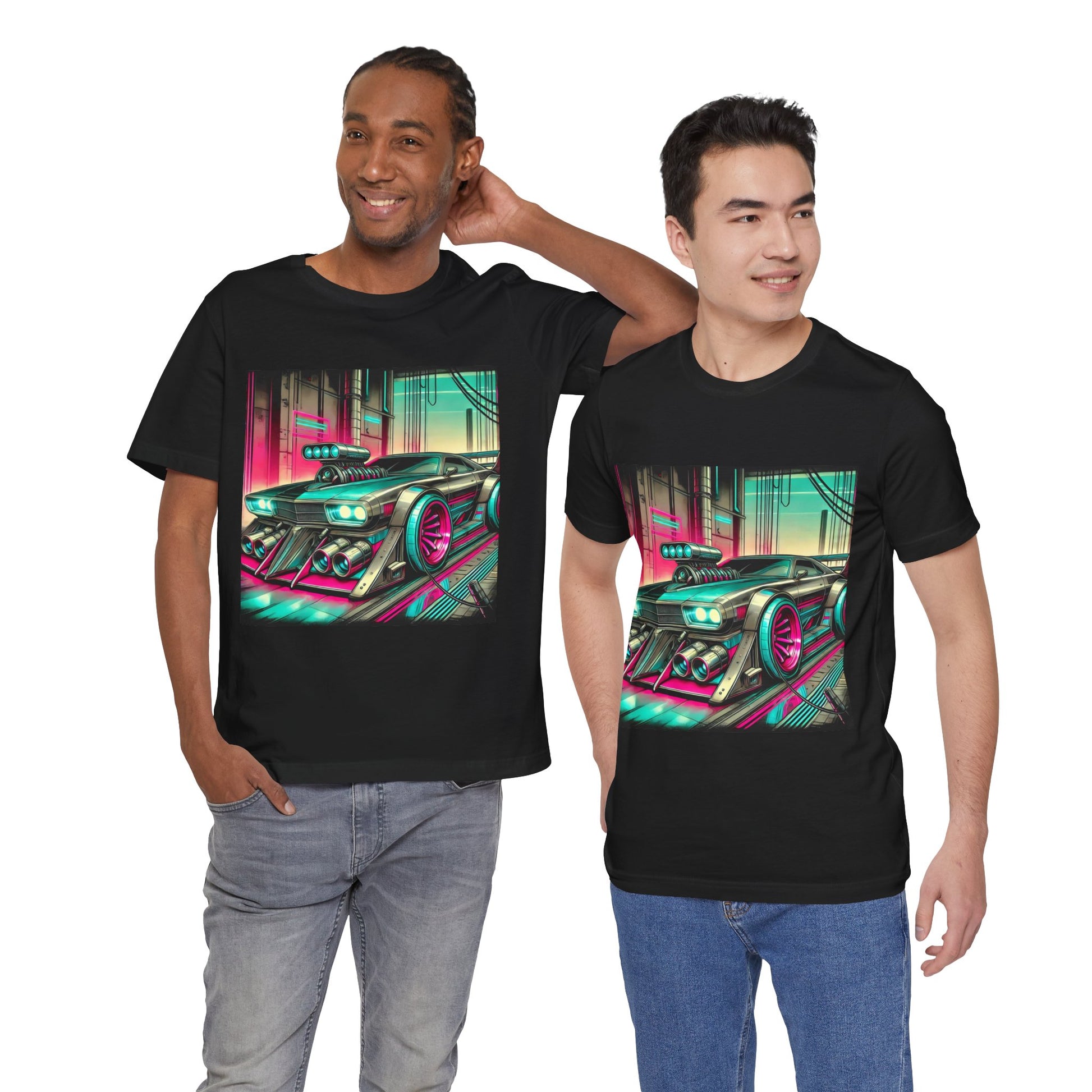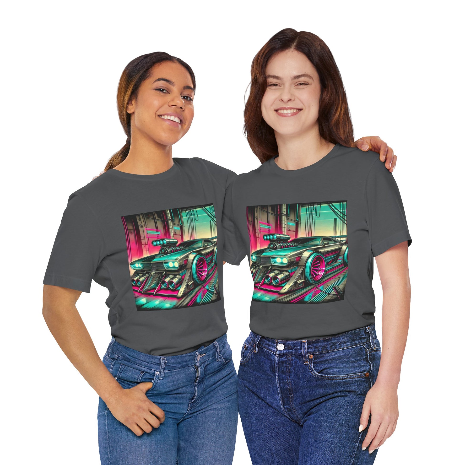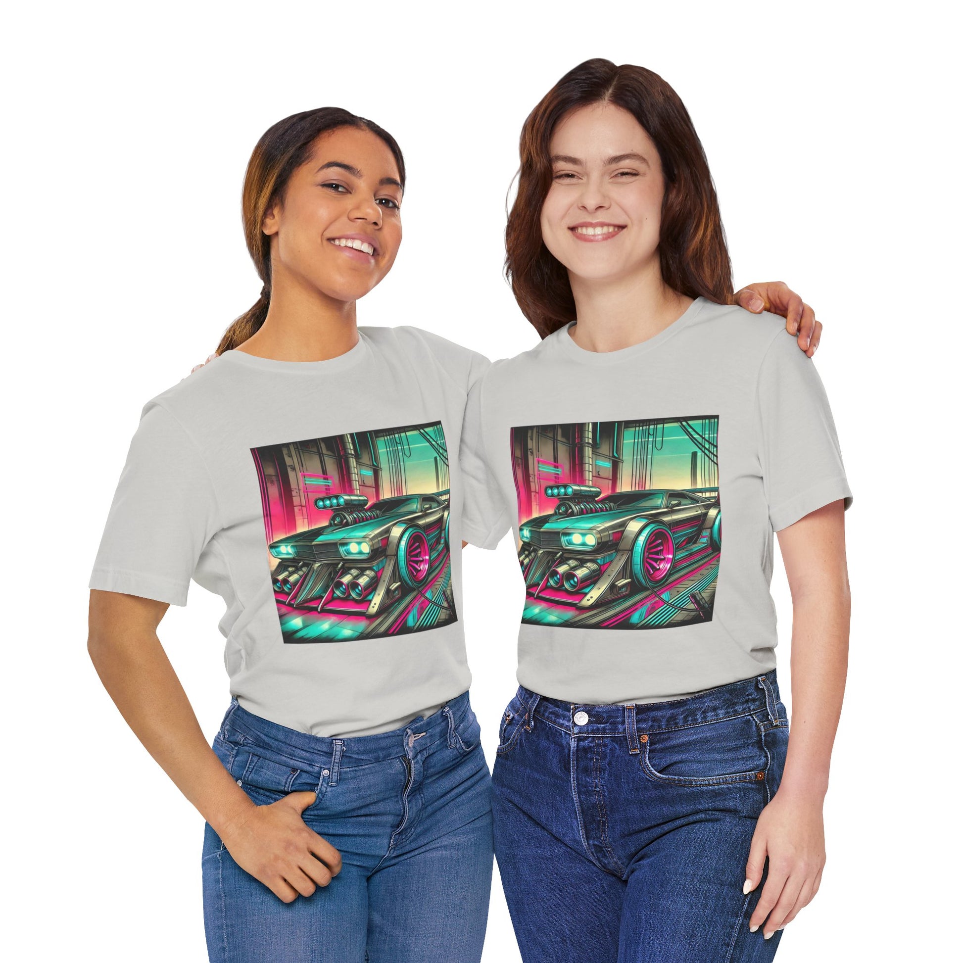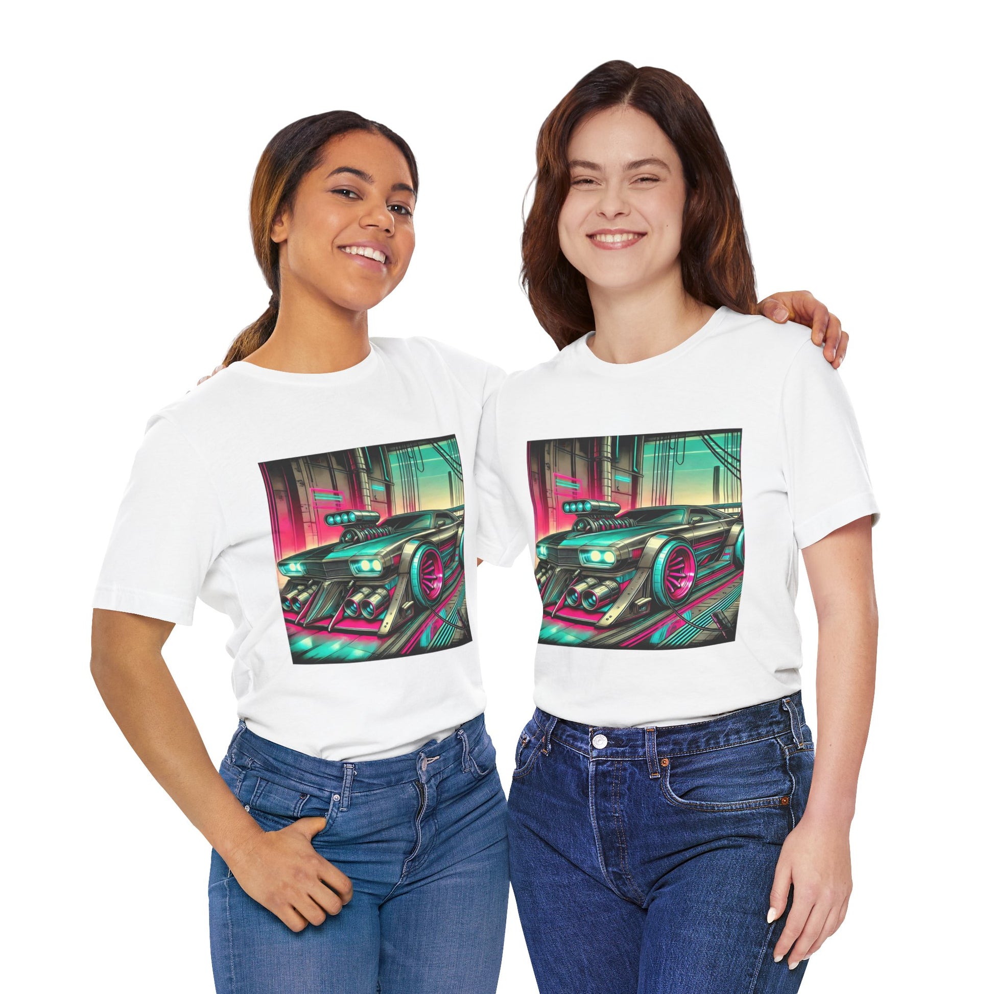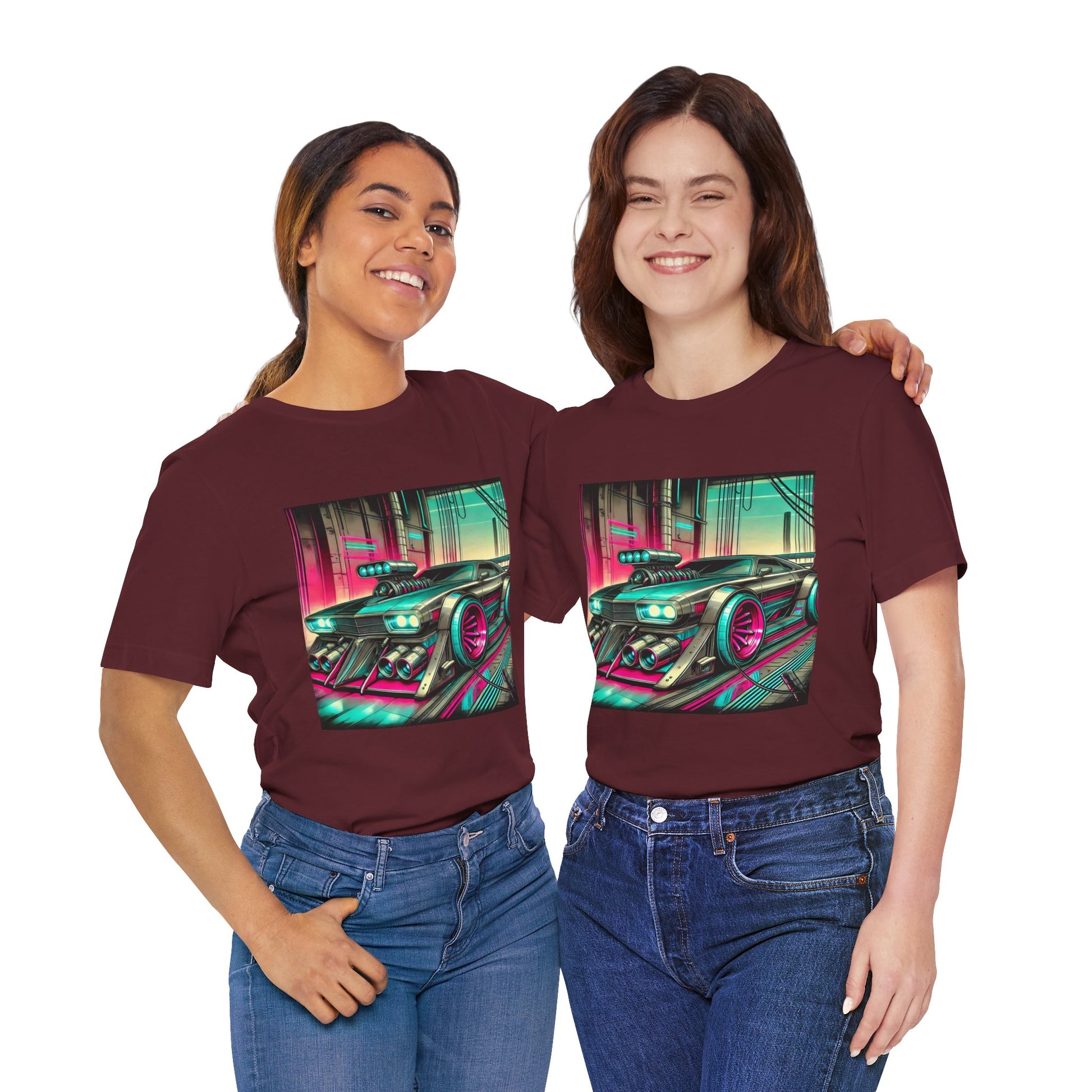 A sleek, cyberpunk car with neon highlights and exaggerated details, set in a gritty urban landscape. Perfect for retro-futuristic designs.