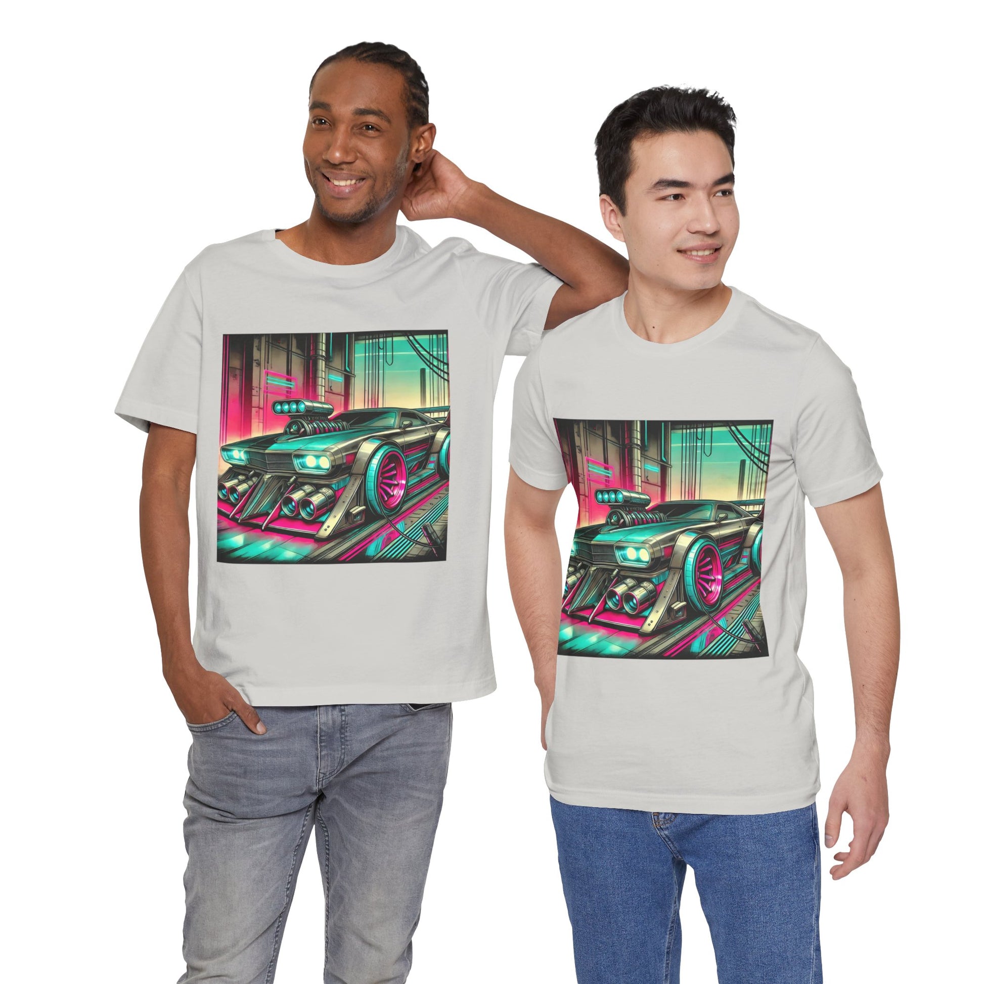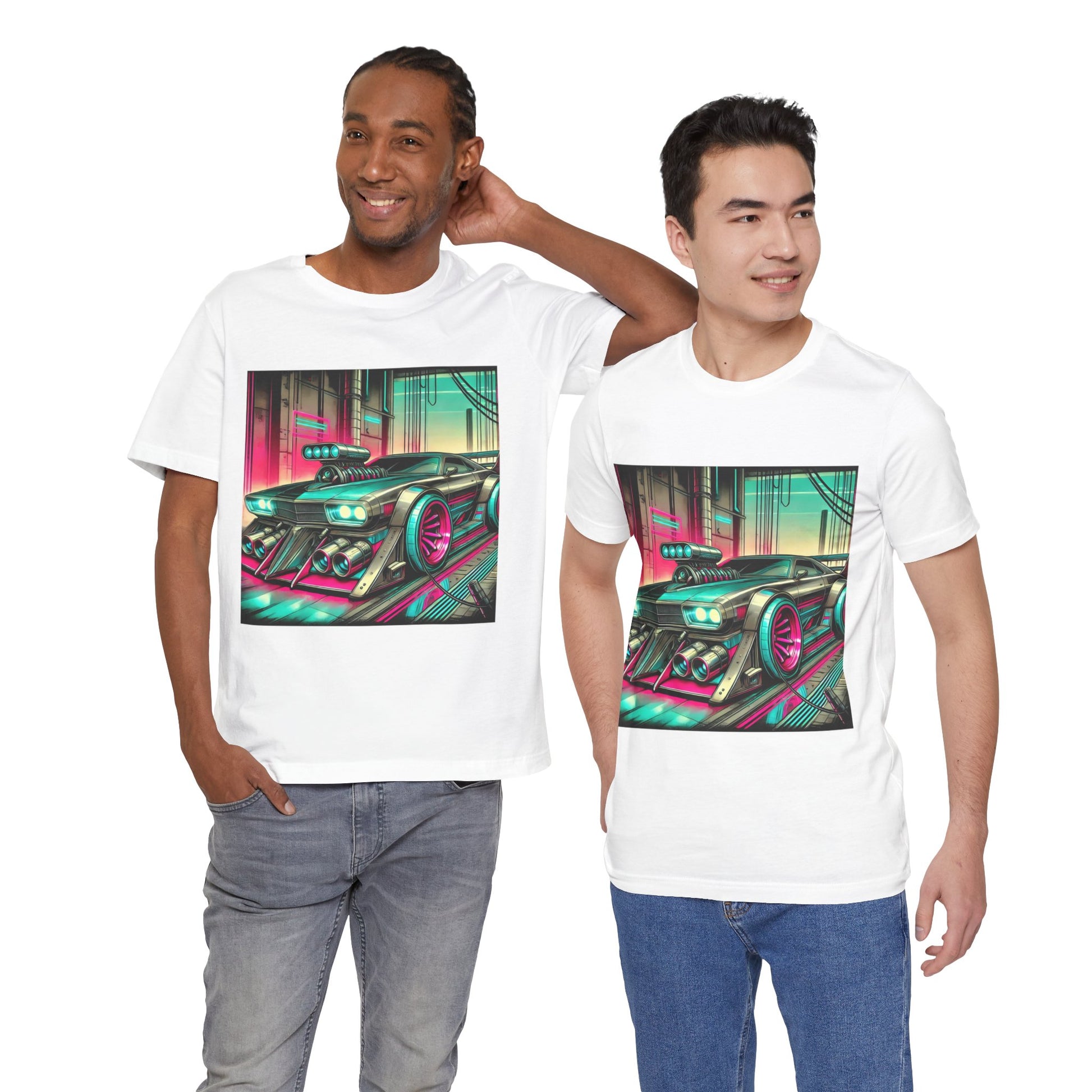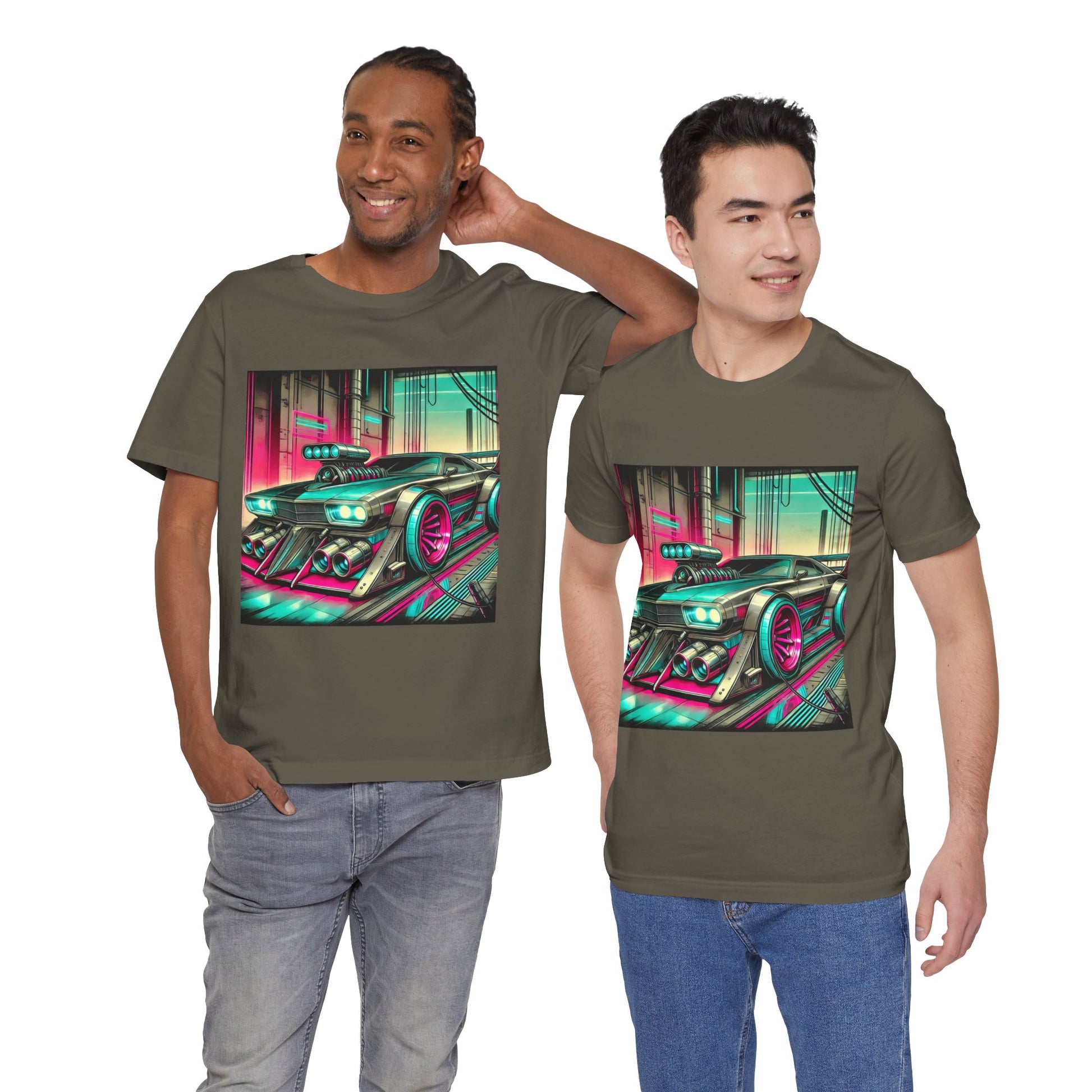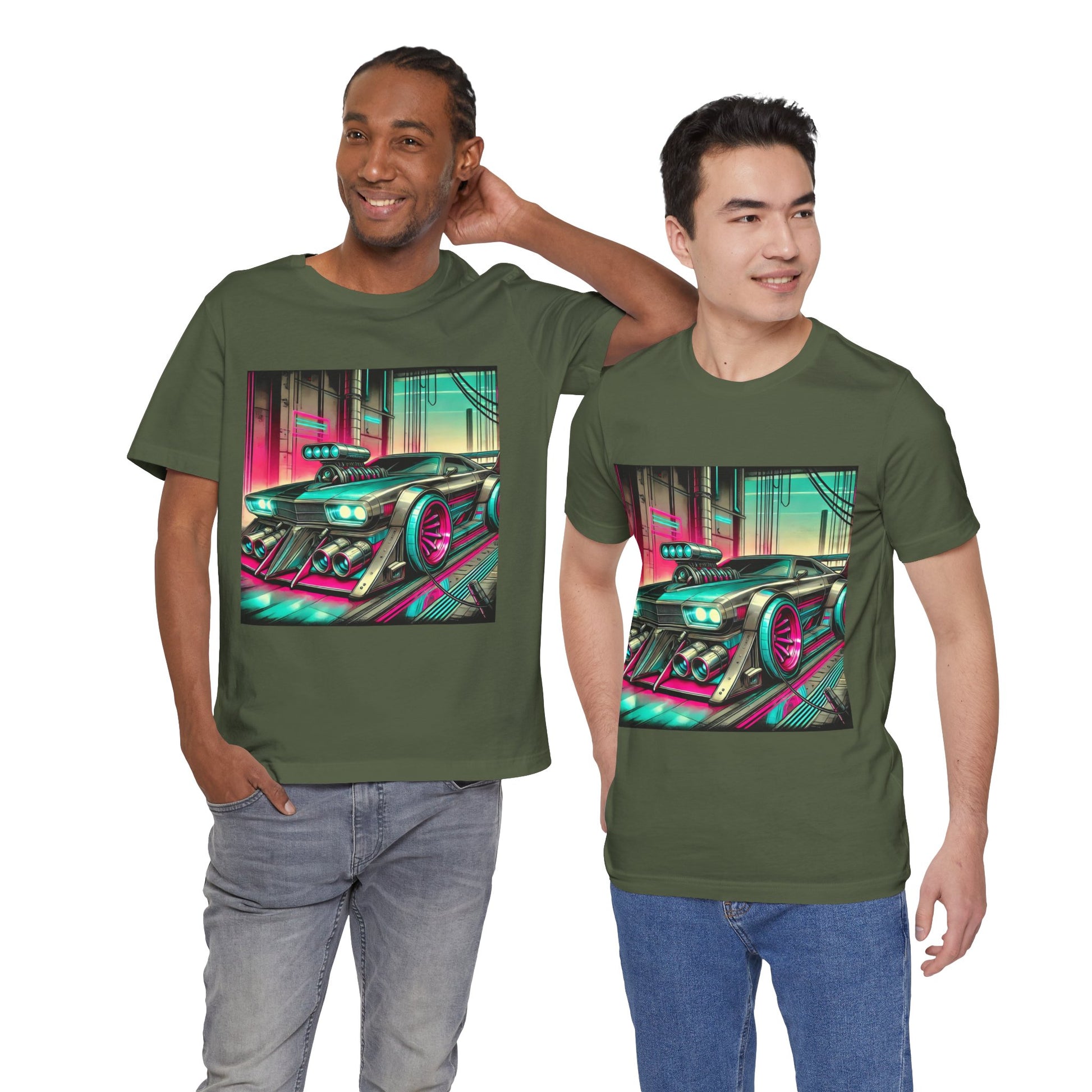A sleek, cyberpunk car with neon highlights and exaggerated details, set in a gritty urban landscape. Perfect for retro-futuristic designs.