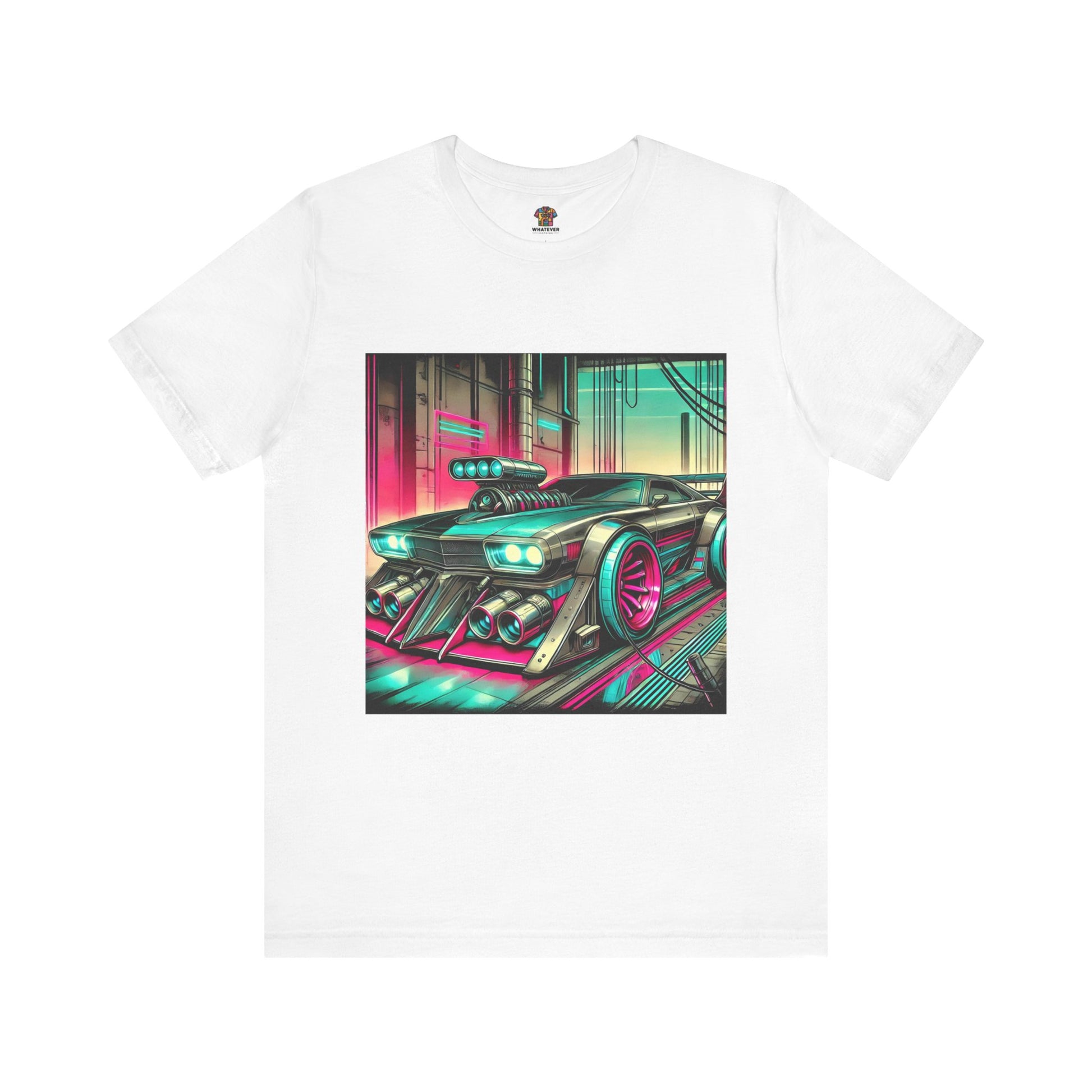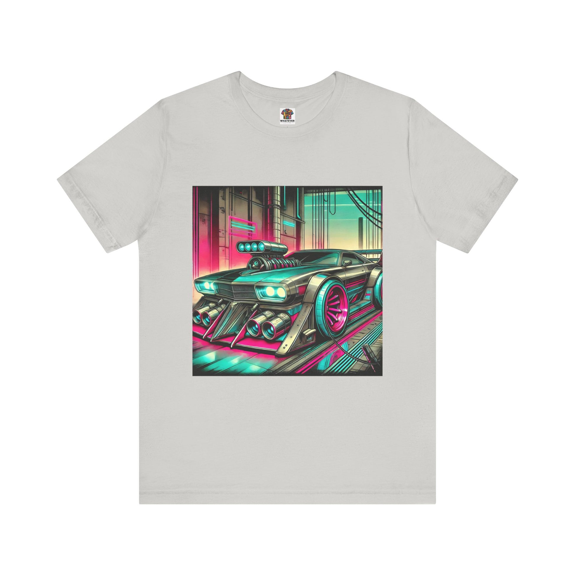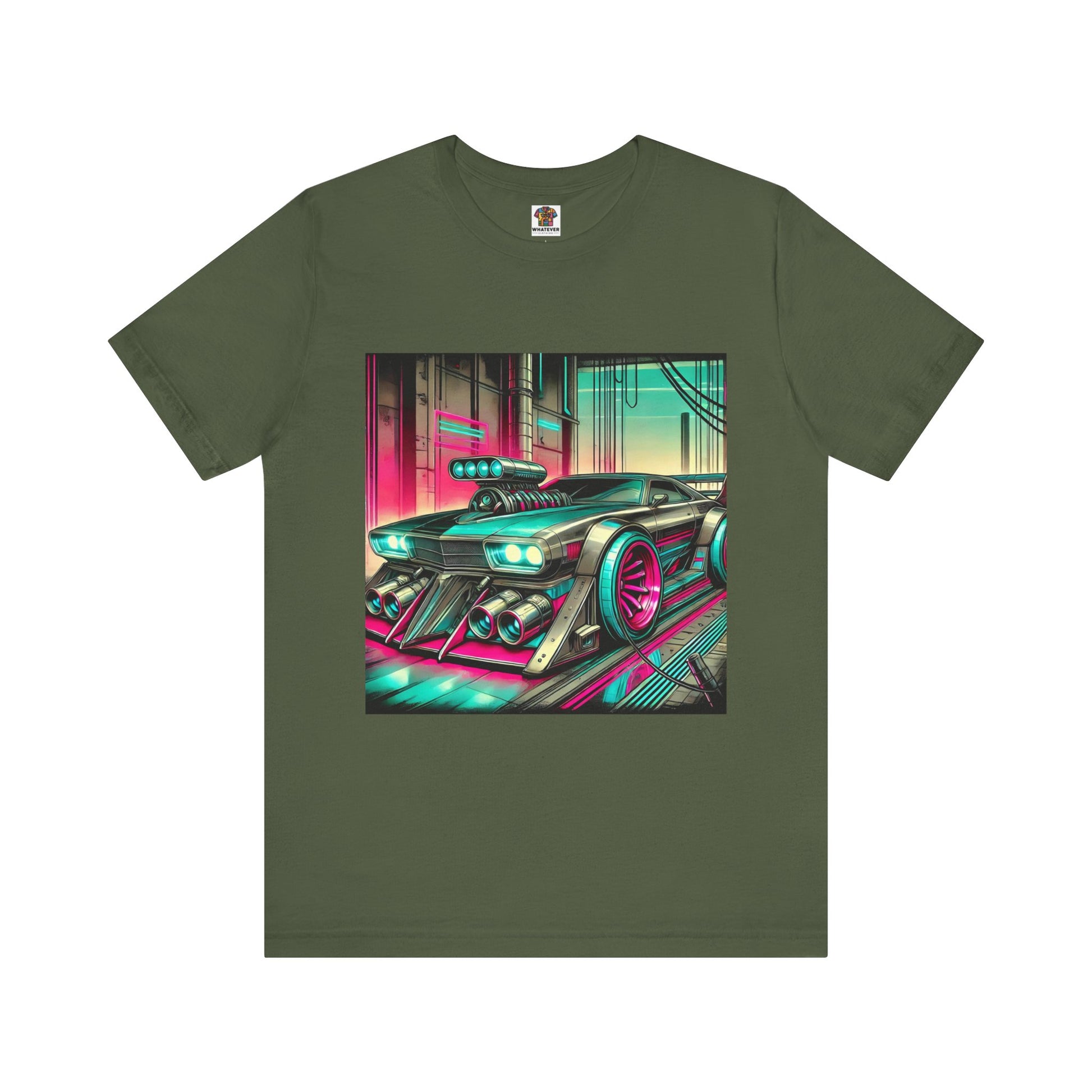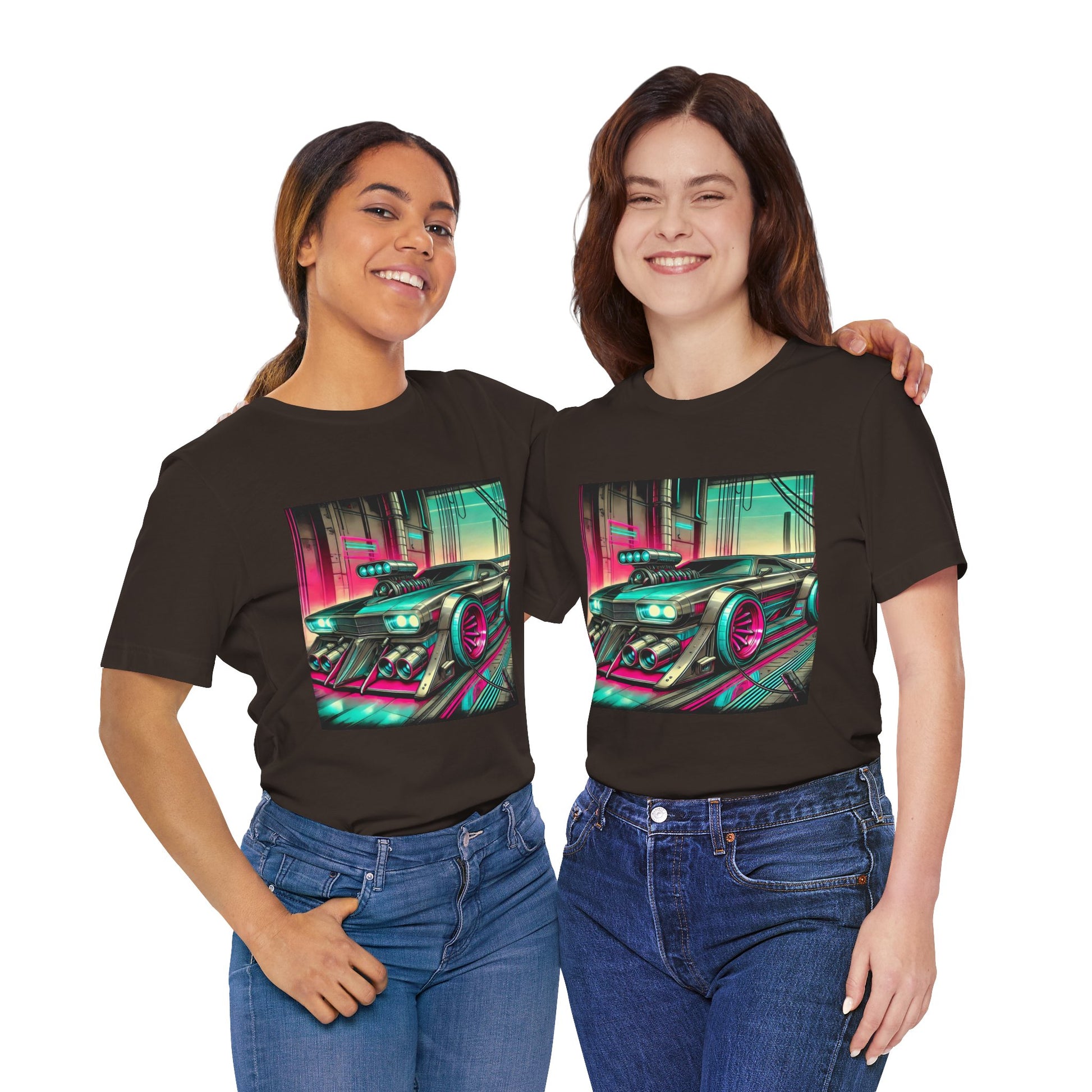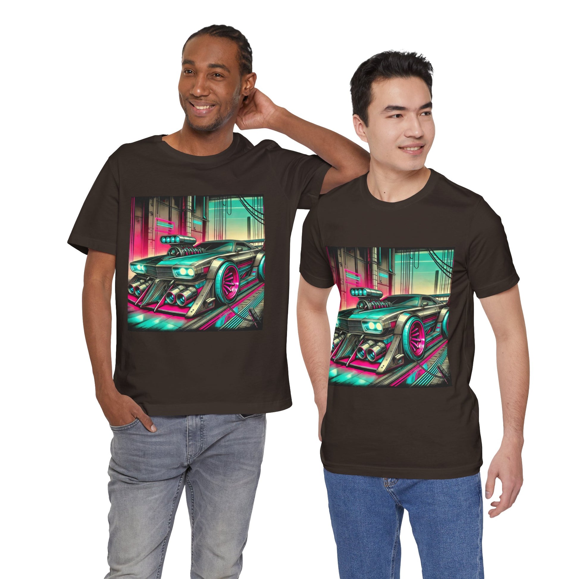 A sleek, cyberpunk car with neon highlights and exaggerated details, set in a gritty urban landscape. Perfect for retro-futuristic designs.