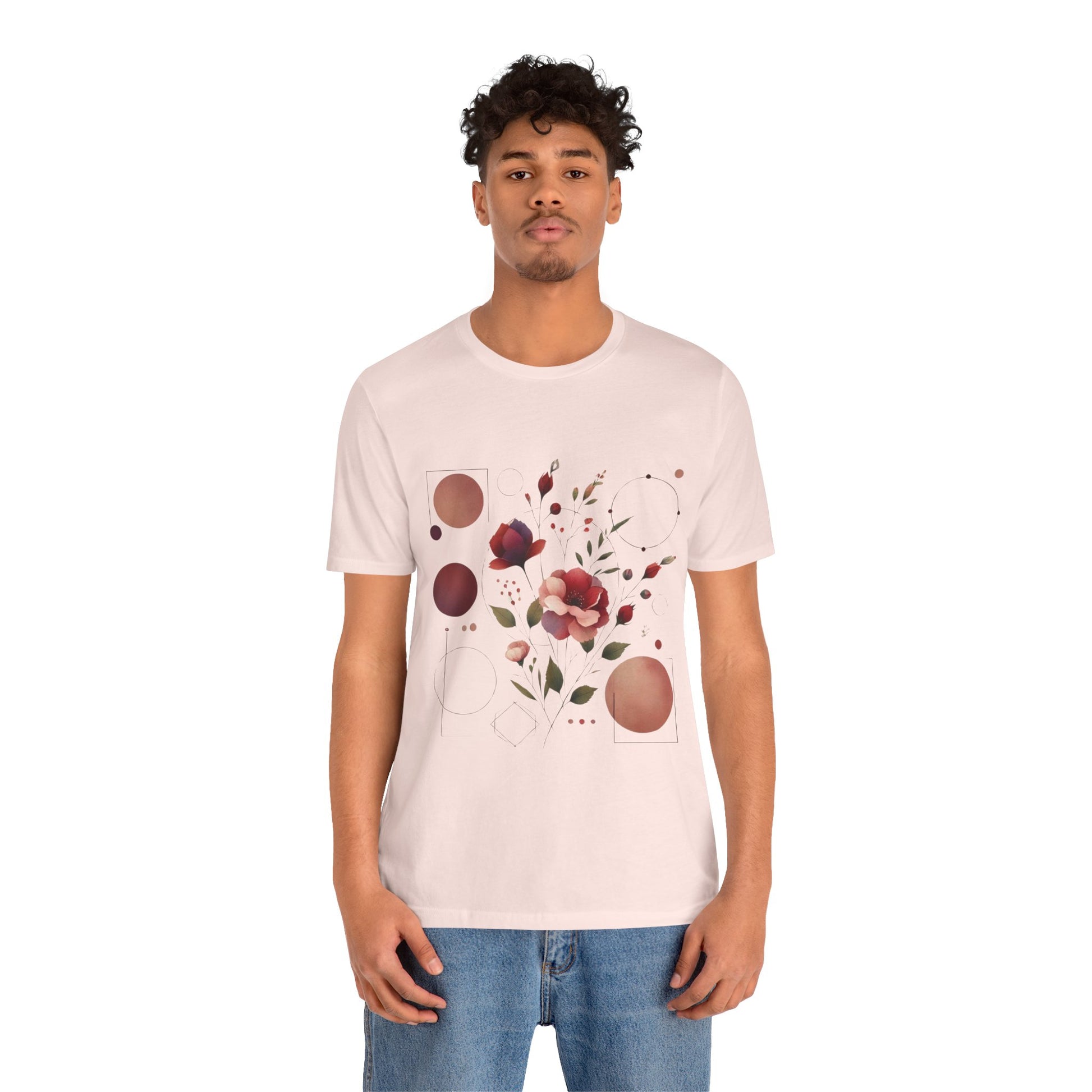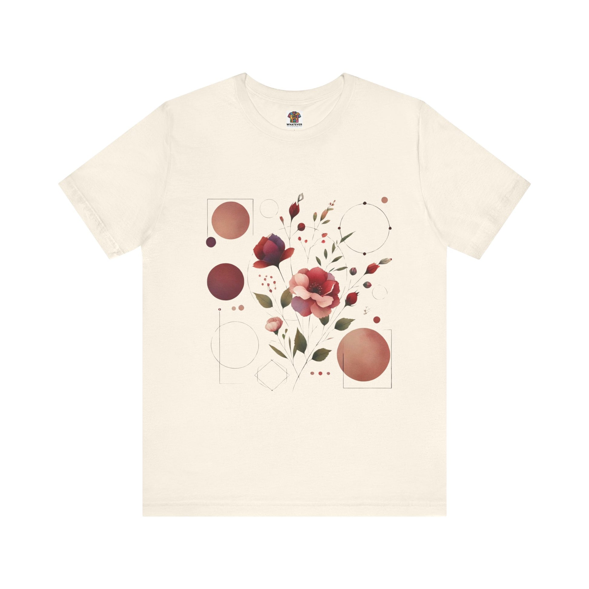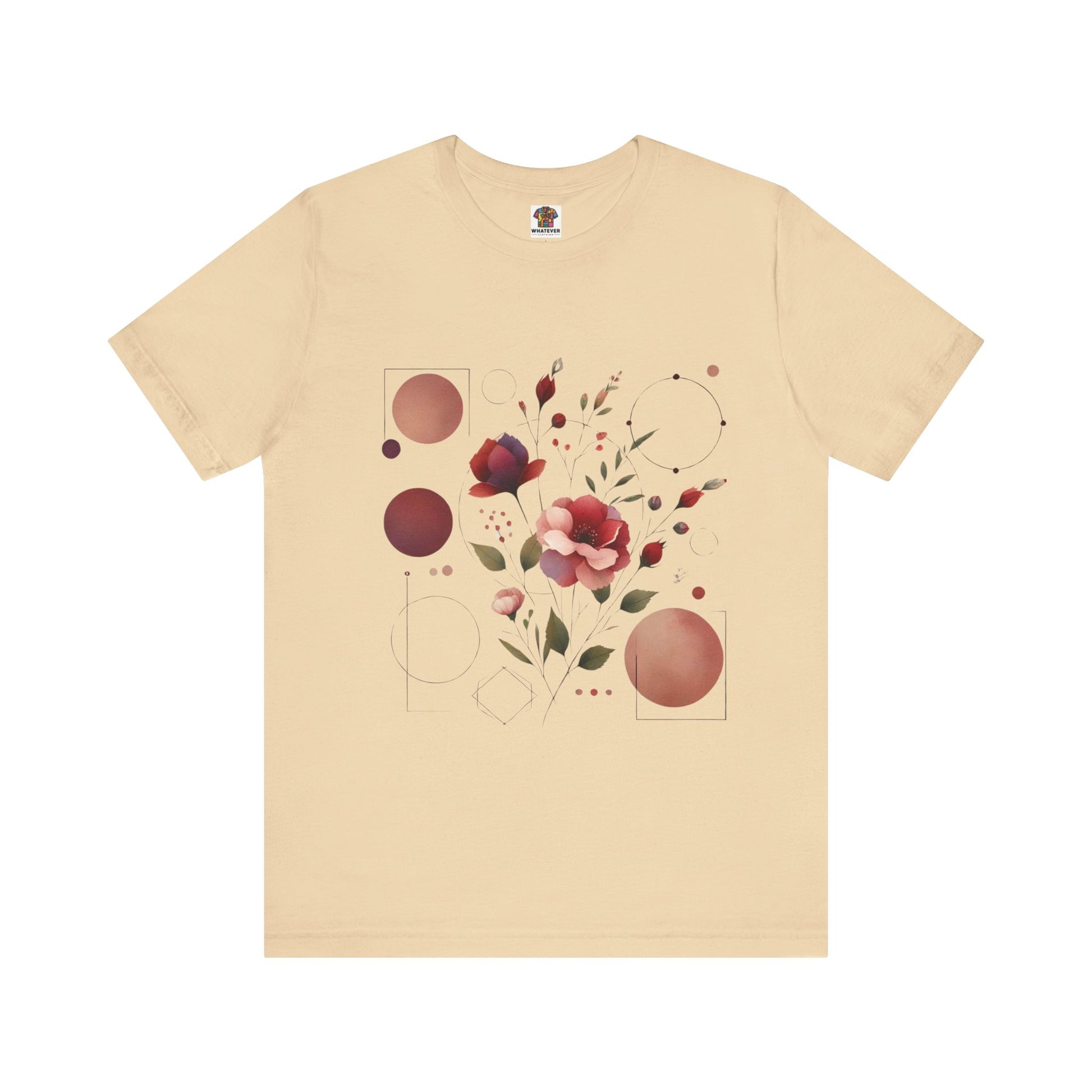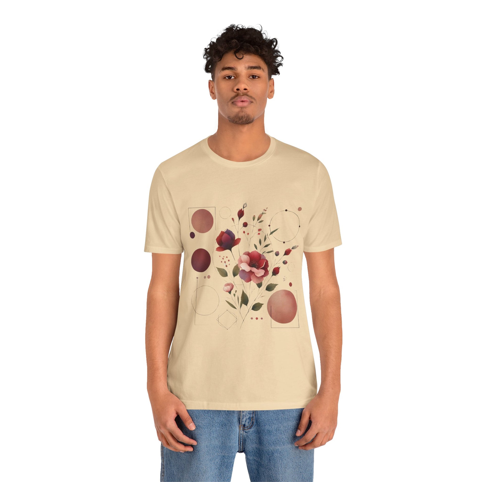 A modern design with simple geometric shapes (circles and triangles) infused with a delicate floral pattern in shades of red, pink, purple, and green on an off-white background.