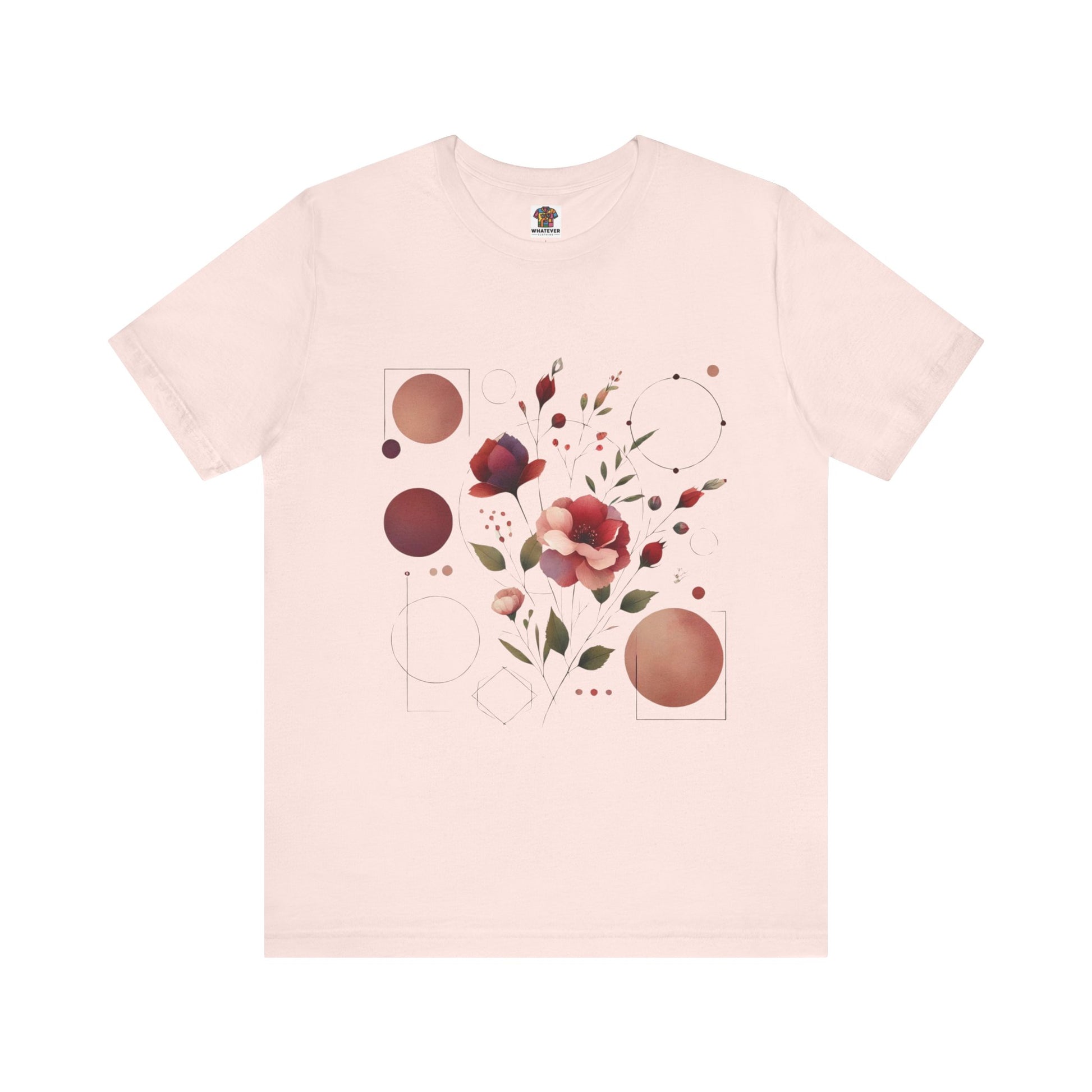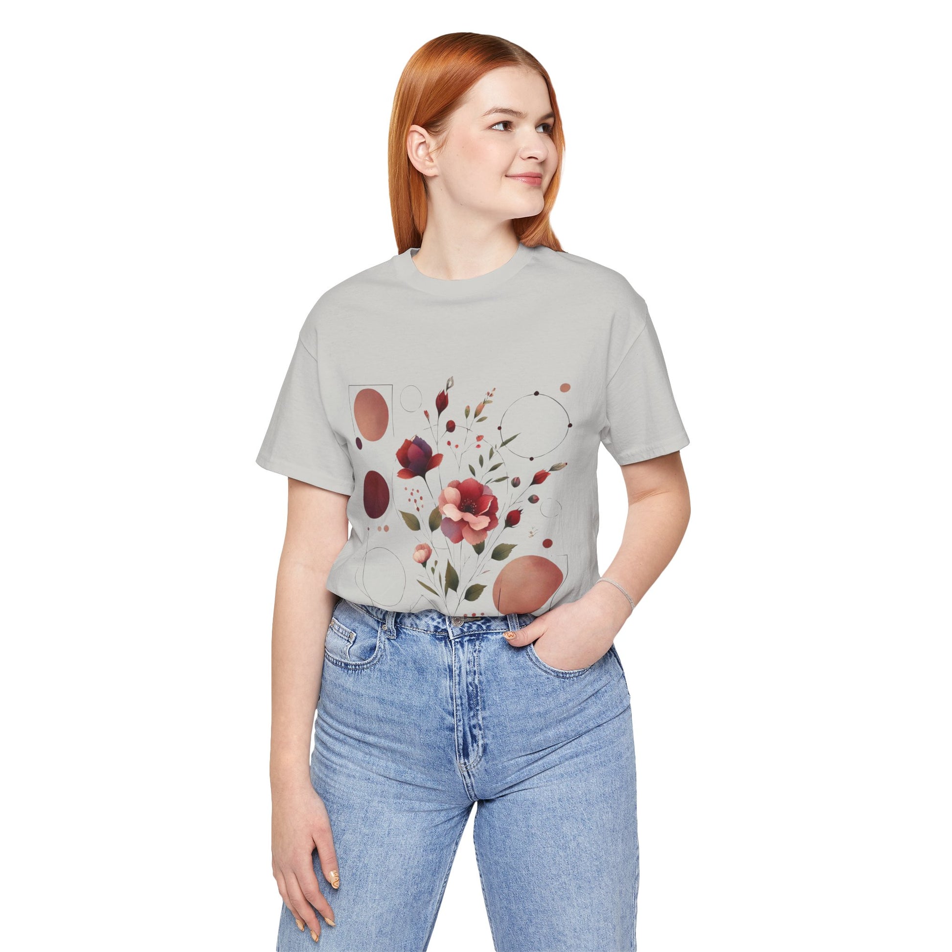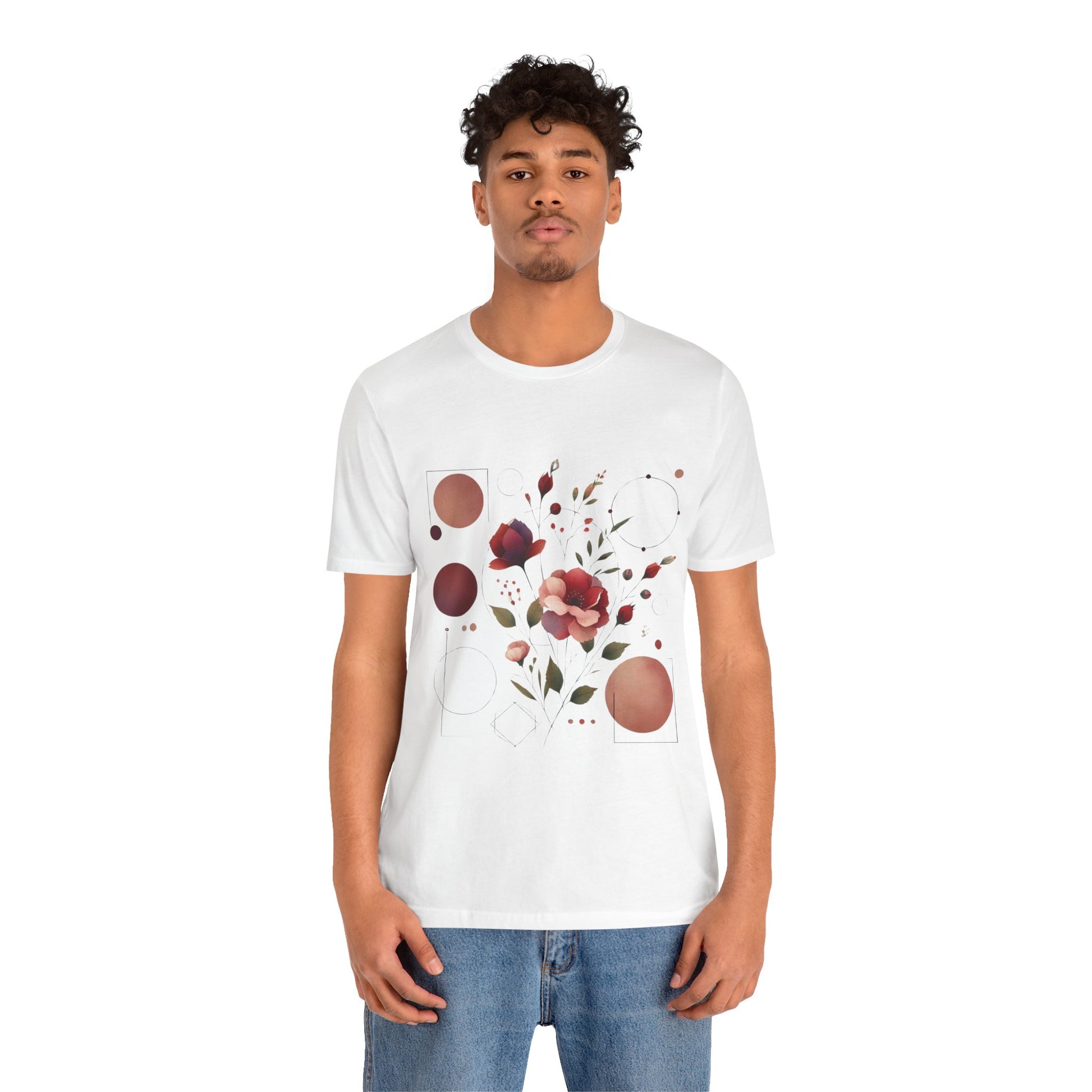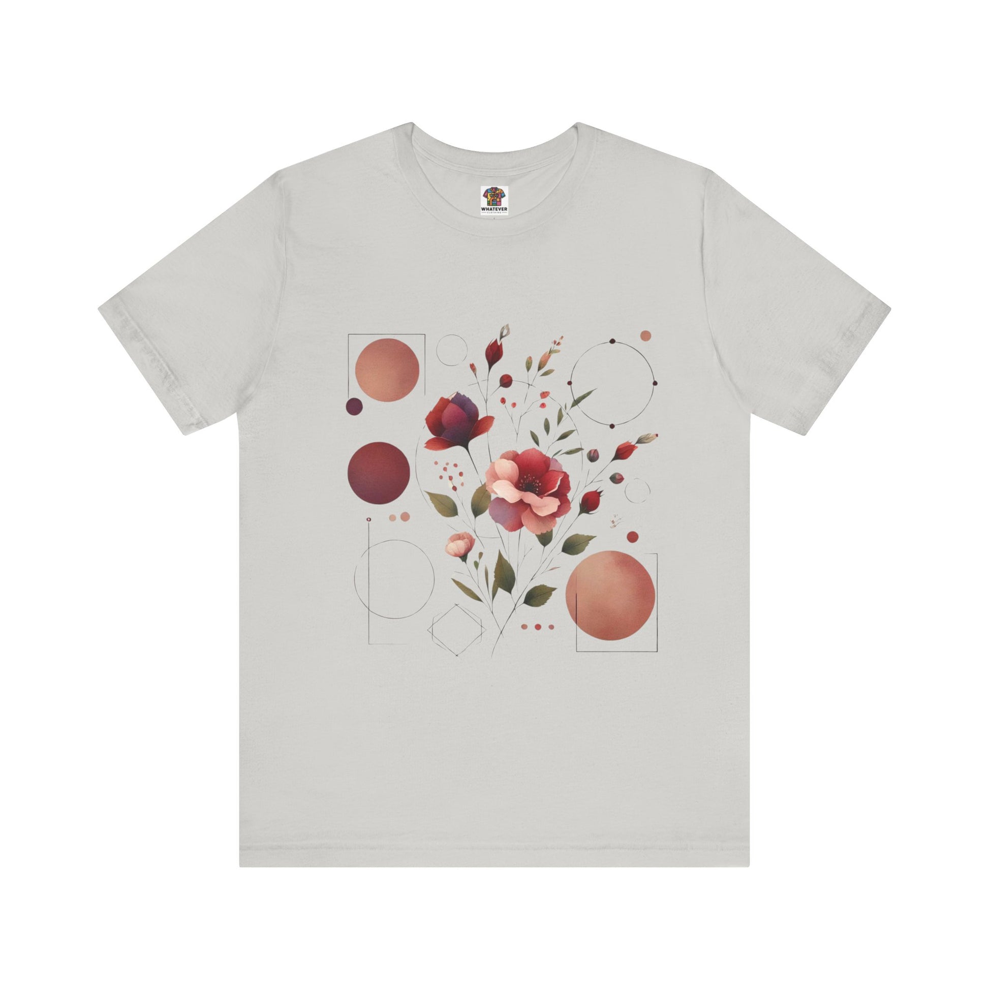 A modern design with simple geometric shapes (circles and triangles) infused with a delicate floral pattern in shades of red, pink, purple, and green on an off-white background.