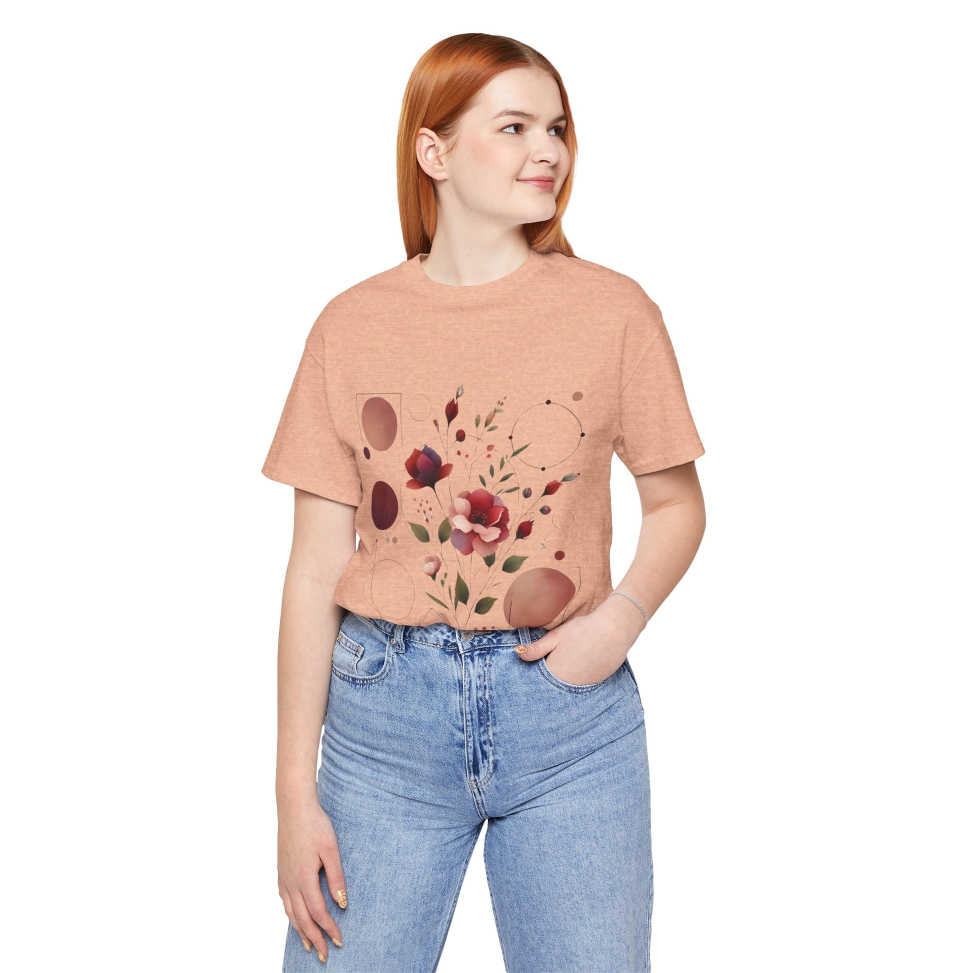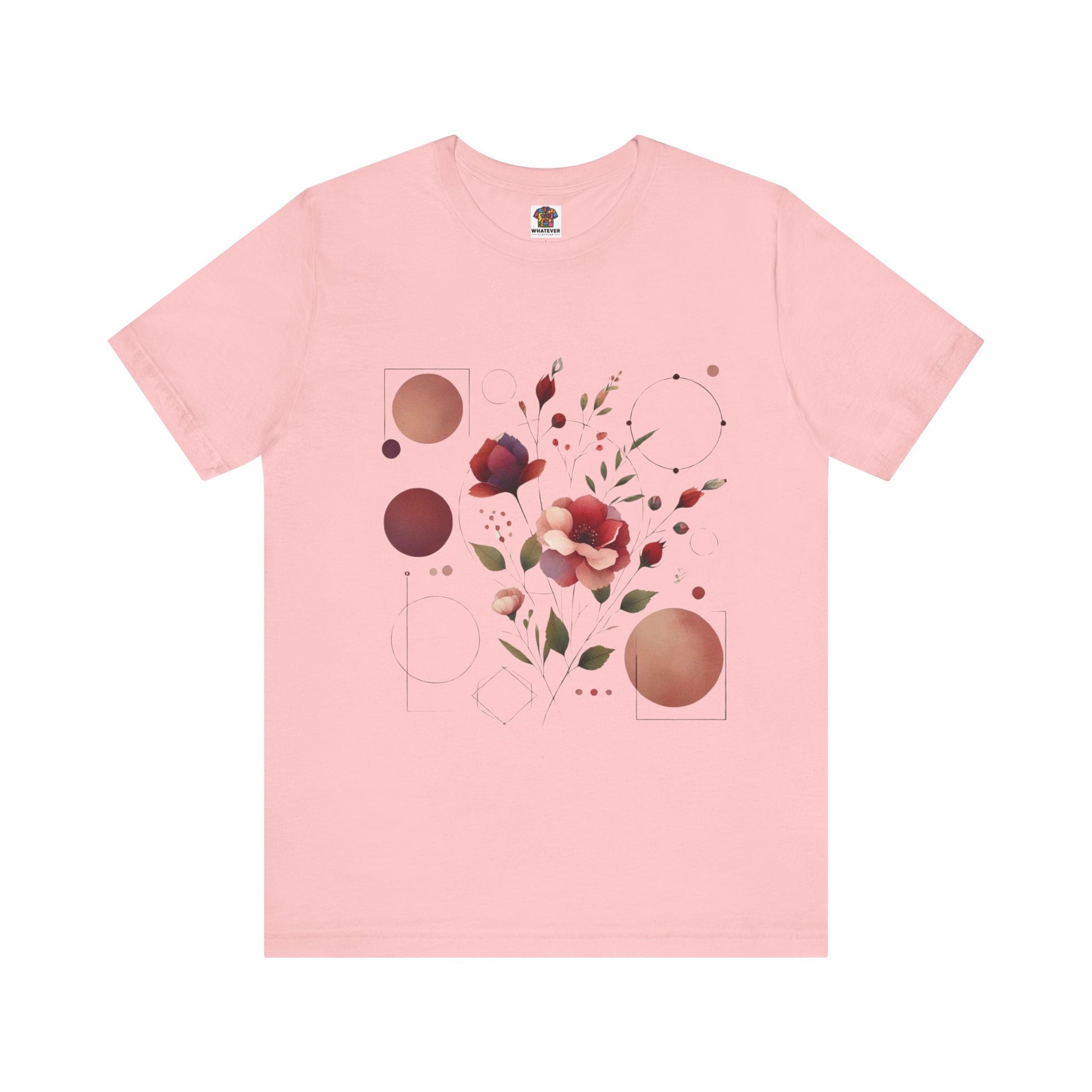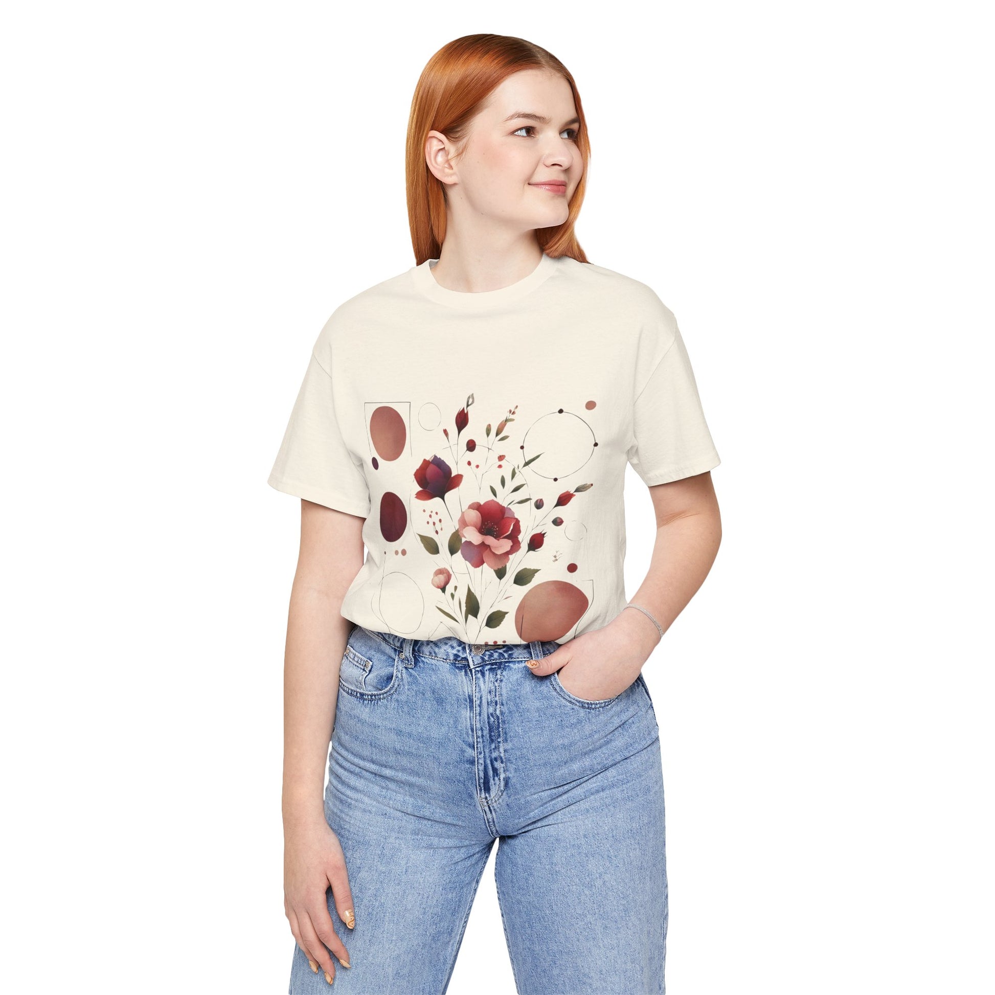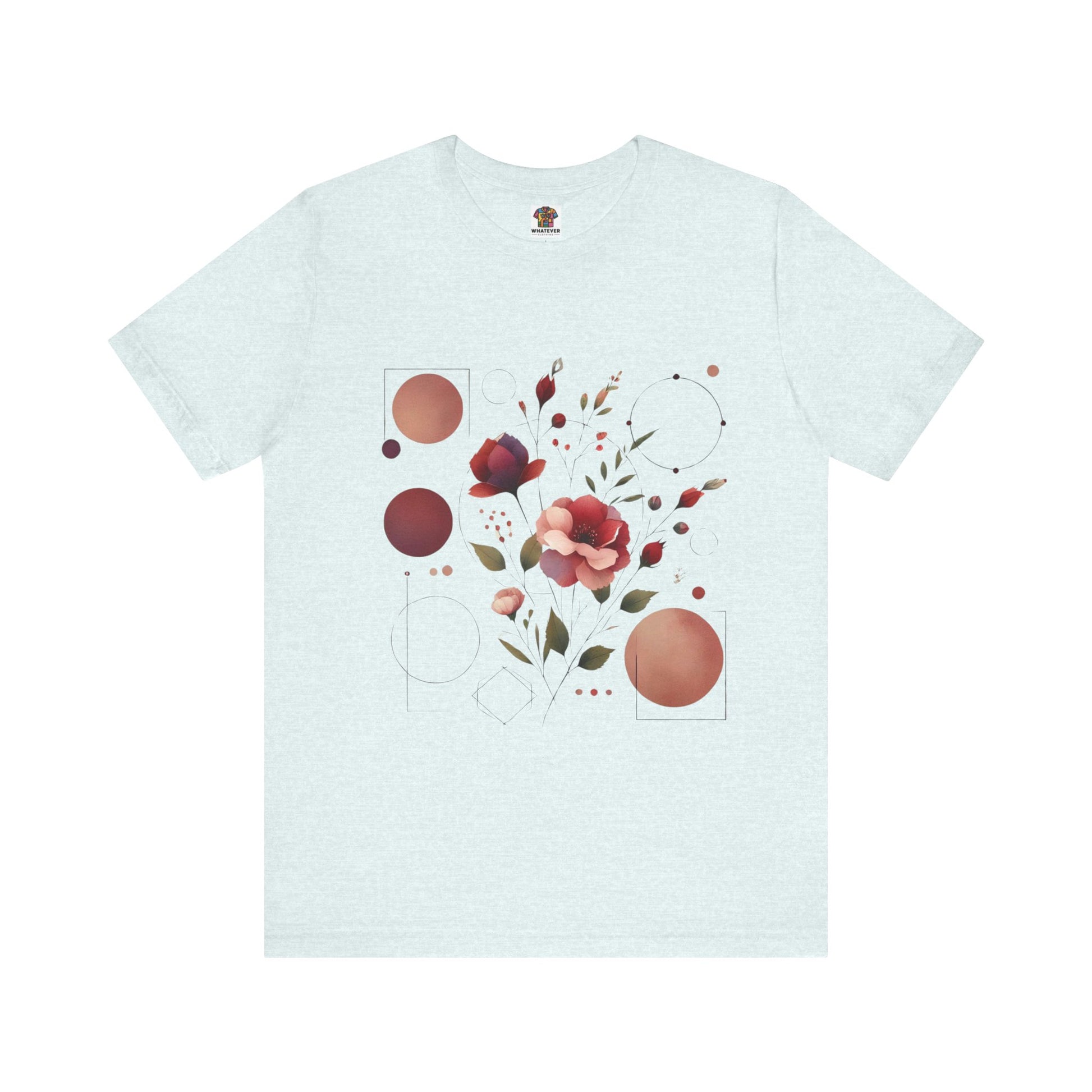 A modern design with simple geometric shapes (circles and triangles) infused with a delicate floral pattern in shades of red, pink, purple, and green on an off-white background.