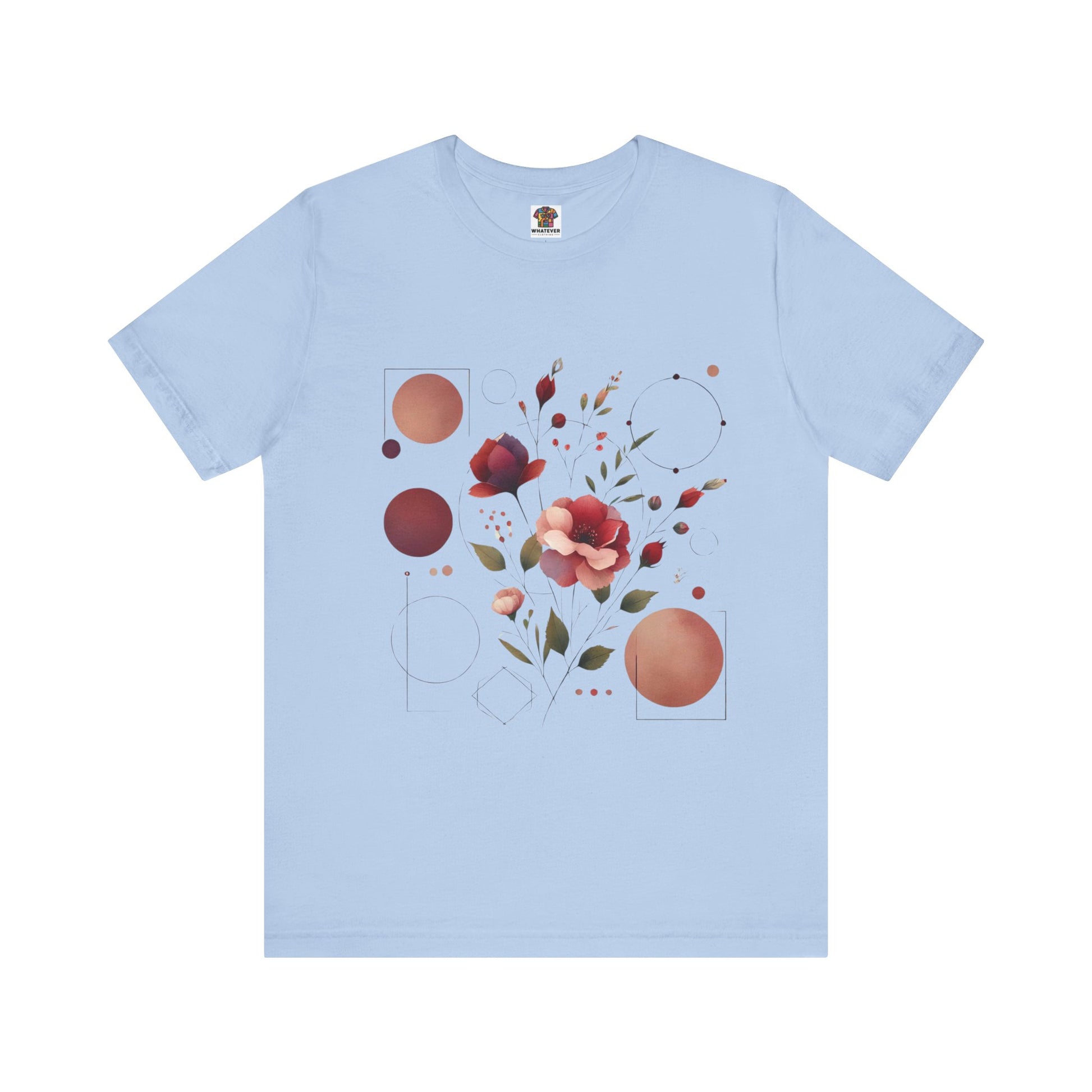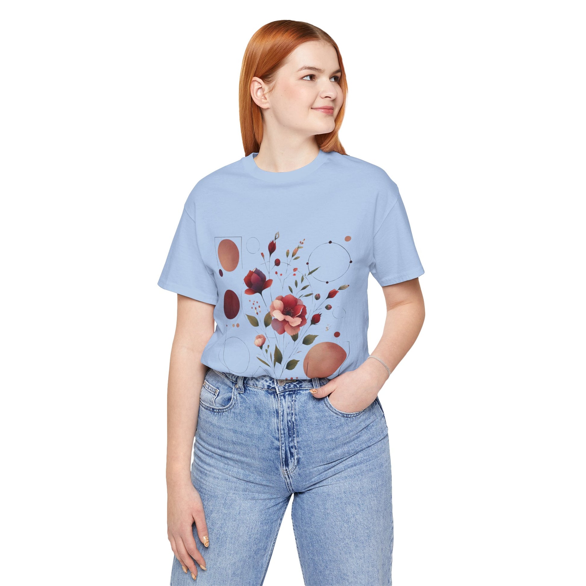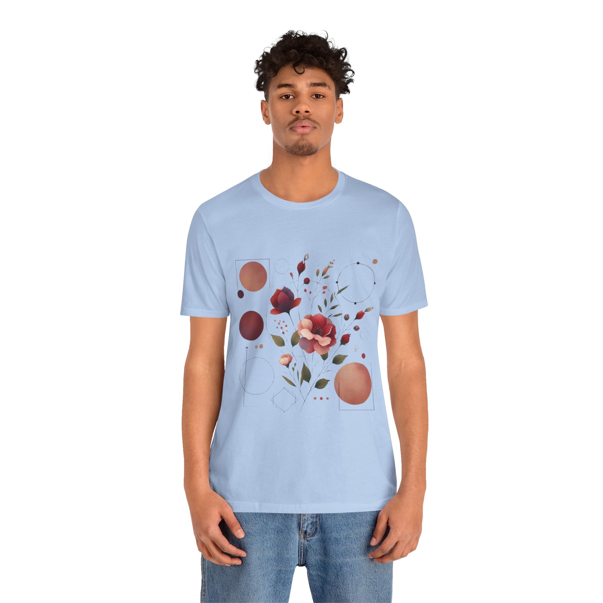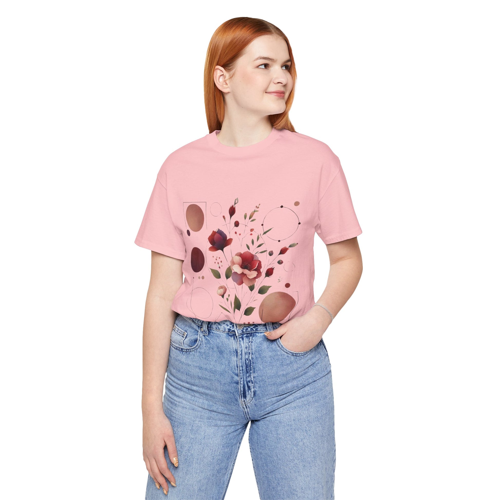 A modern design with simple geometric shapes (circles and triangles) infused with a delicate floral pattern in shades of red, pink, purple, and green on an off-white background.