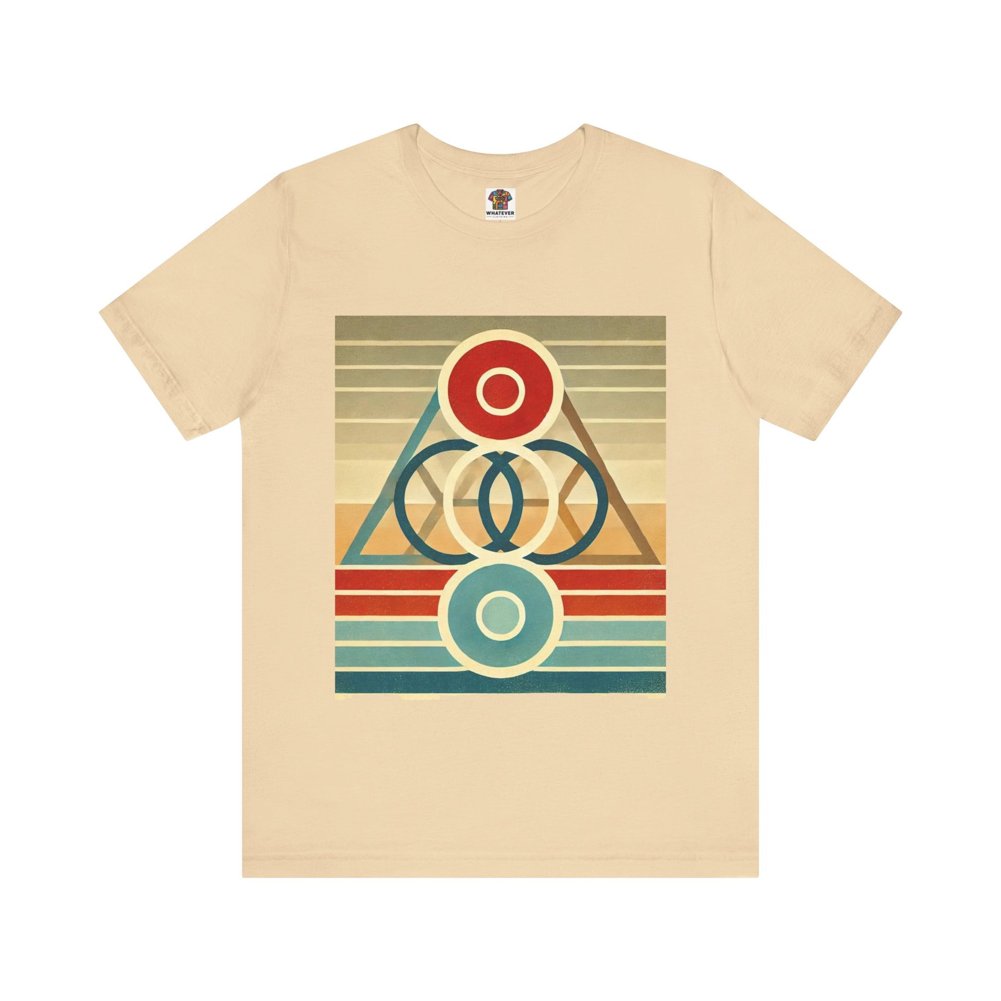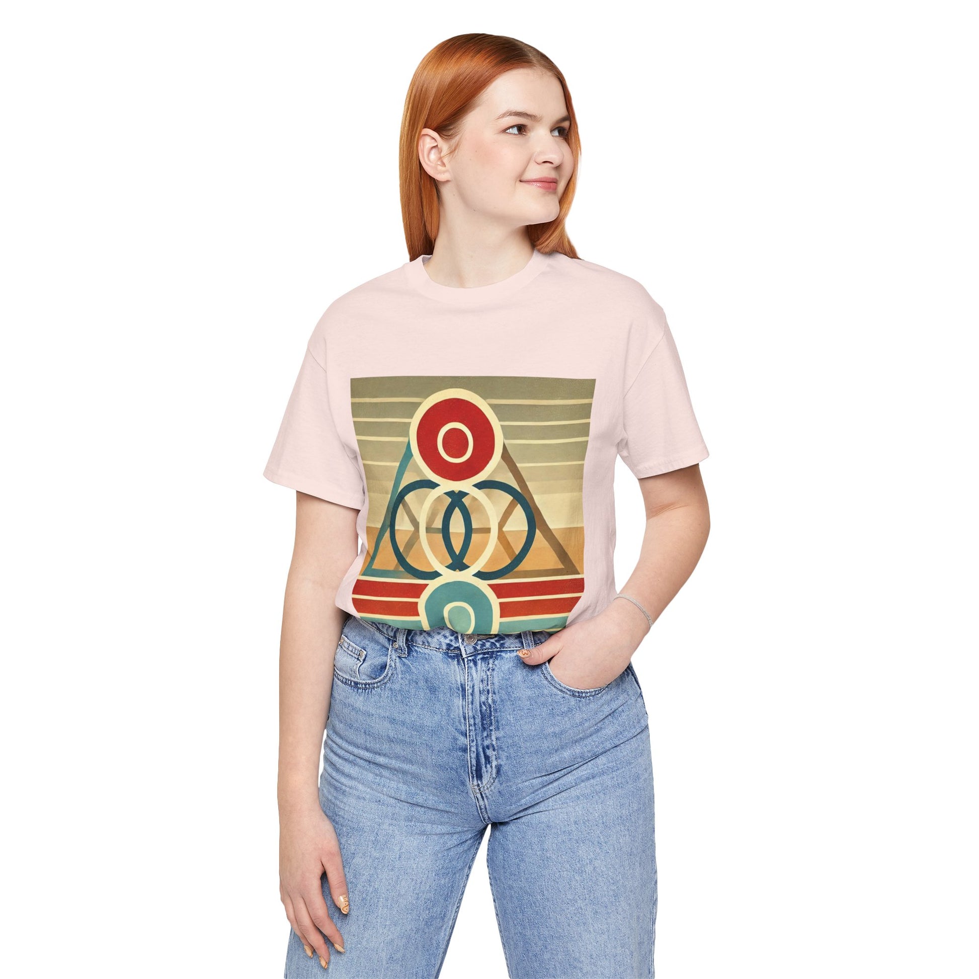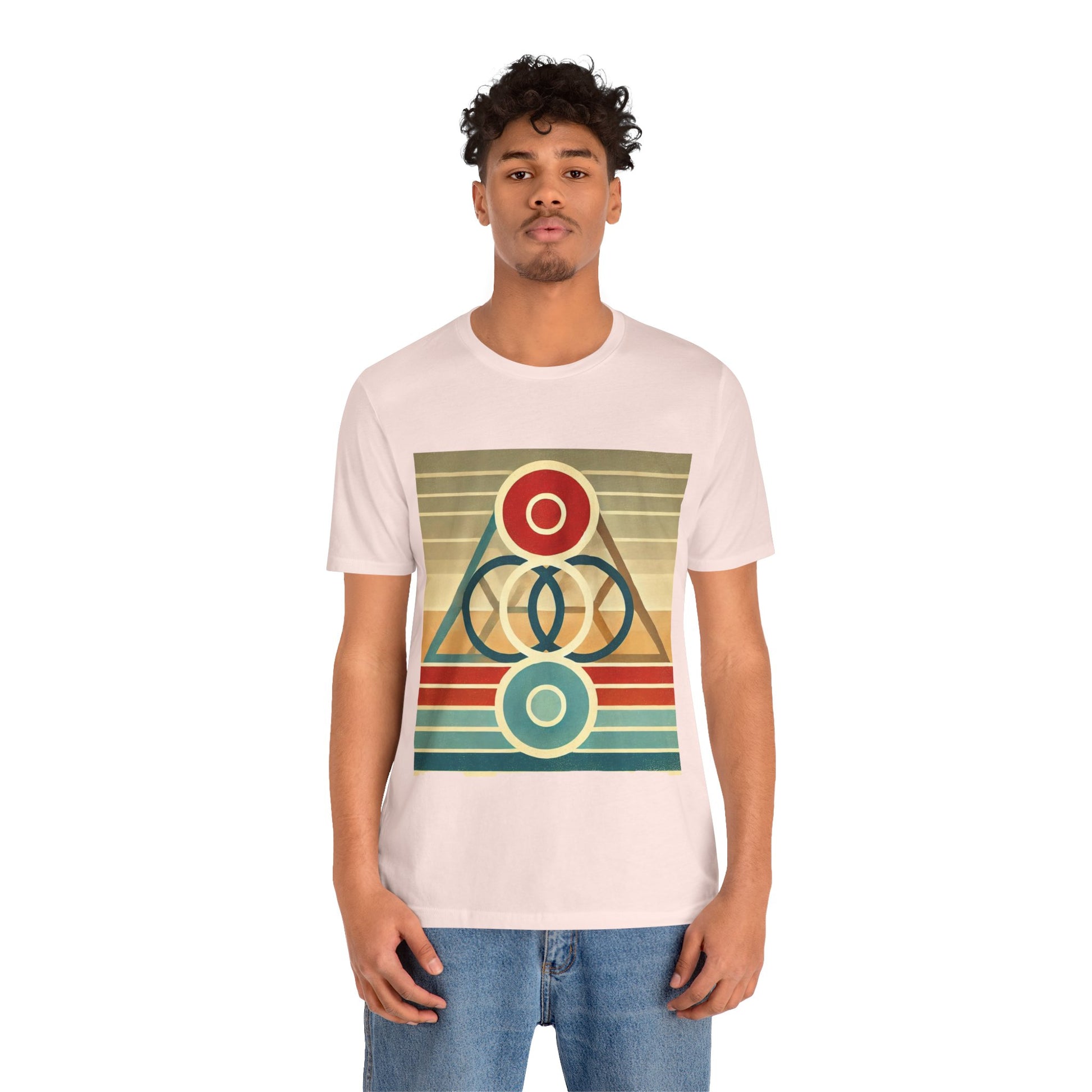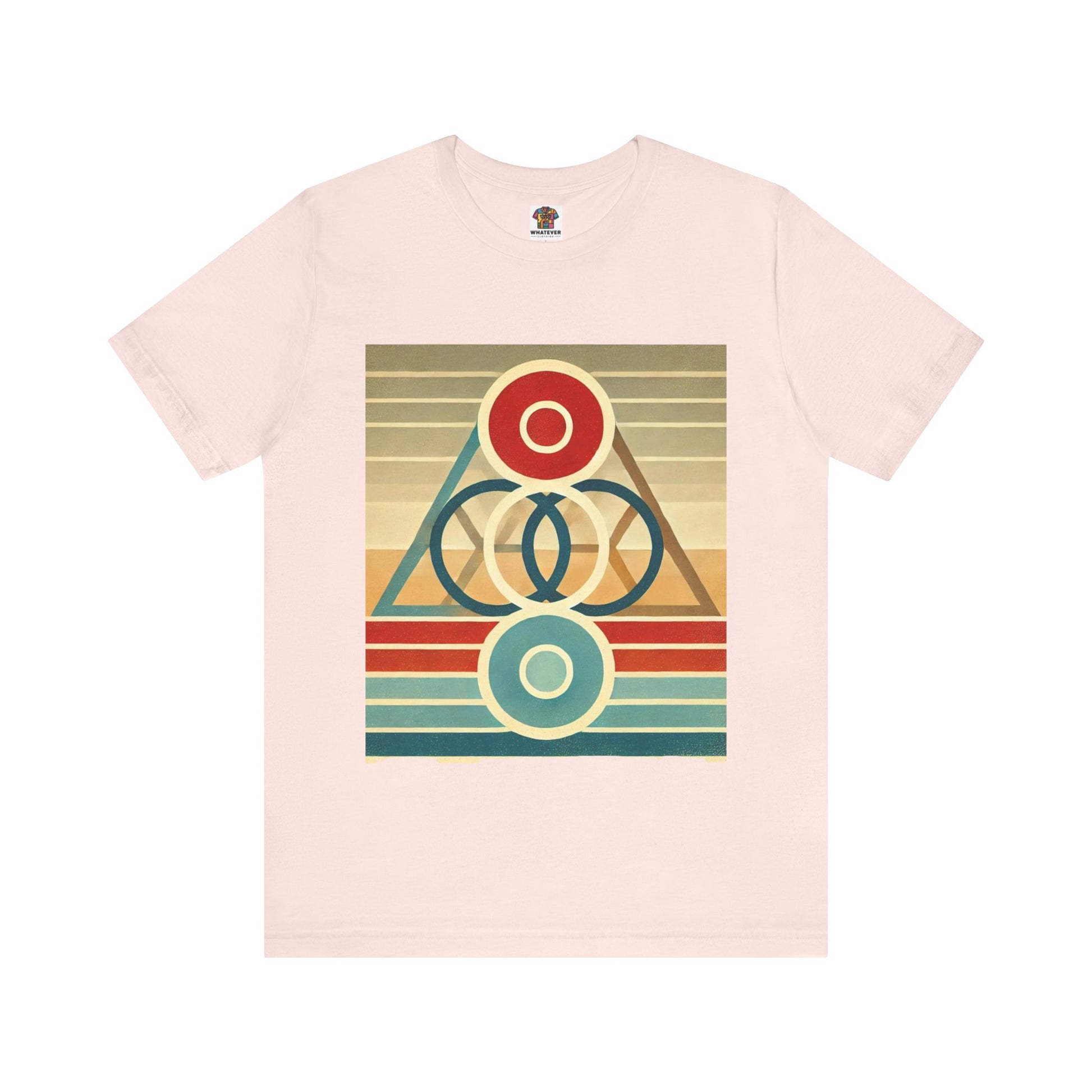 Interlocking circles and triangles with bold lines, on a gradient background in muted retro colors with a grainy, vintage look.