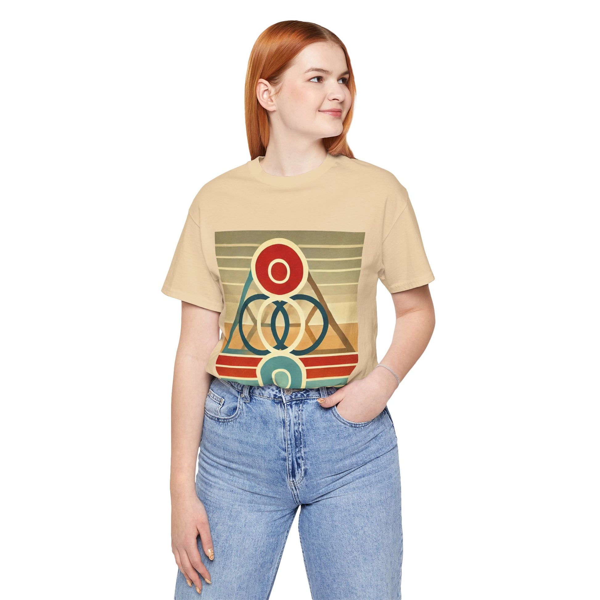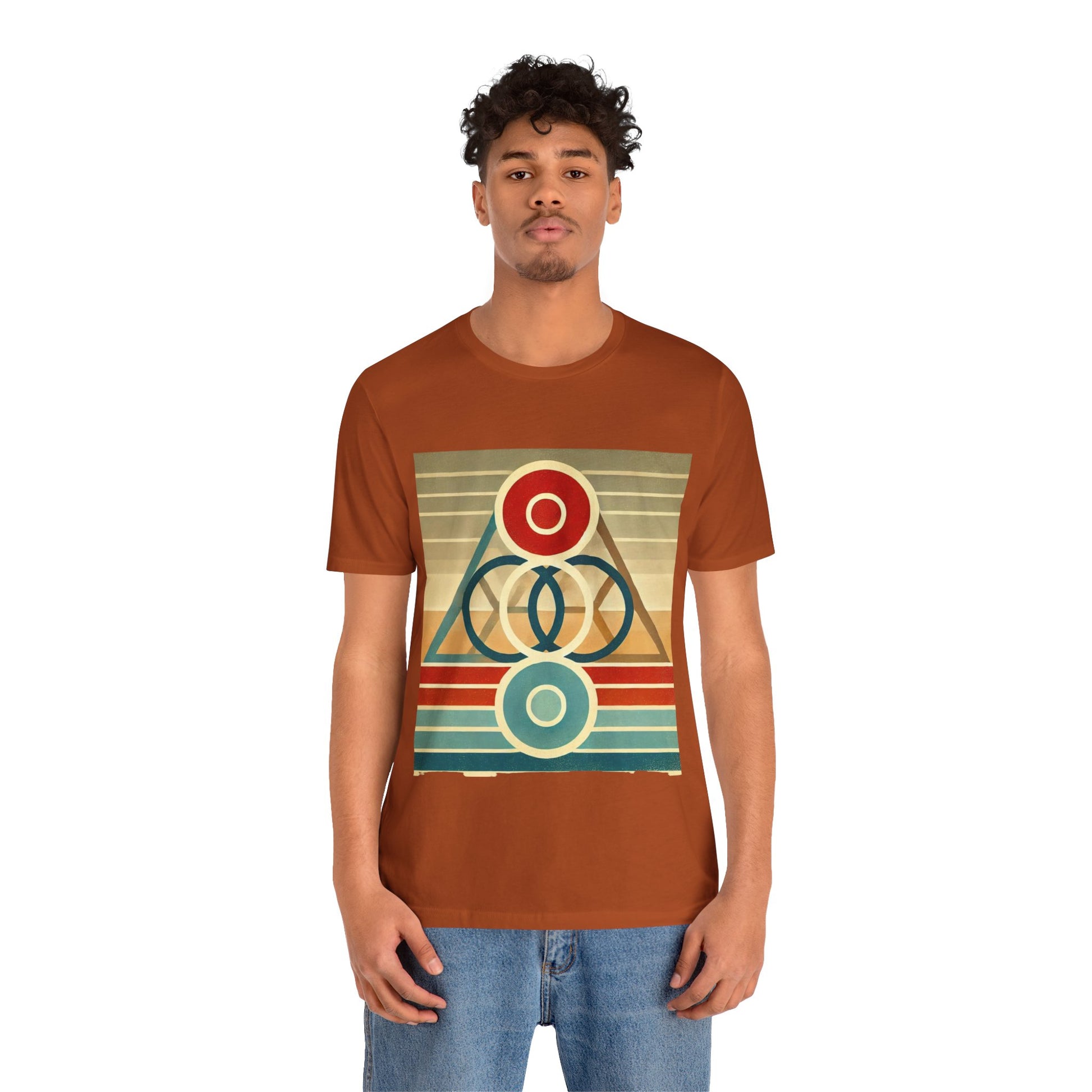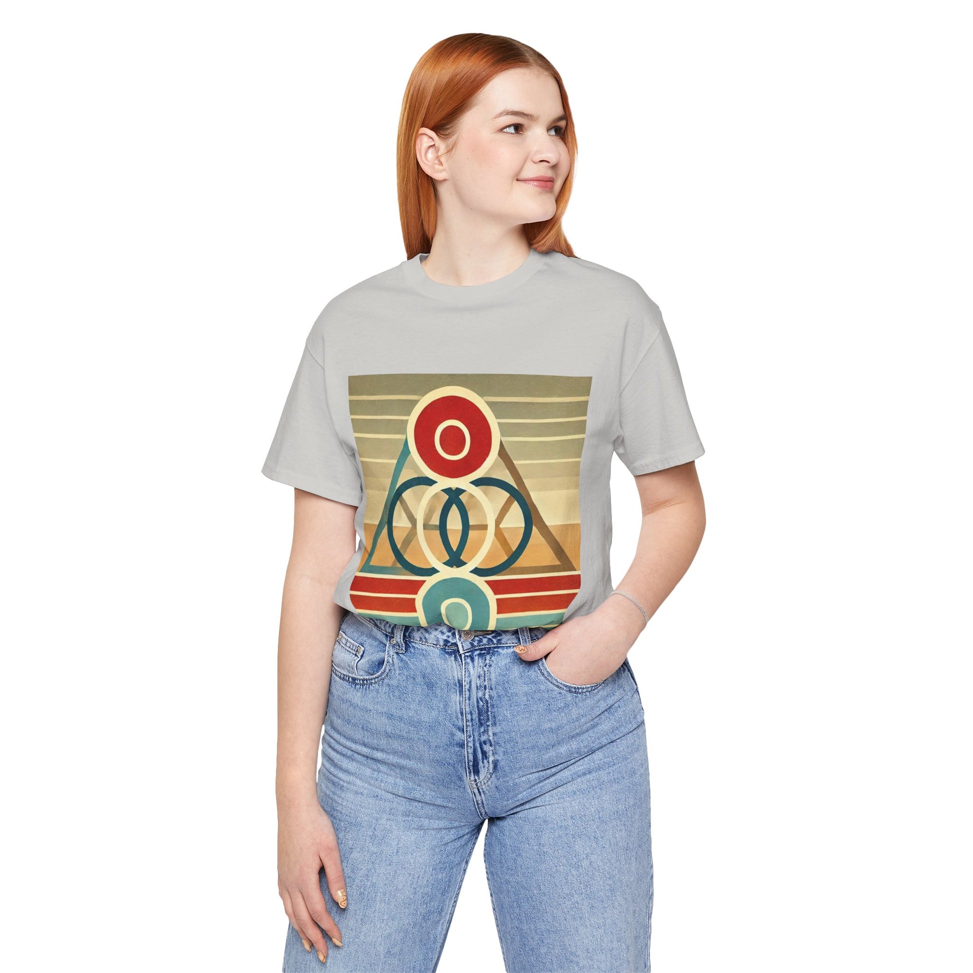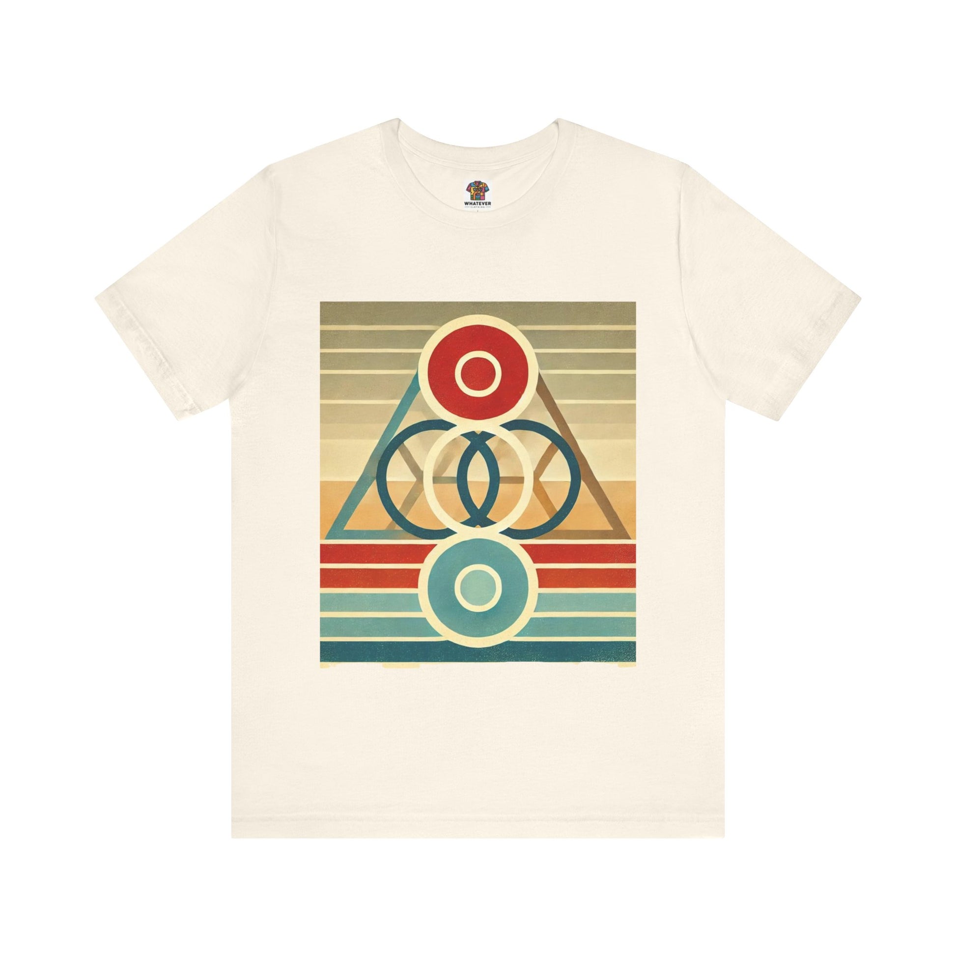 Interlocking circles and triangles with bold lines, on a gradient background in muted retro colors with a grainy, vintage look.