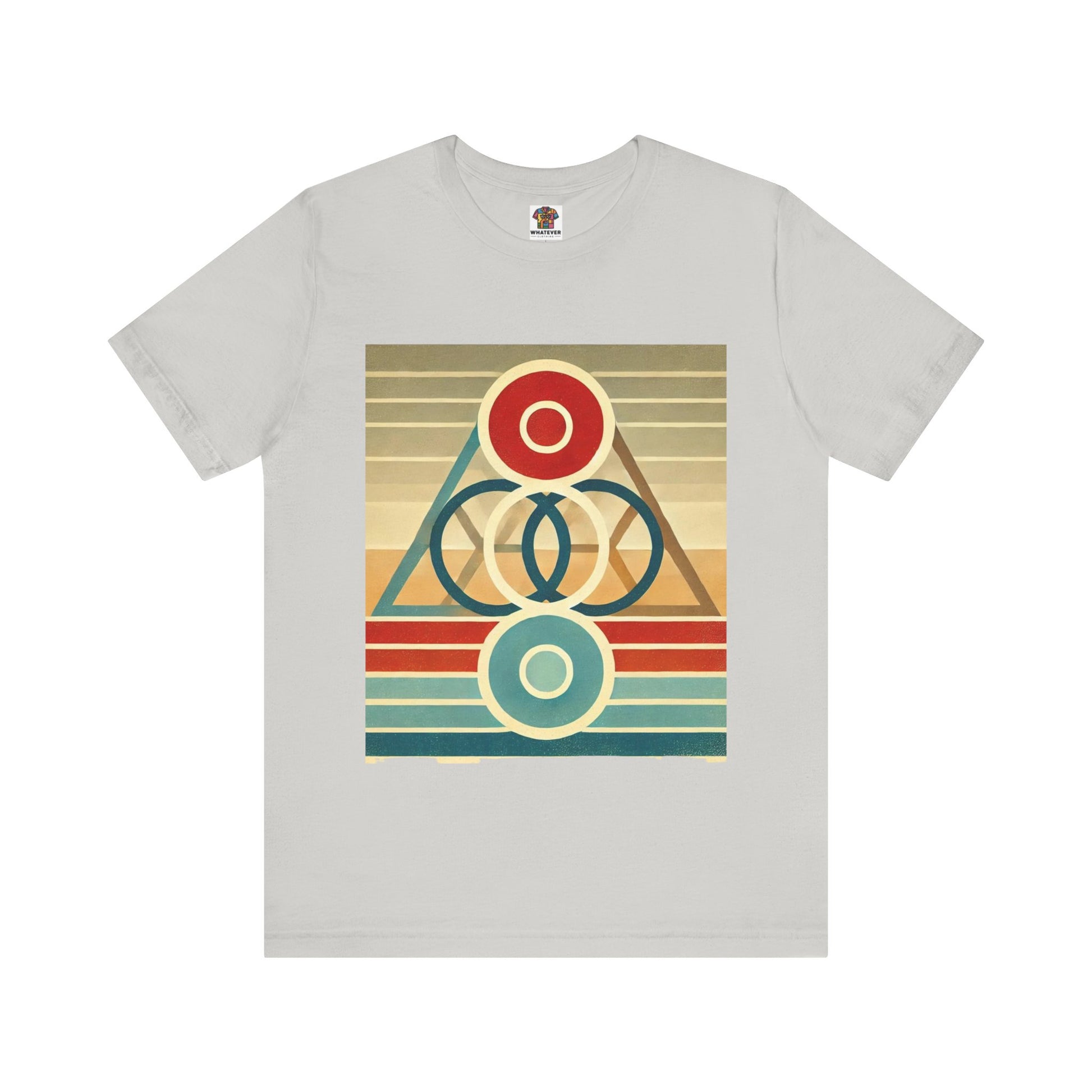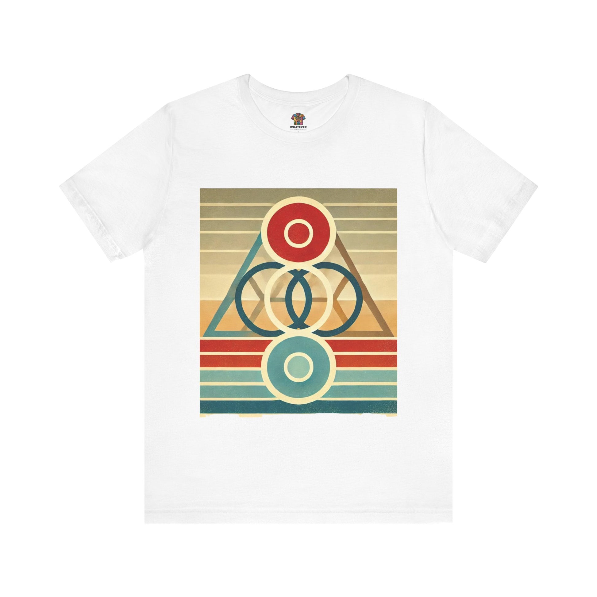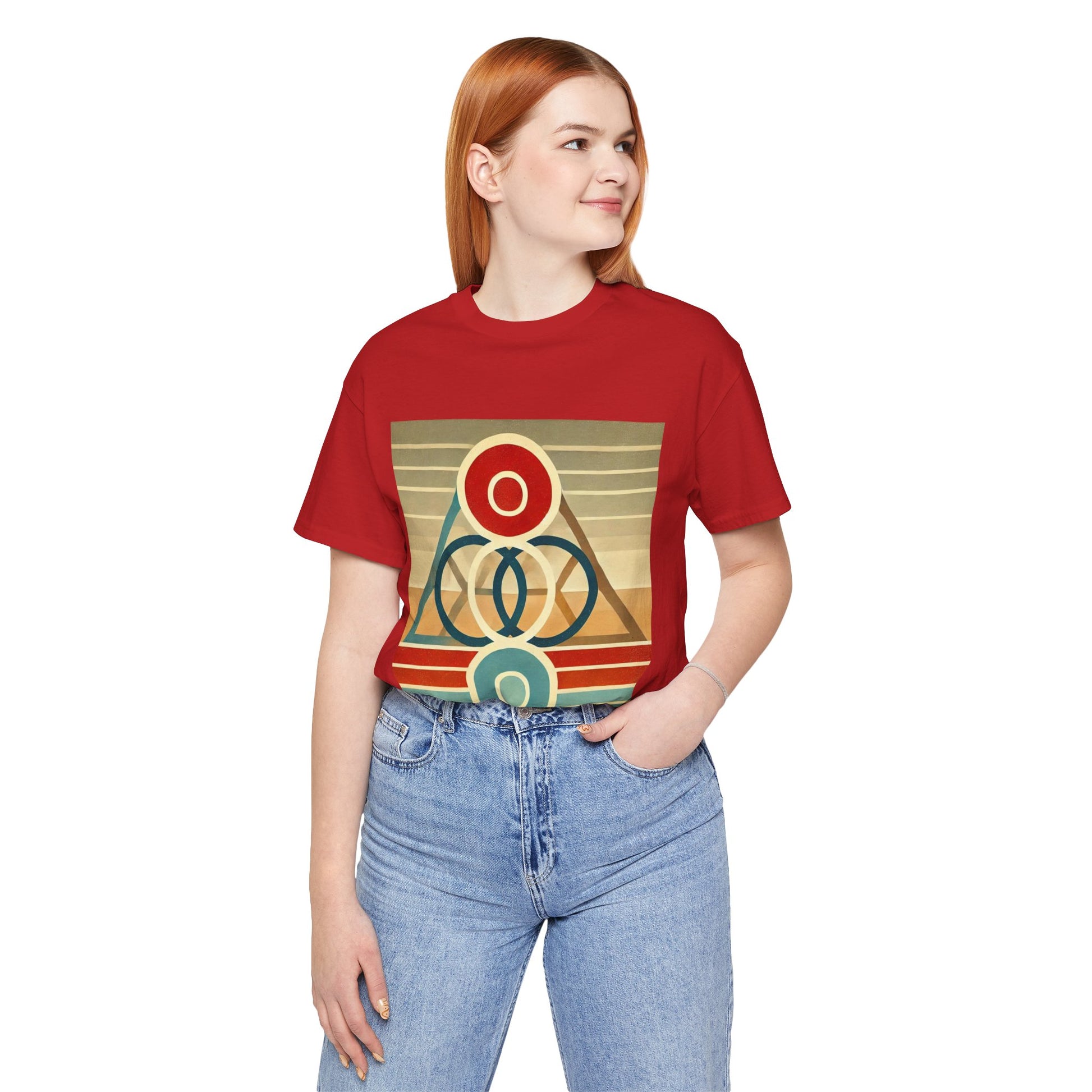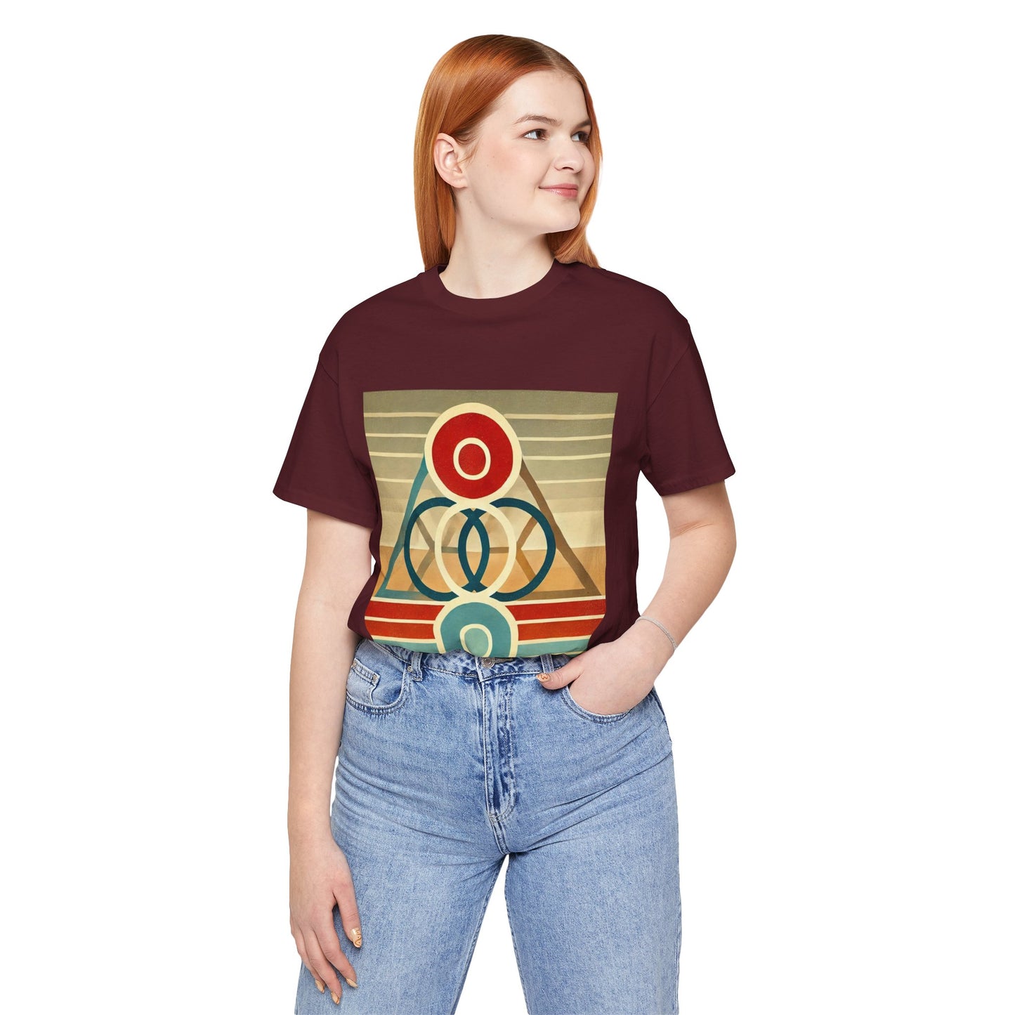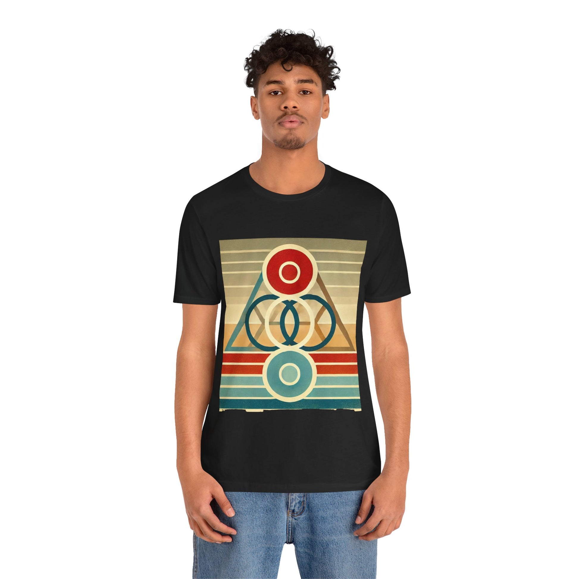 Interlocking circles and triangles with bold lines, on a gradient background in muted retro colors with a grainy, vintage look.