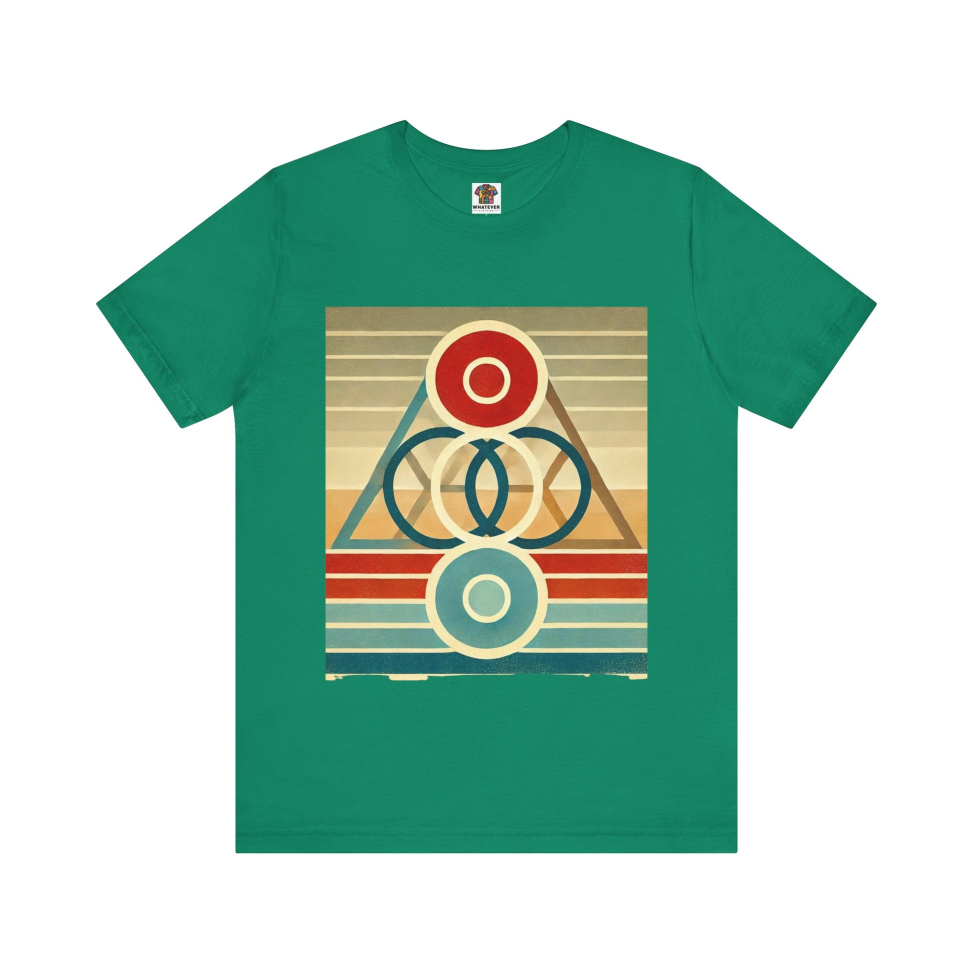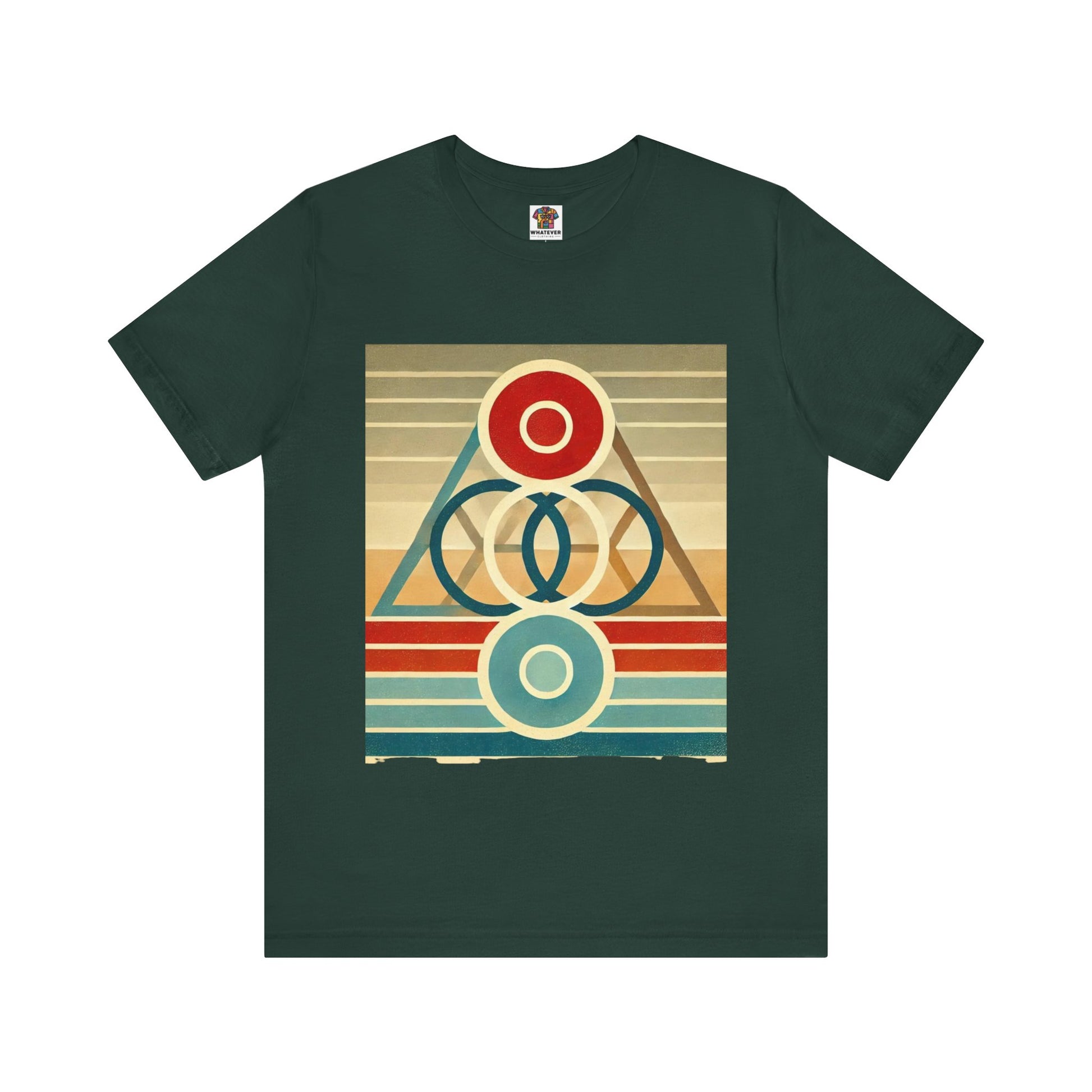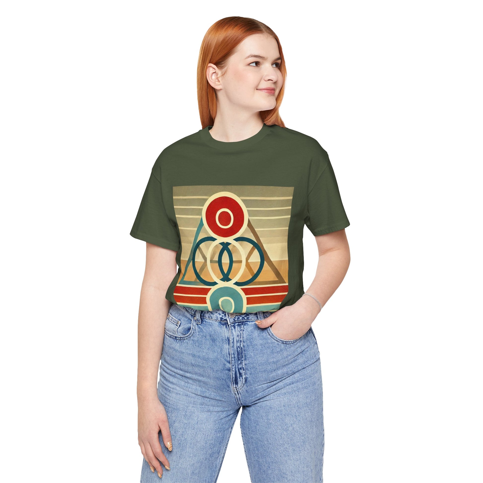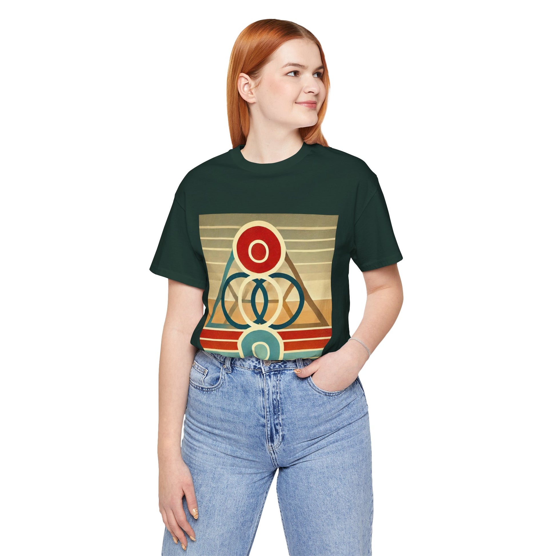 Interlocking circles and triangles with bold lines, on a gradient background in muted retro colors with a grainy, vintage look.