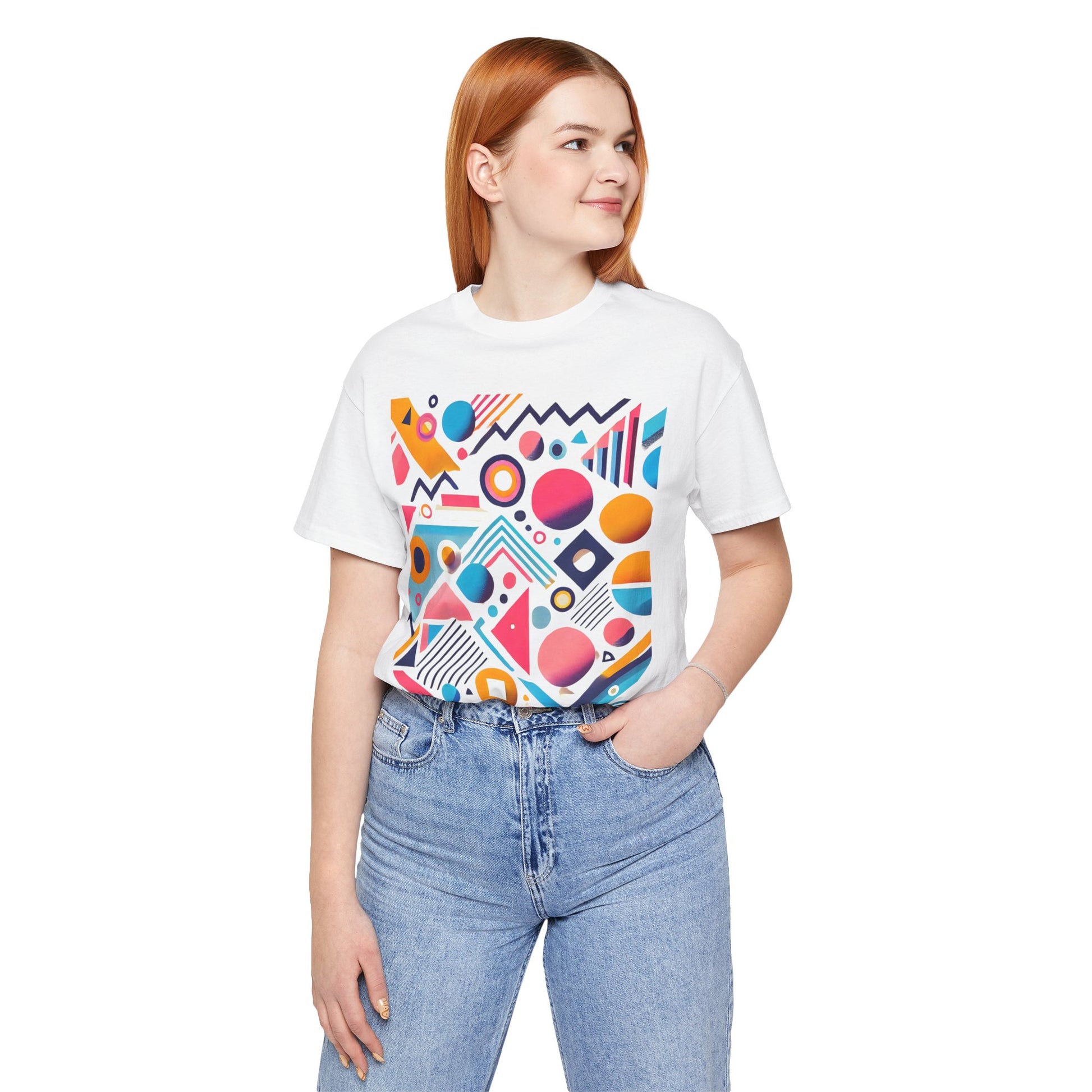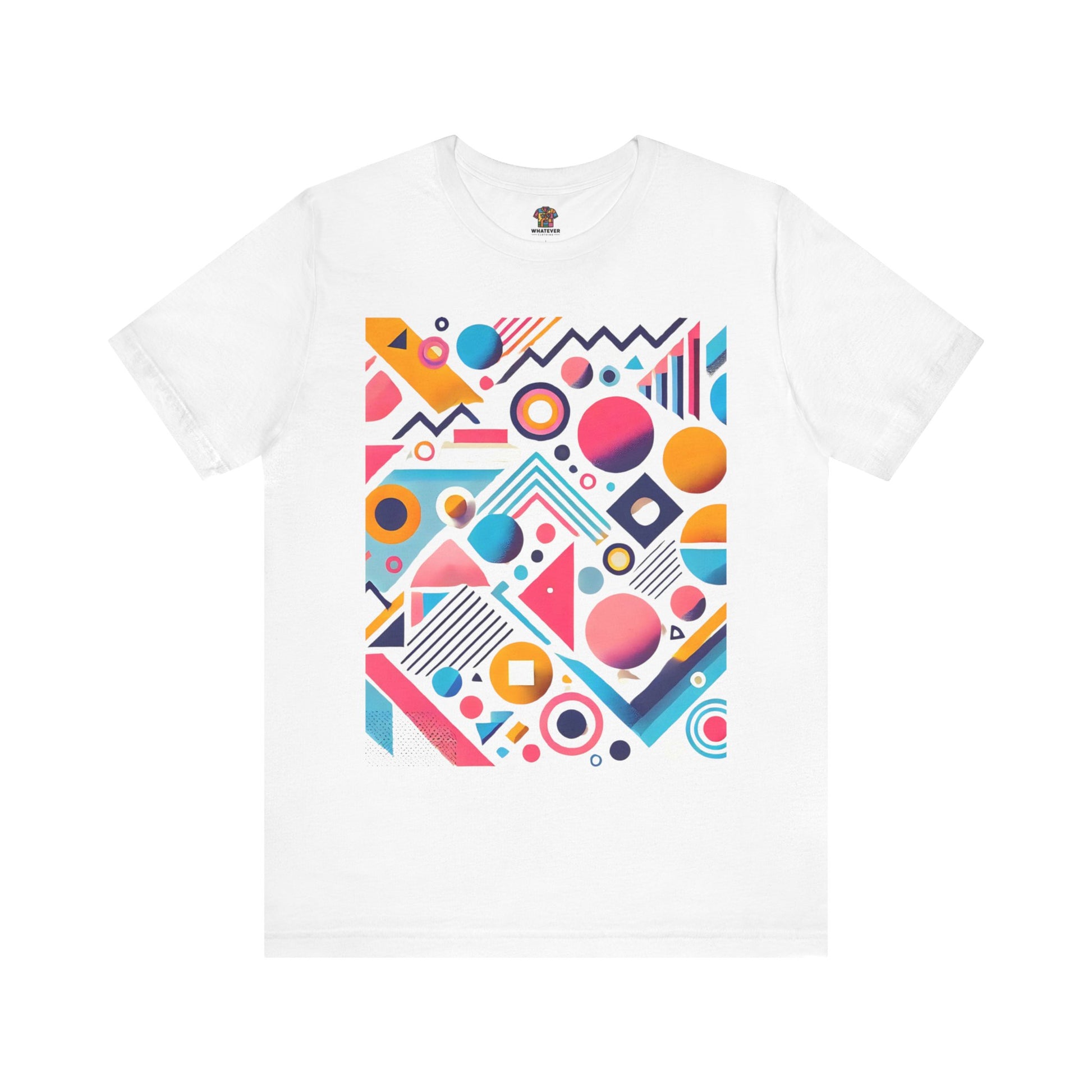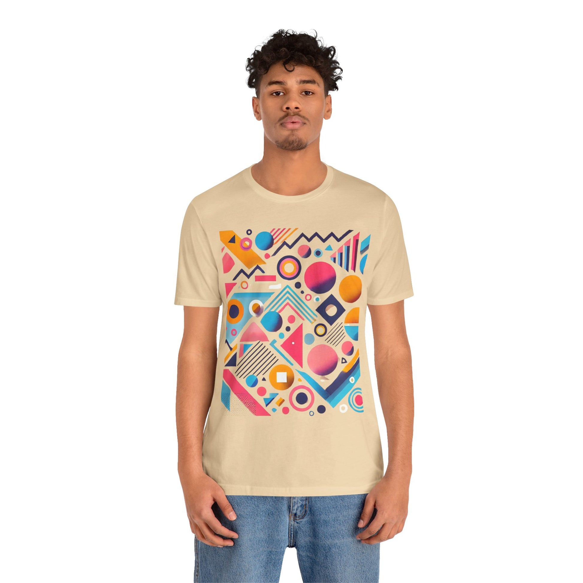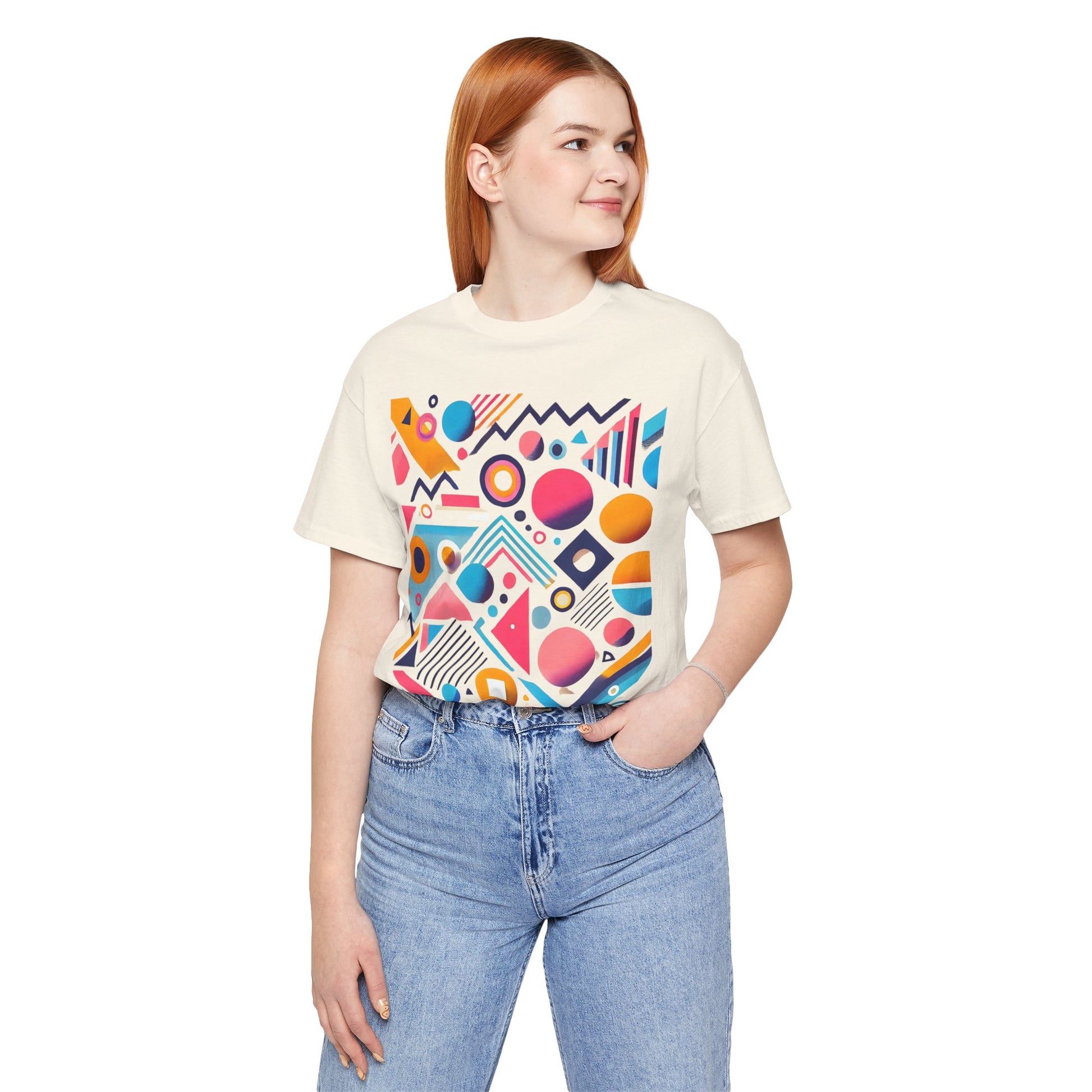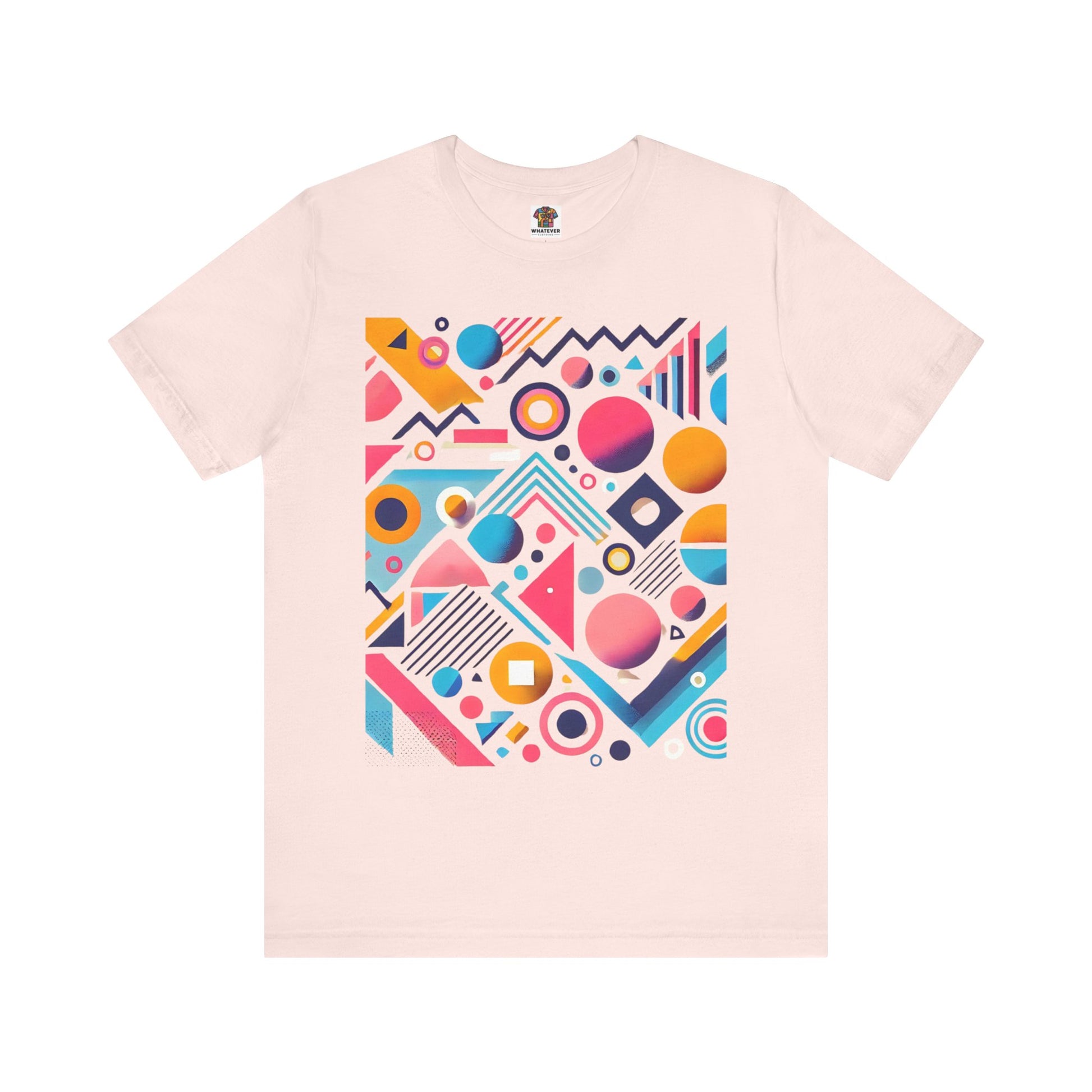 A bold geometric pattern with bright abstract shapes like circles, triangles, and zigzags in vibrant colors against a pastel background.