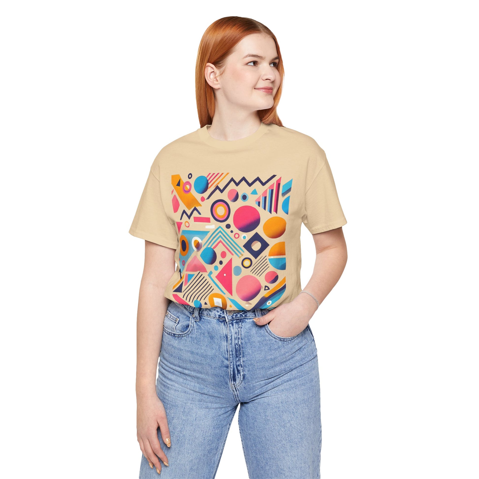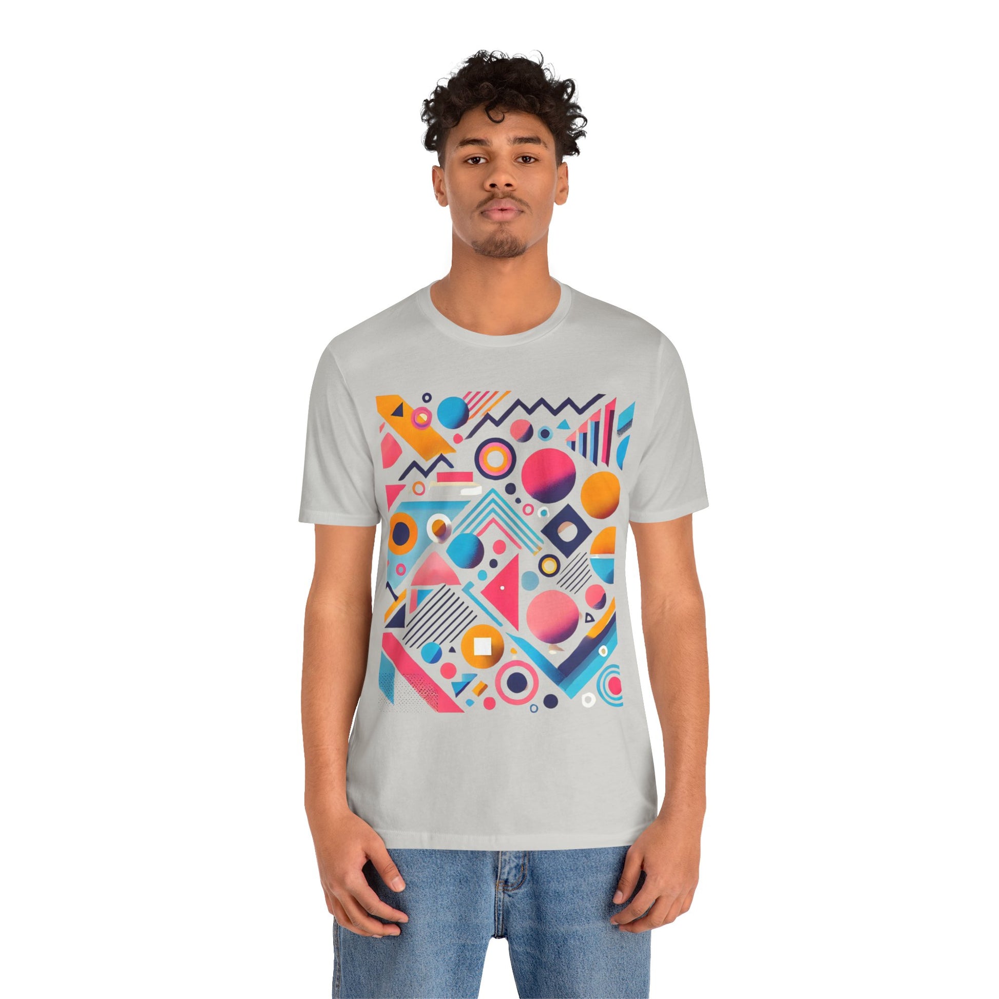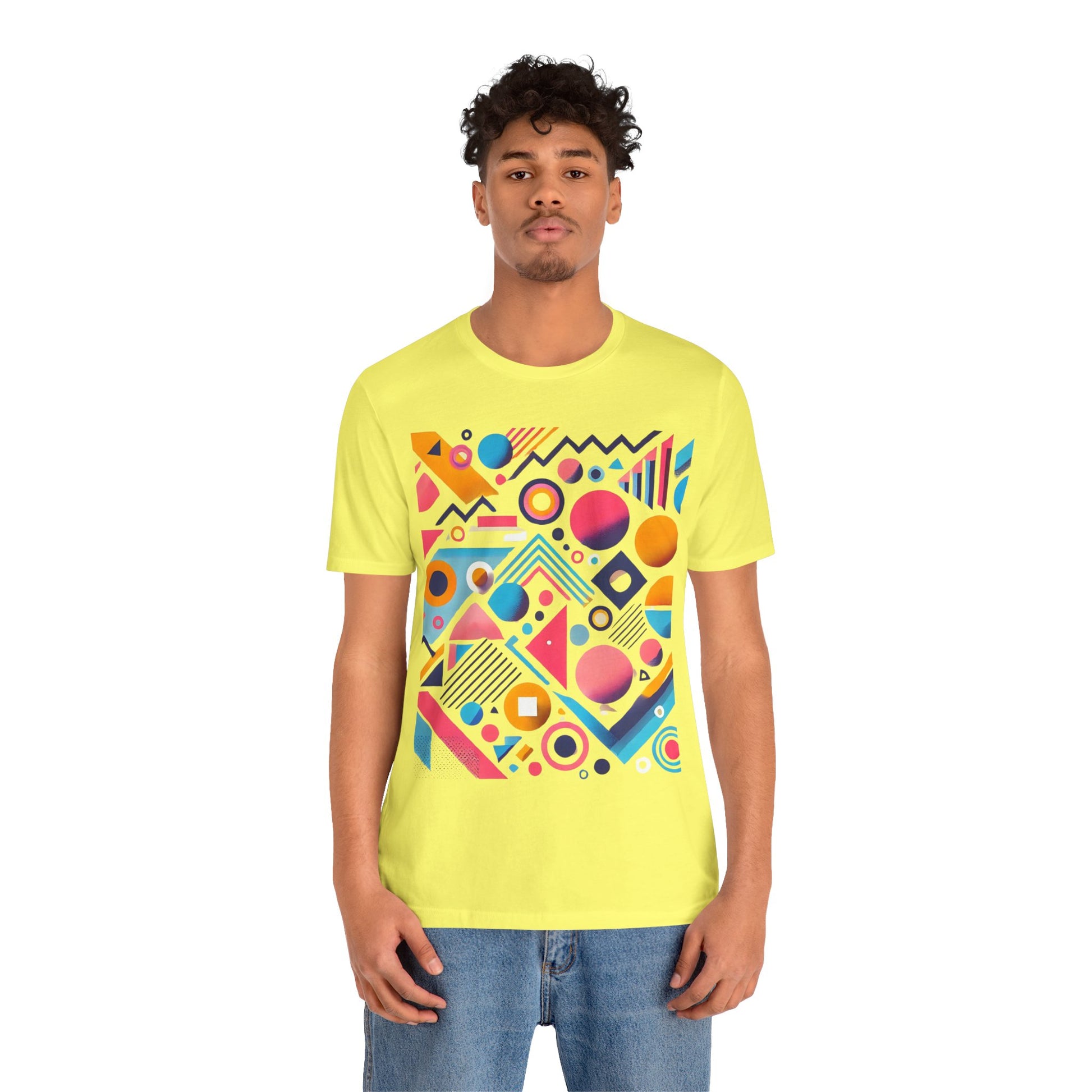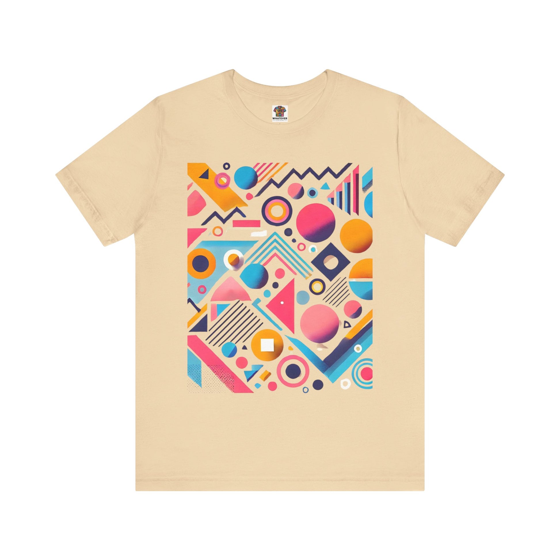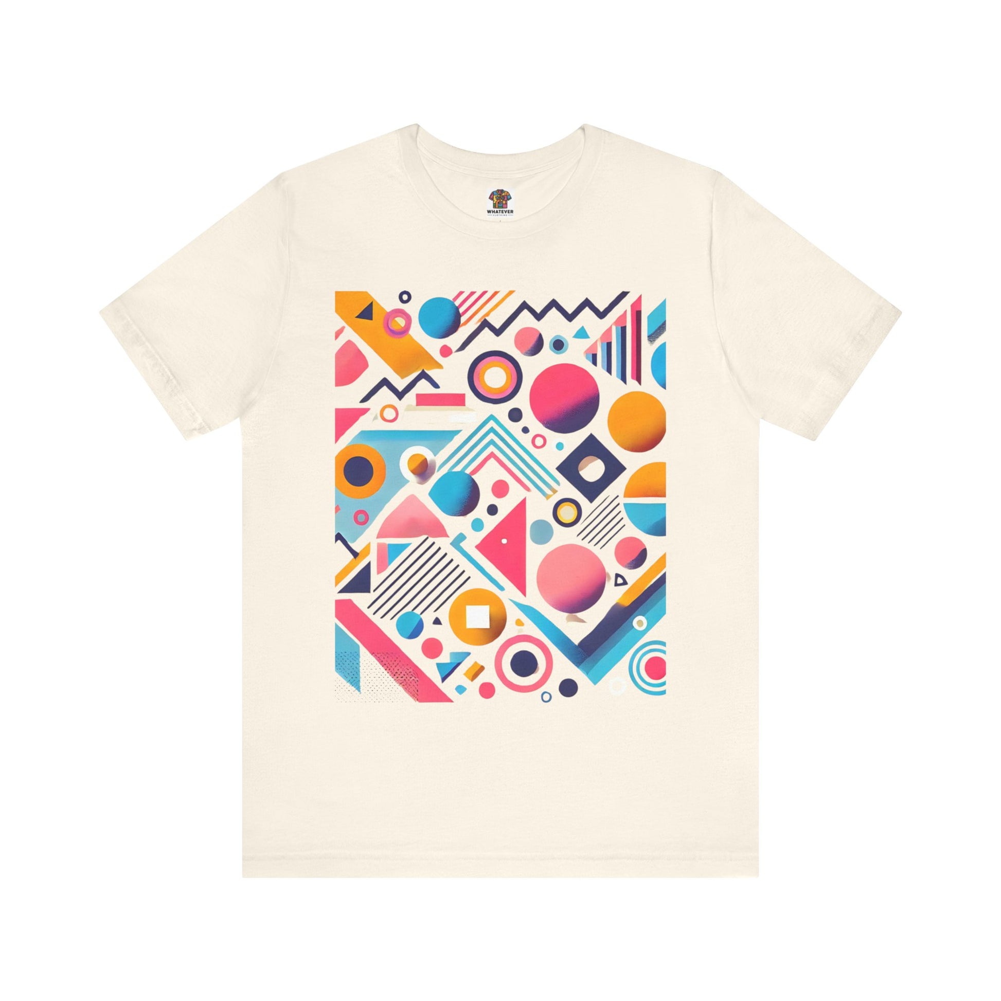 A bold geometric pattern with bright abstract shapes like circles, triangles, and zigzags in vibrant colors against a pastel background.