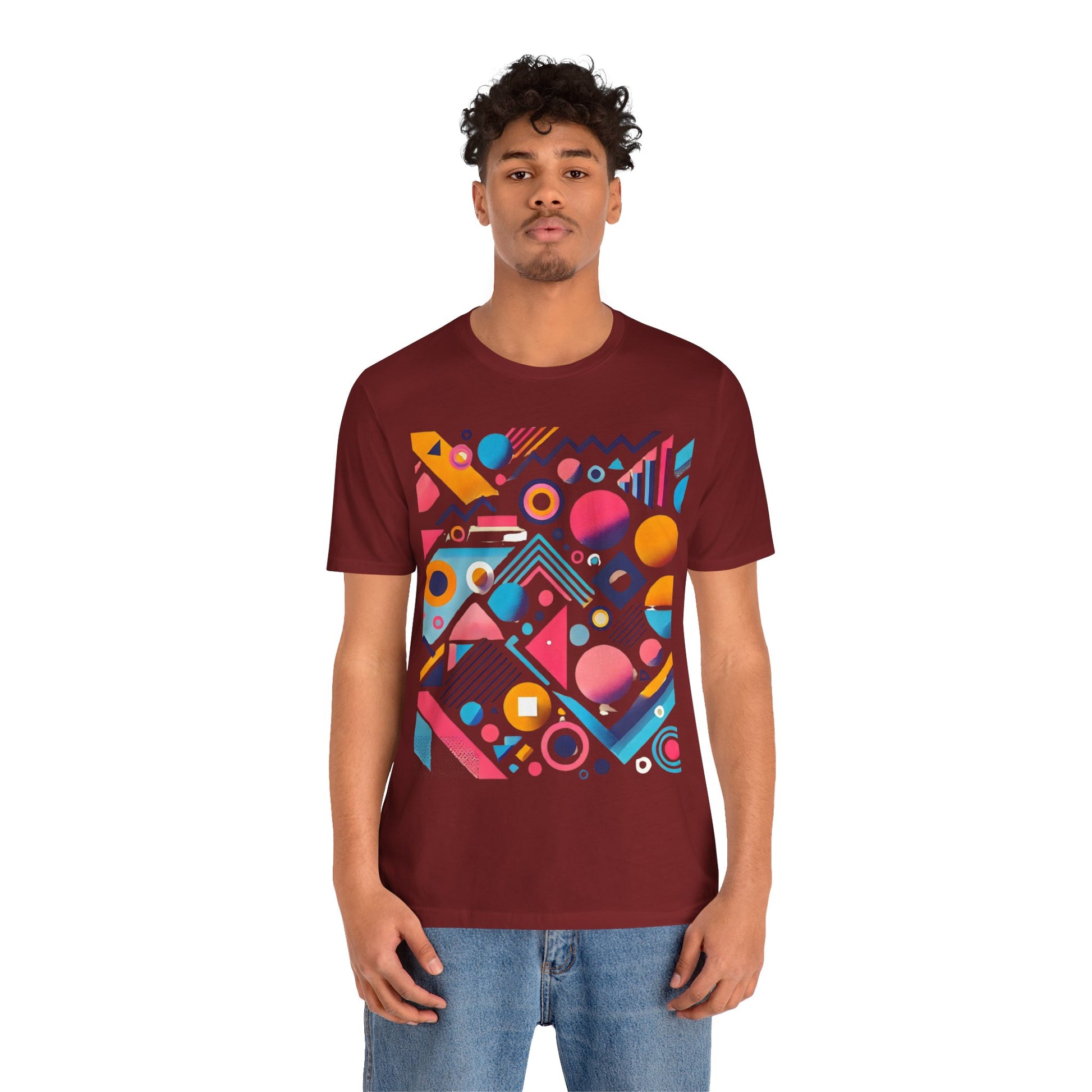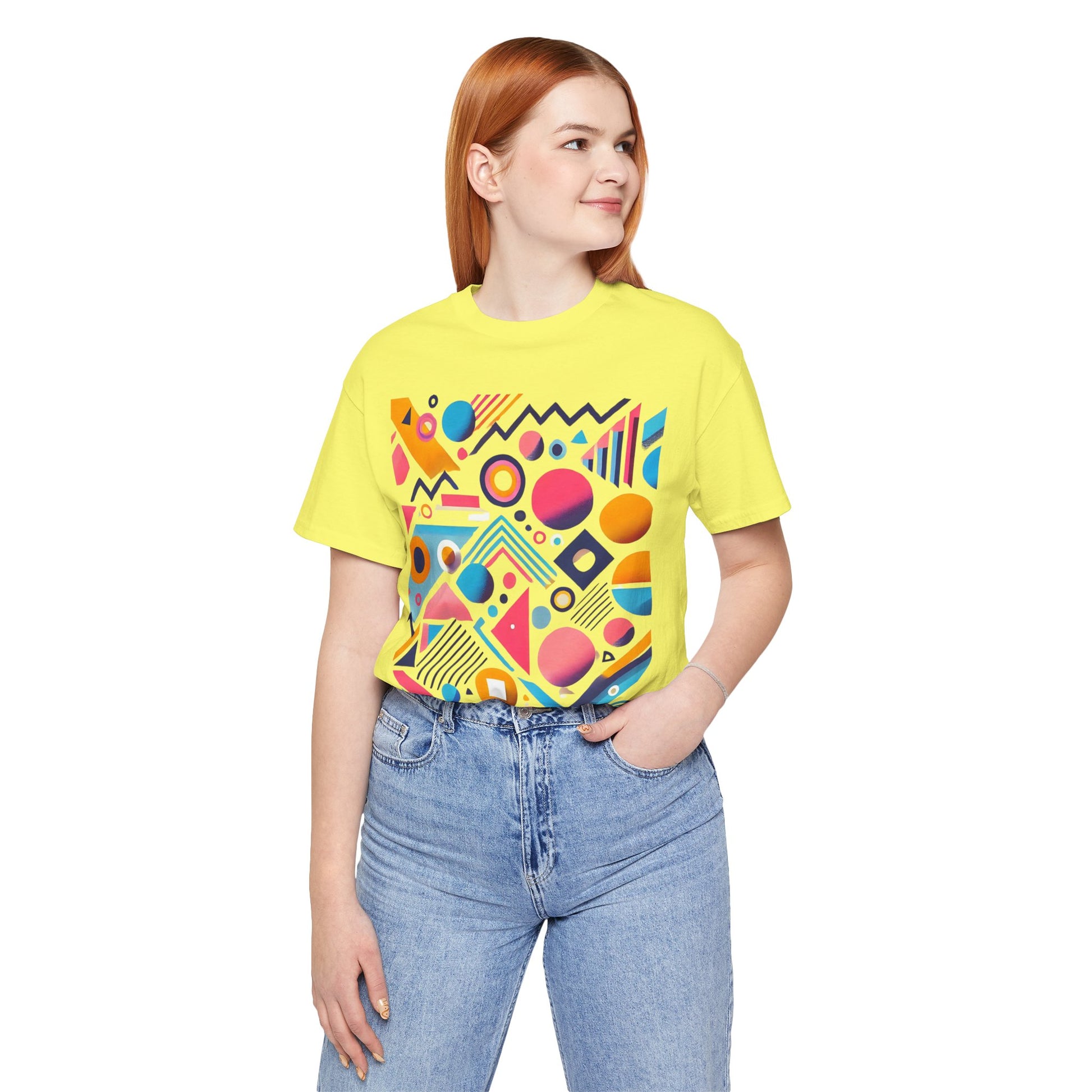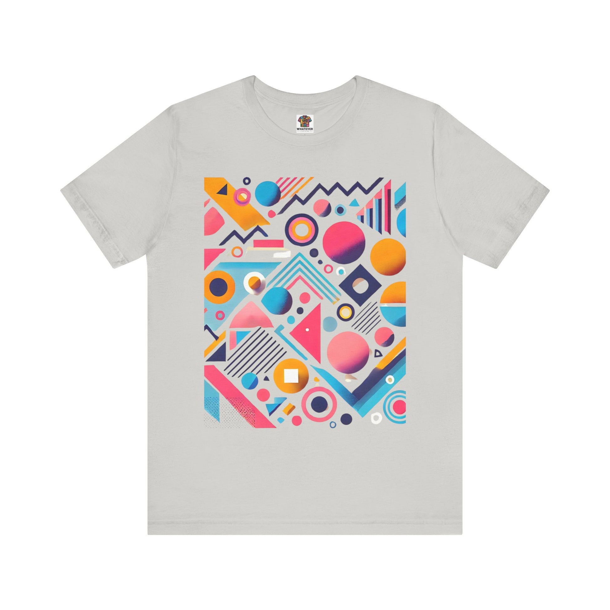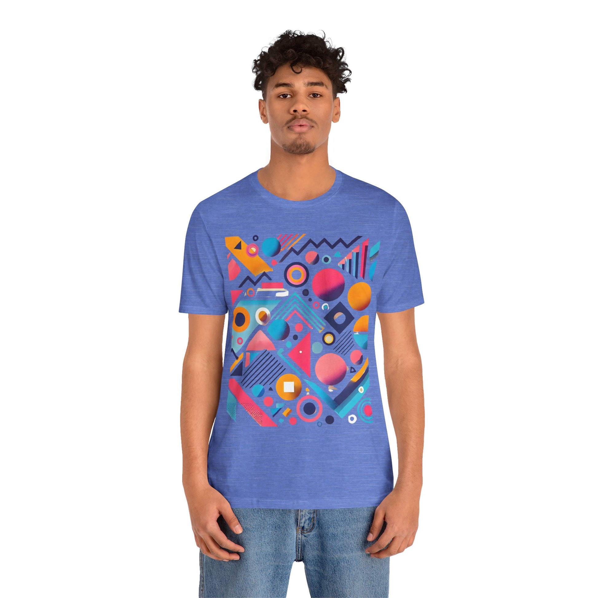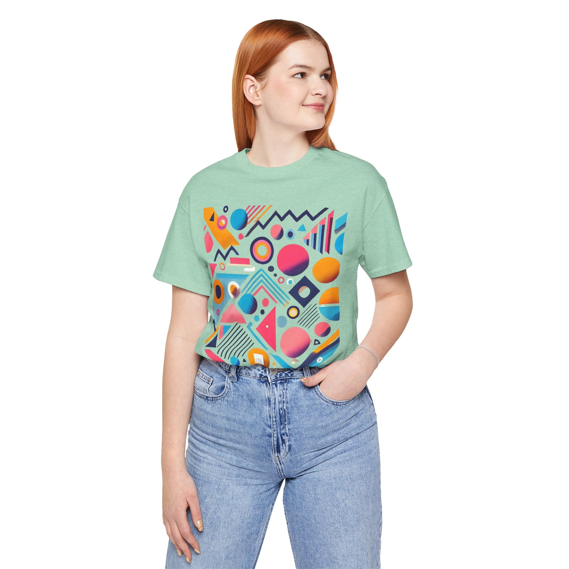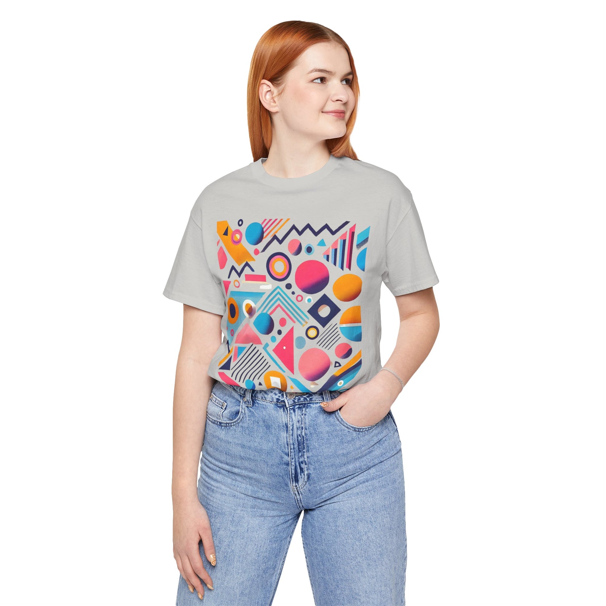 A bold geometric pattern with bright abstract shapes like circles, triangles, and zigzags in vibrant colors against a pastel background.