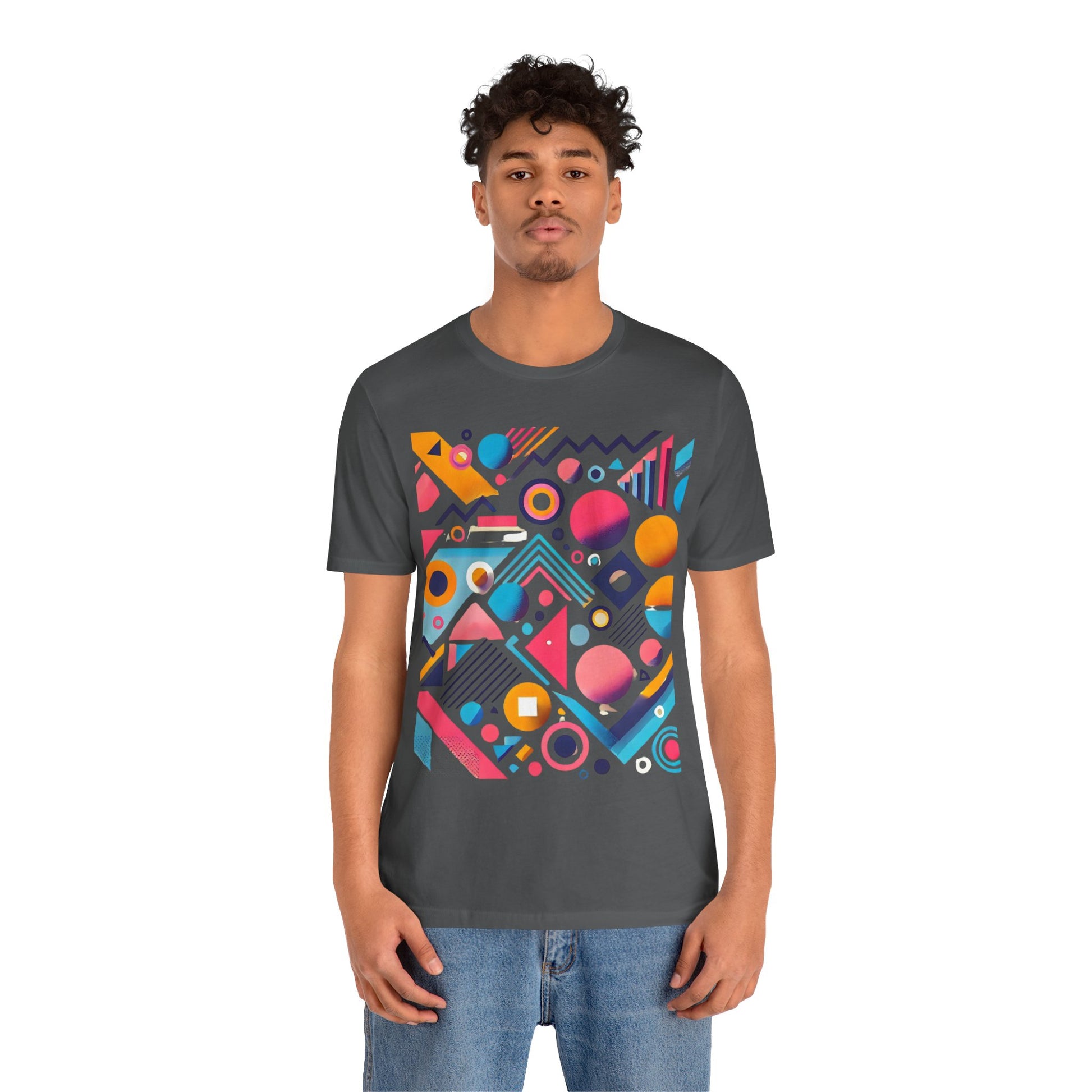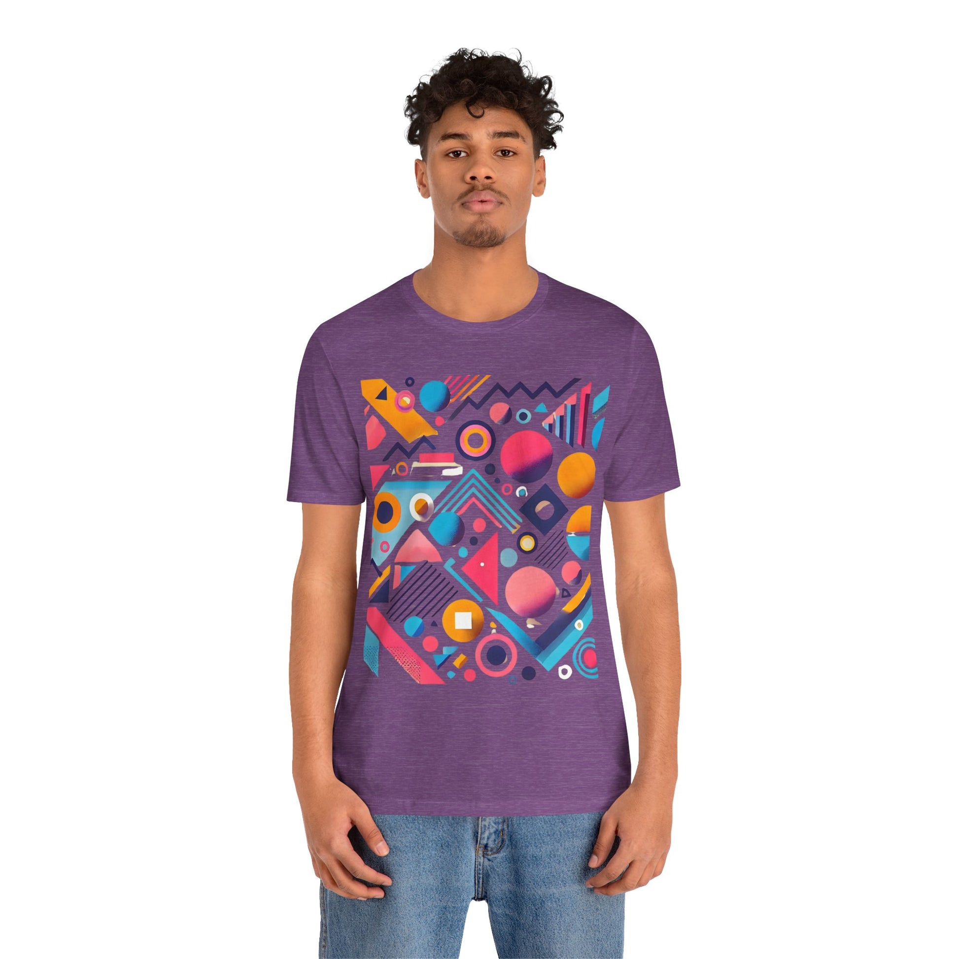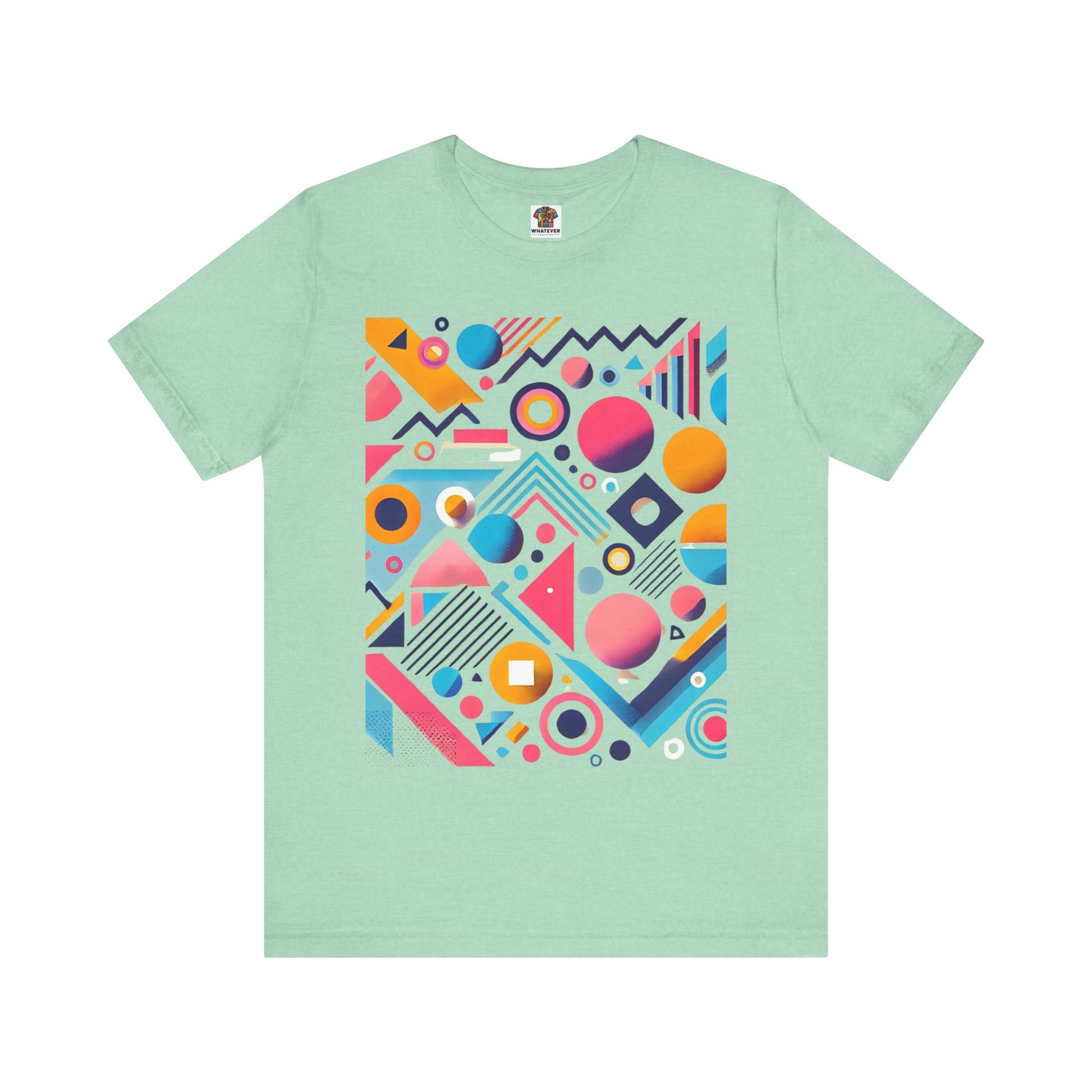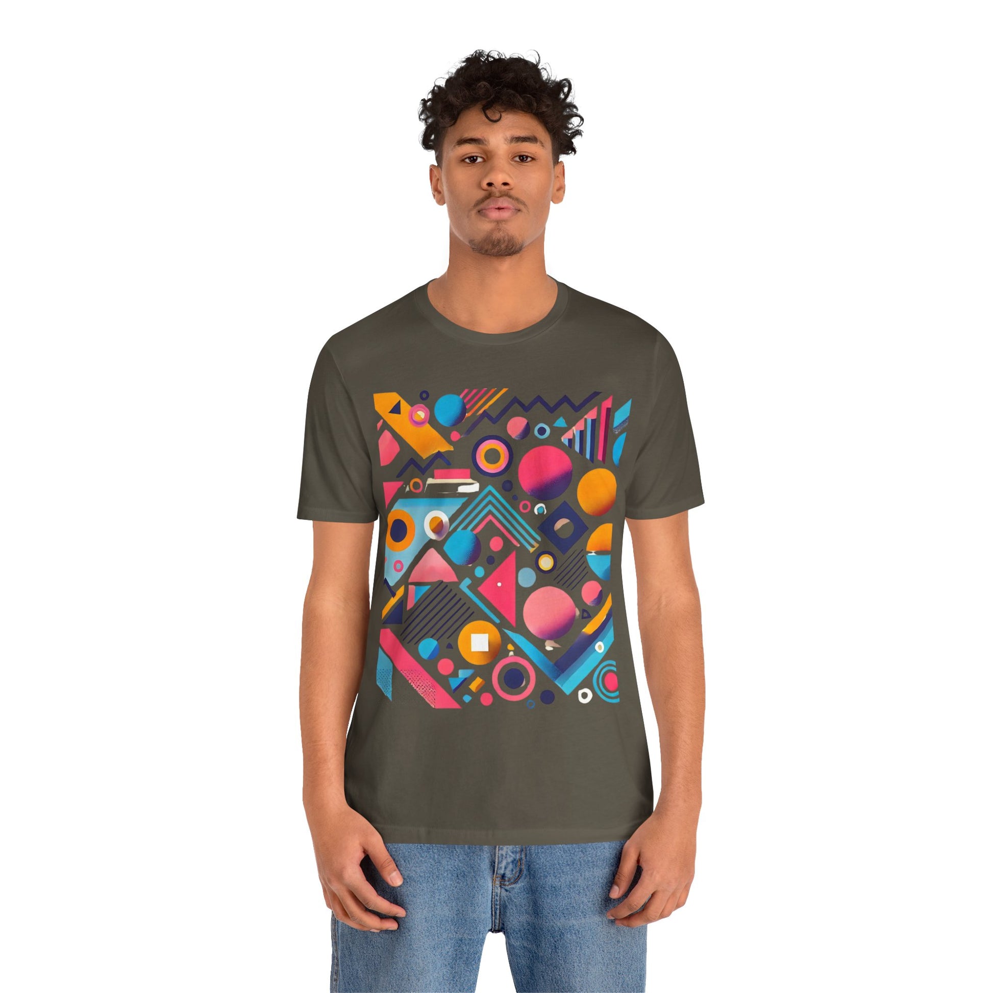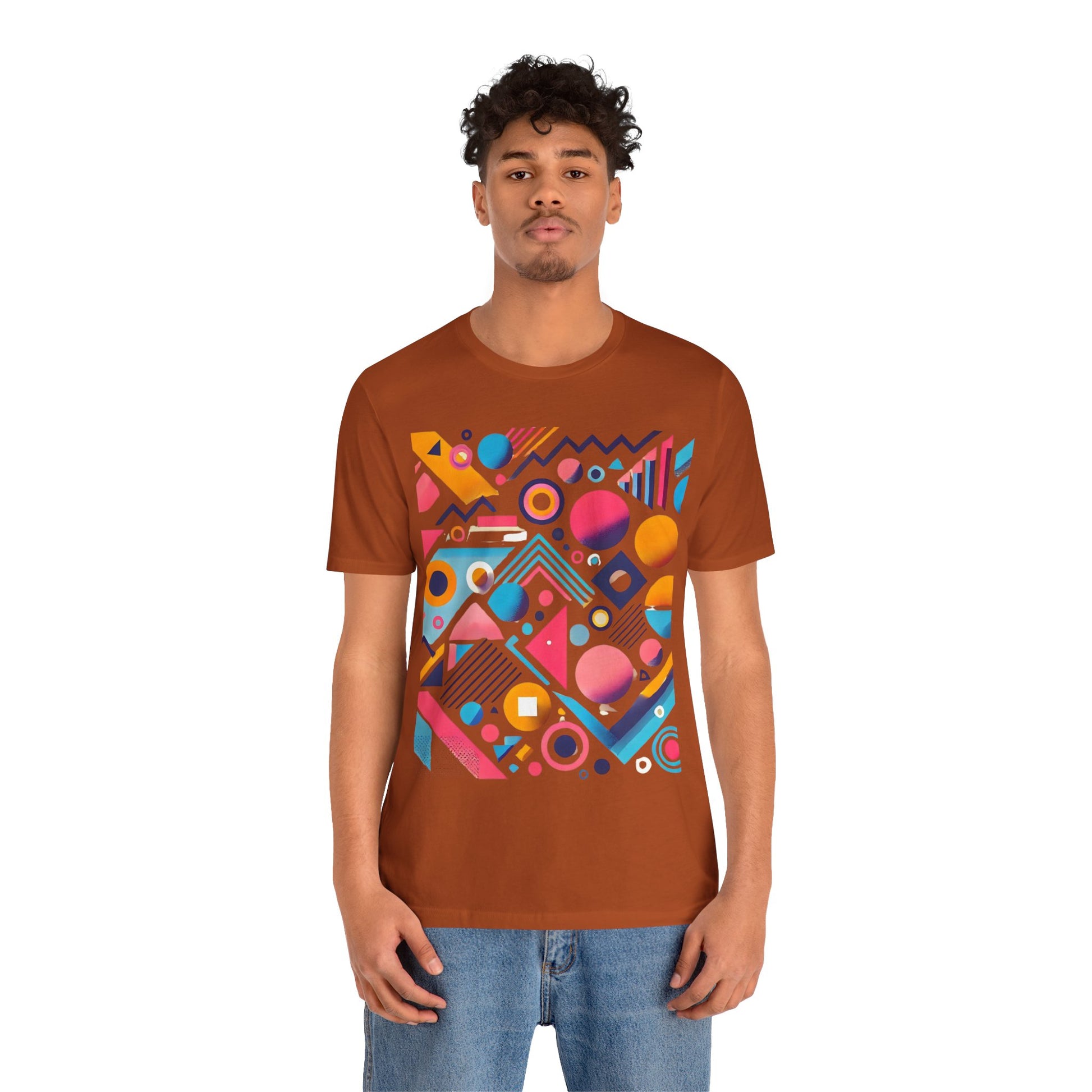 A bold geometric pattern with bright abstract shapes like circles, triangles, and zigzags in vibrant colors against a pastel background.