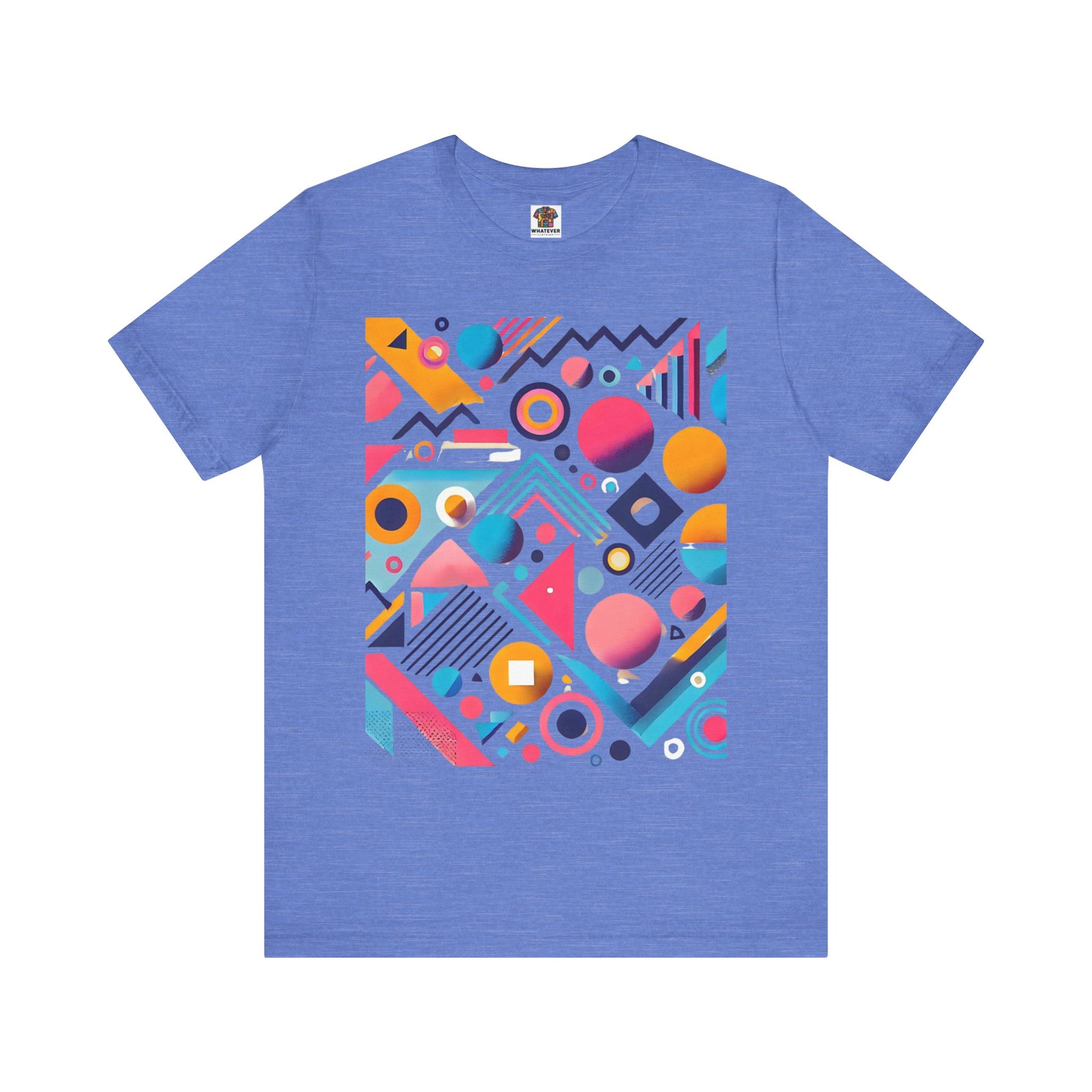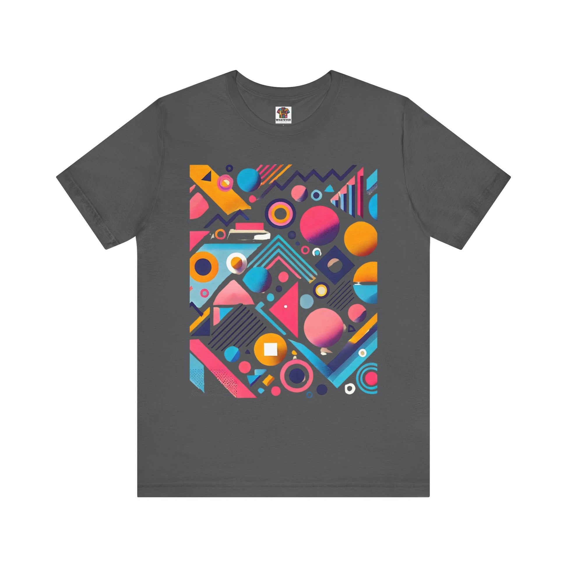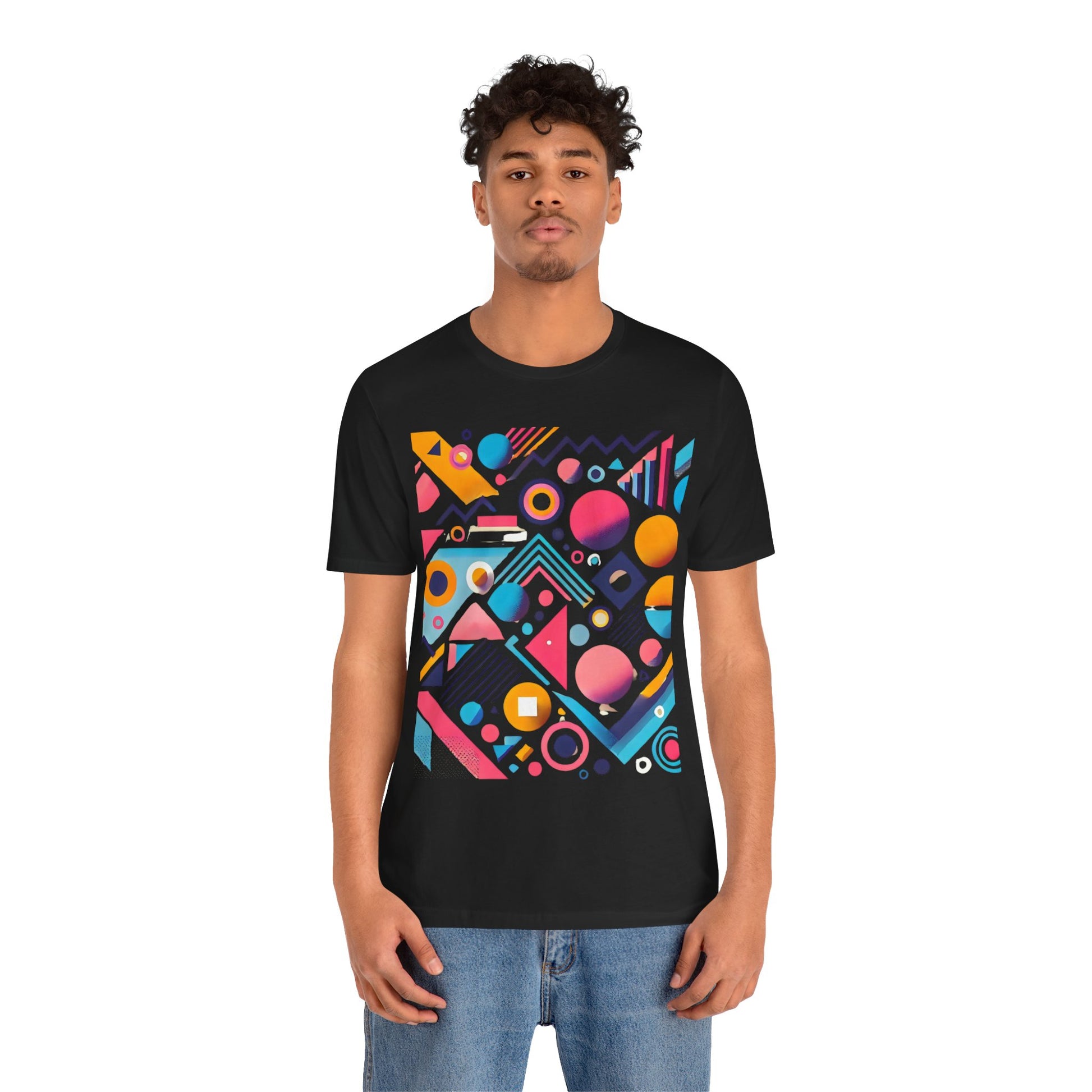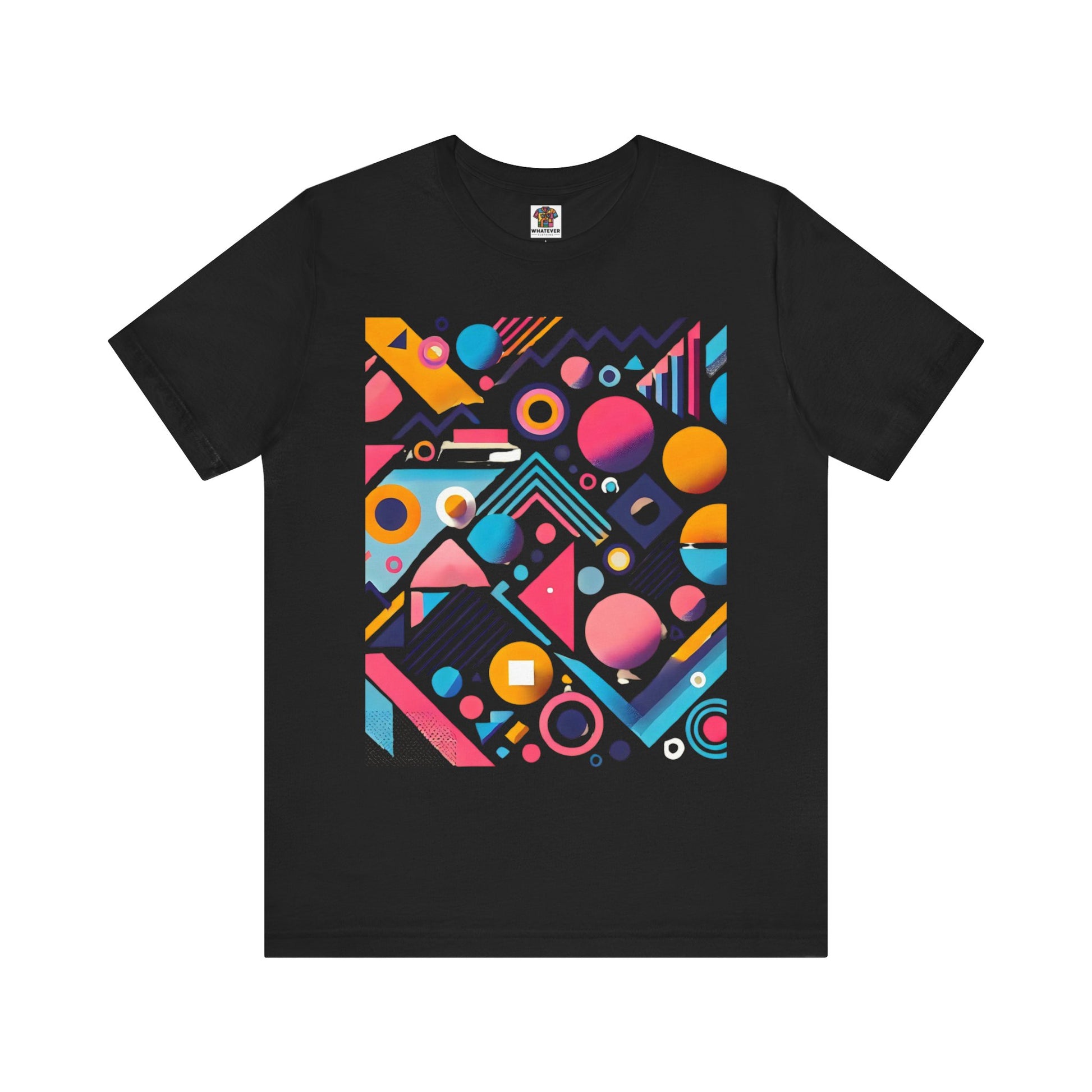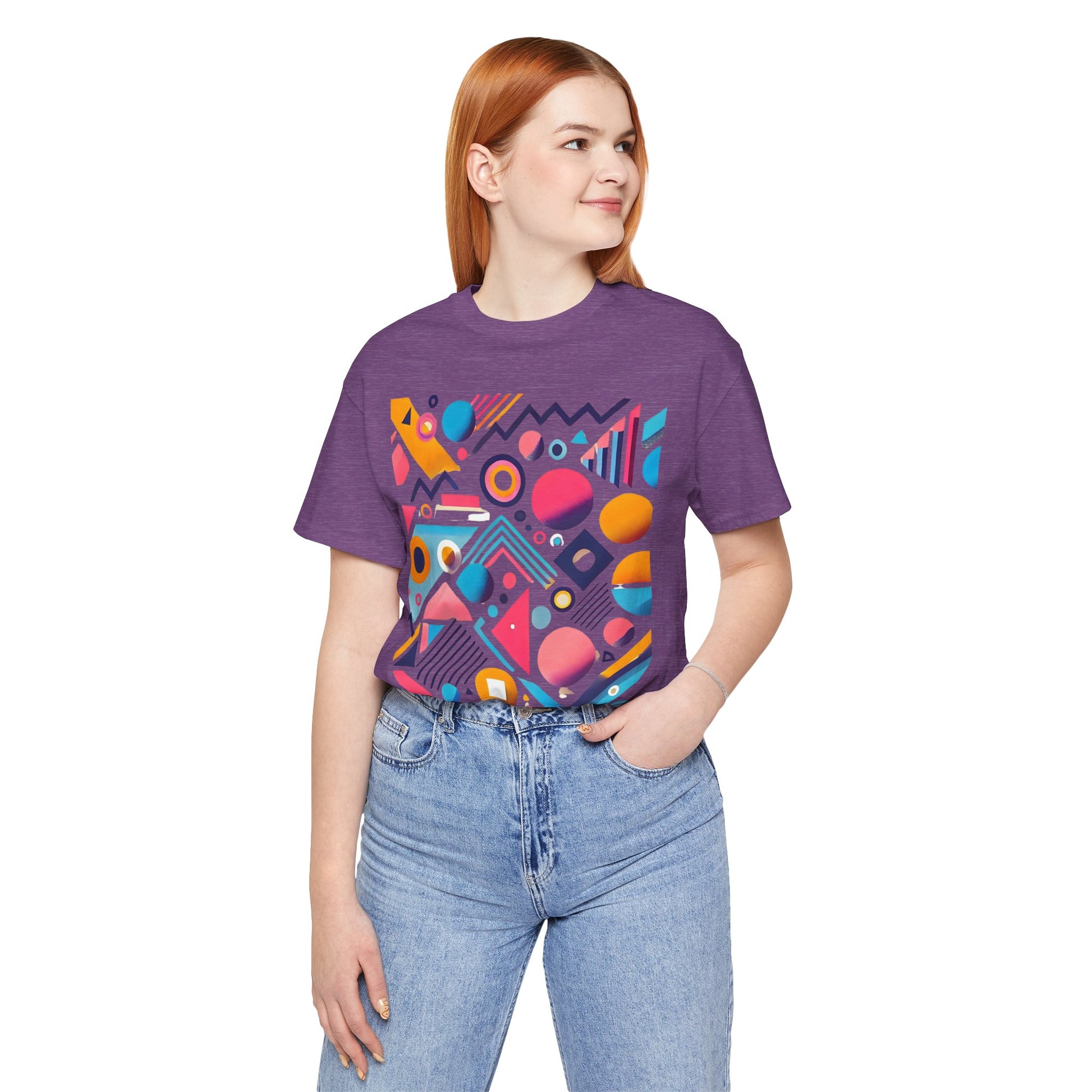 A bold geometric pattern with bright abstract shapes like circles, triangles, and zigzags in vibrant colors against a pastel background.