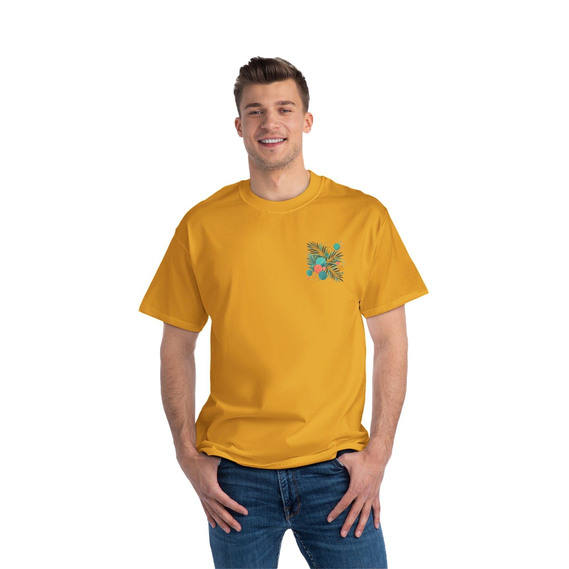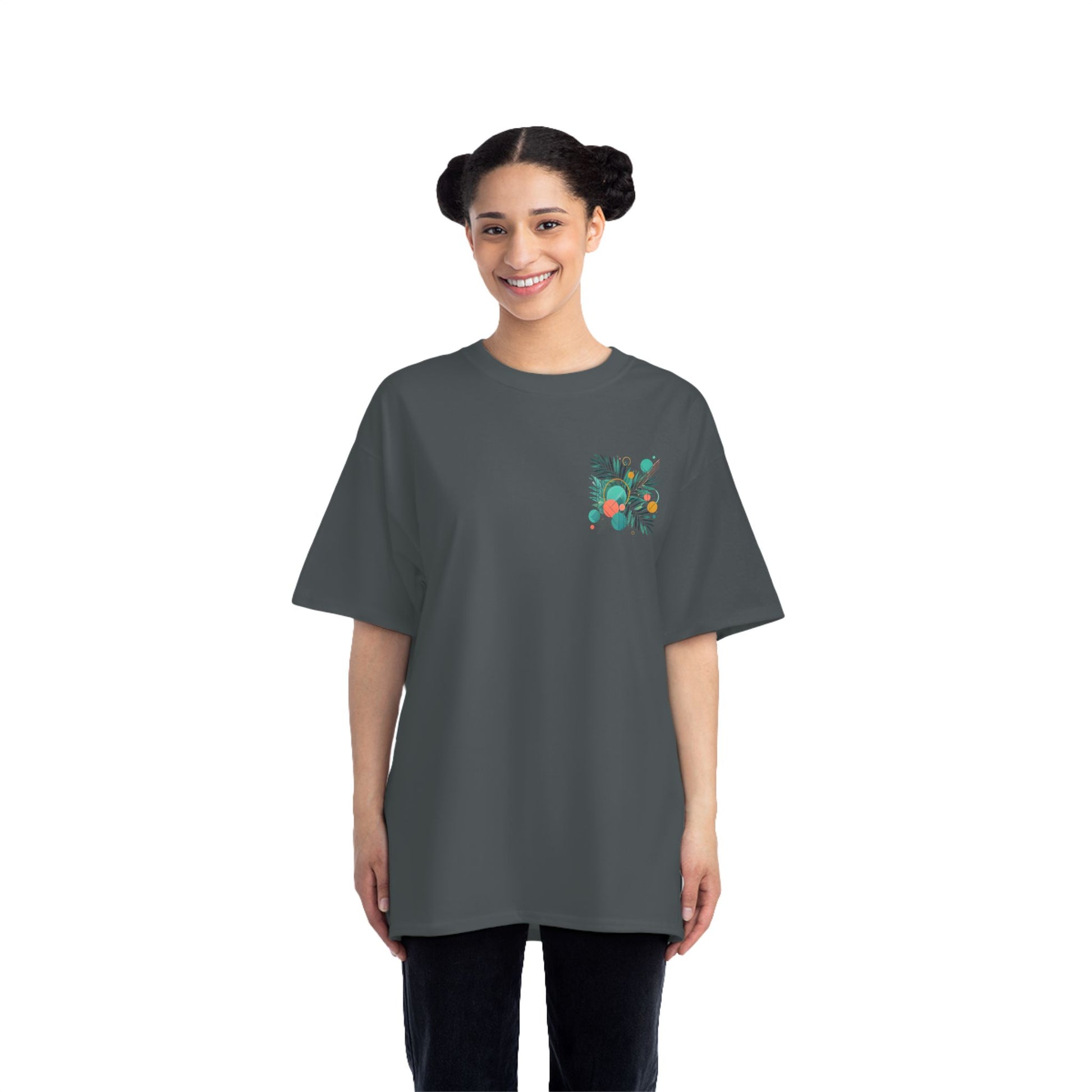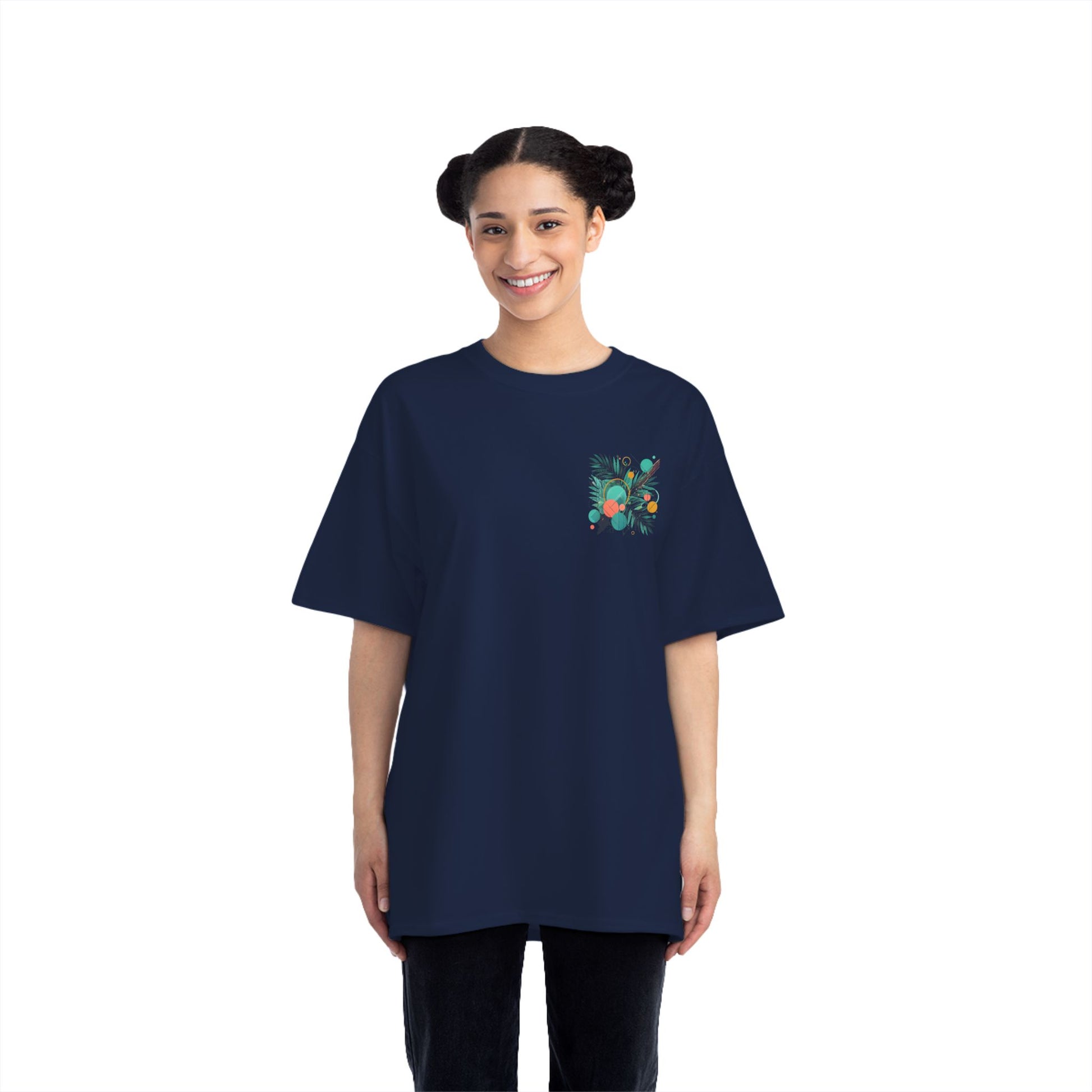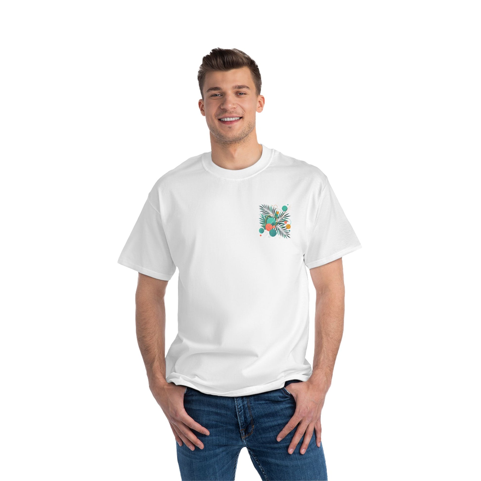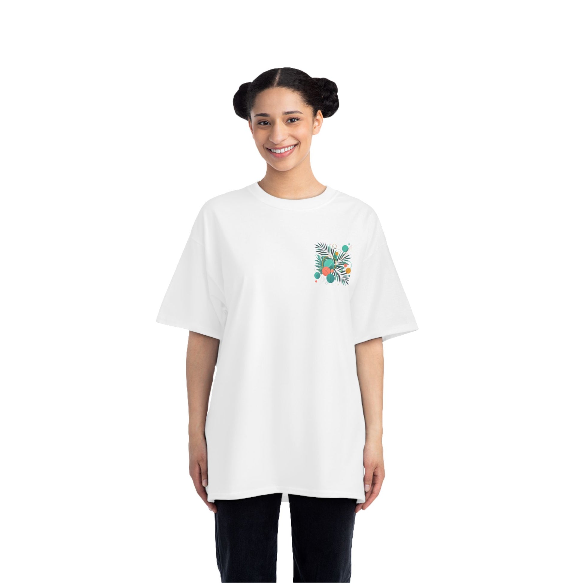 Step into a world of color and express yourself like never before with our Geometric Shapes: Tropical Vibe tee. Crafted with passion and precision, this wearable art piece marries abstract geometric shapes with the lush allure of tropical leaf patterns, all in a symphony of vibrant colors.