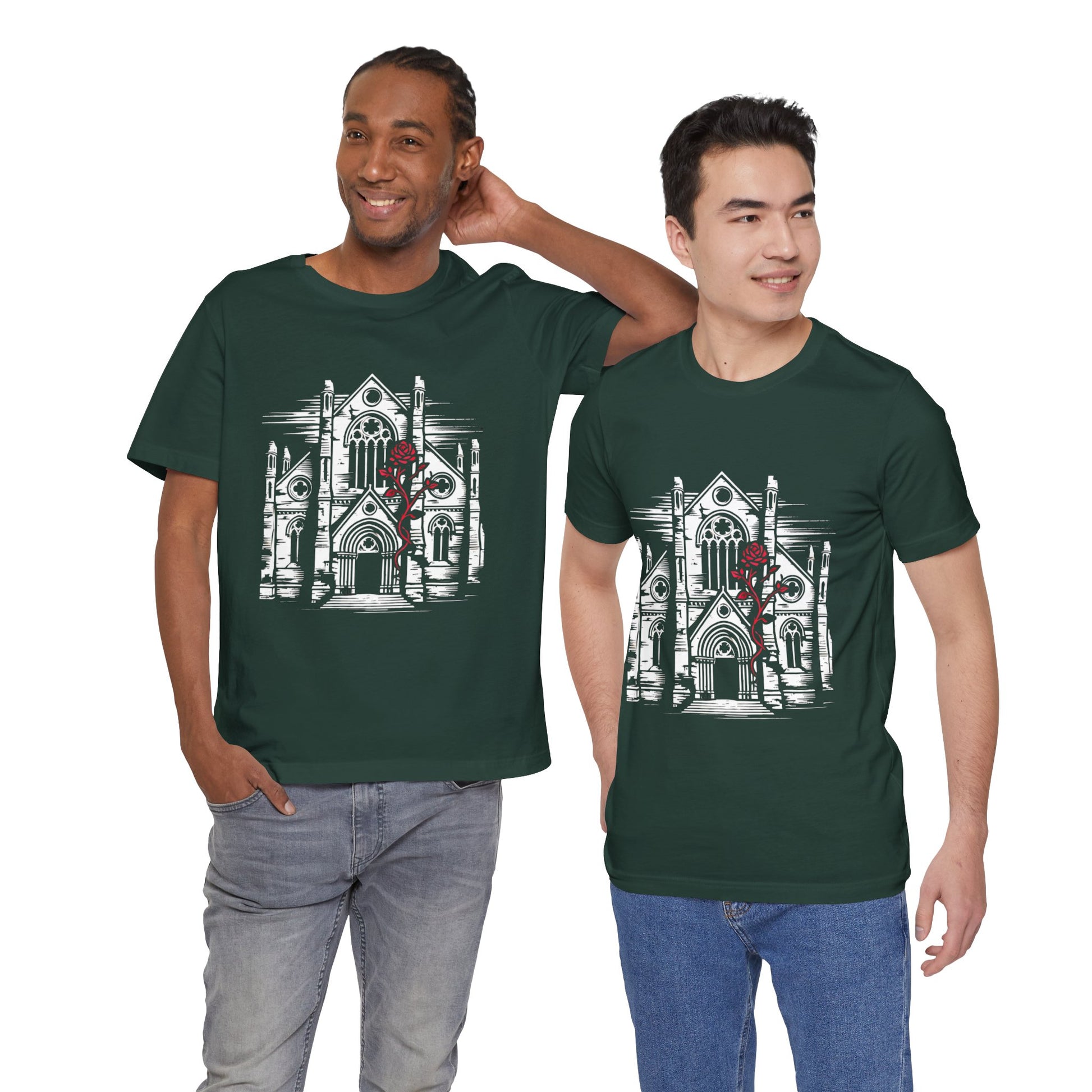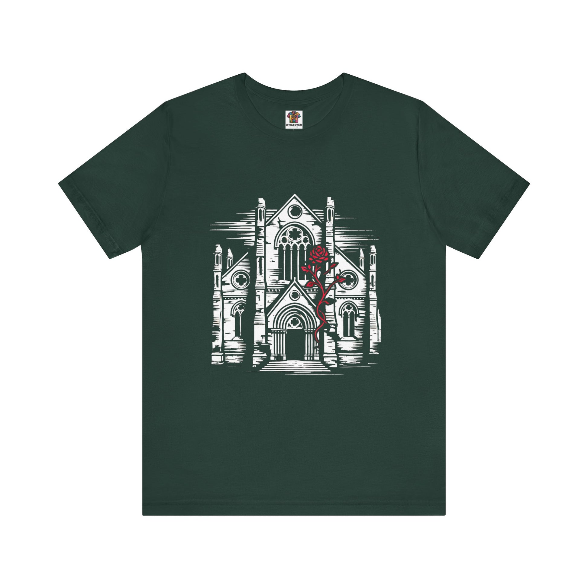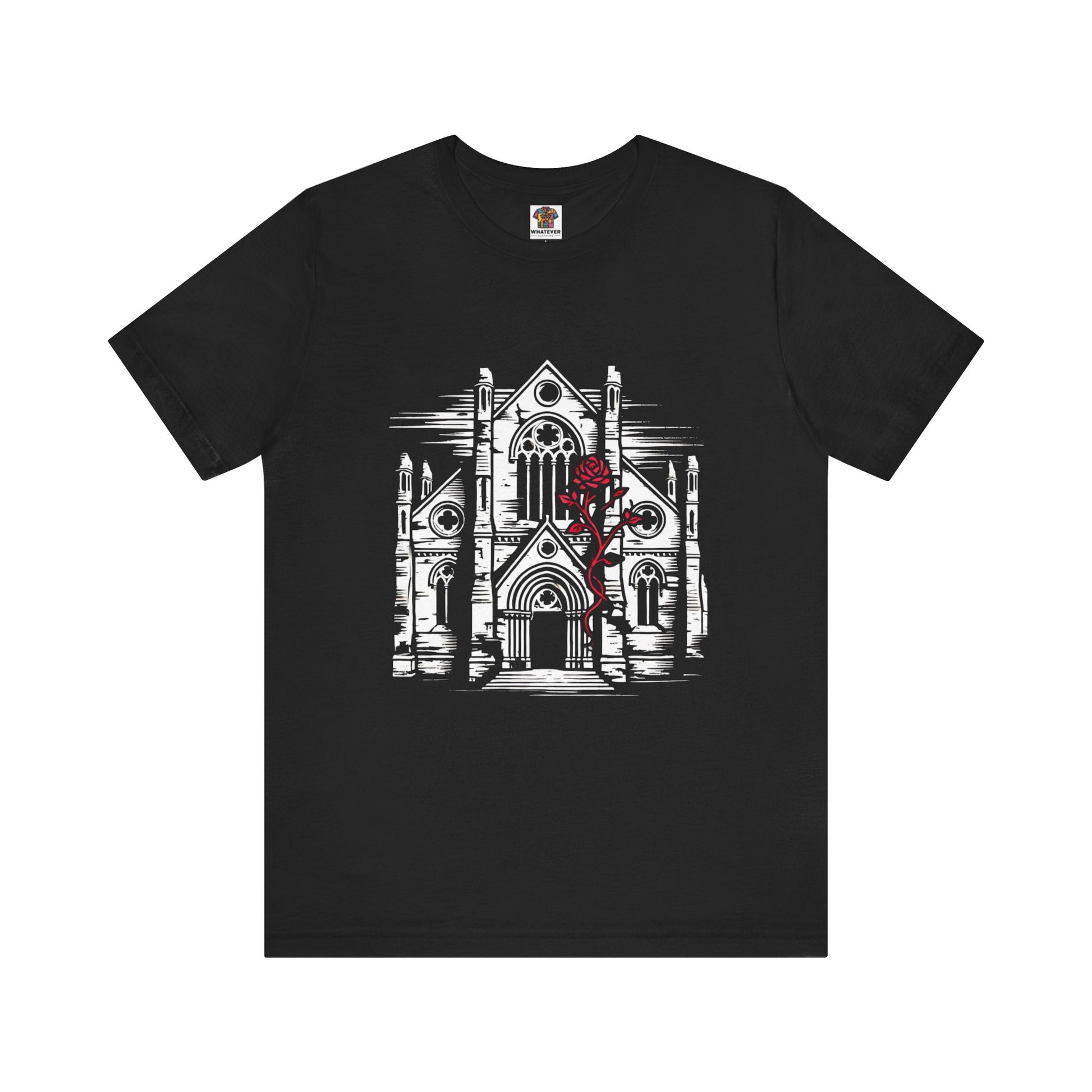 A crumbling gothic church with a red rose growing through, rendered in bold black and white.
