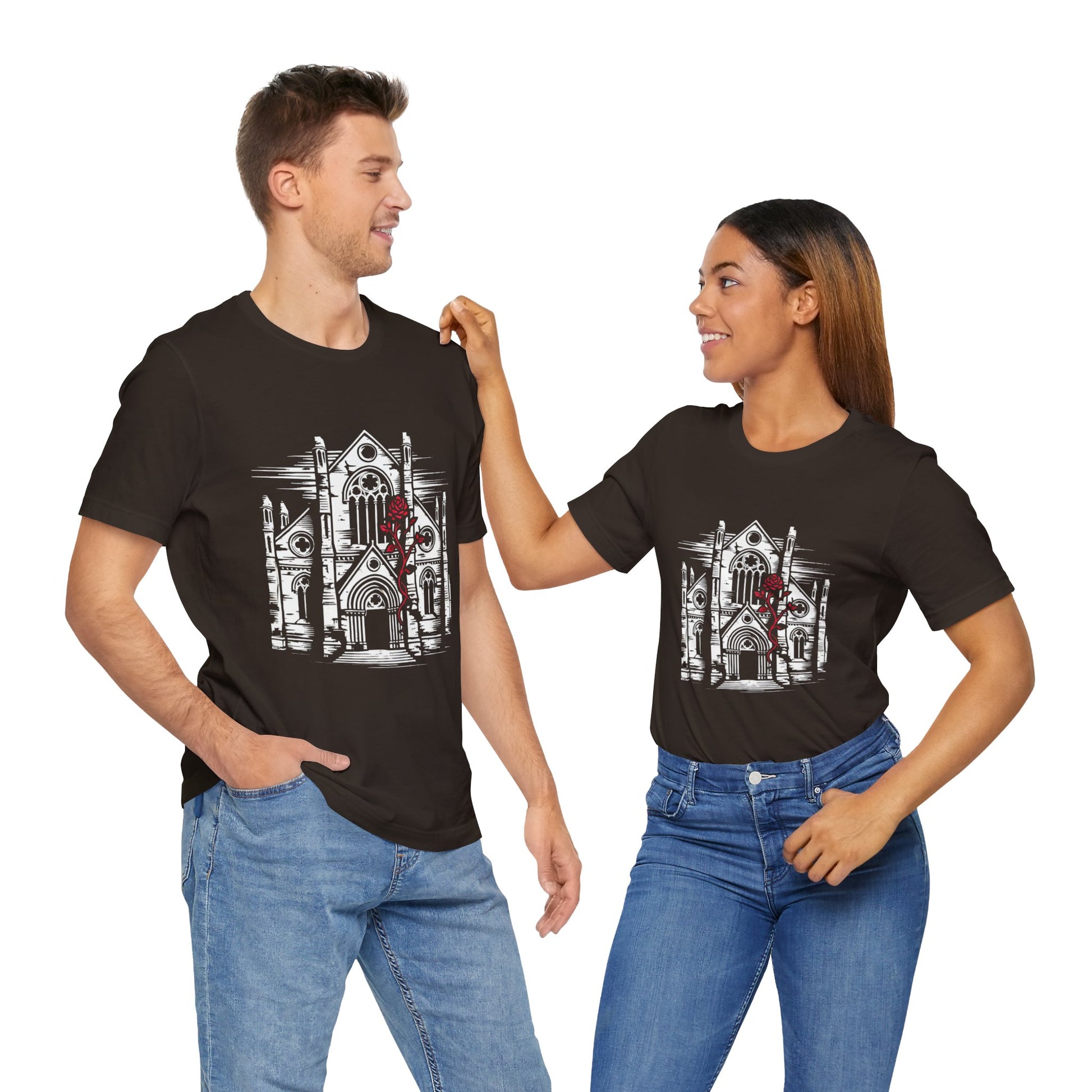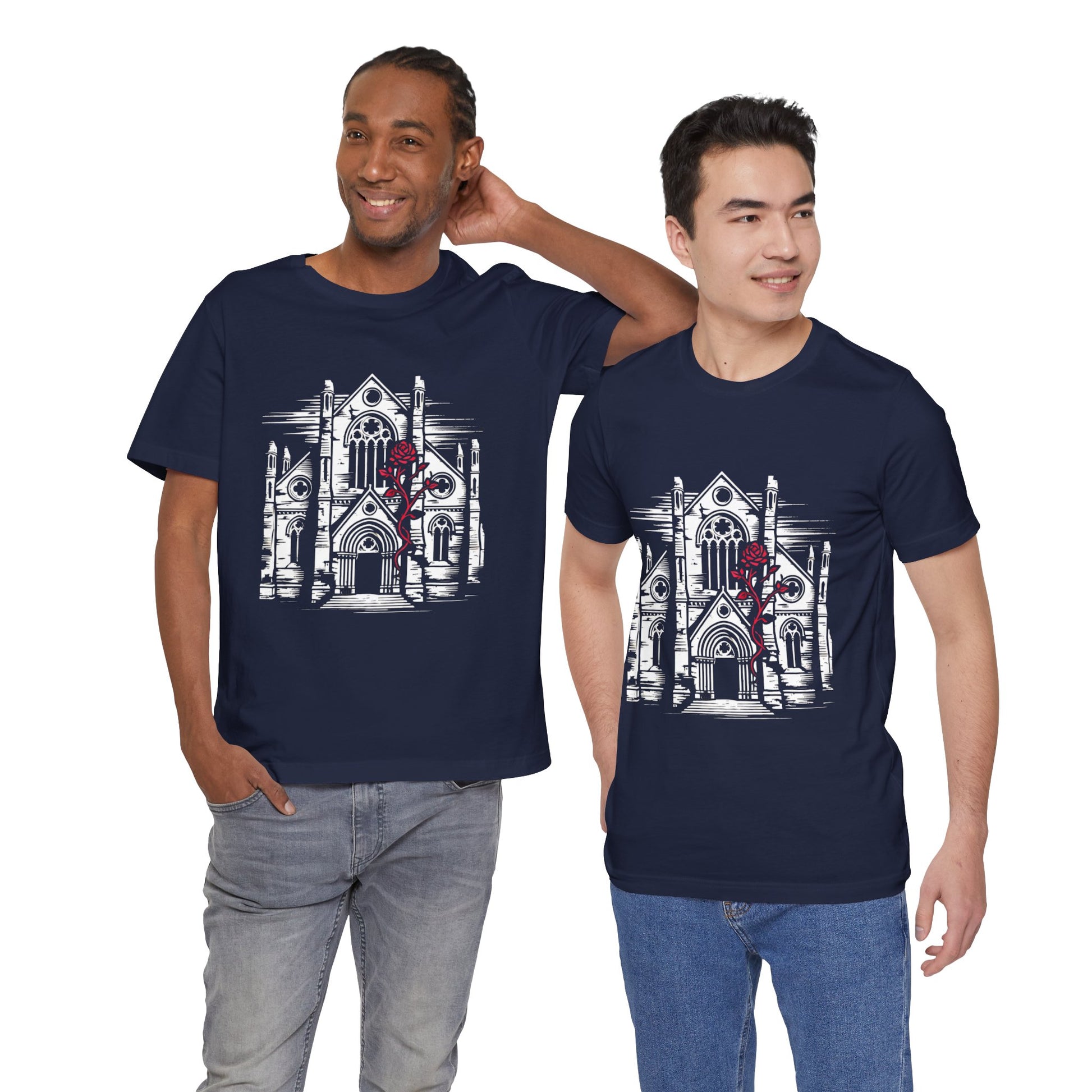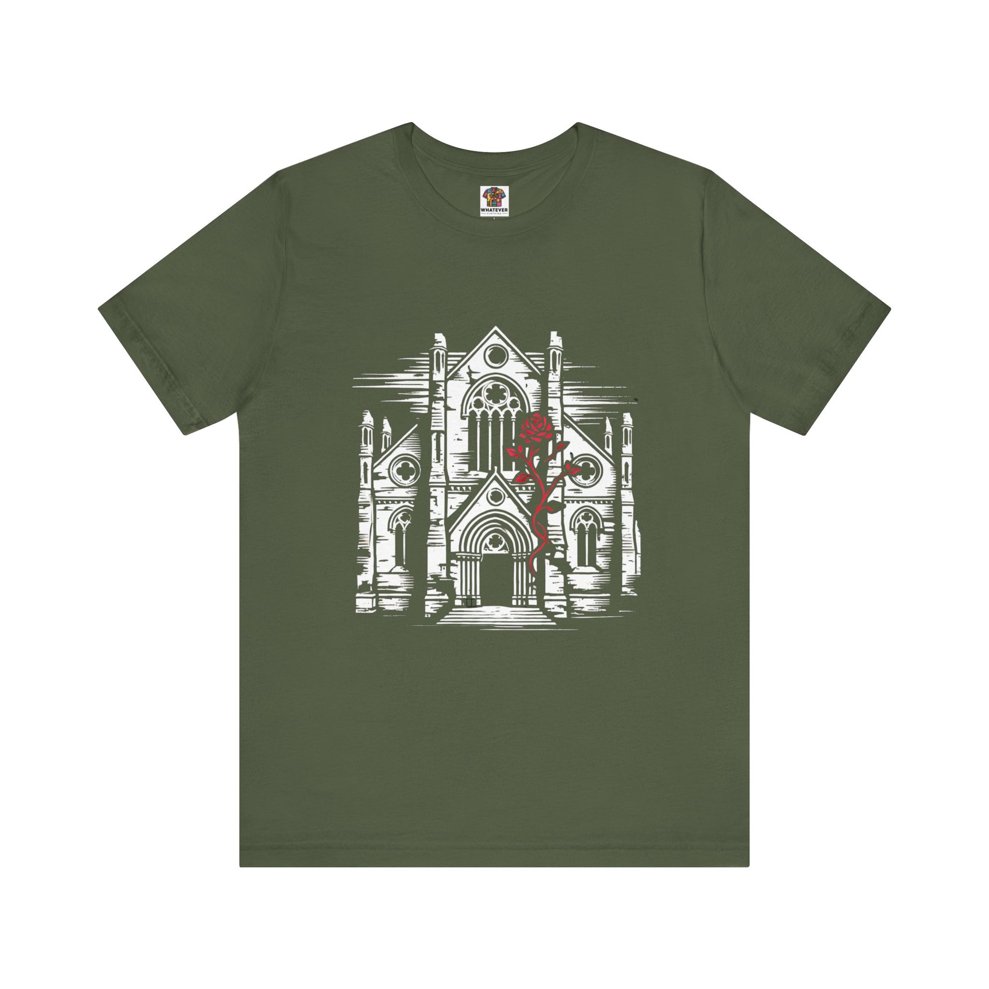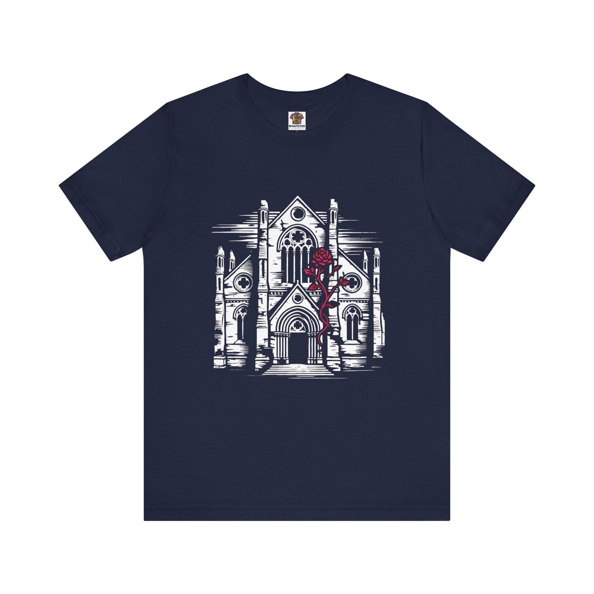 A crumbling gothic church with a red rose growing through, rendered in bold black and white.
