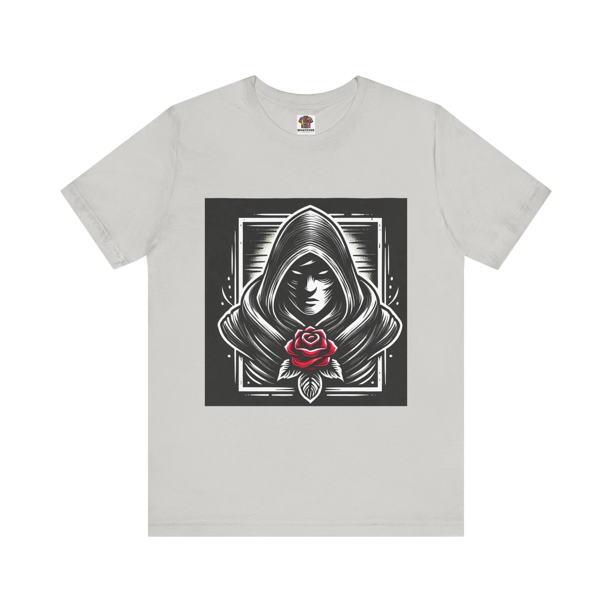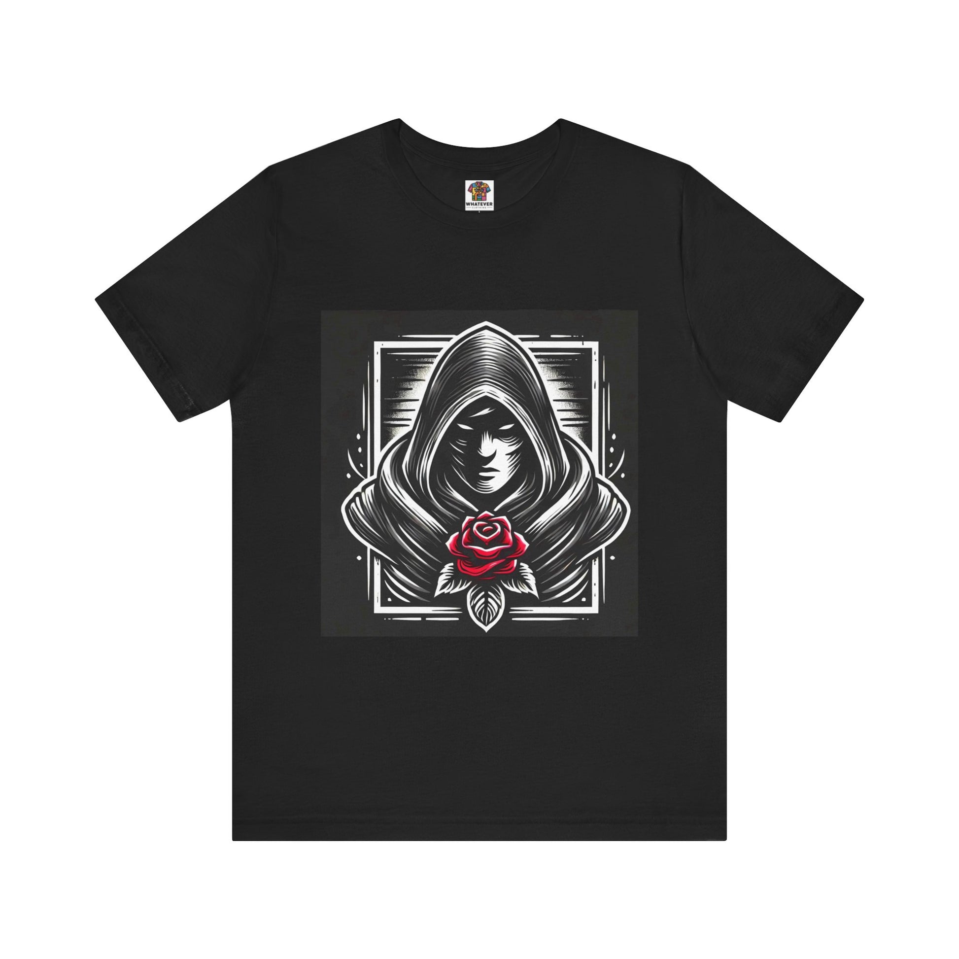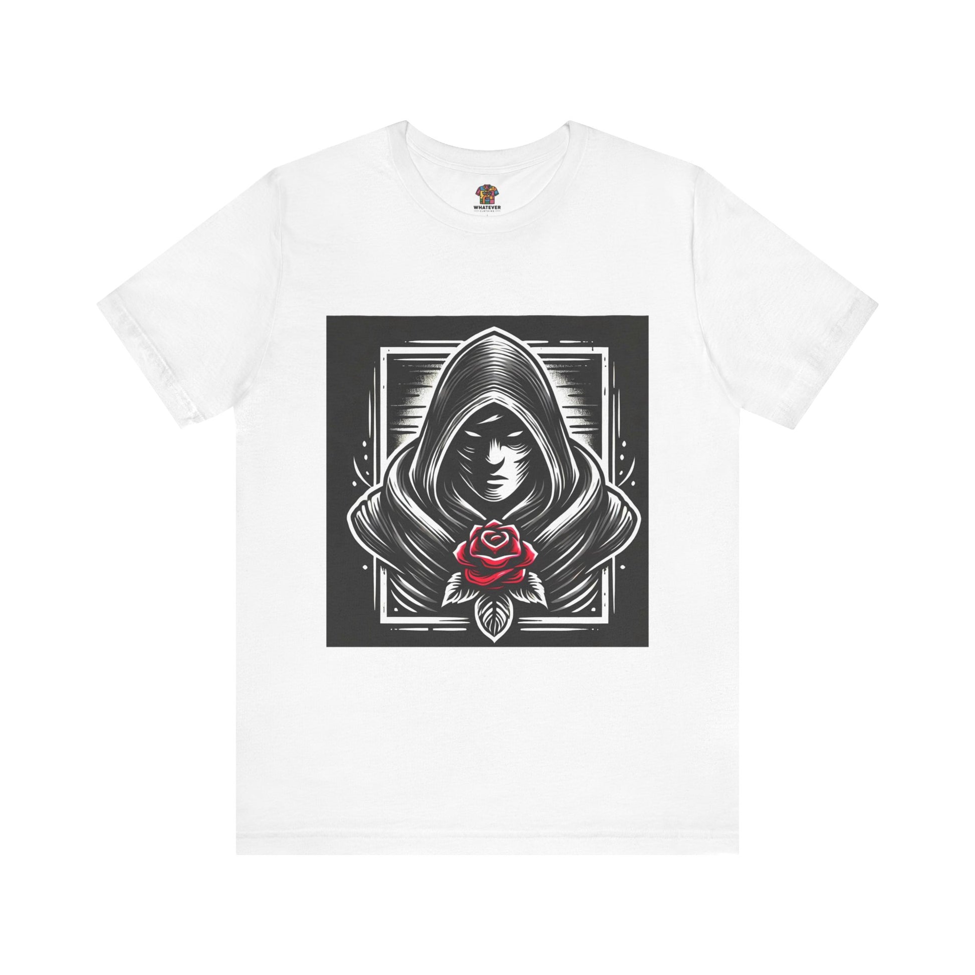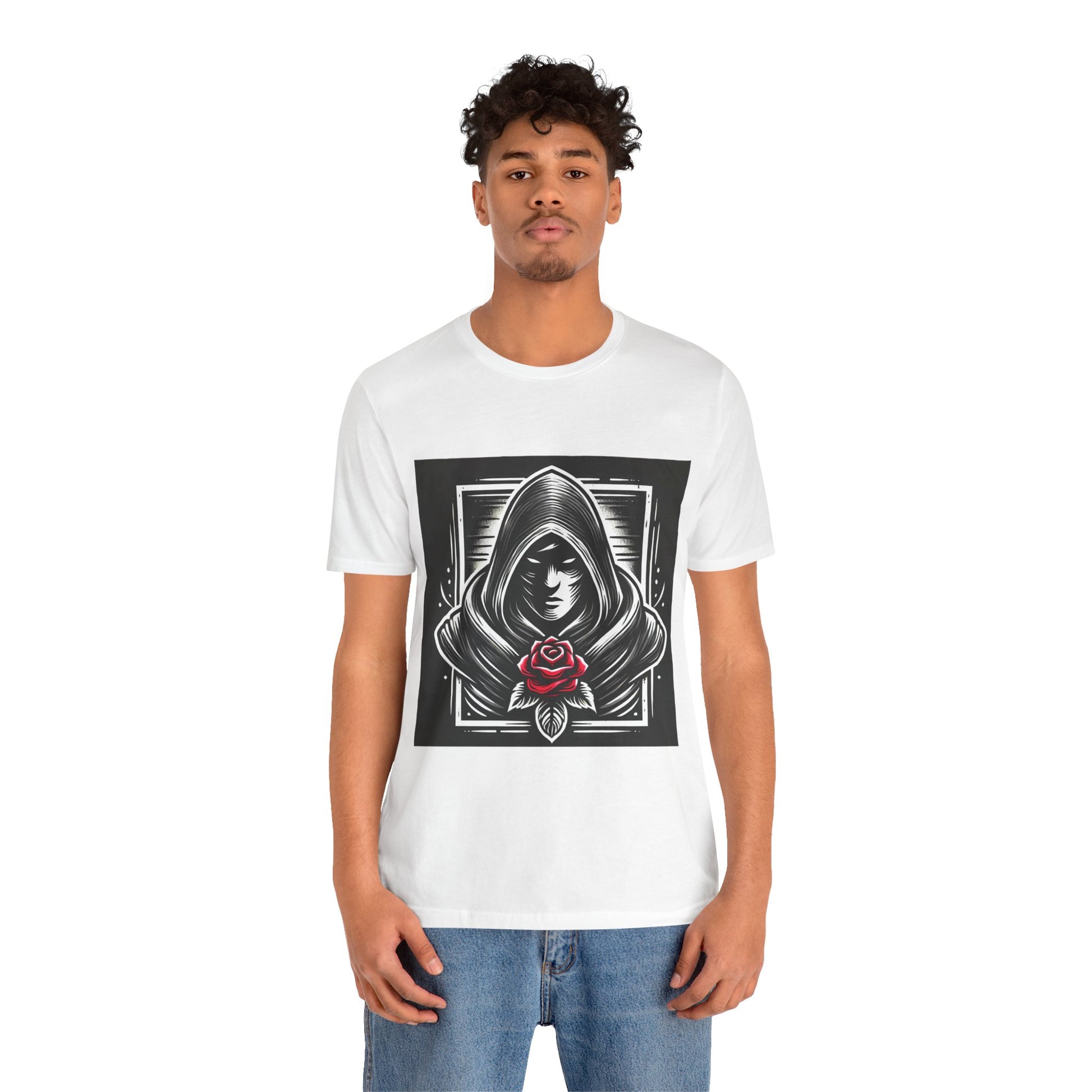 A mysterious hooded figure with red eyes and a rose, rendered in black and white with bold contrasts.