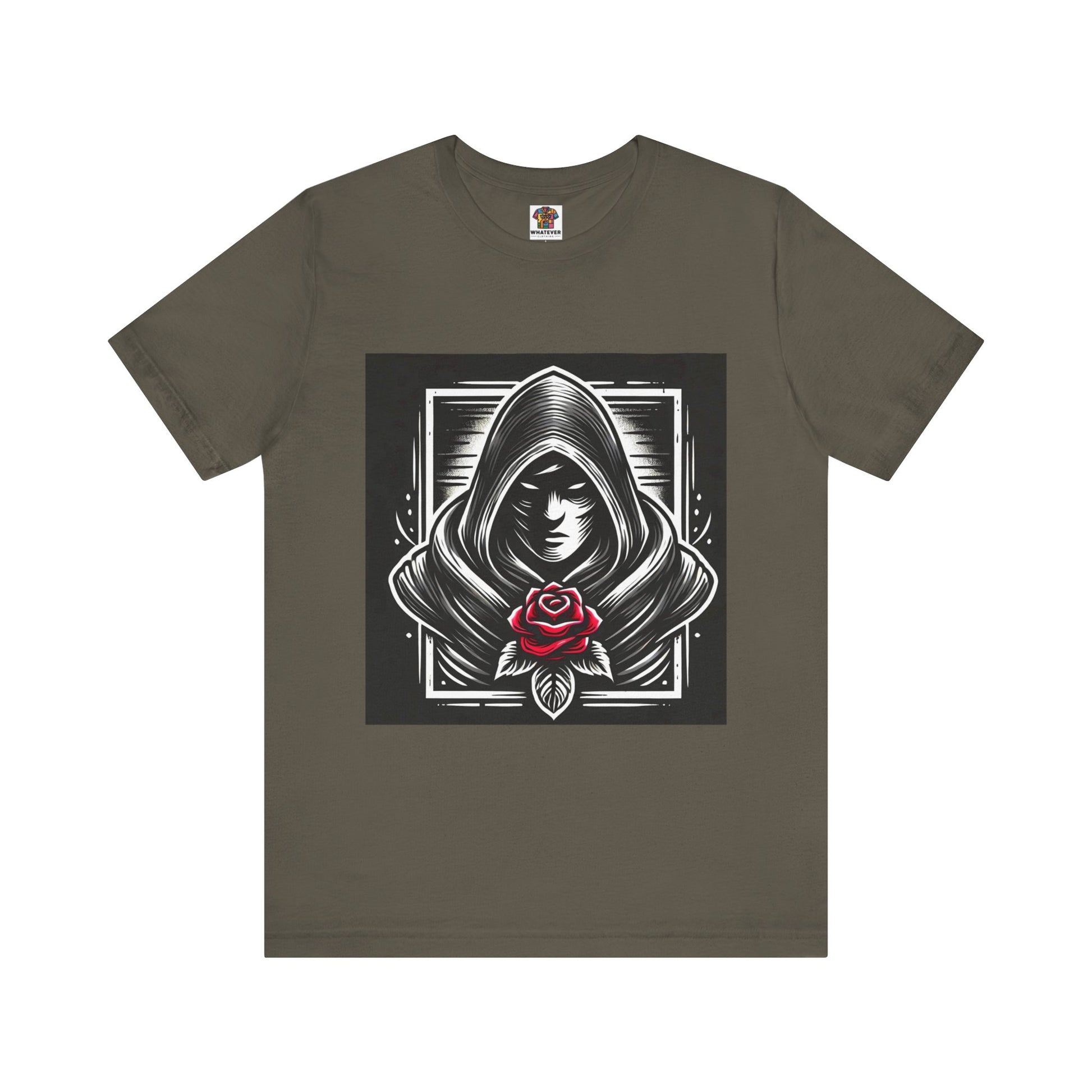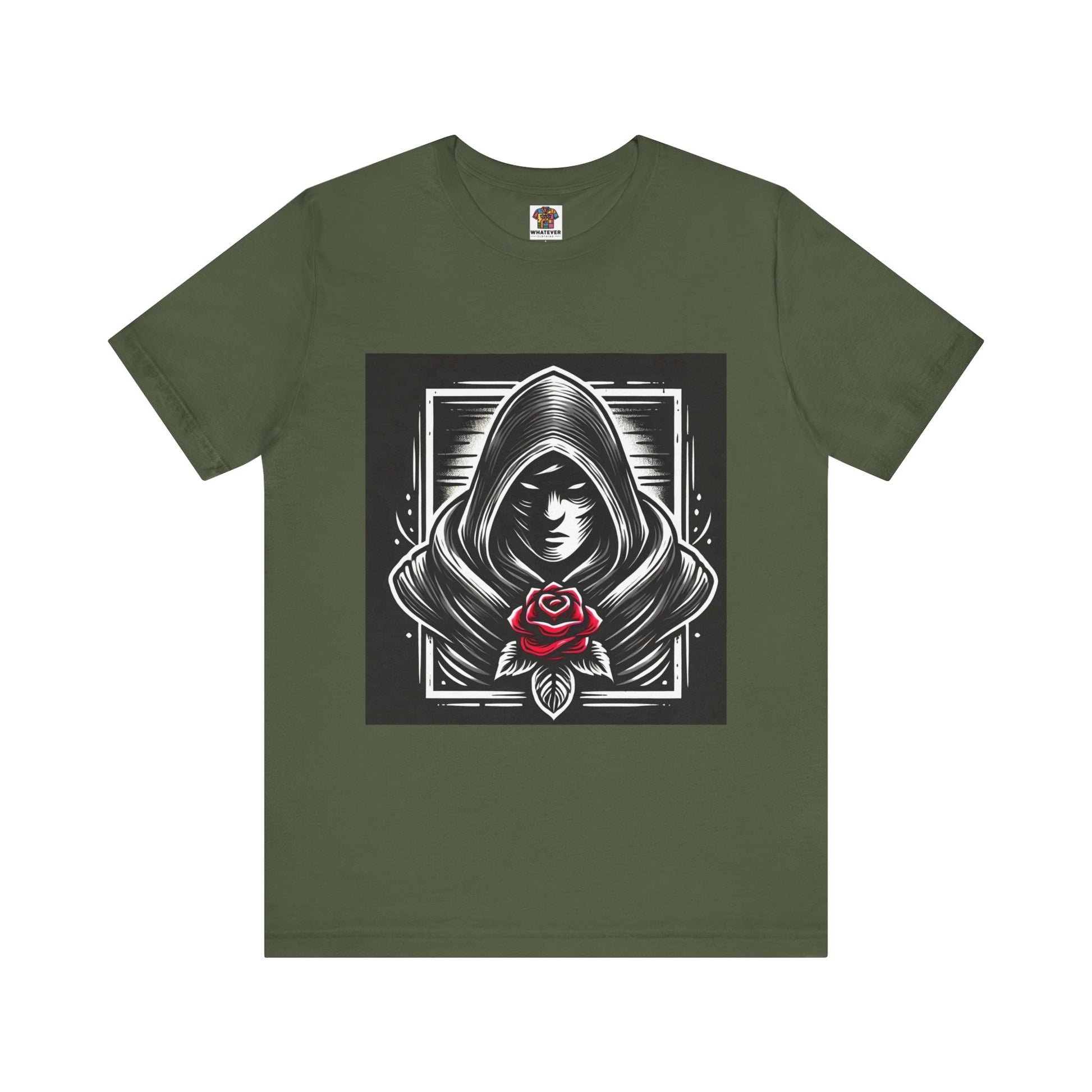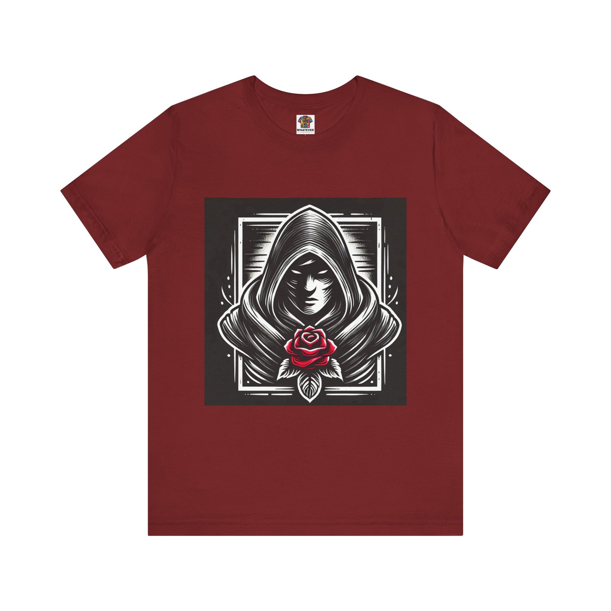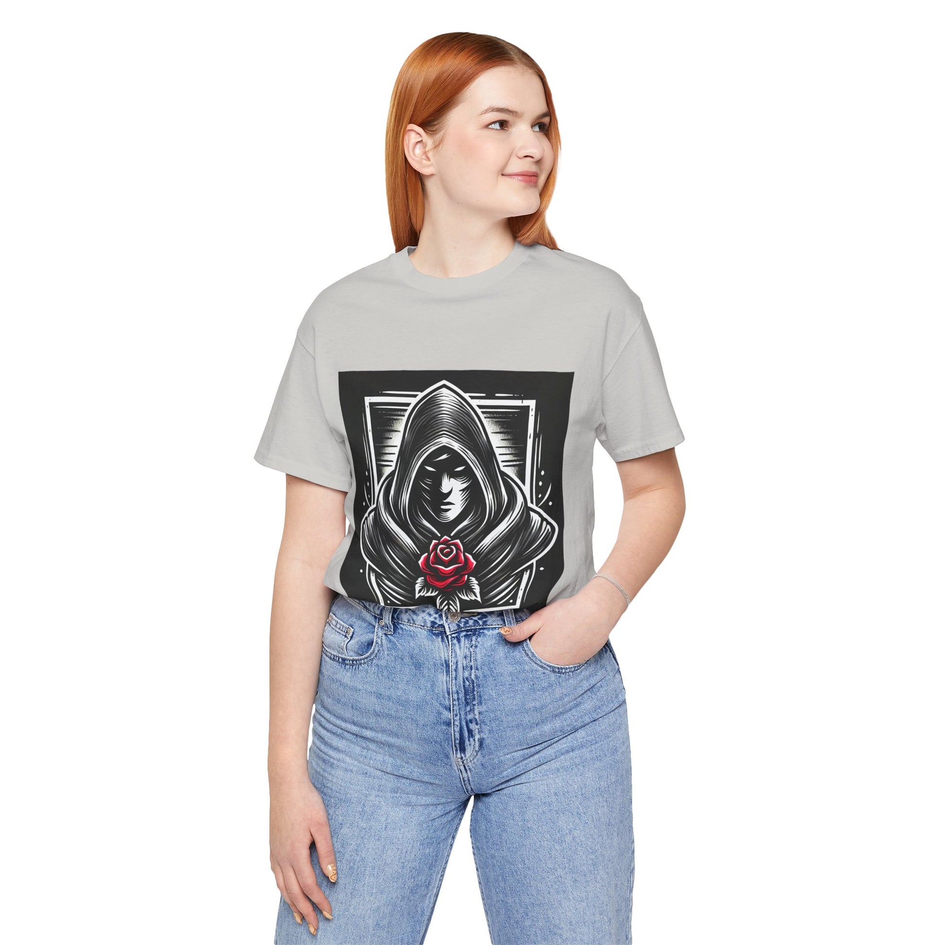 A mysterious hooded figure with red eyes and a rose, rendered in black and white with bold contrasts.