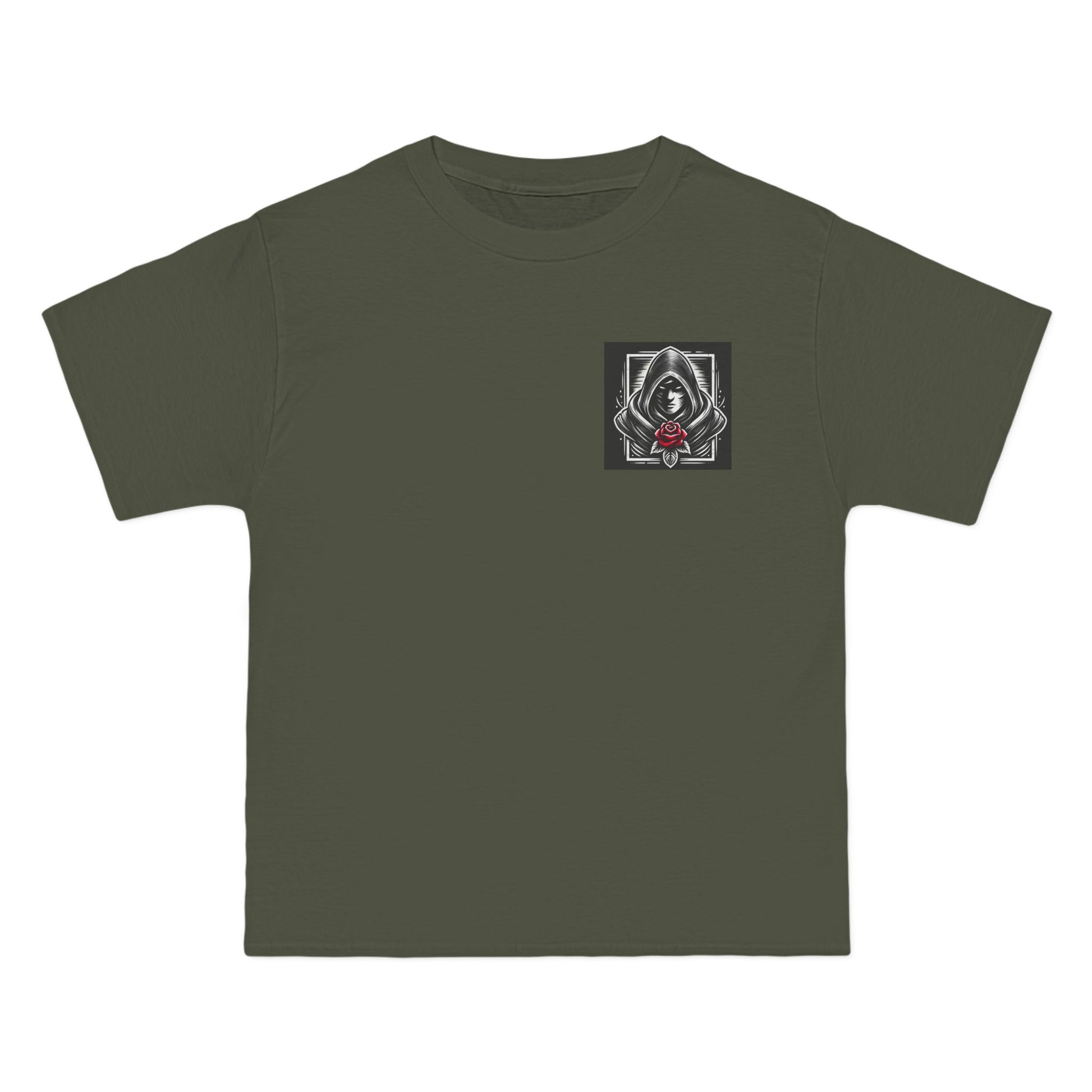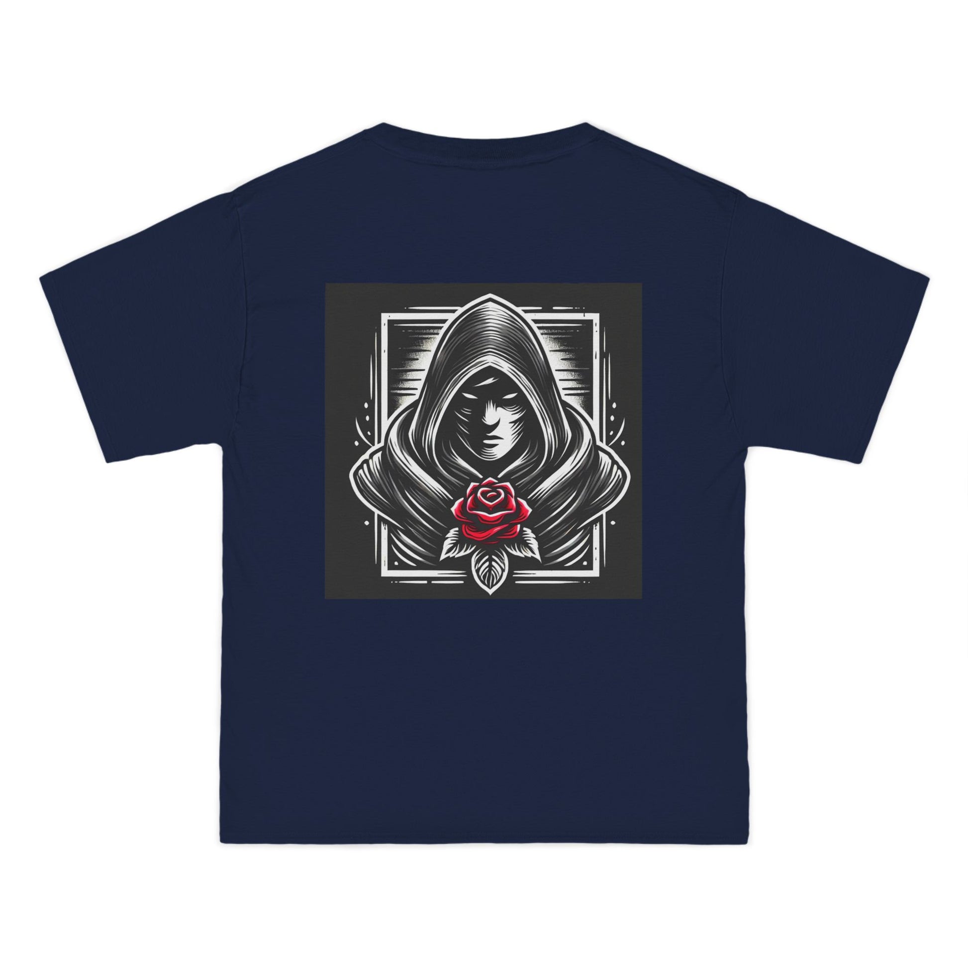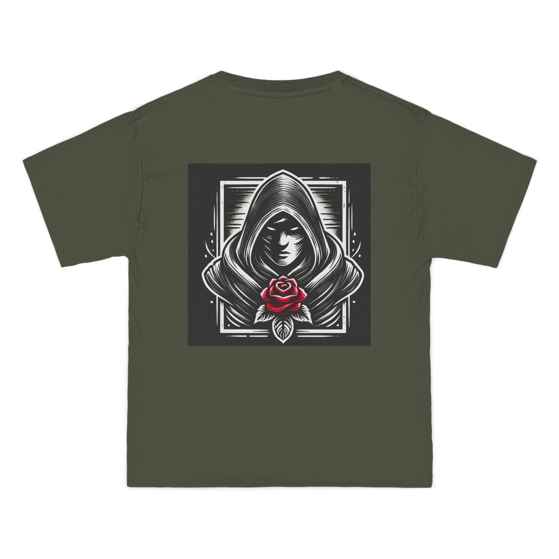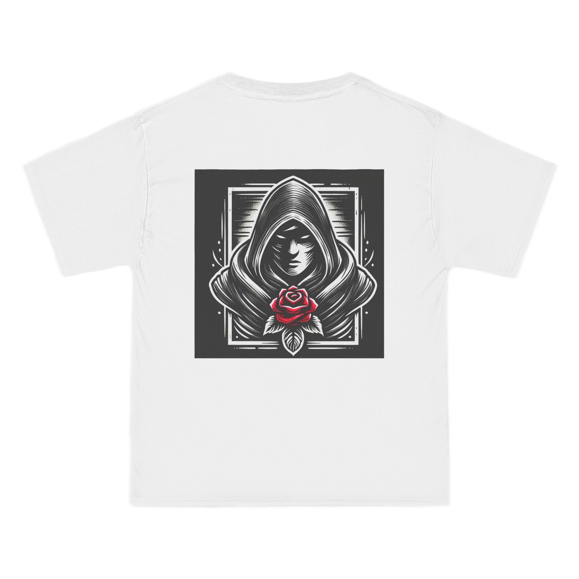Unleash your creativity with the powerful image of a mysterious hooded figure. The striking contrast of black and white coupled with the bold red eyes and rose evokes an aura of enigmatic allure, allowing you to express yourself in the most unique way.