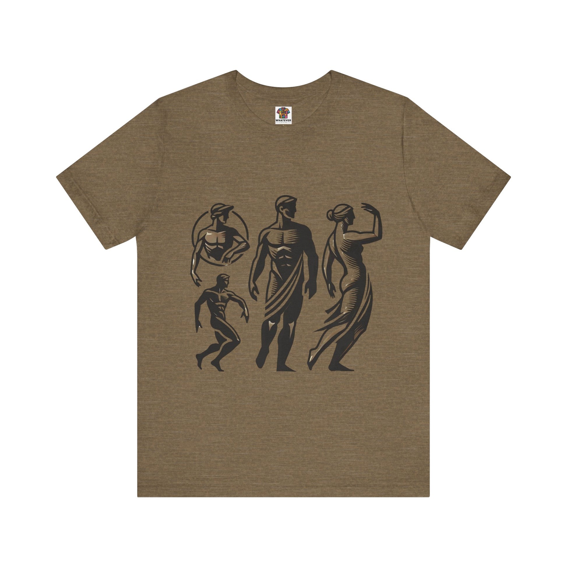 A stylized human figure in a heroic pose, rendered in dark shades with subtle highlights, symbolizing strength and grace.