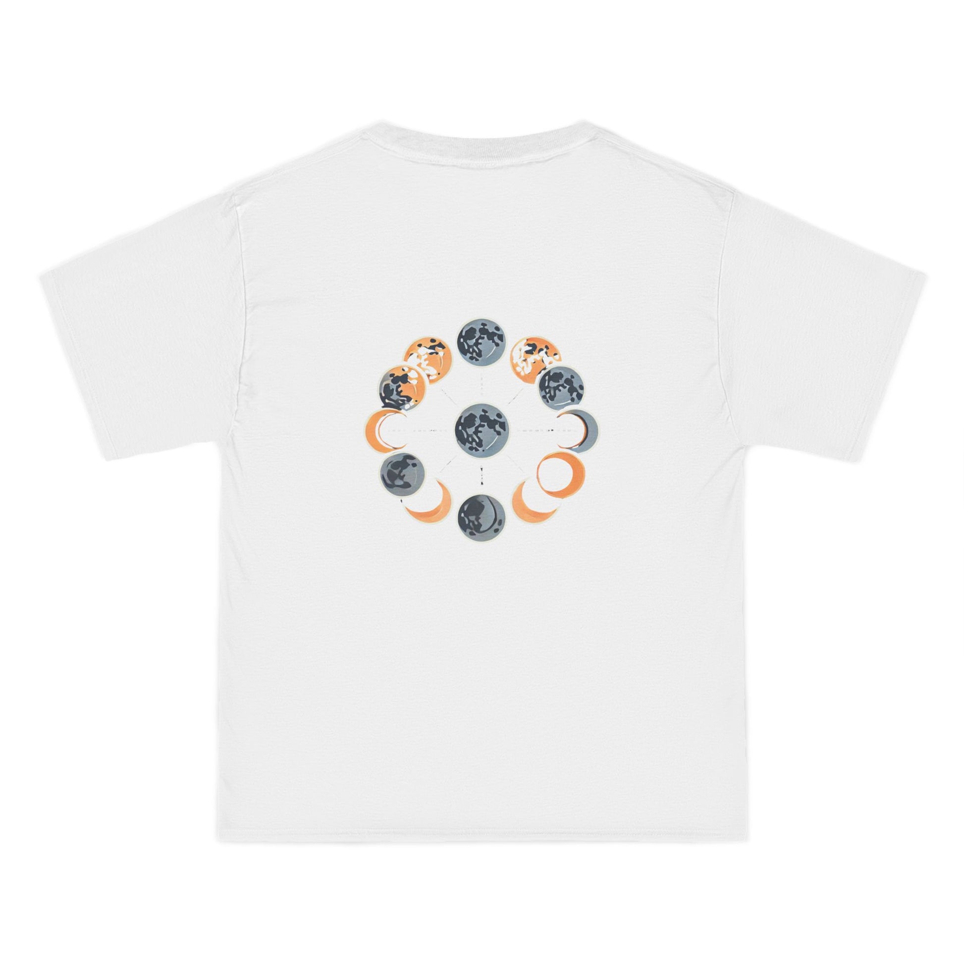 Step into the spotlight with Whatever Clothing's Lunar Phases: Minimalist Geometric tee. This unique, AI-generated design features a symphony of celestial bodies, capturing the enchanting phases of the moon, delicately arranged in a striking symmetrical pattern. The bold orange highlights dance across the fabric, adding a playful touch to this minimalist masterpiece.
