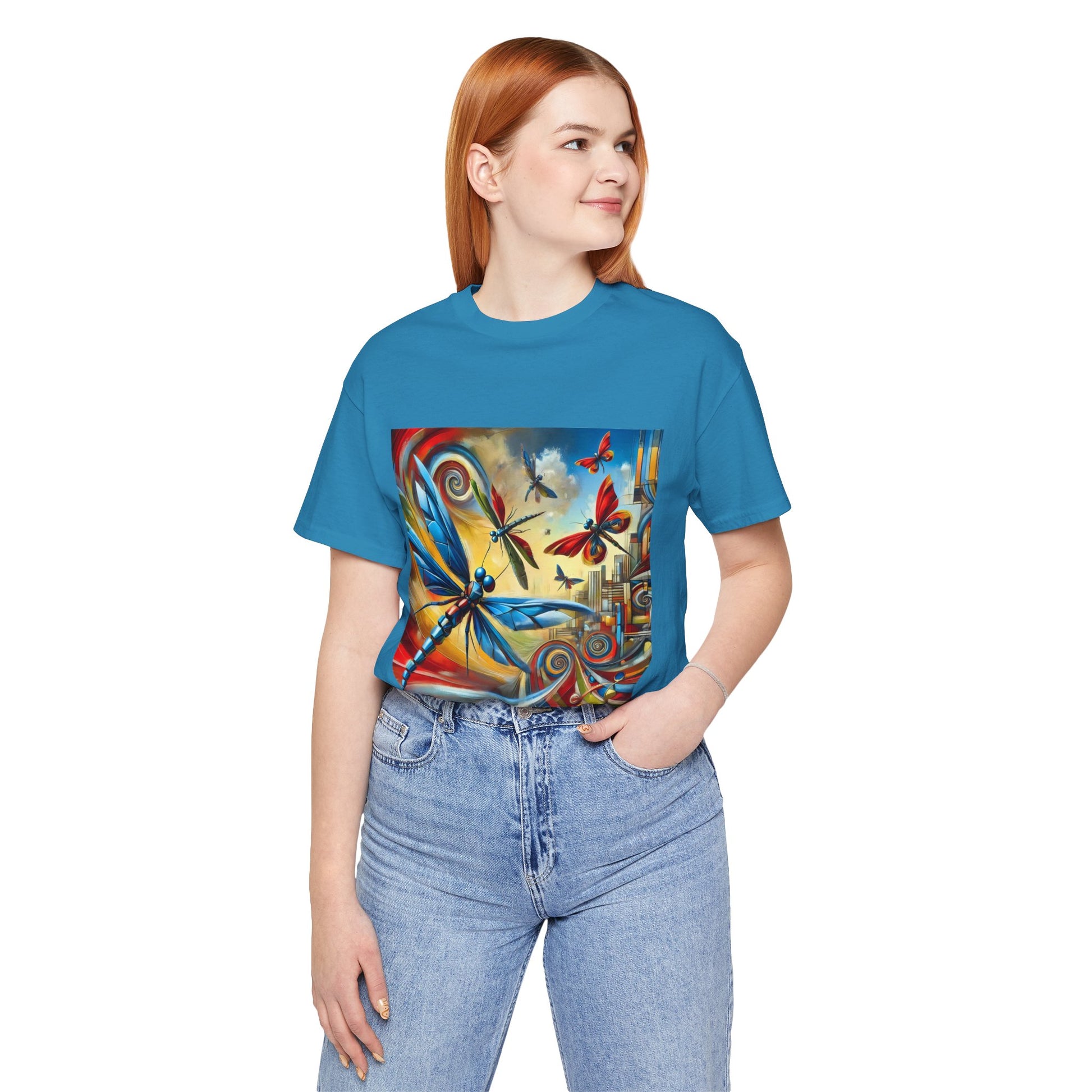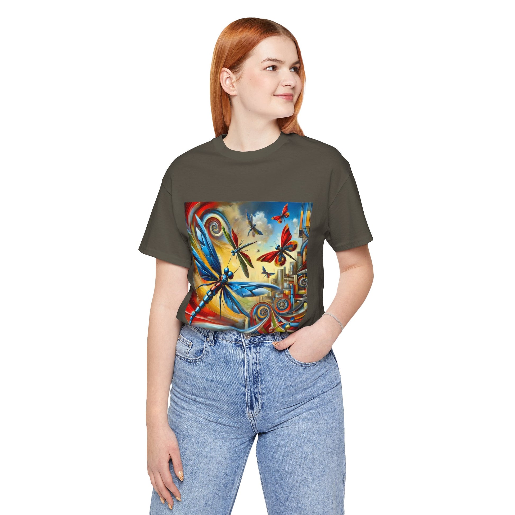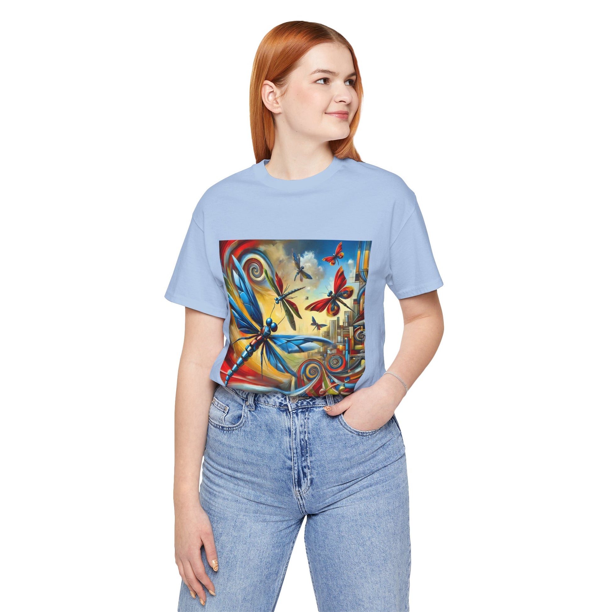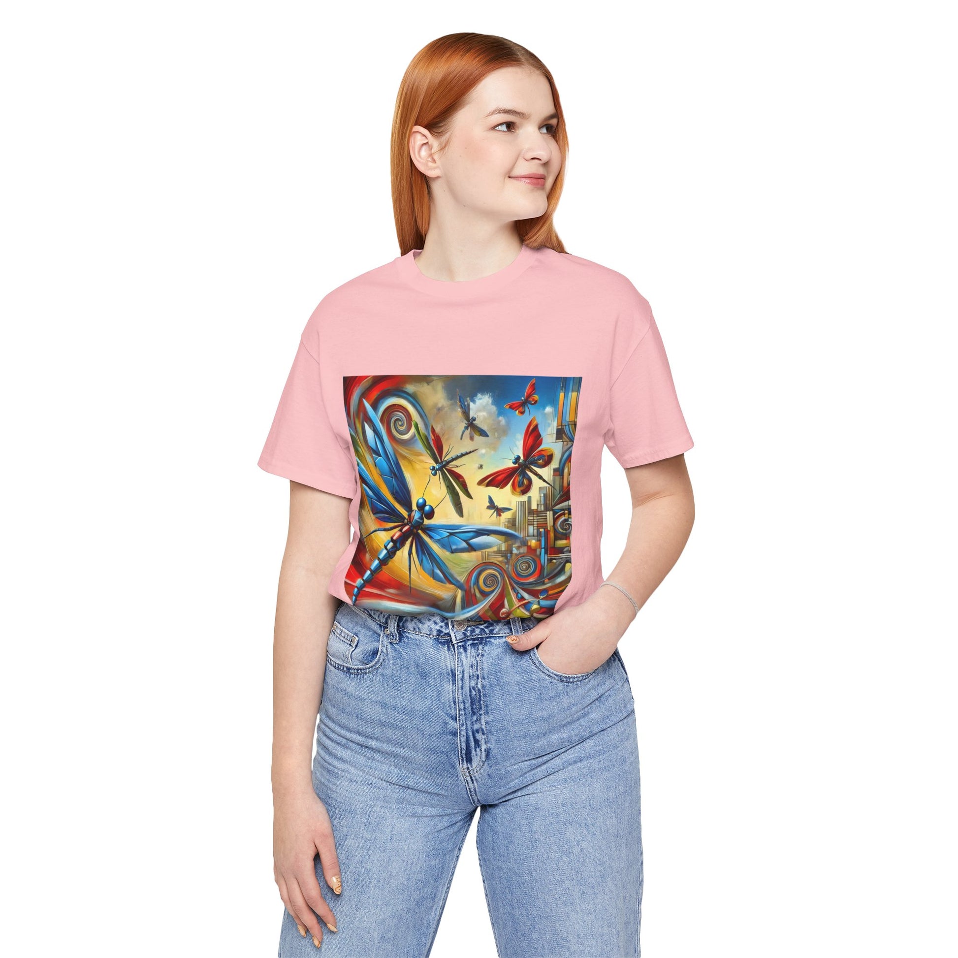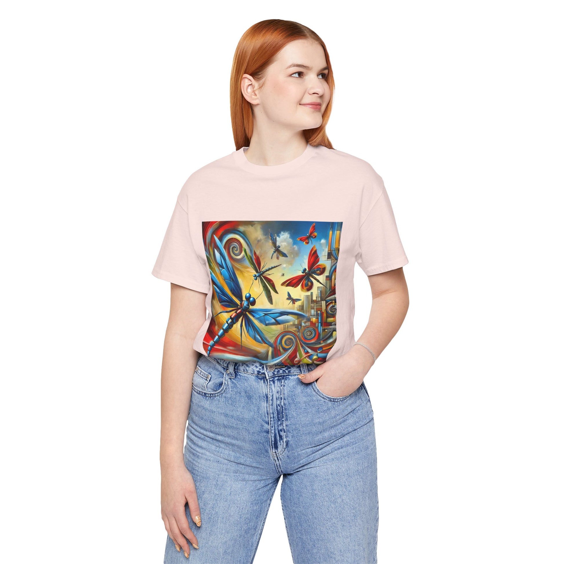 Stylized dragonflies and butterflies with angular, mechanical wings flying through a vibrant cityscape, merging organic and mechanical elements.