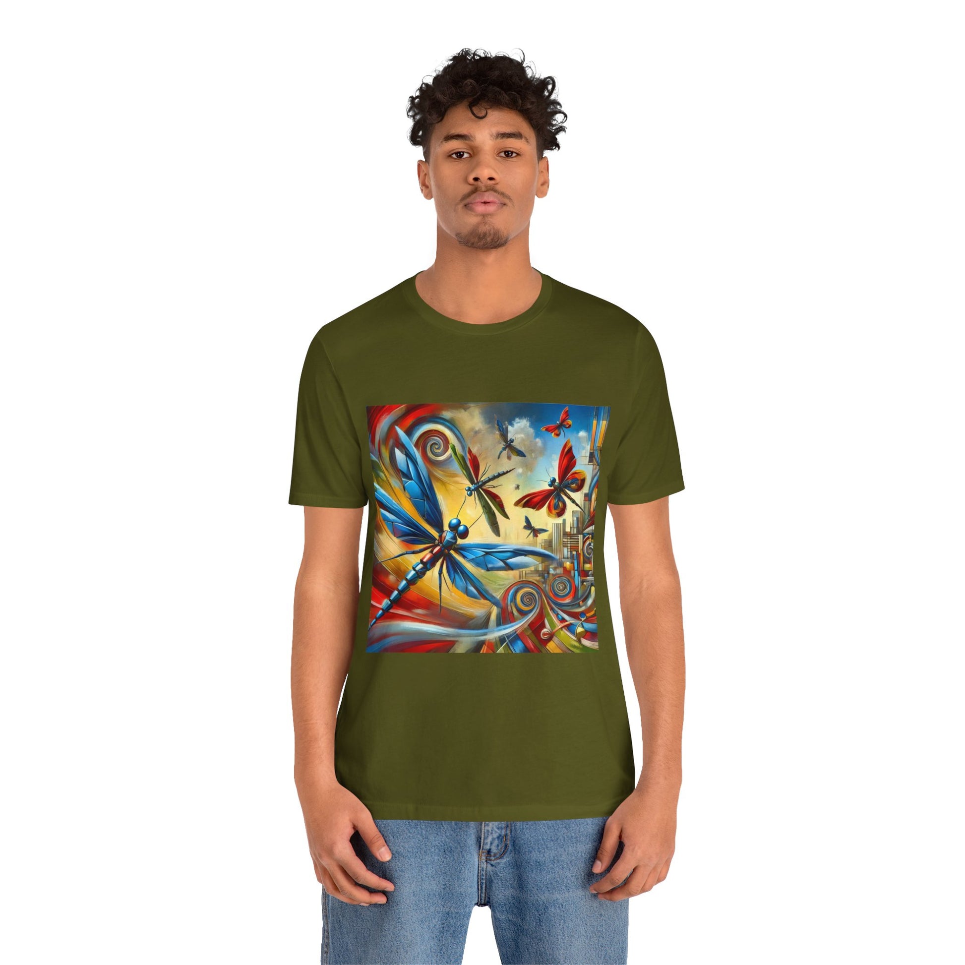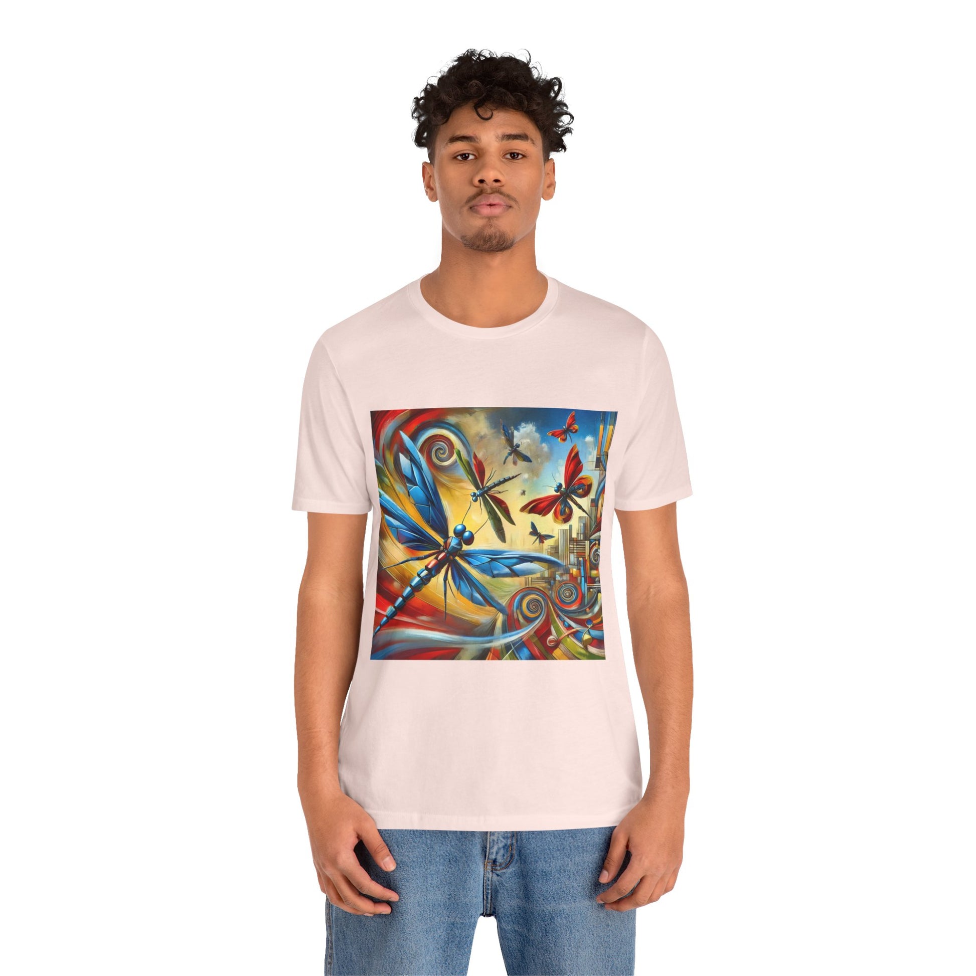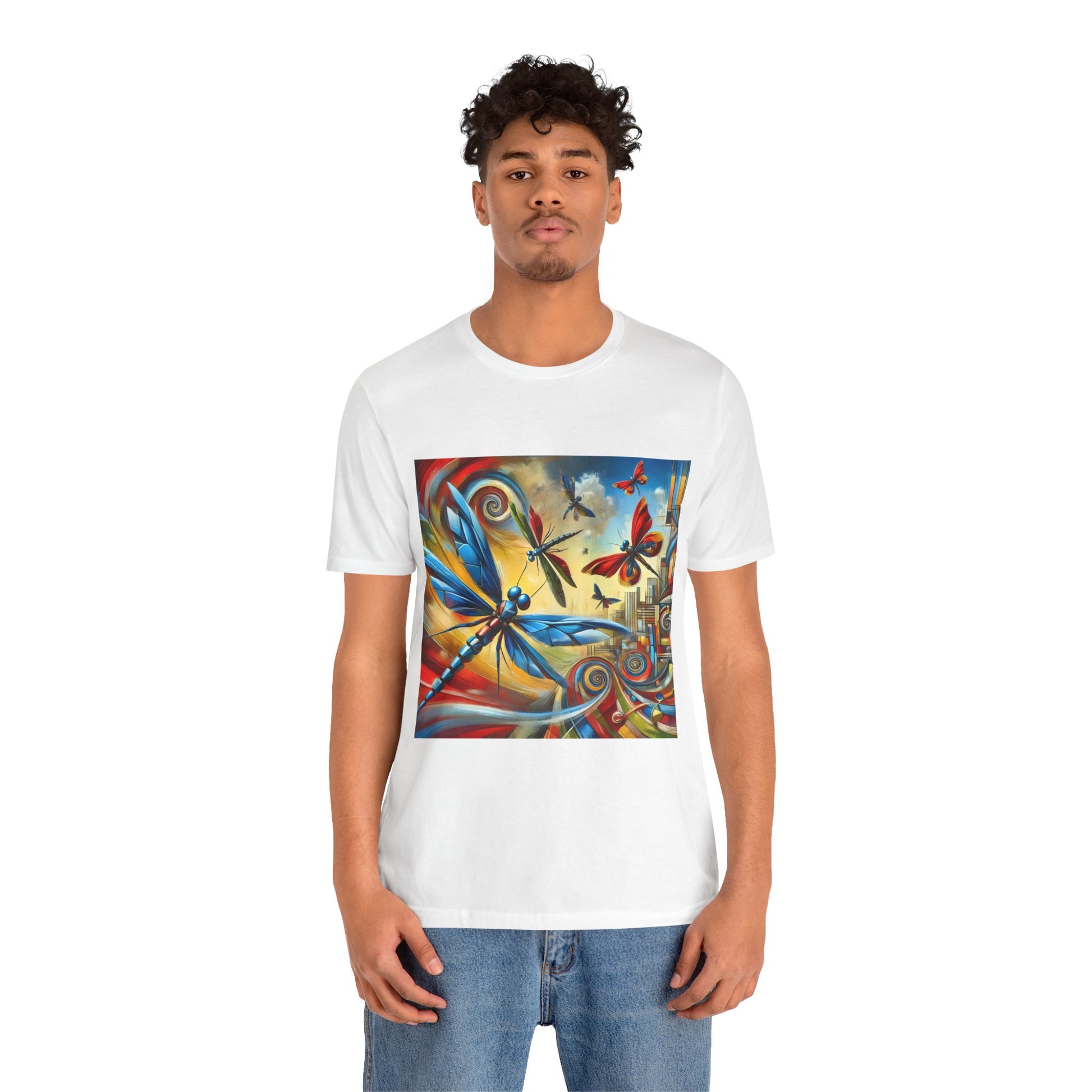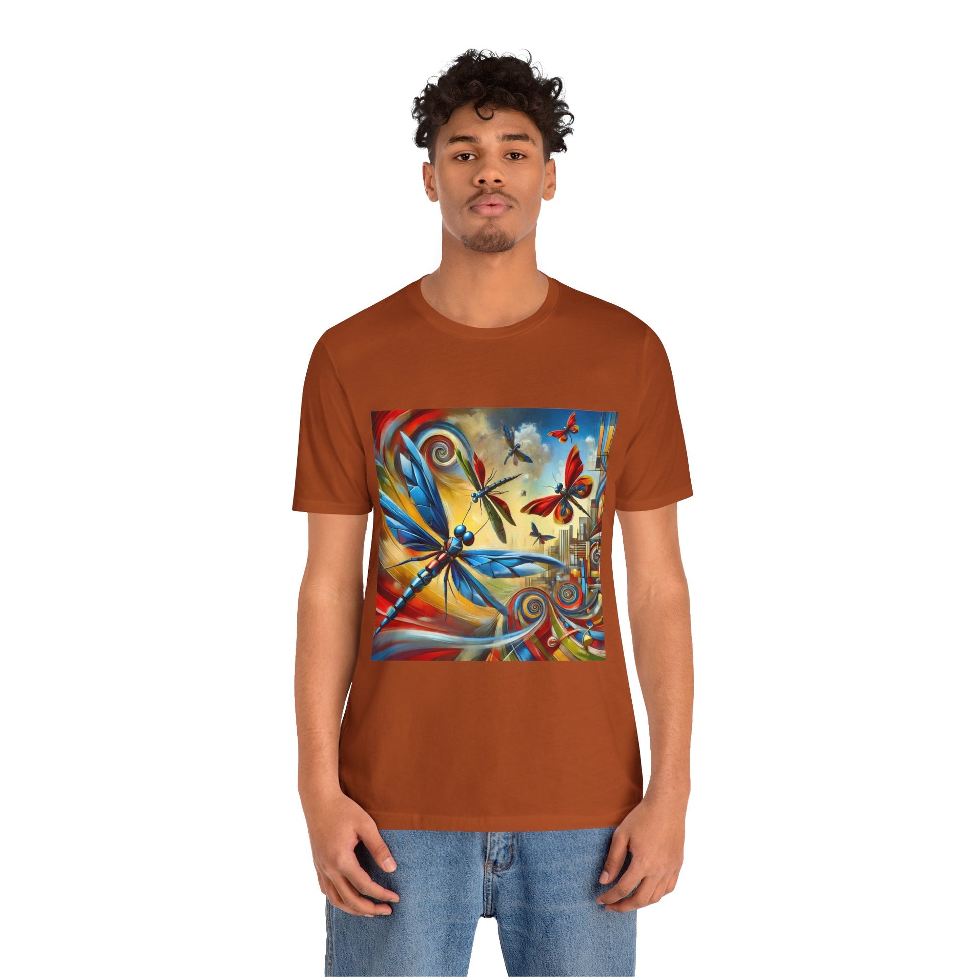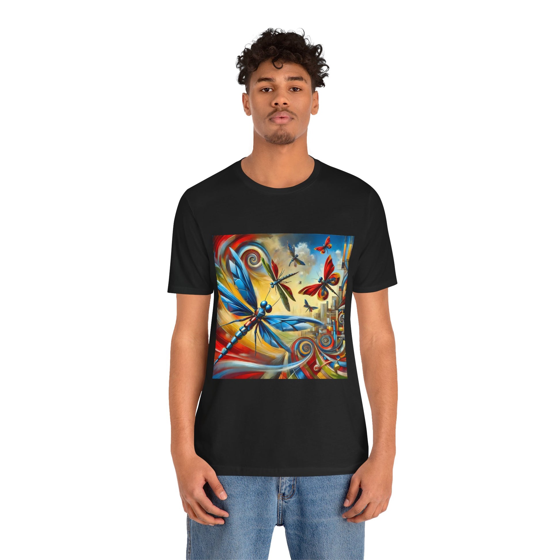 Stylized dragonflies and butterflies with angular, mechanical wings flying through a vibrant cityscape, merging organic and mechanical elements.